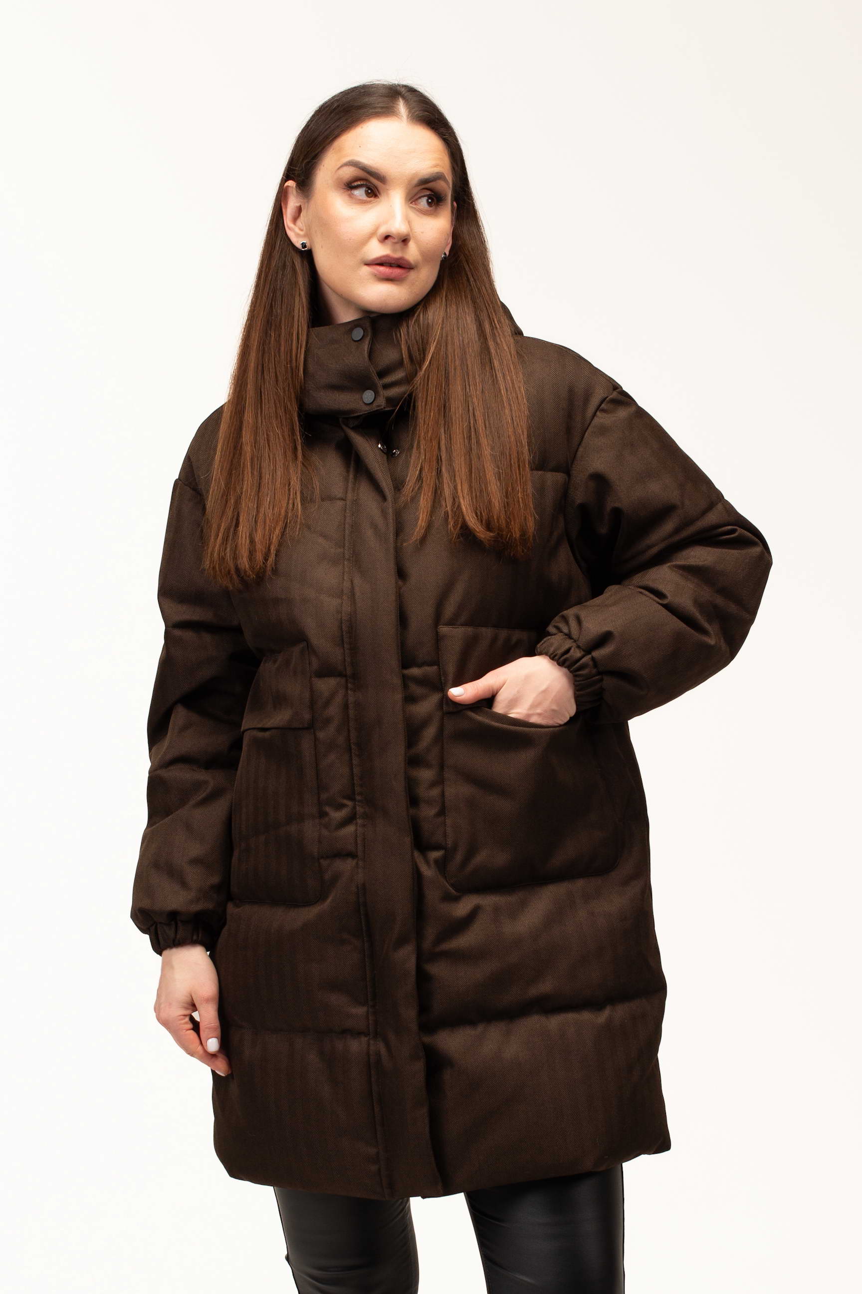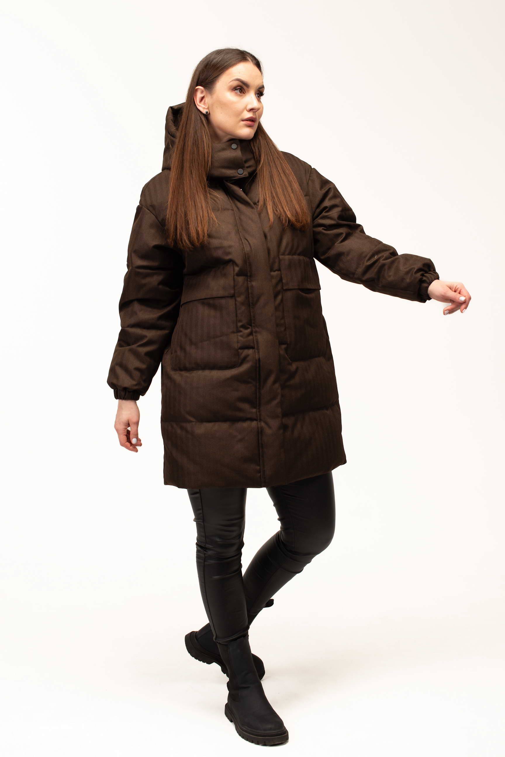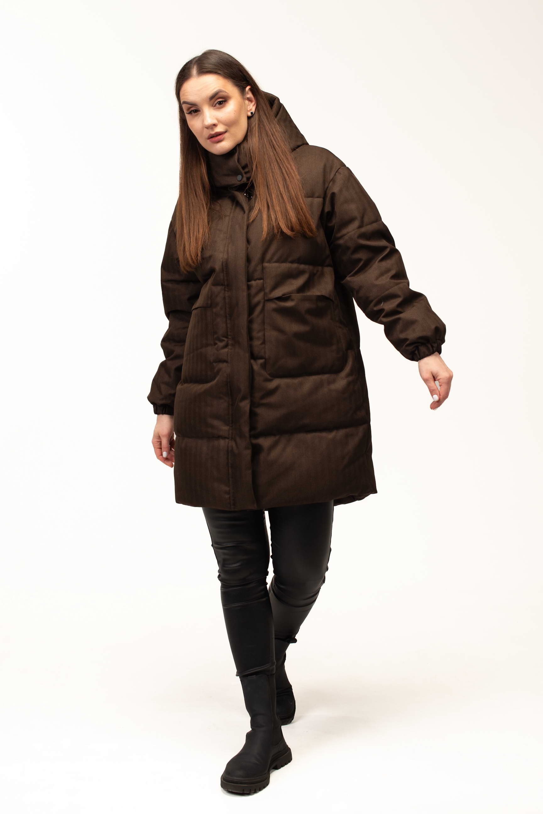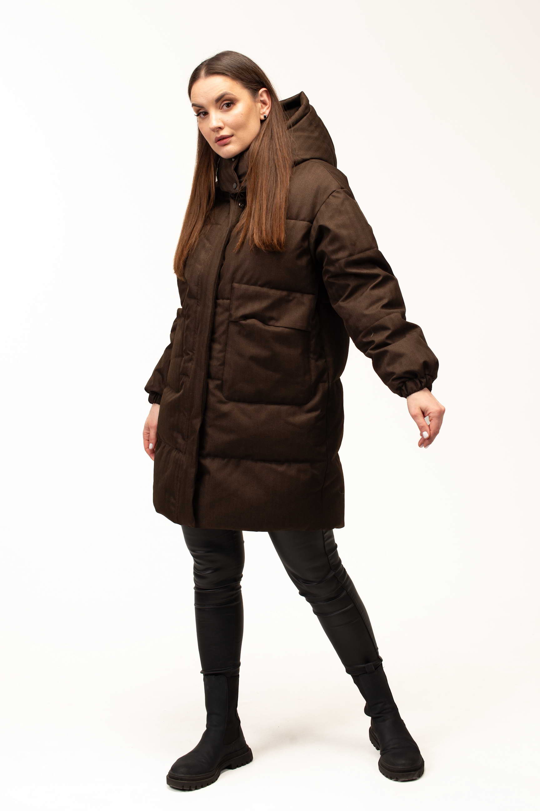 Глибокий коричневий відтінок додає образу стриманості та елегантності, добре поєднується з базовим гардеробом і підходить для створення як повсякденних, так і більш класичних зимових луків. Подовжена довжина 100 см забезпечує додатковий захист від холоду та вітру, що особливо актуально під час тривалих прогулянок або активного способу життя.