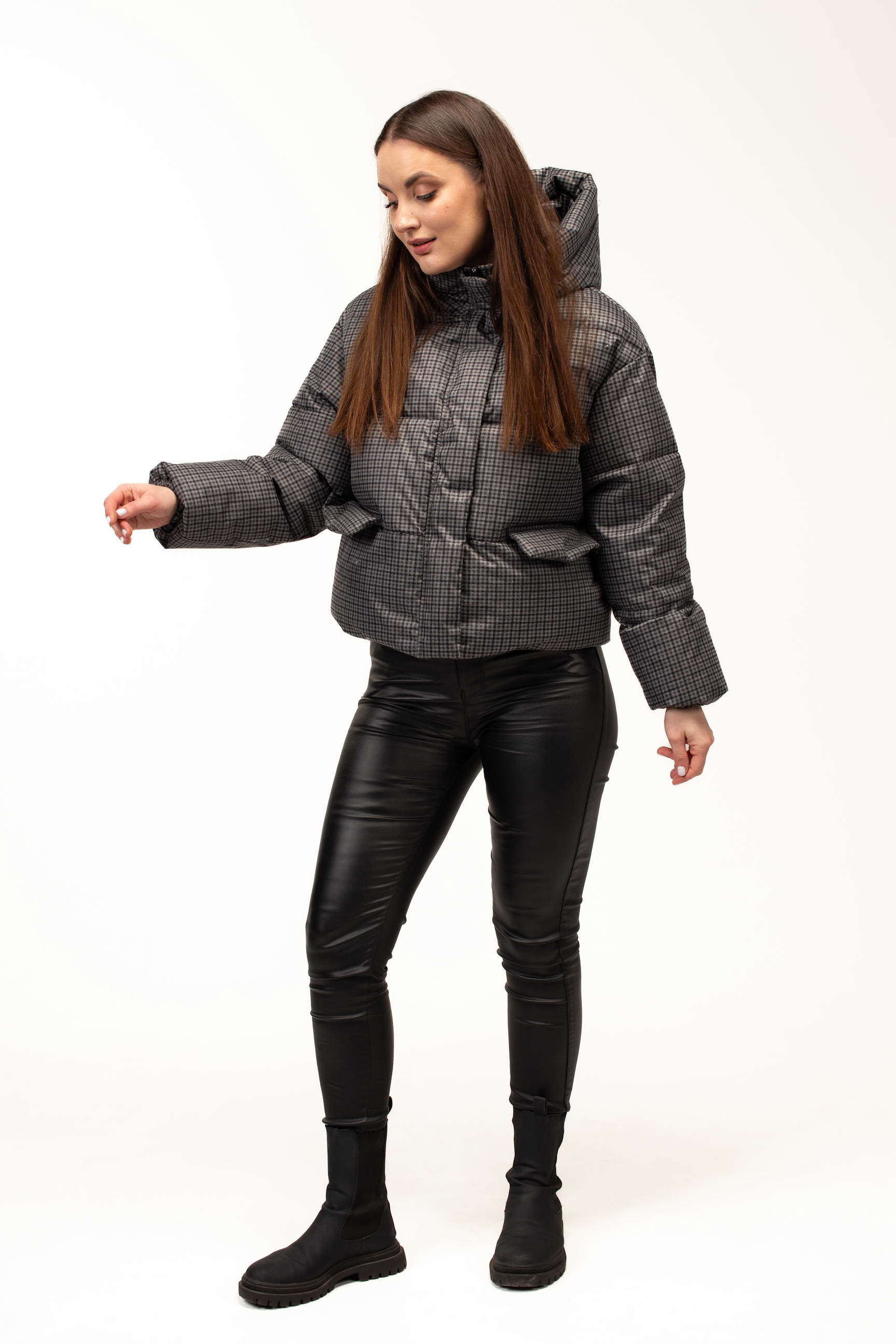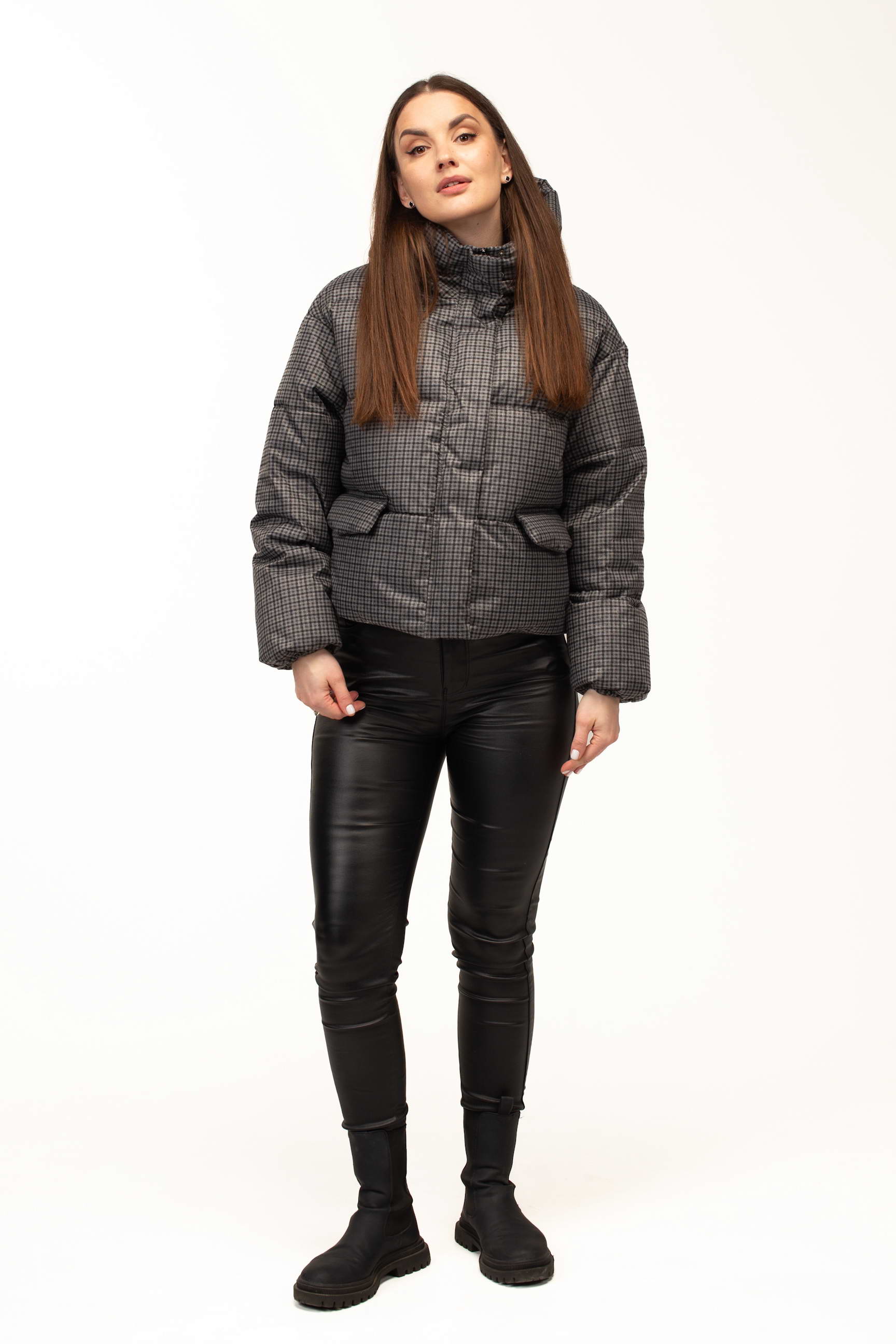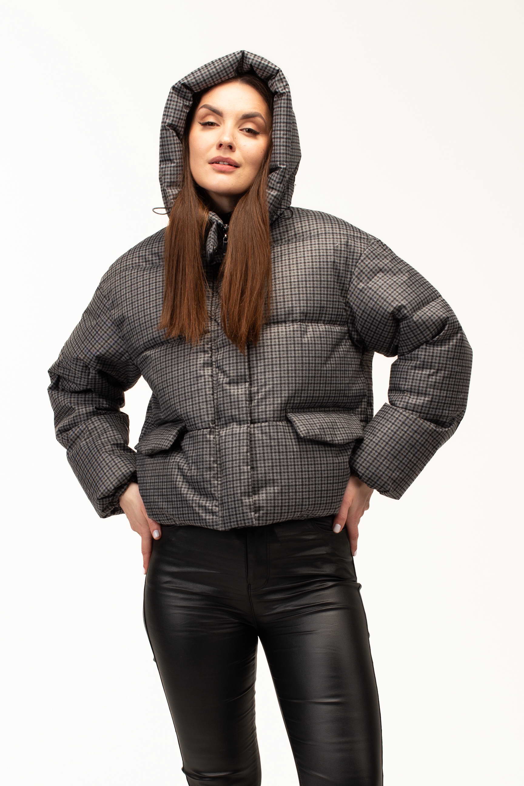 Дизайн у вигляді клітинки у стриманому сірому відтінку додає куртці сучасного та елегантного вигляду. Такий принт є універсальним і легко поєднується з різними стилями одягу — від повсякденного casual до більш класичних зимових образів. Довжина 60 см робить модель зручною для активного ритму життя та щоденного носіння у місті.