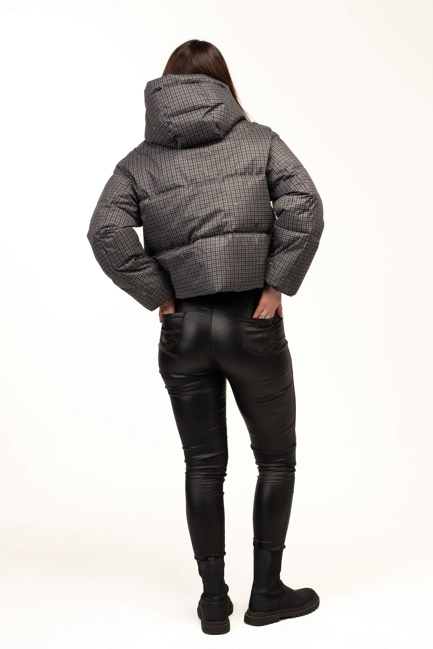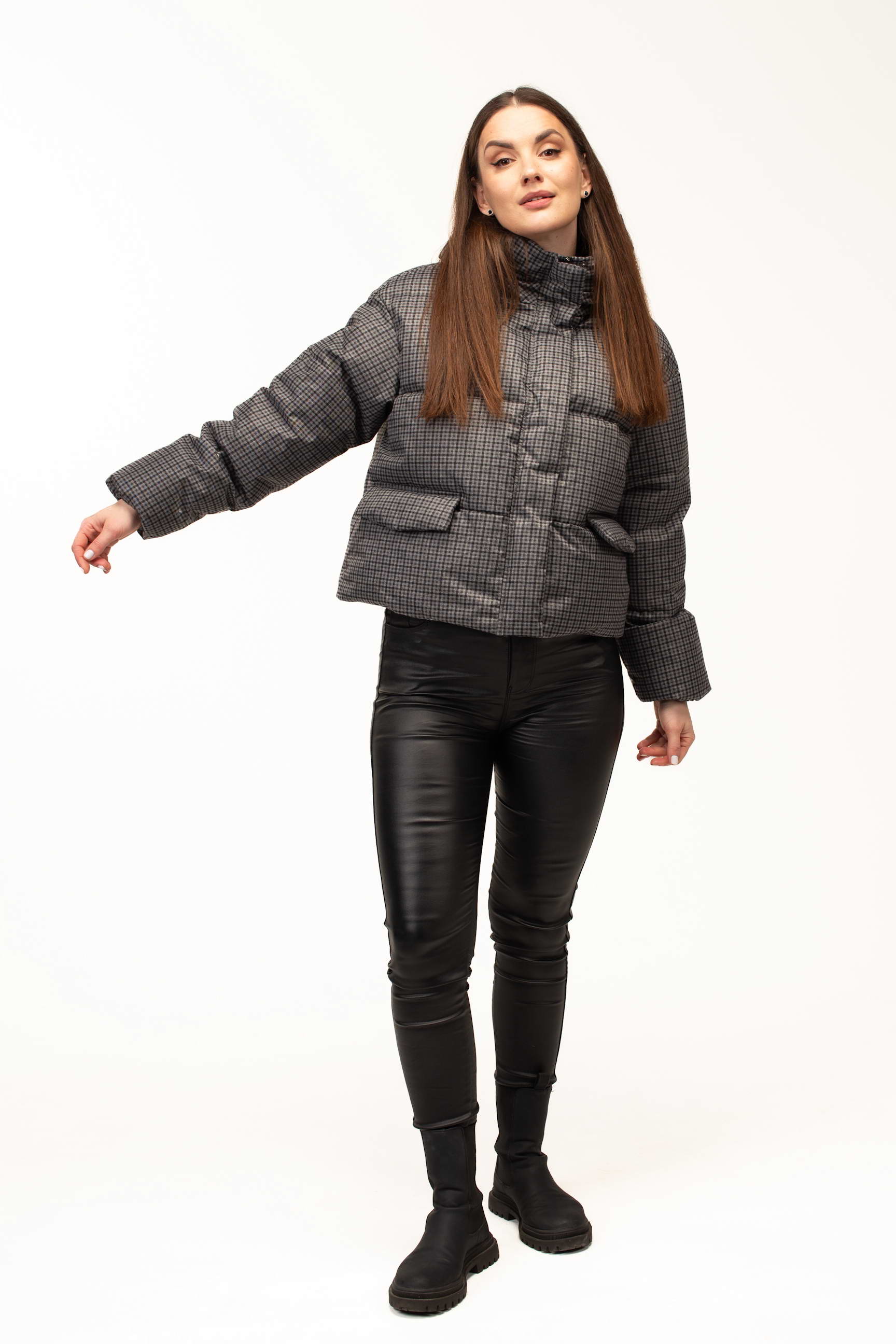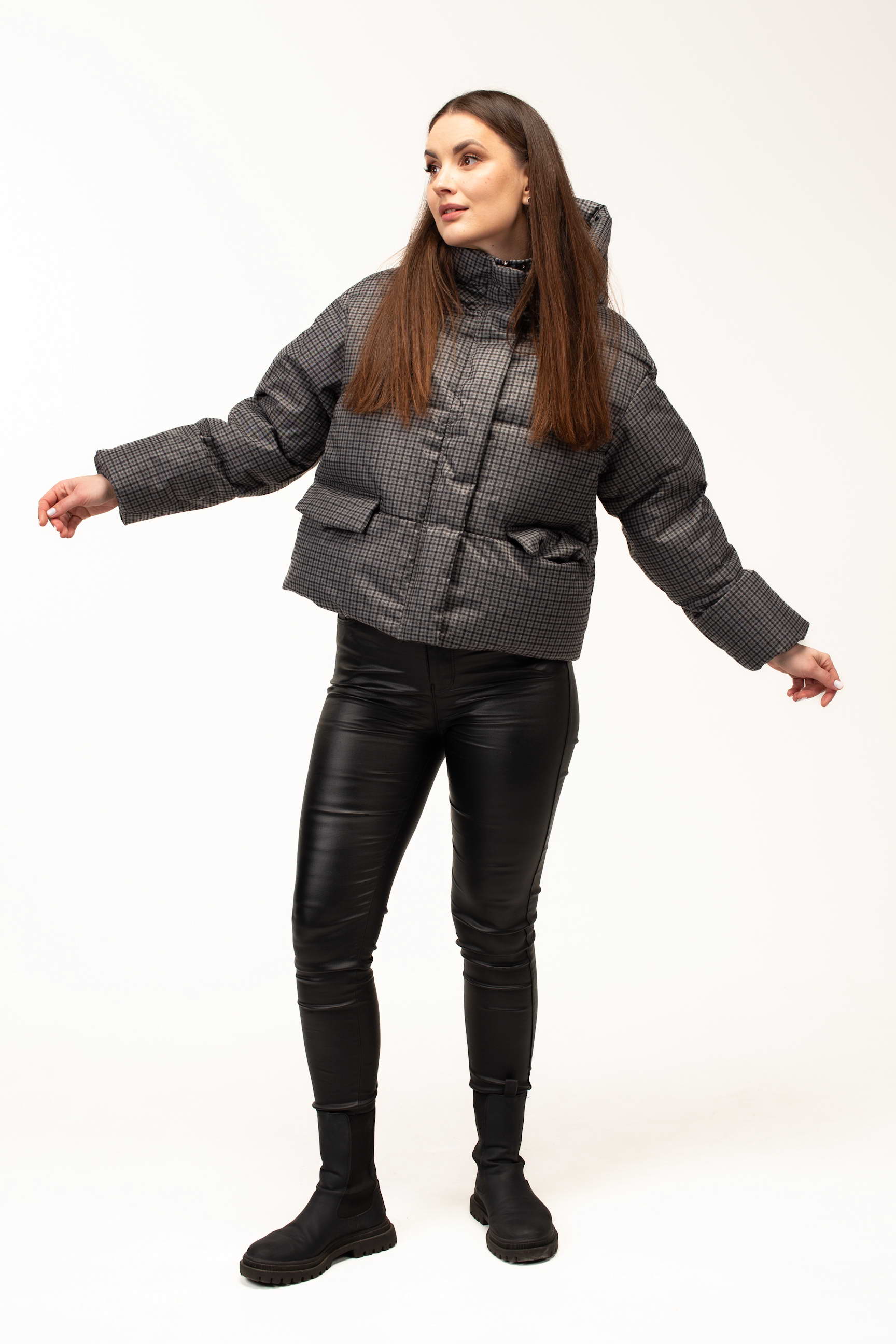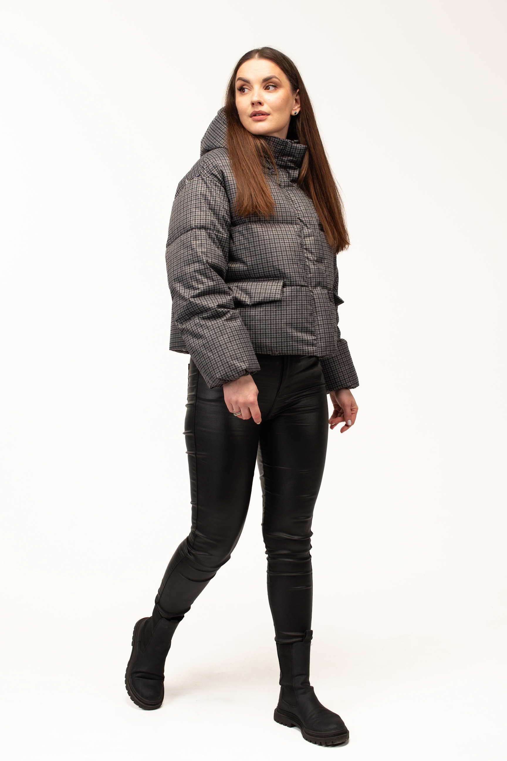 Дизайн у вигляді клітинки у стриманому сірому відтінку додає куртці сучасного та елегантного вигляду. Такий принт є універсальним і легко поєднується з різними стилями одягу — від повсякденного casual до більш класичних зимових образів. Довжина 60 см робить модель зручною для активного ритму життя та щоденного носіння у місті.
