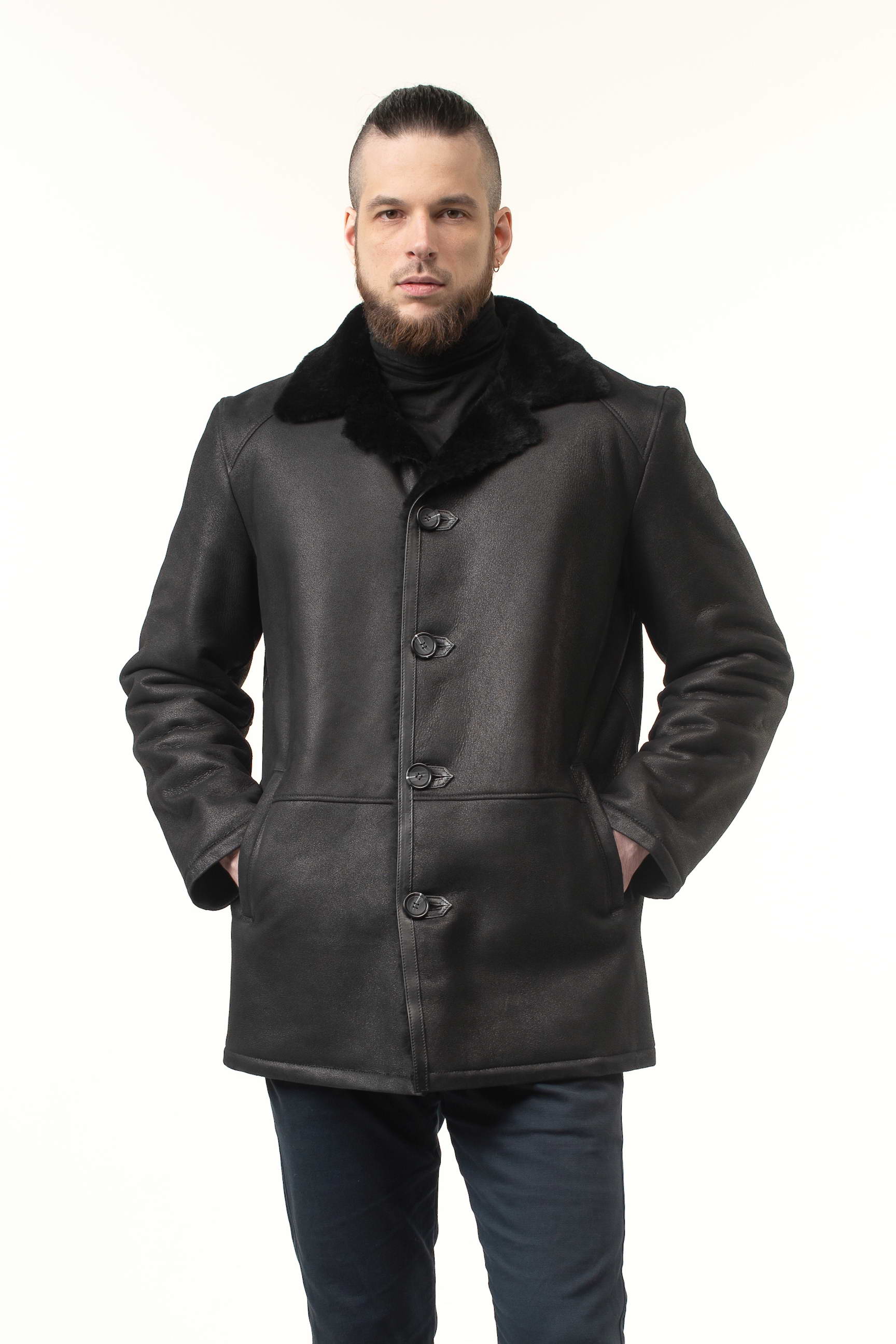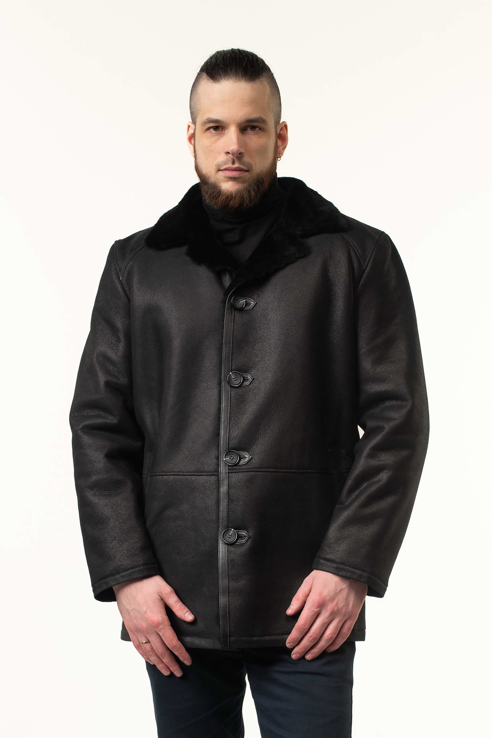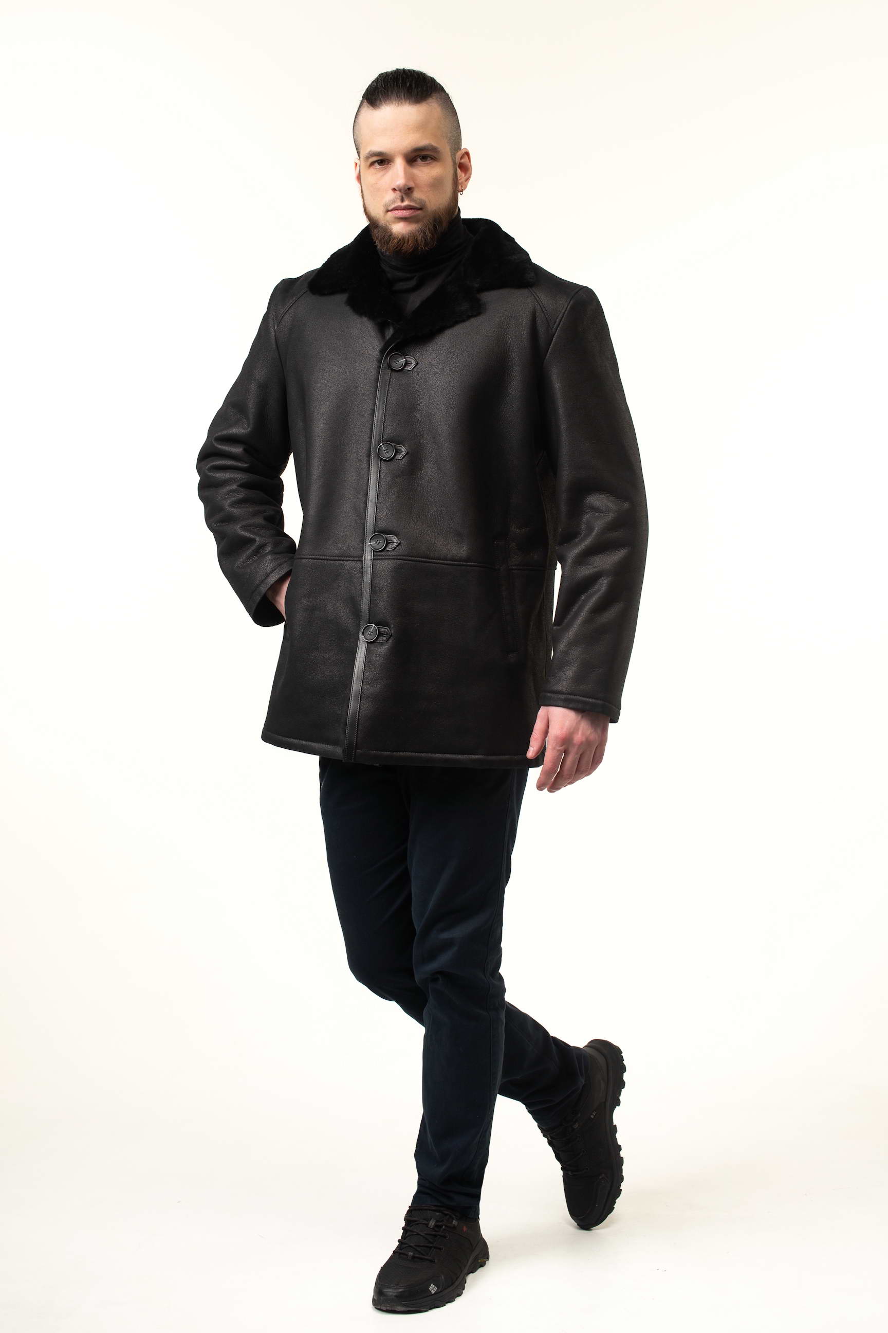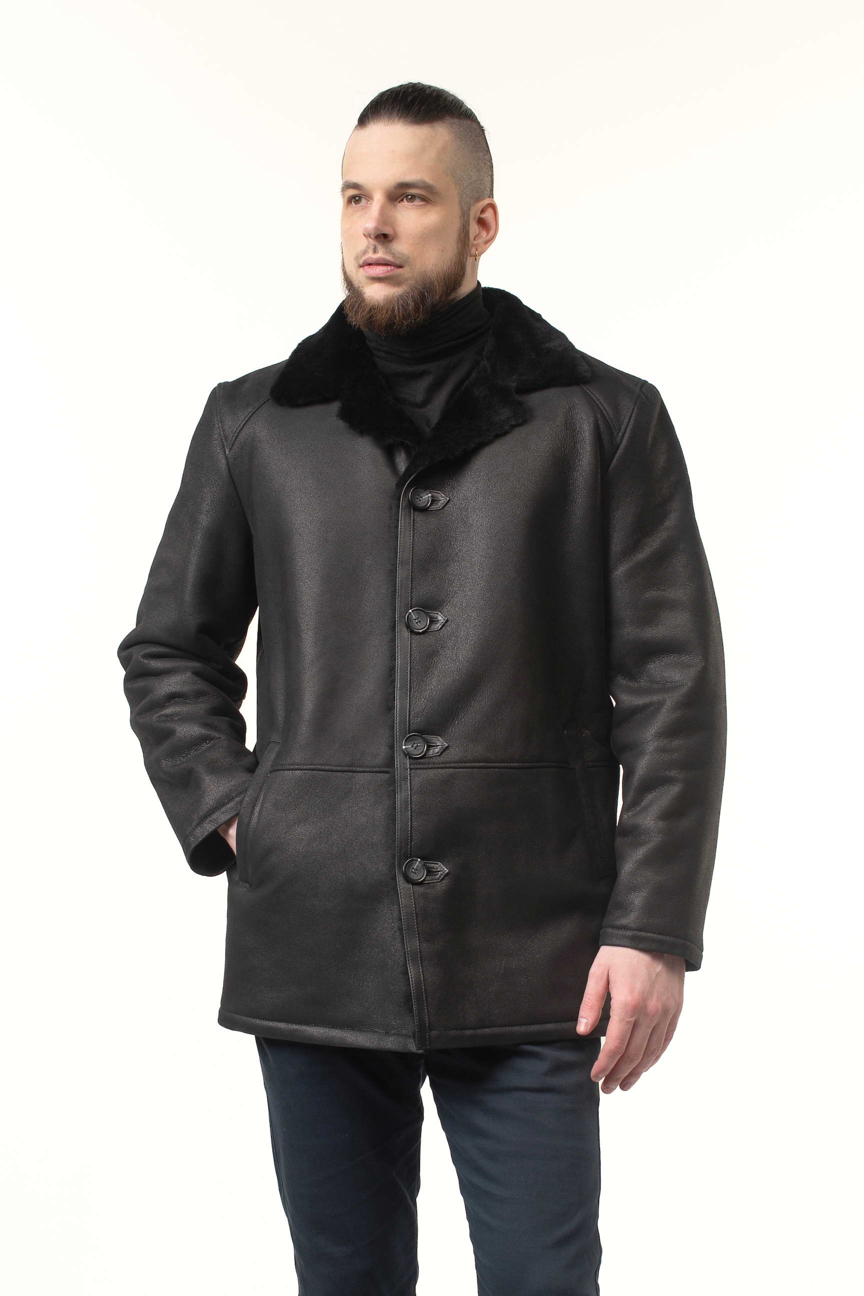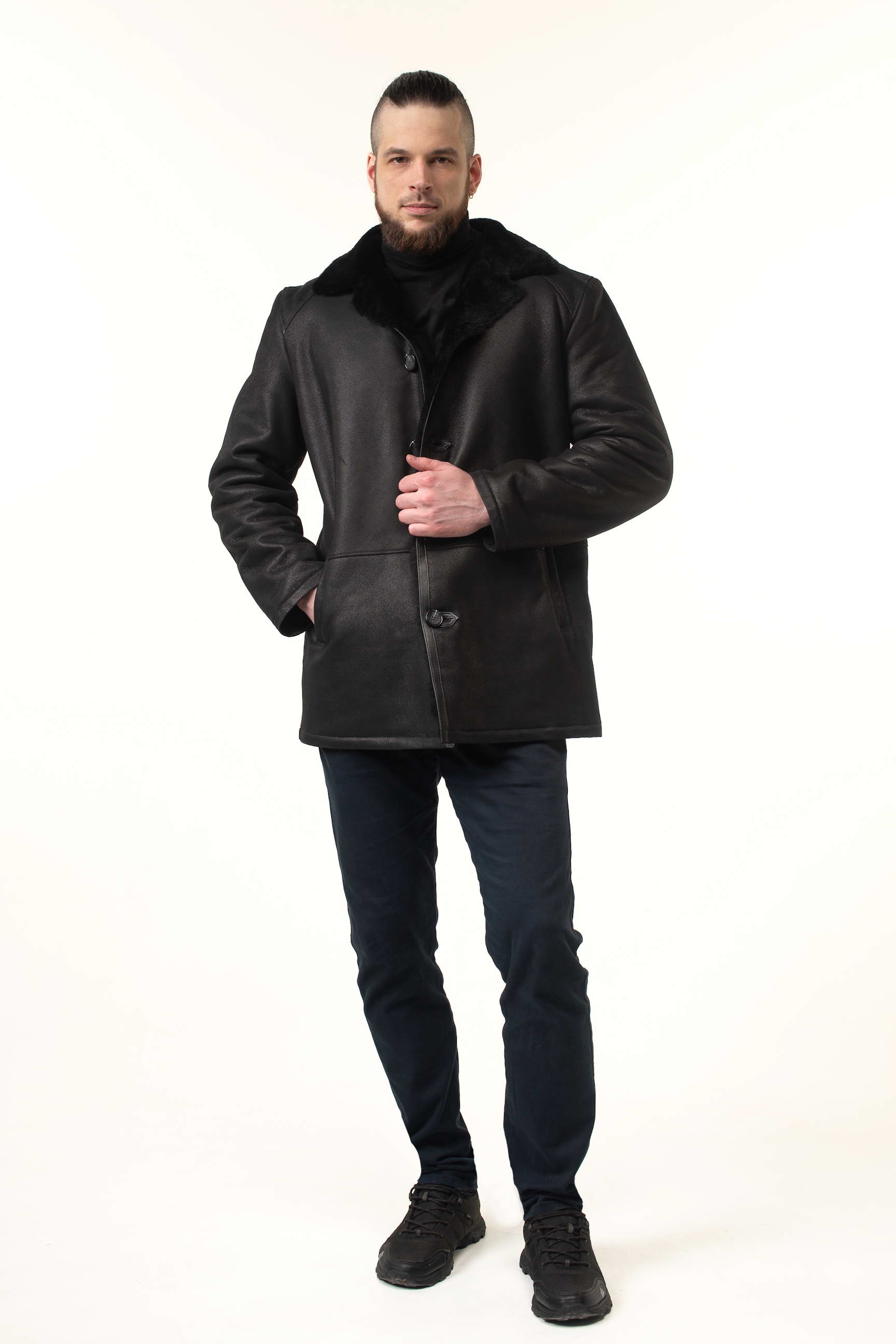 Замовляйте зараз і купуйте чоловічу дублянку чорного кольору з натуральної овчини, яка залишатиметься актуальною протягом багатьох сезонів завдяки класичному крою та елегантним деталям.