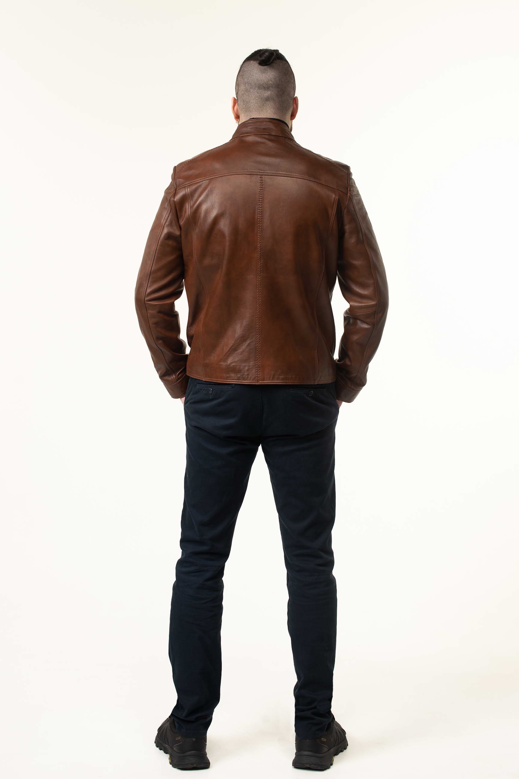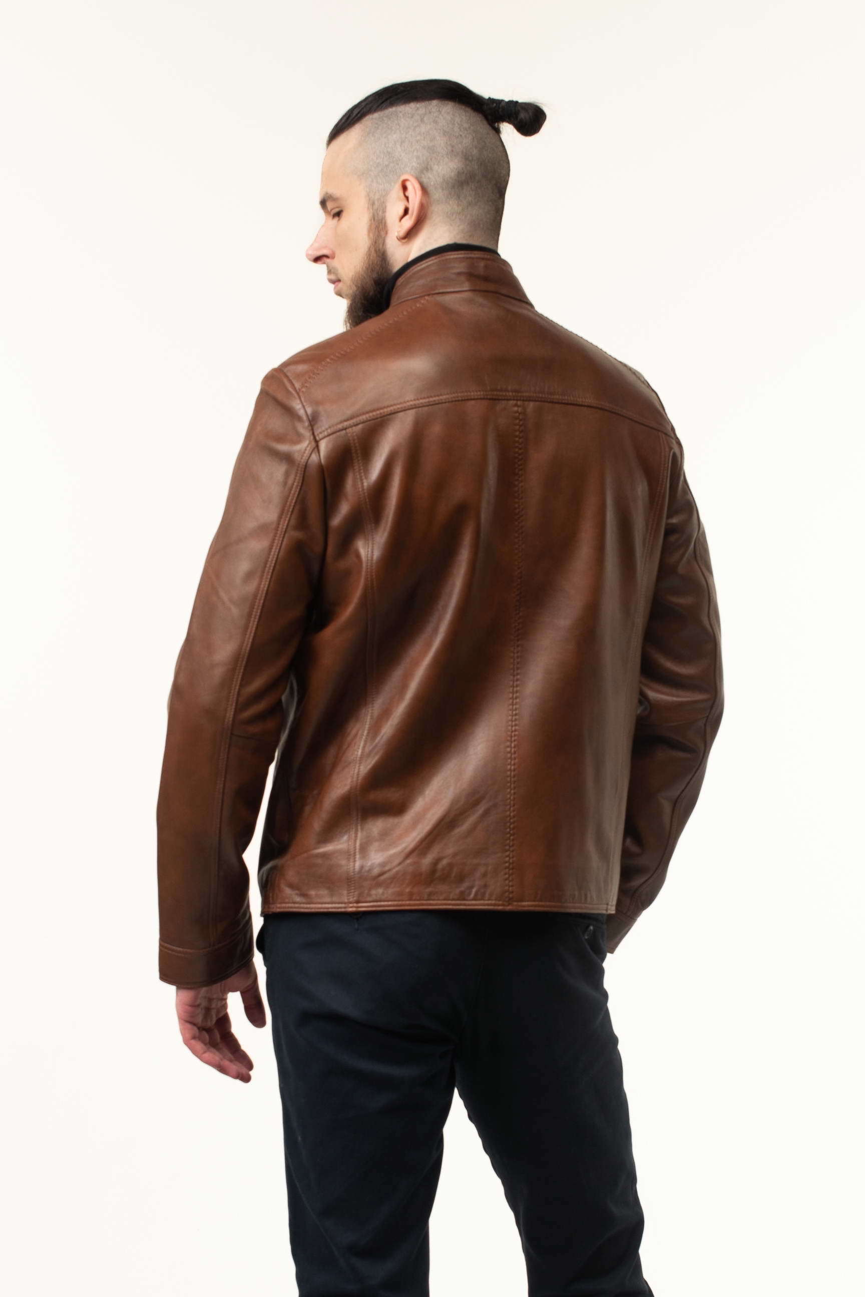 Елегантна чоловіча шкіряна куртка для сезону весна/осінь — поєднання преміальної якості матеріалу та сучасного дизайну. Модель виготовлена з натуральної телячої шкіри, яка відзначається м’якістю, міцністю та довговічністю. Глибокий коричневий відтінок надає виробу солідності, а затемнені шви підкреслюють геометрію крою і додають куртці виразного характеру.