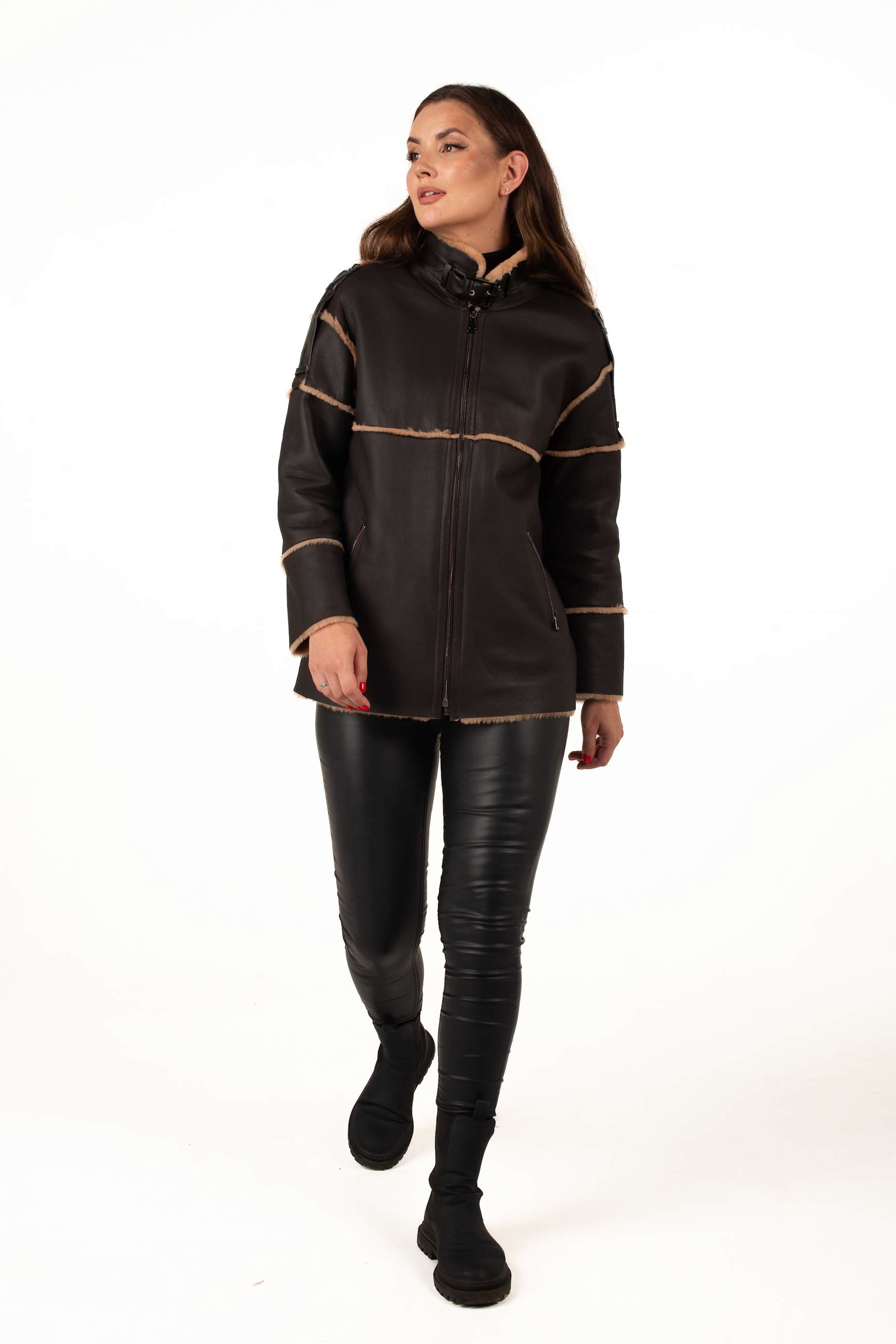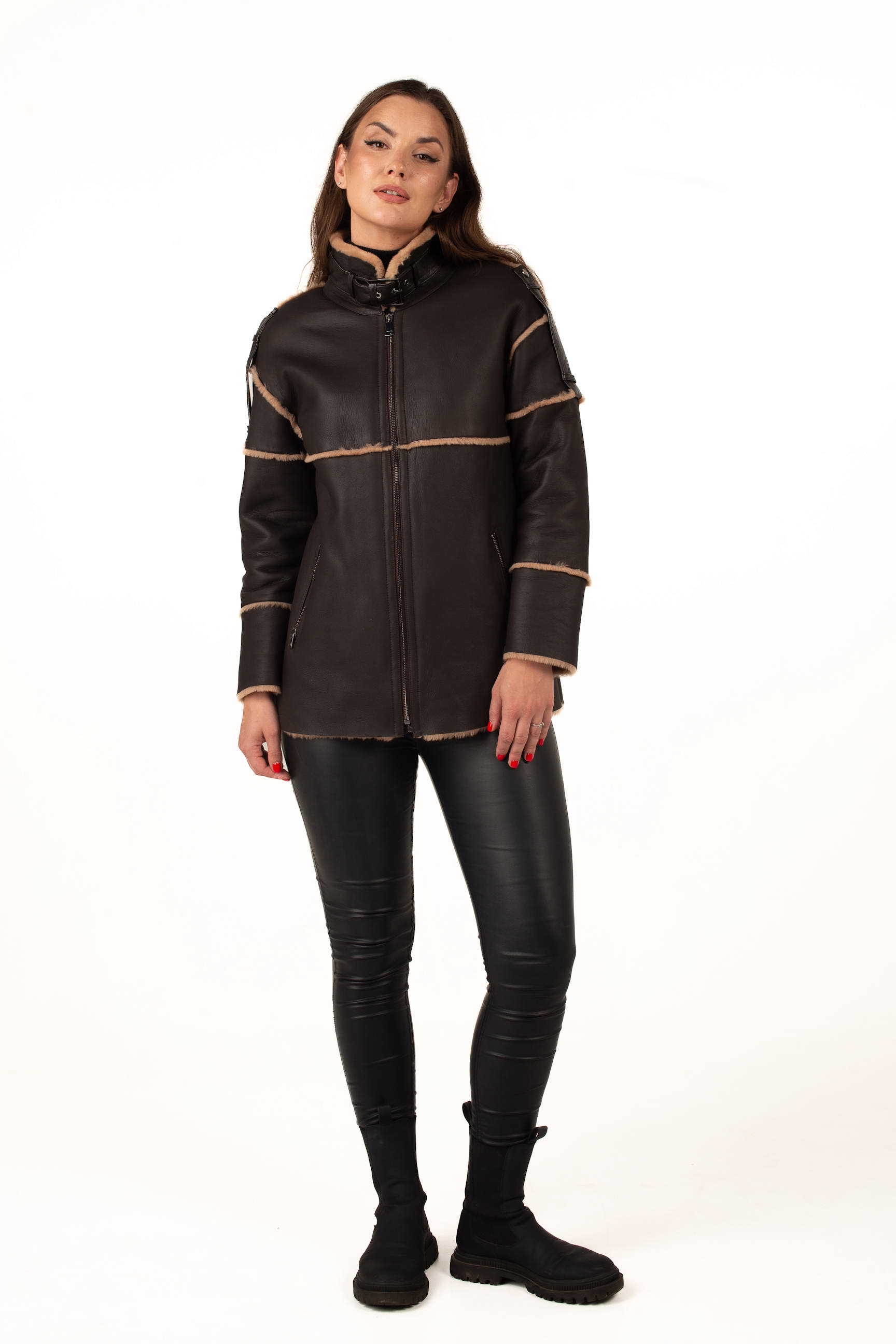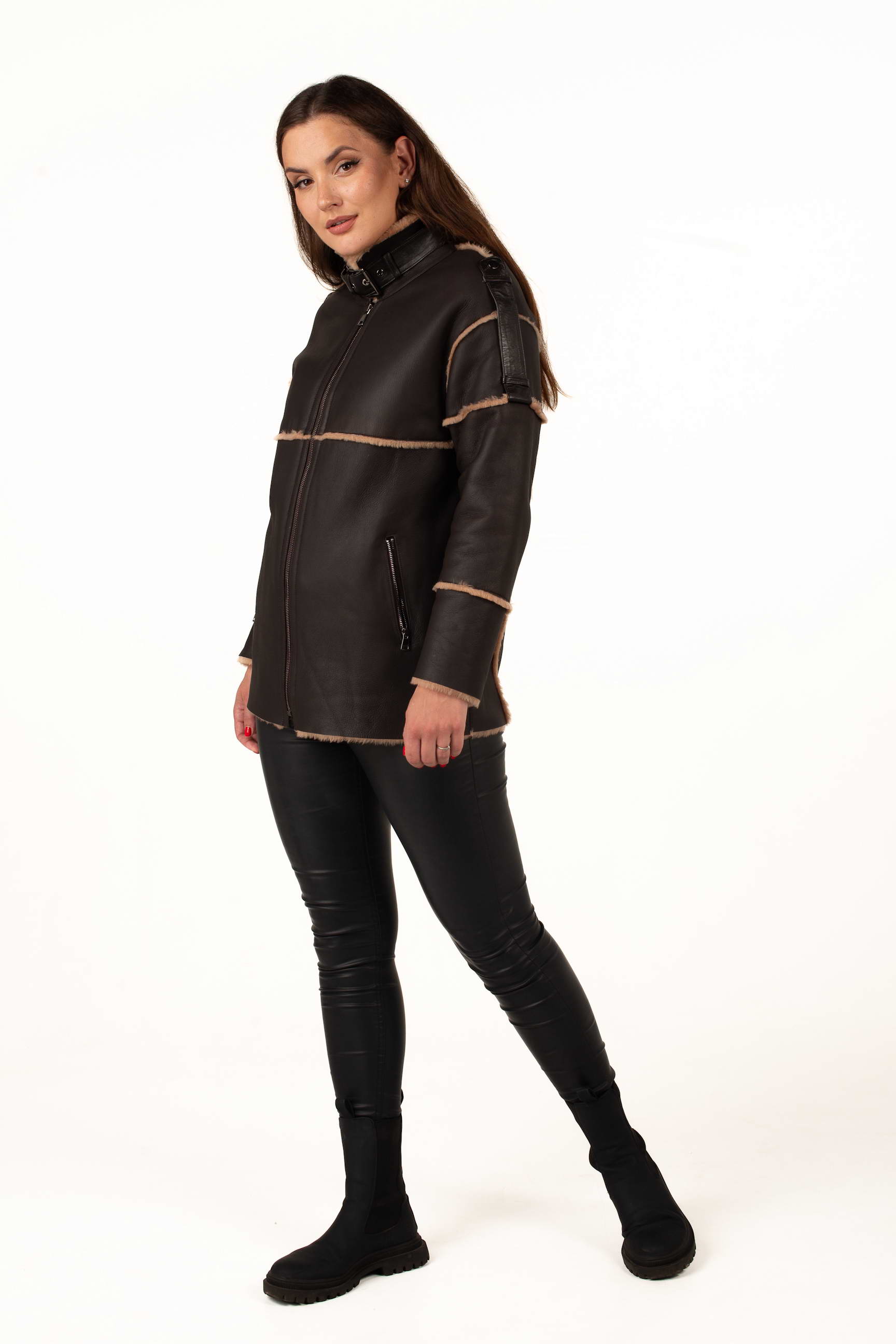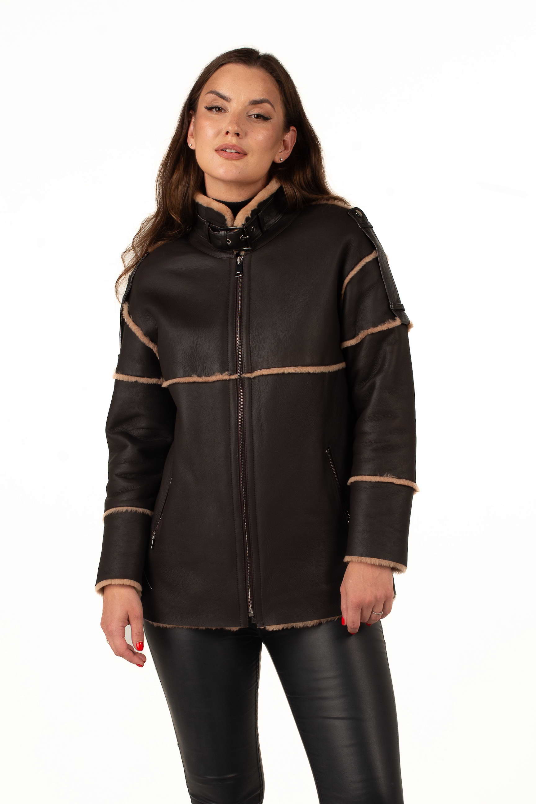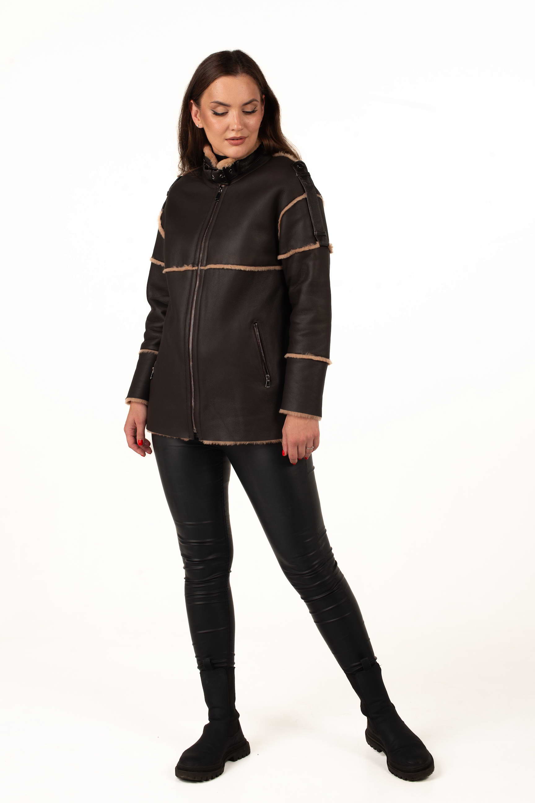 Коричнева дублянка з овчини підкреслює статус і витончений смак своєї власниці. Завдяки продуманому крою вона гарно сідає по фігурі та чудово поєднується з класичним або кежуал стилем.