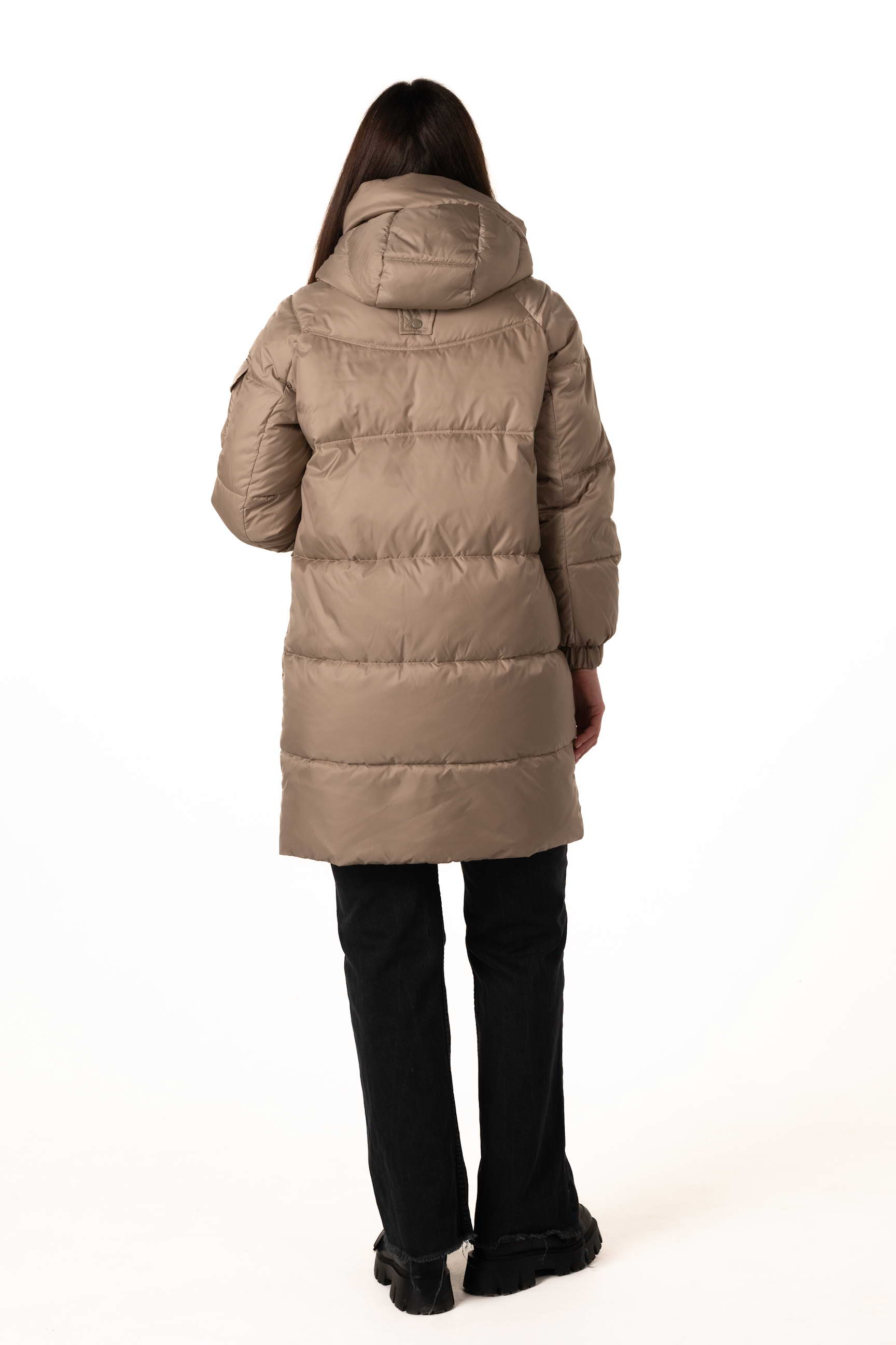 Накладной карман на рукаве придает образу оригинальности и современного вида, подчеркивая стильную деталь в дизайне пуховика.