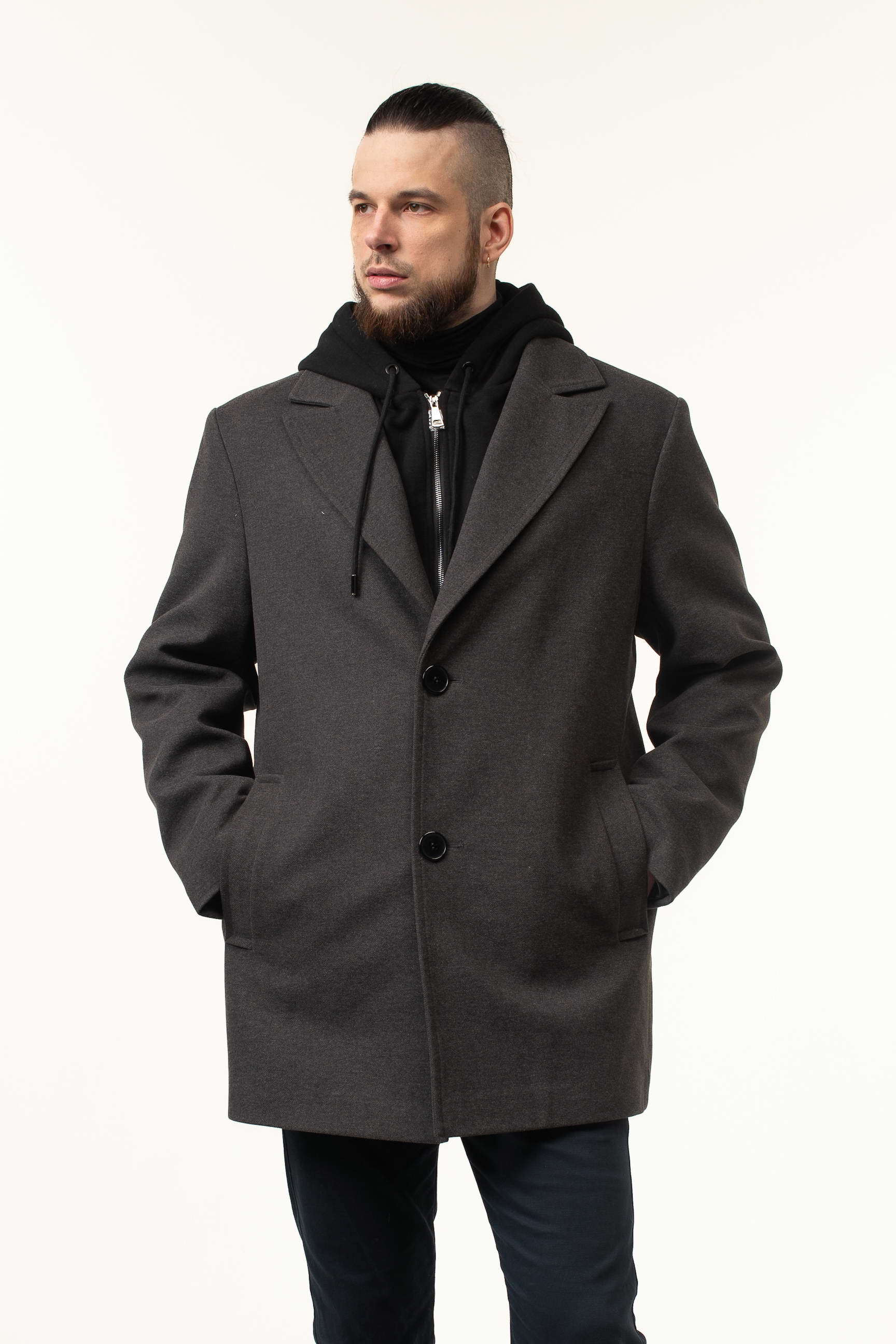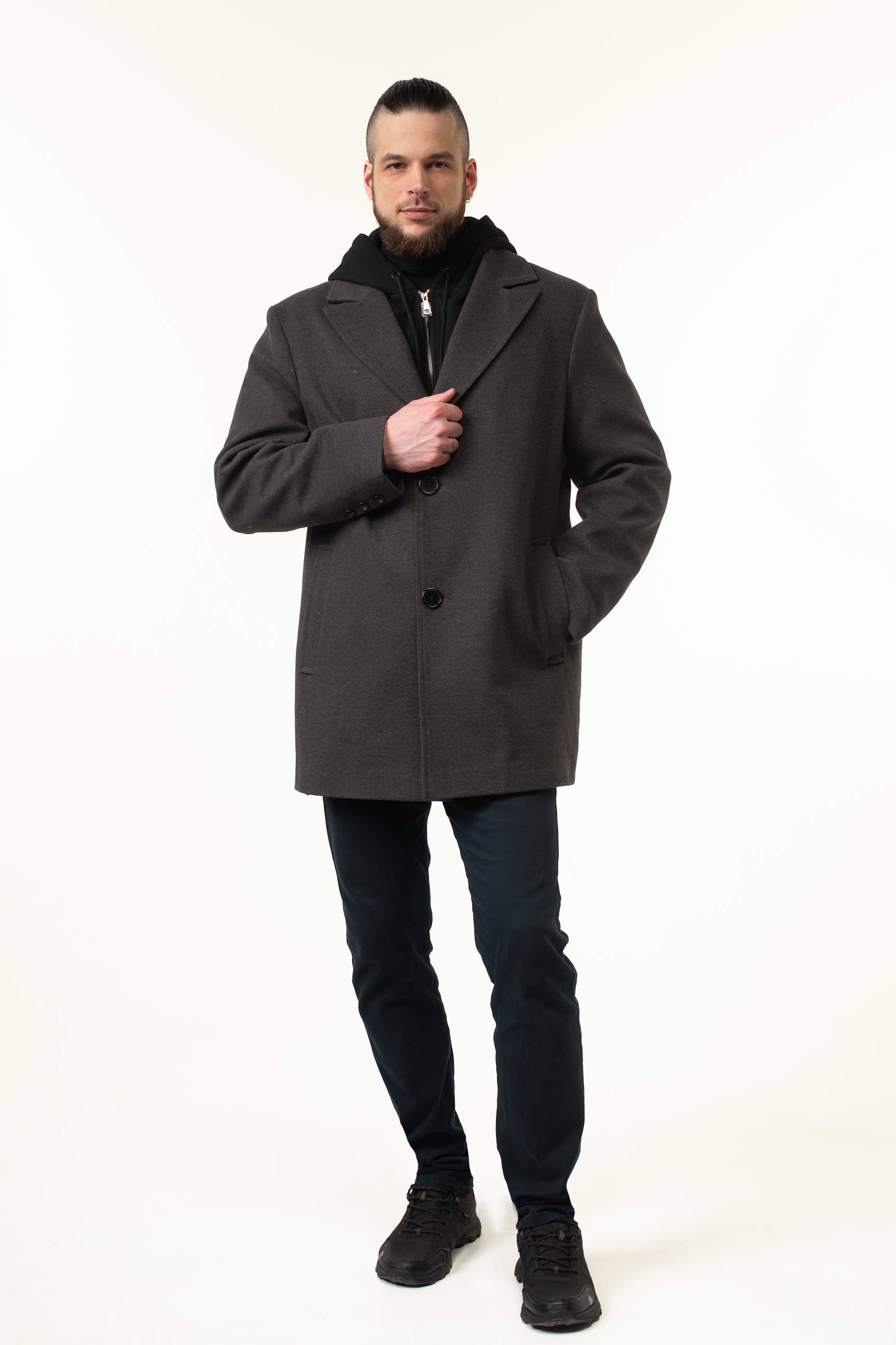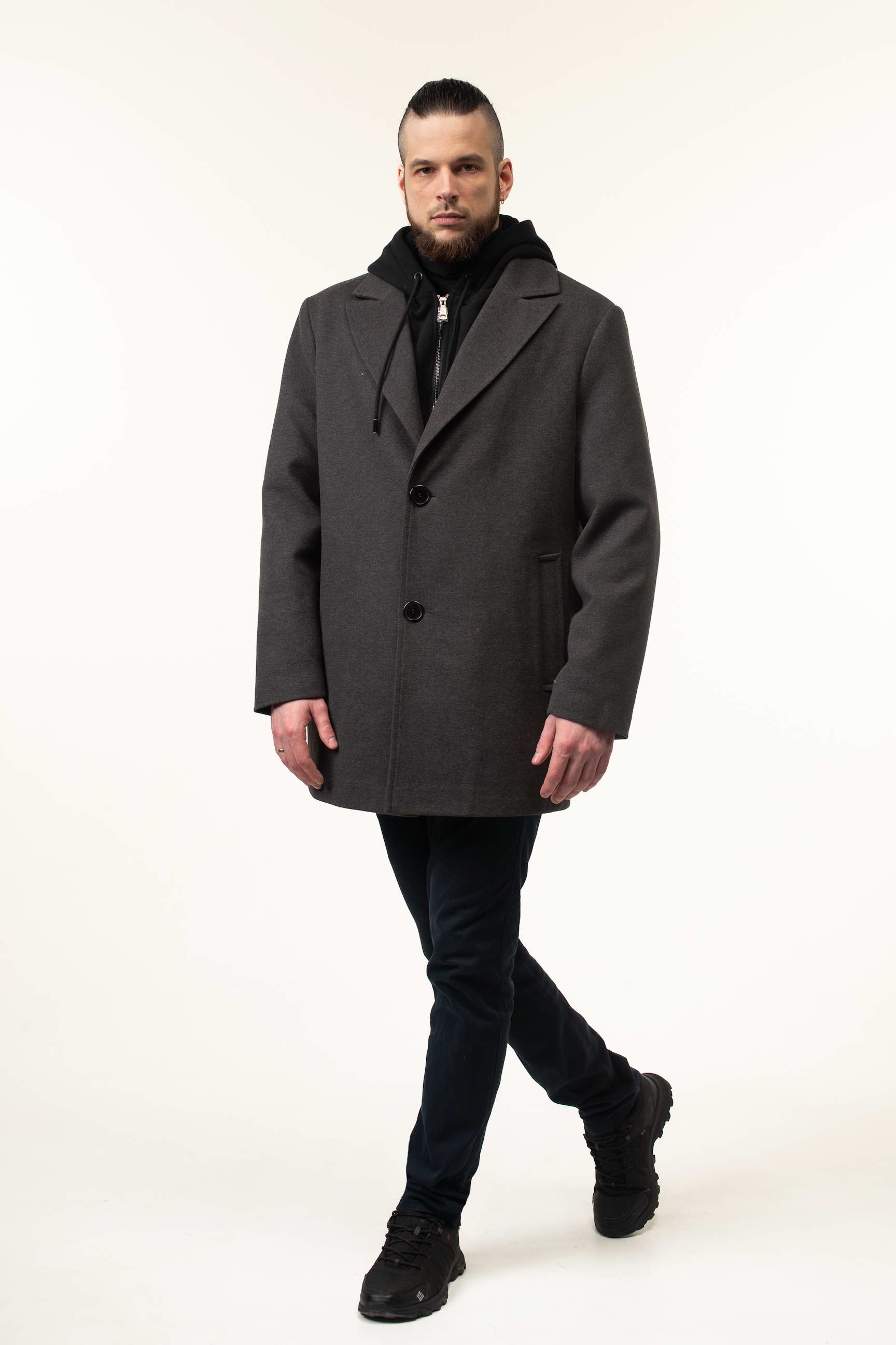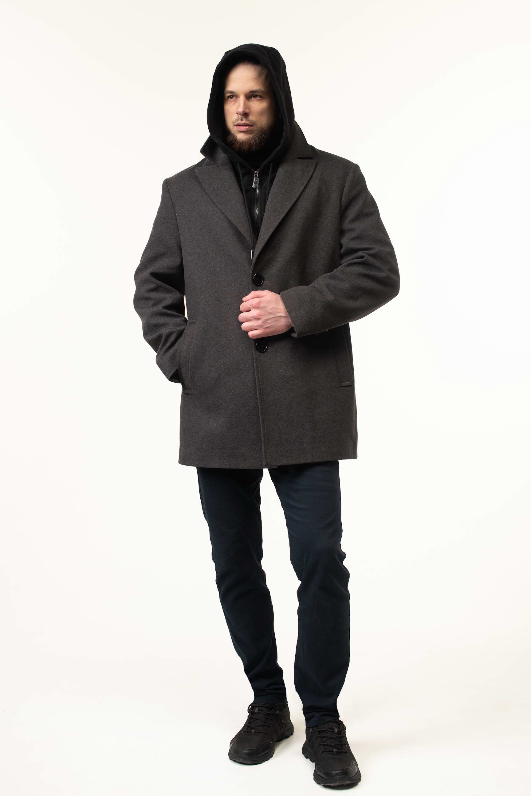 Особенностью этой модели является трикотажный съемный капюшон с воротником, который обеспечивает дополнительную защиту от ветра и непогоды, а также придает изделию современный спортивный акцент. Длина 90 см формирует современный прямой силуэт, подчеркивающий мужскую фигуру и делая пальто удобным в носке в межсезонье. Английский воротник добавляет образу элегантности, а классическая застежка на пуговицы обеспечивает практичность и легкость одевания.
