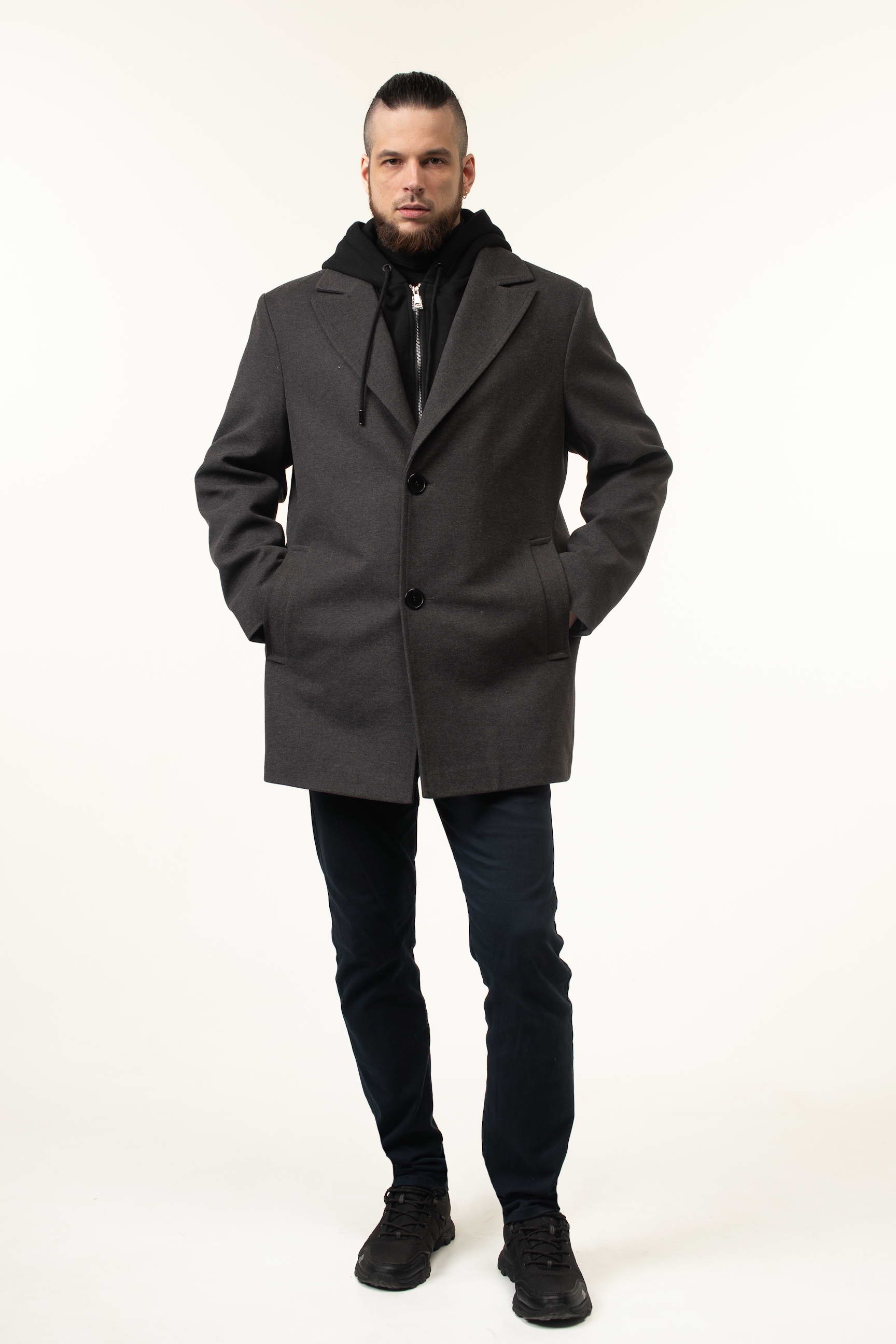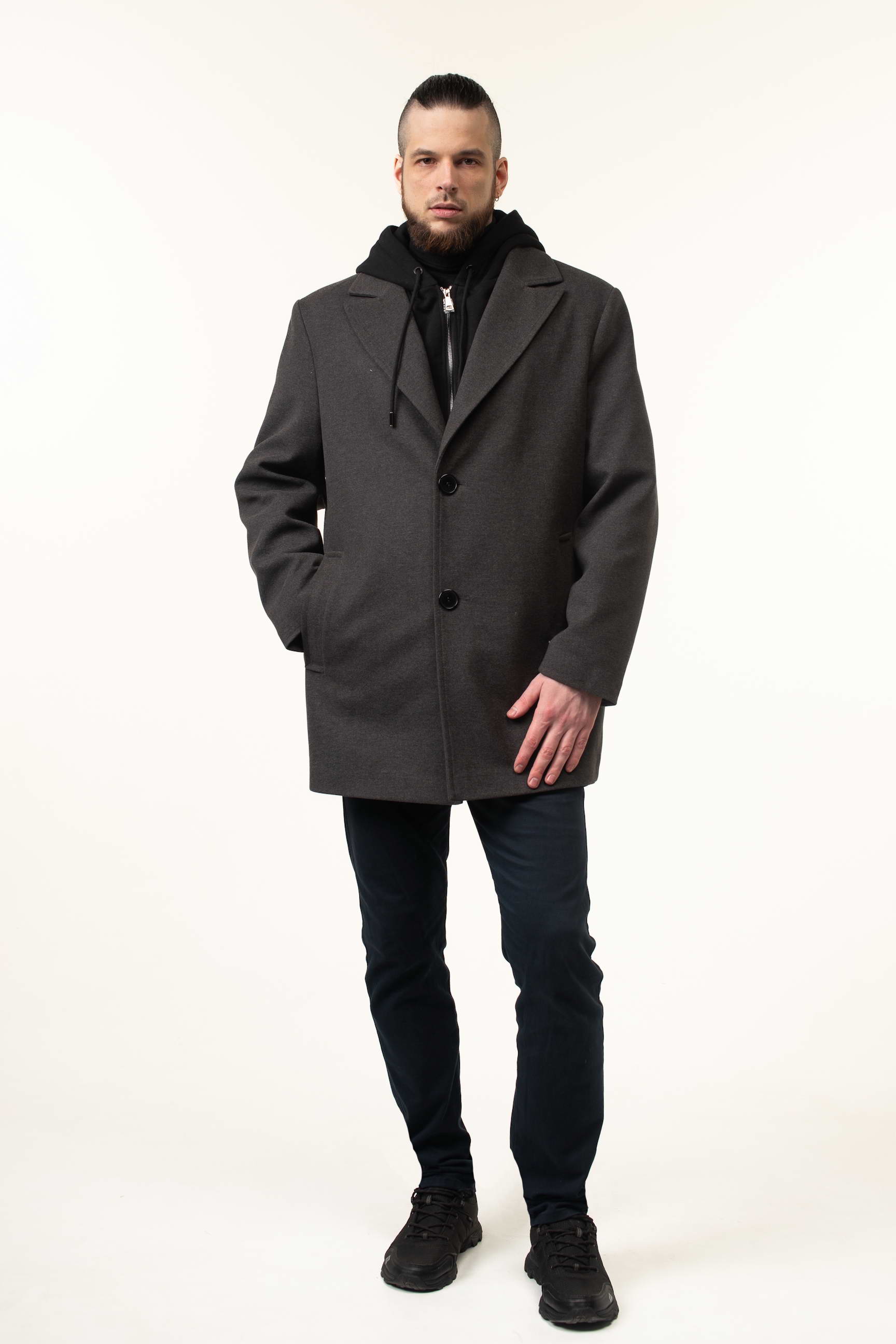 Это мужское пальто станет универсальной базовой моделью для весны и осени. Высокое качество материала, продуманный крой и функциональные детали, такие как съемный трикотажный капюшон, делают его практичным и стильным выбором для любого мужчины.