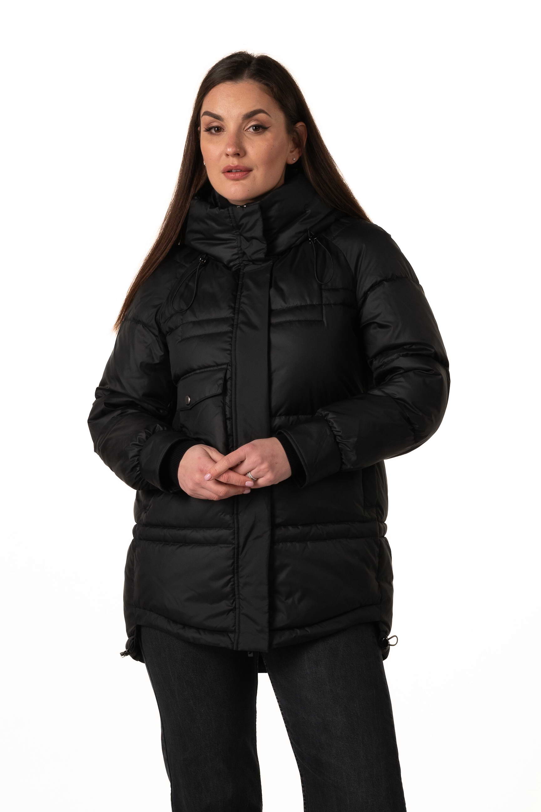Регульовані куліски дозволяють підкреслити талію або додати об’єму за потреби, формуючи бажаний силует і роблячи носіння пуховика більш комфортним.