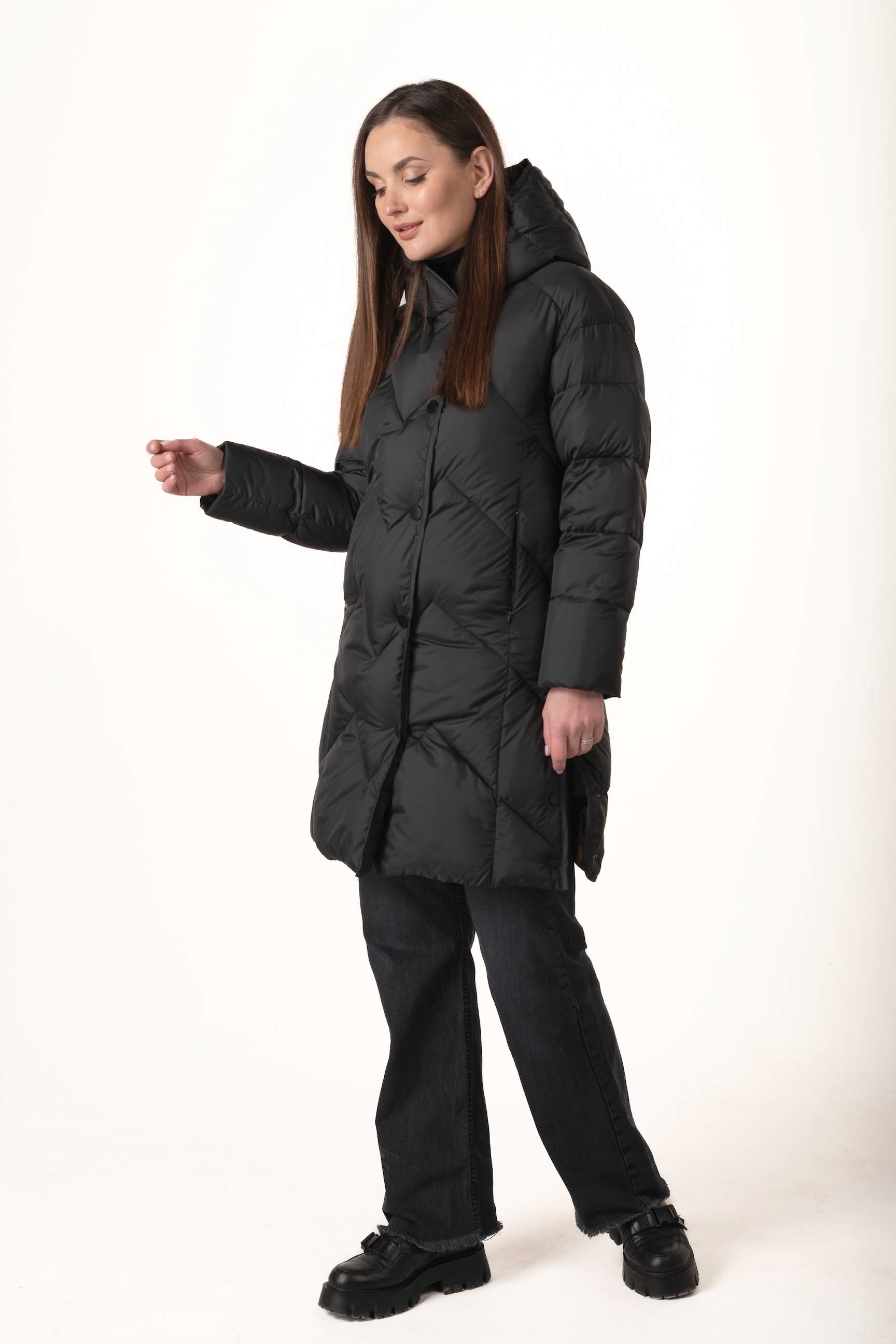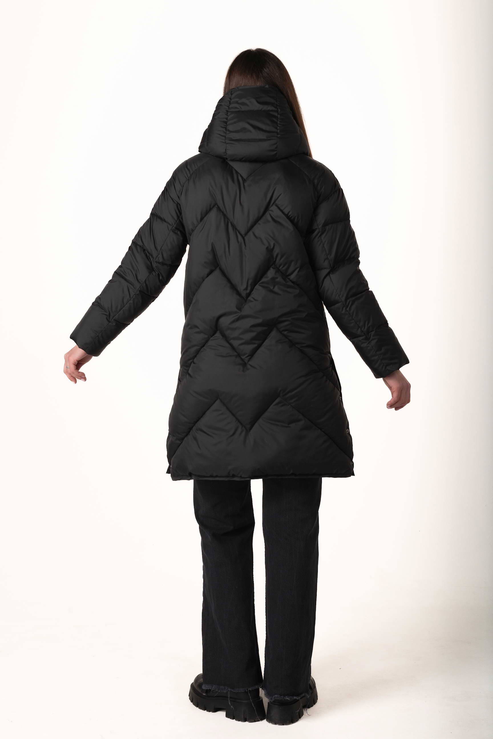 Высокий воротник-стойка вместе с капюшоном надежно защищают шею и голову от холодного воздуха и ветра, создавая ощущение уюта в морозные дни.