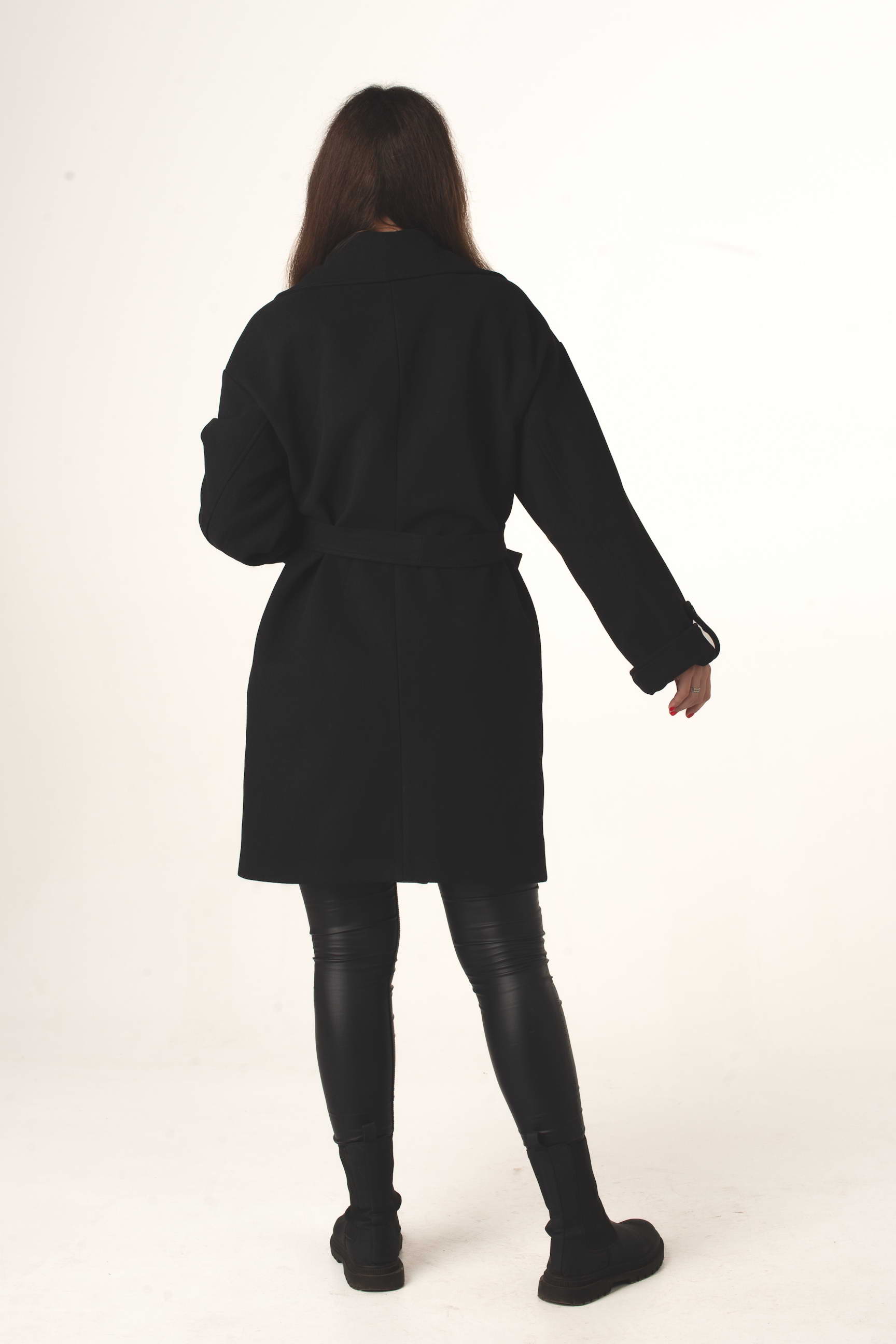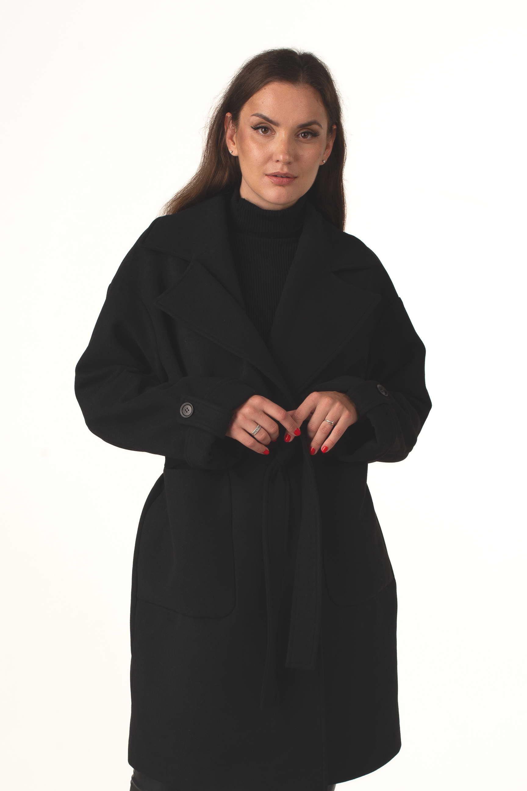 Стильное женское пальто из кашемира в классическом черном цвете сочетает элегантность, комфорт и практичность. Модель имеет английский воротник, который придаёт строгий и изысканный вид, а накладные карманы и пояс делают образ завершённым и удобным для повседневного ношения.