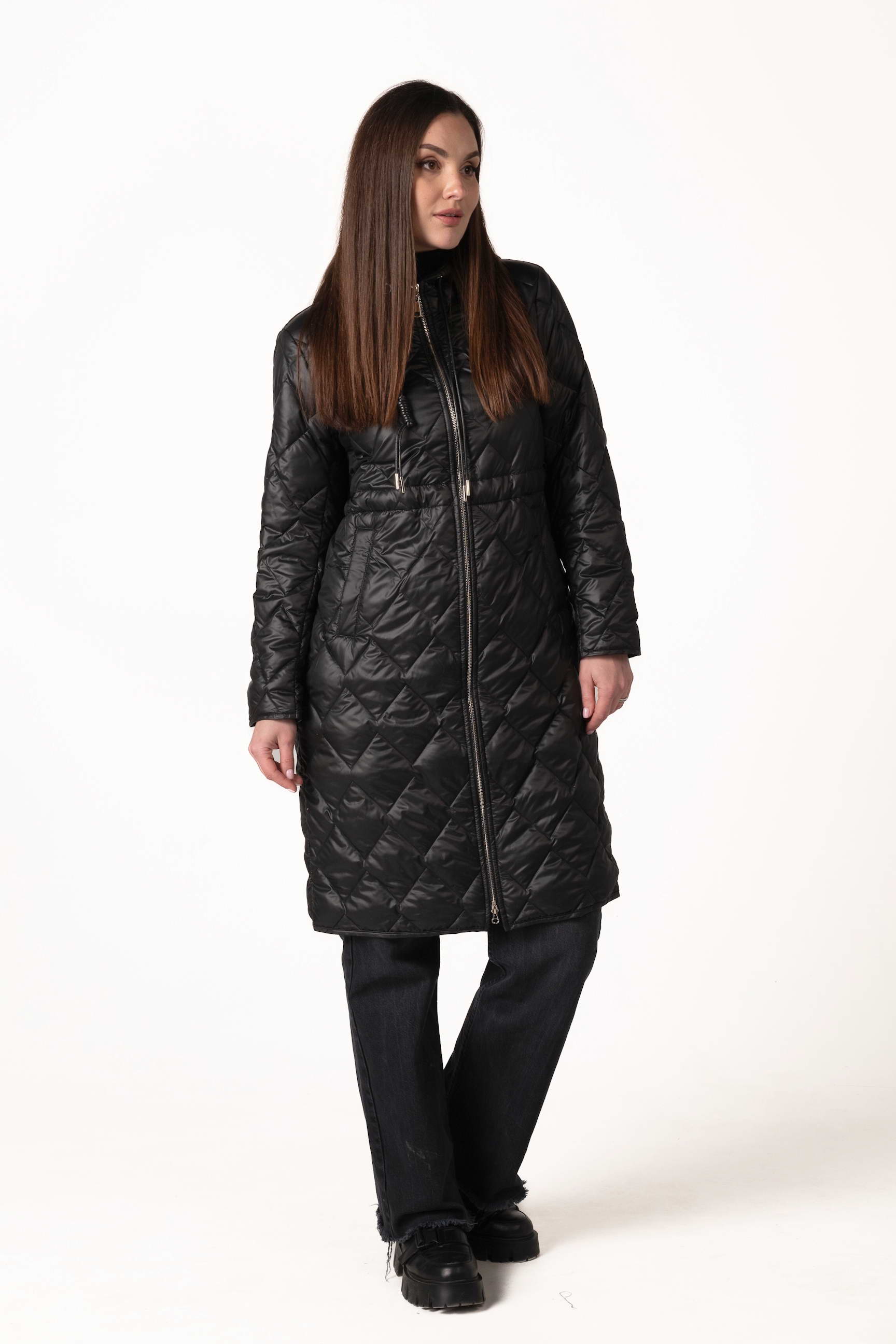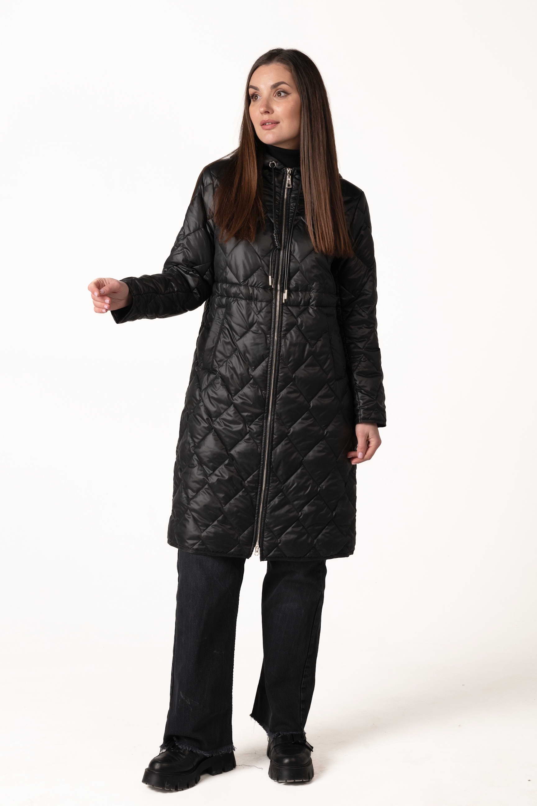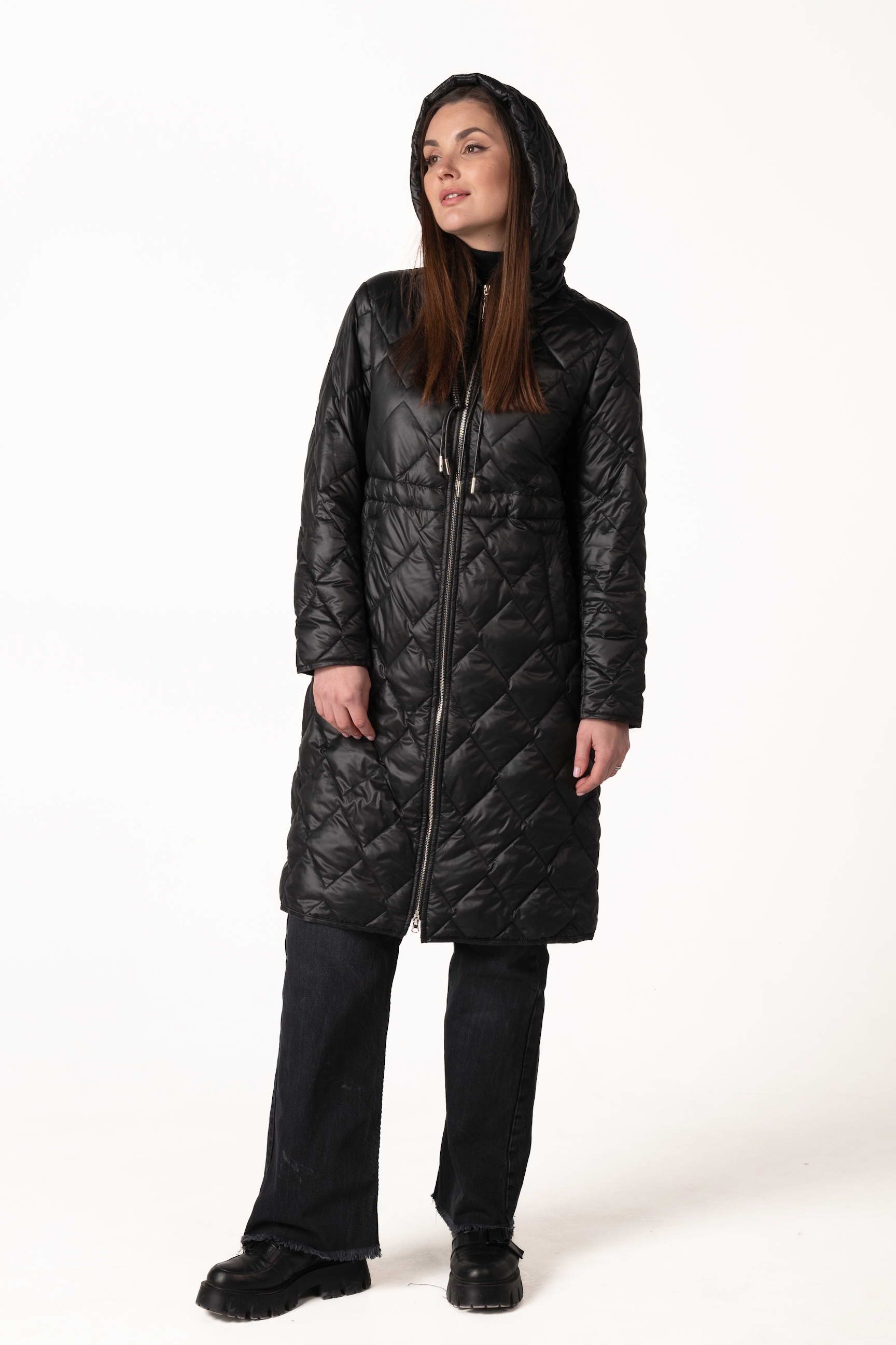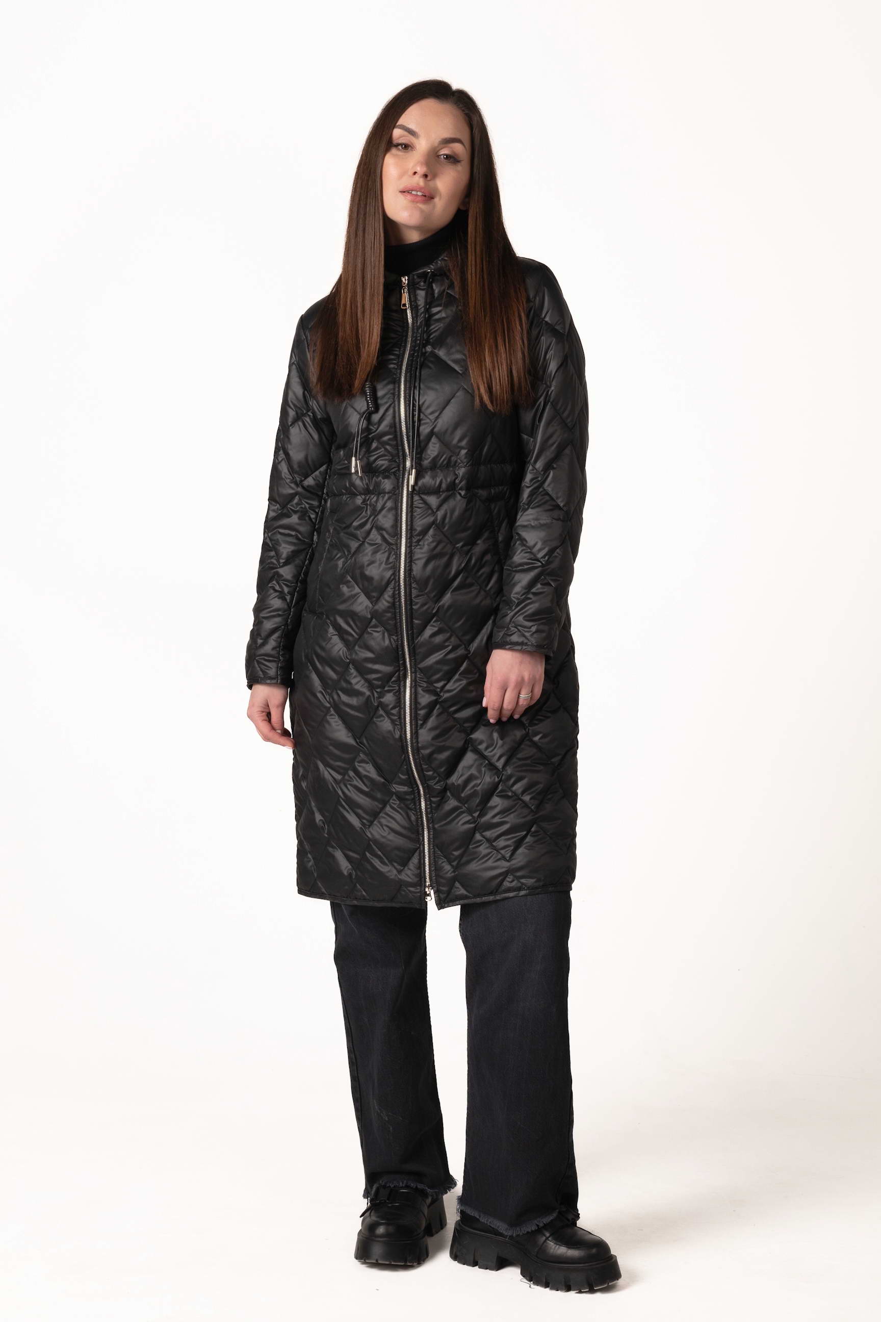 Современный черный женский демисезонный биопуховик — оптимальный выбор для прохладной весны и осени. Модель оснащена высоким воротником-стойкой с капюшоном, кулиской на талии и ромбовидной прострочкой, которая подчеркивает стильный силуэт и придает образу элегантность. Если вы ищете, где купить женскую демисезонную куртку, эта модель станет практичным и стильным решением для повседневного ношения.