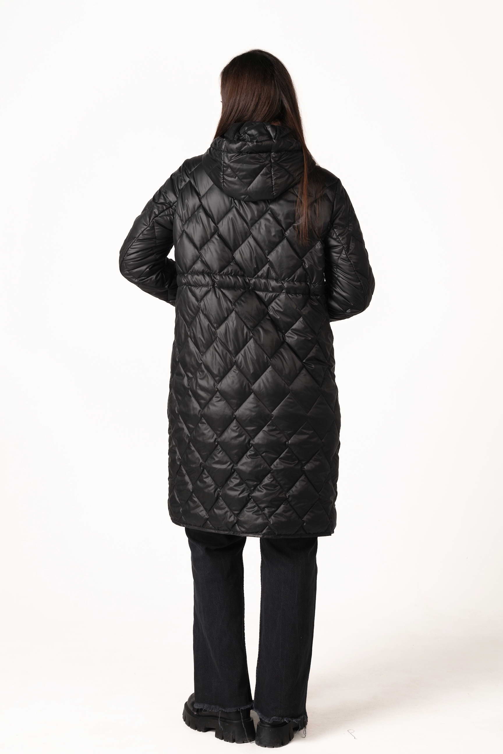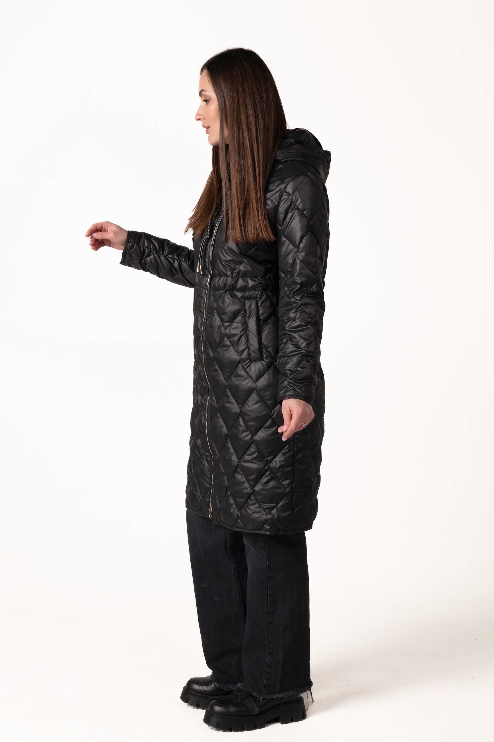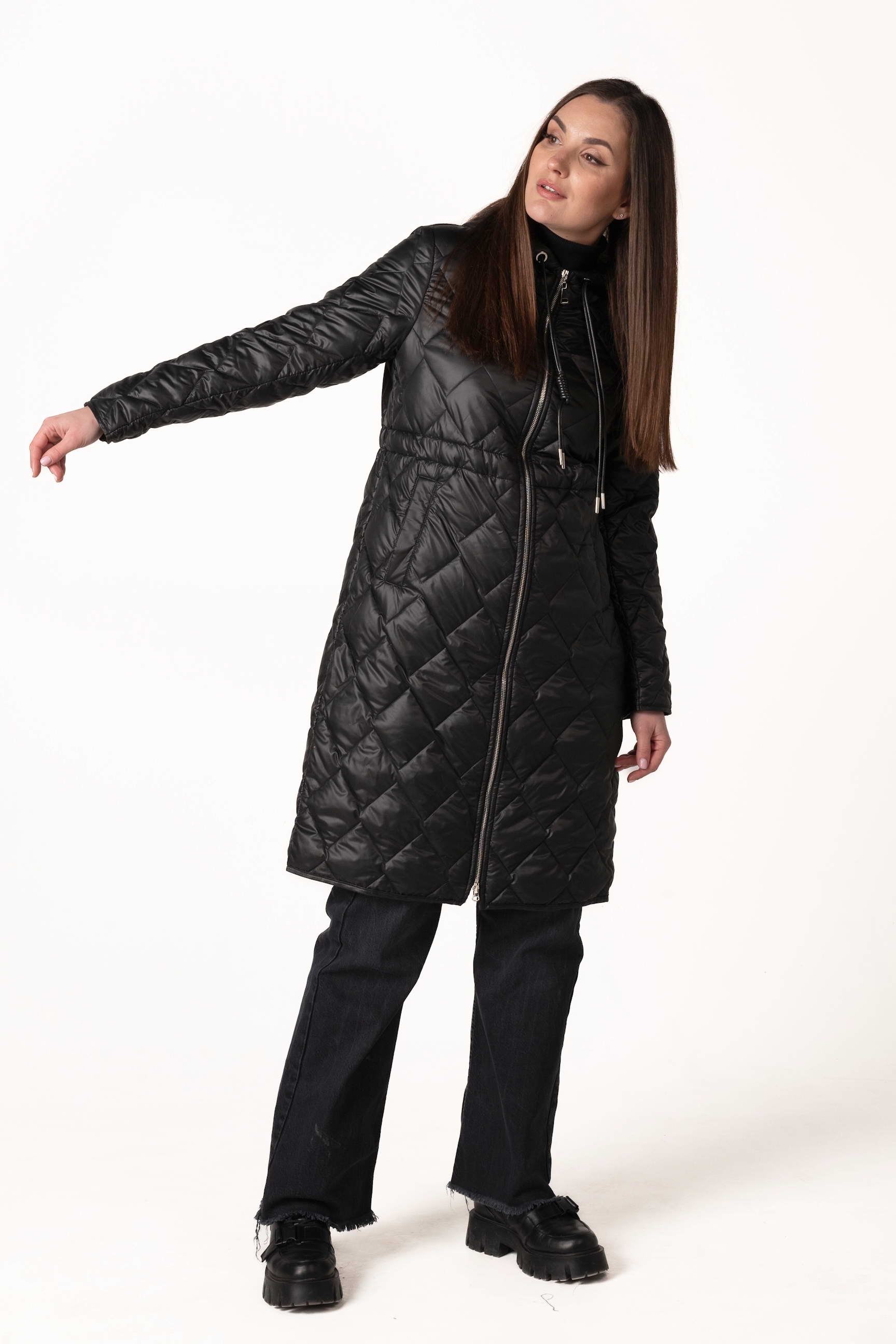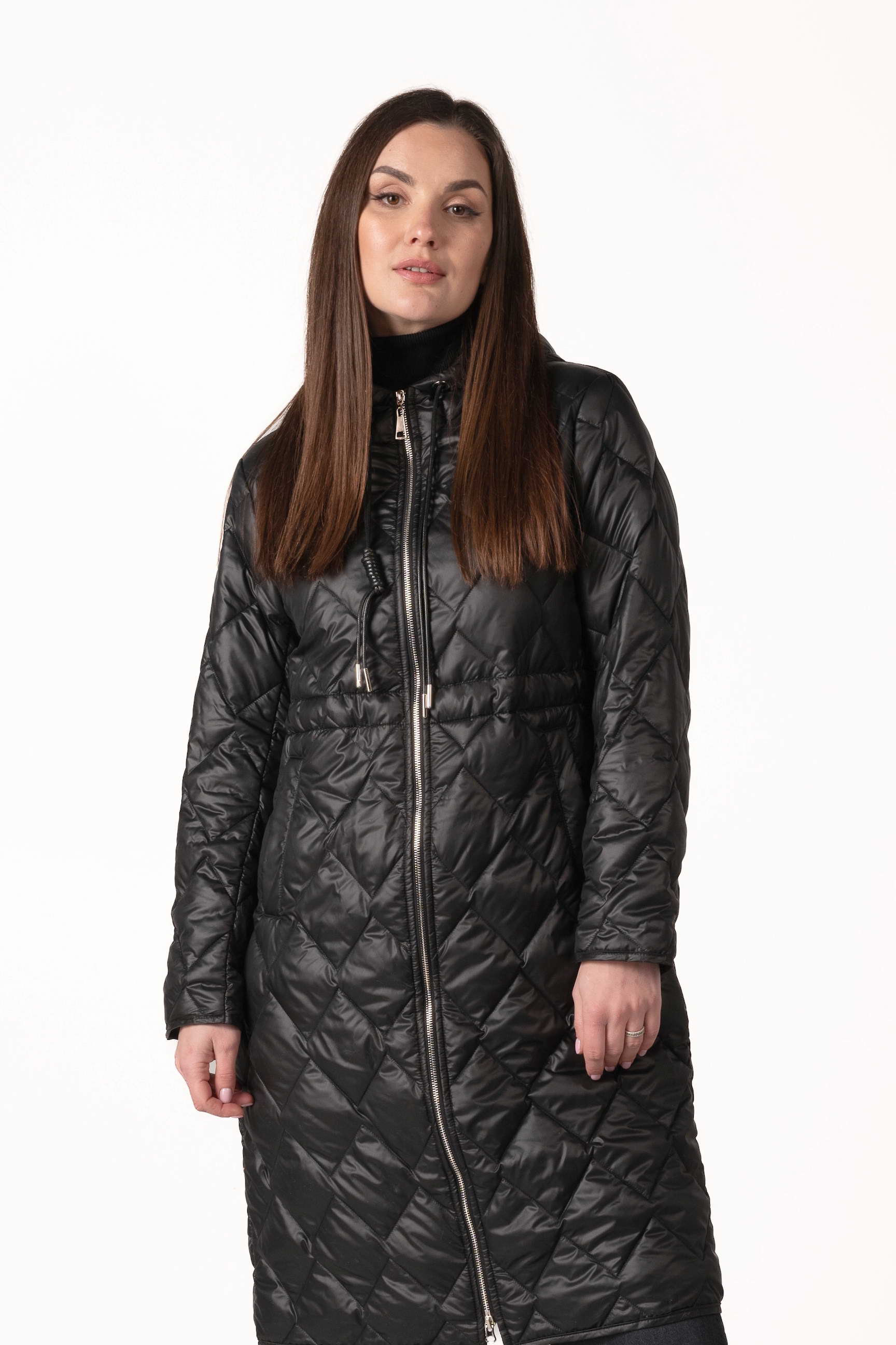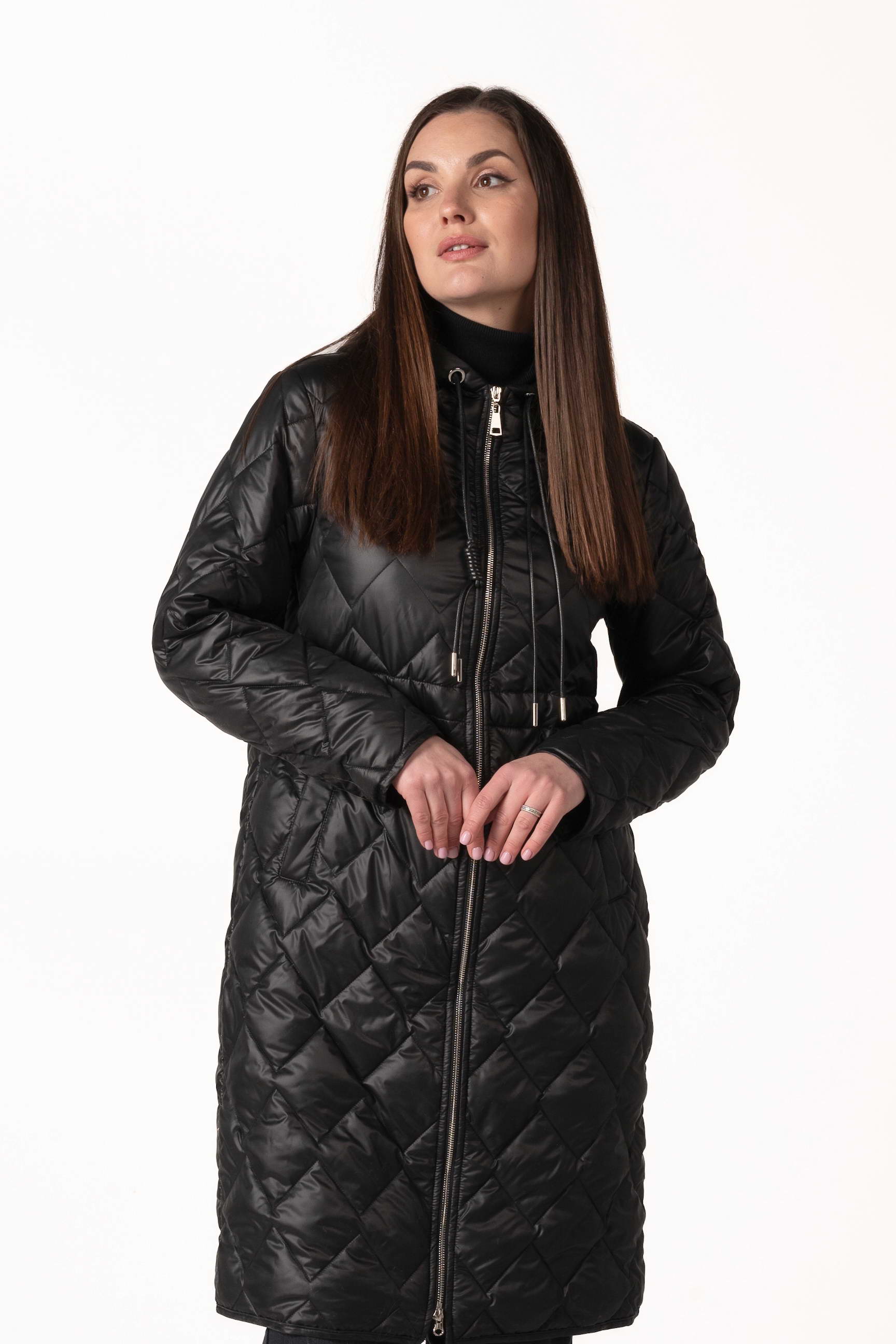 Современный черный женский демисезонный биопуховик — оптимальный выбор для прохладной весны и осени. Модель оснащена высоким воротником-стойкой с капюшоном, кулиской на талии и ромбовидной прострочкой, которая подчеркивает стильный силуэт и придает образу элегантность. Если вы ищете, где купить женскую демисезонную куртку, эта модель станет практичным и стильным решением для повседневного ношения.
