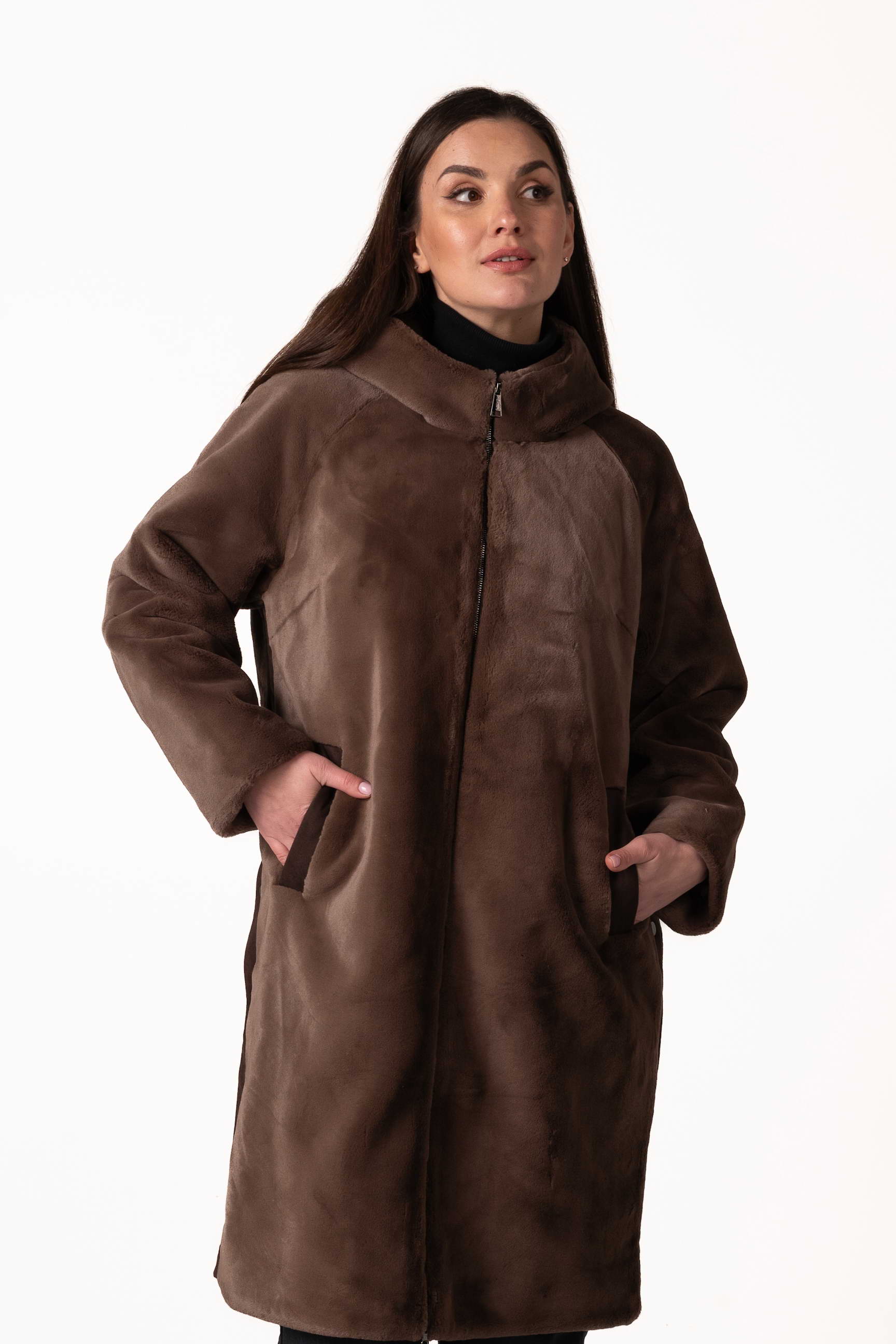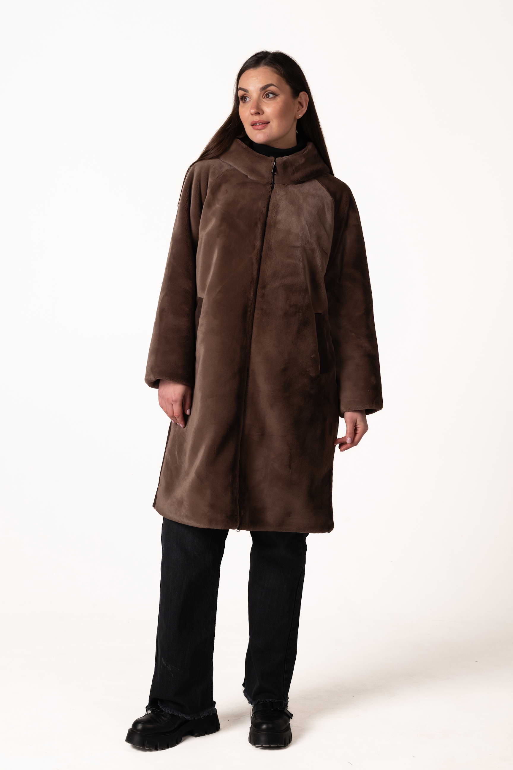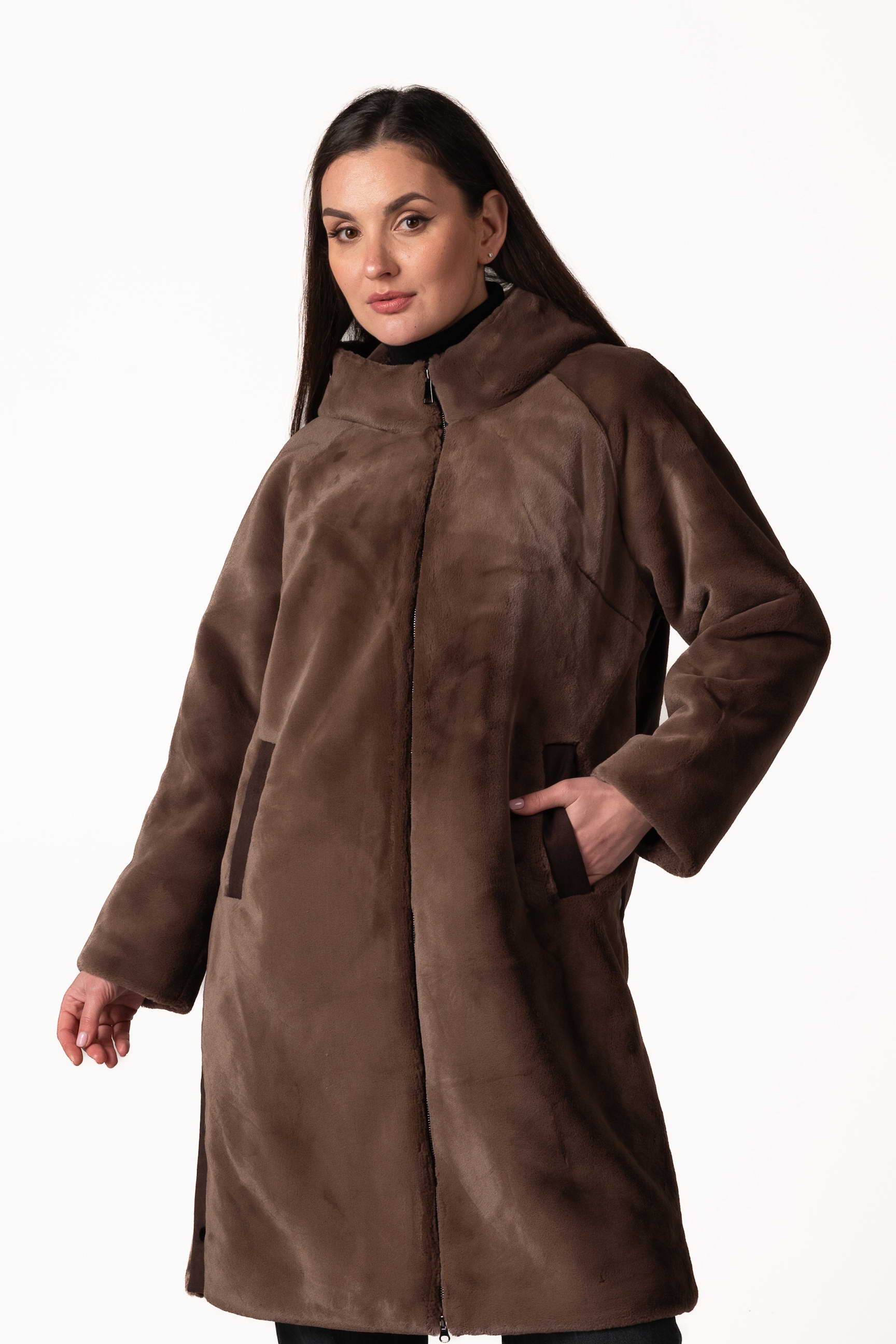 Прямой крой обеспечивает комфортную посадку, свободу движений и позволяет легко сочетать шубу с повседневным и деловым стилем. Для практичности модель оснащена боковыми карманами, где можно согреть руки или хранить мелкие вещи.