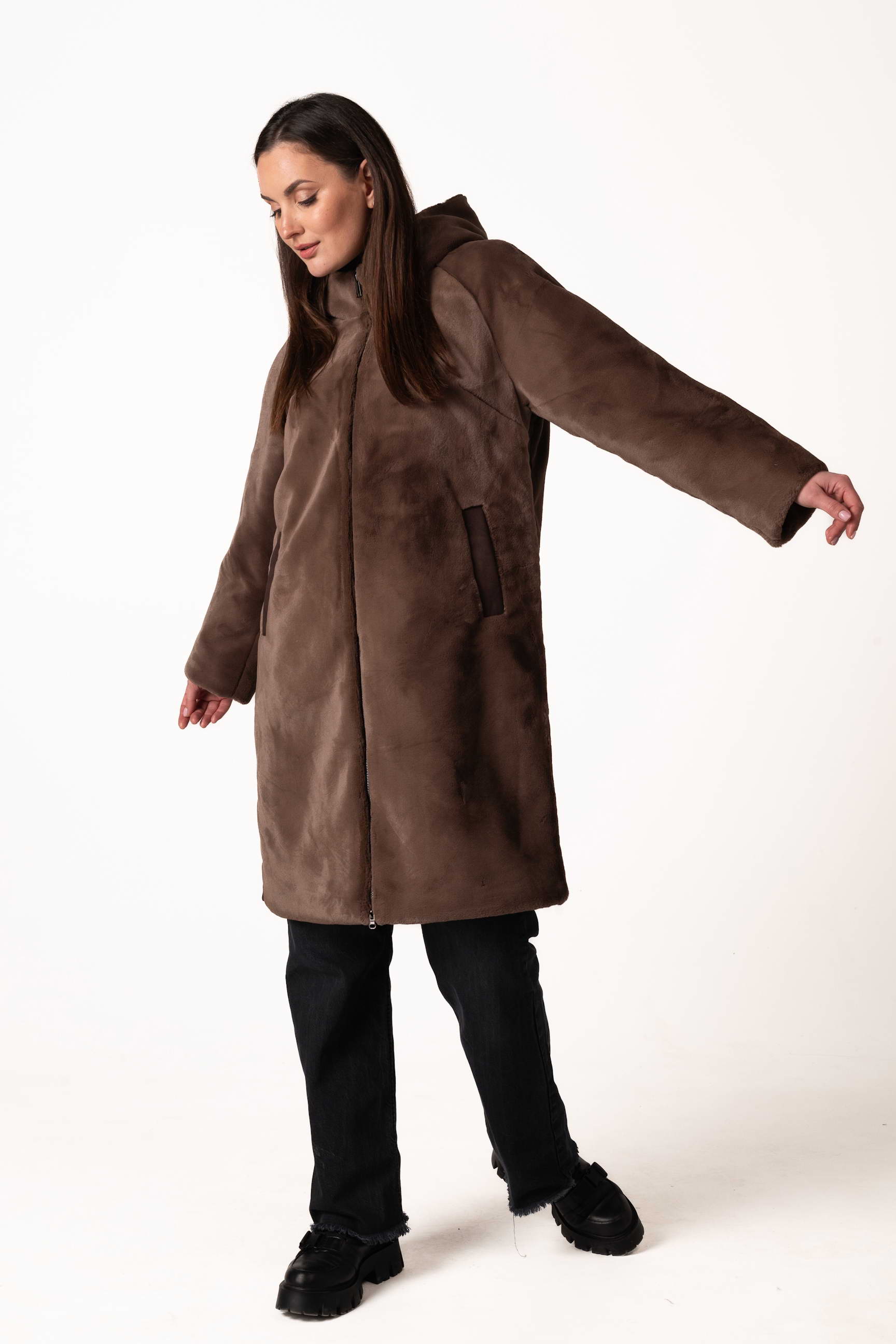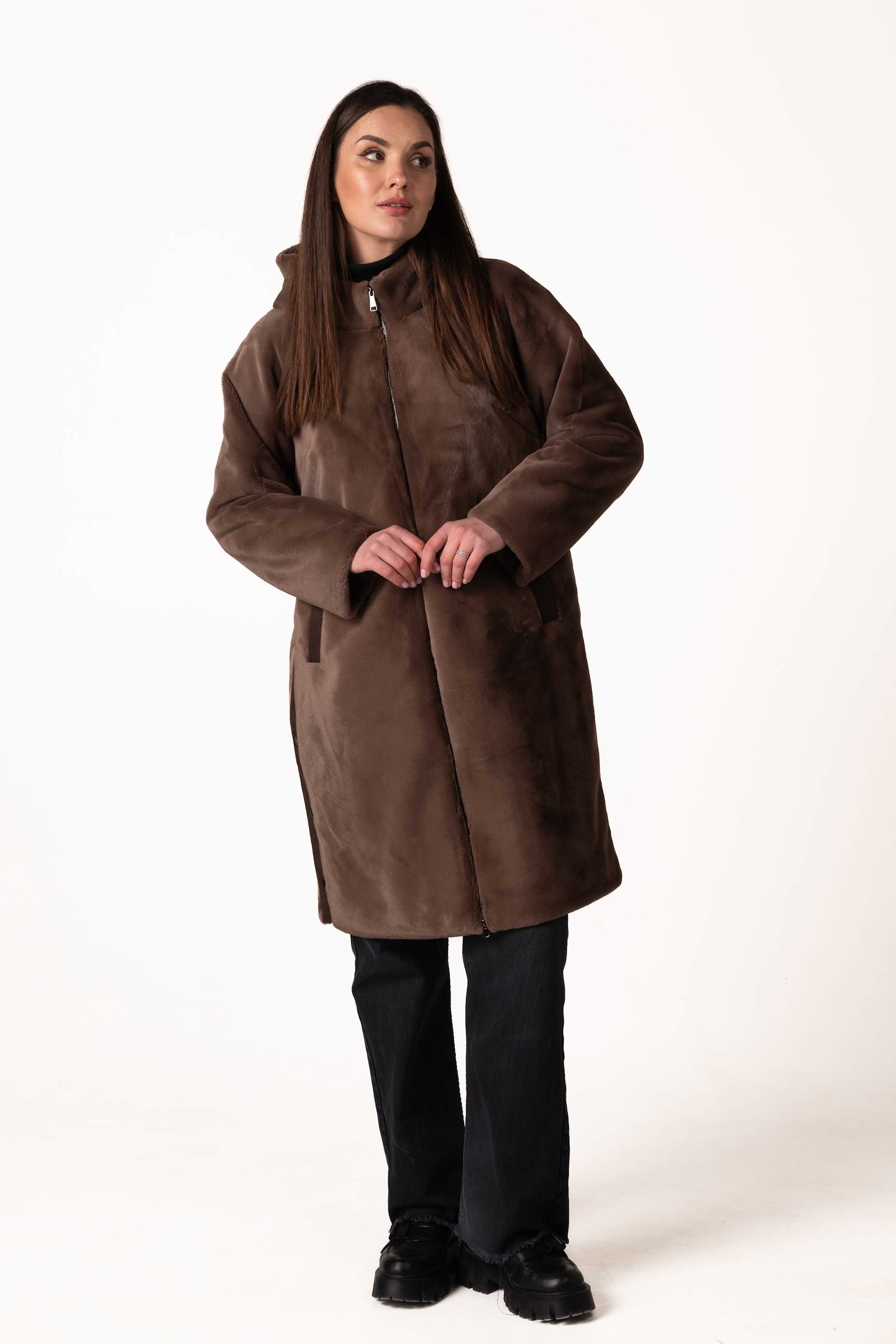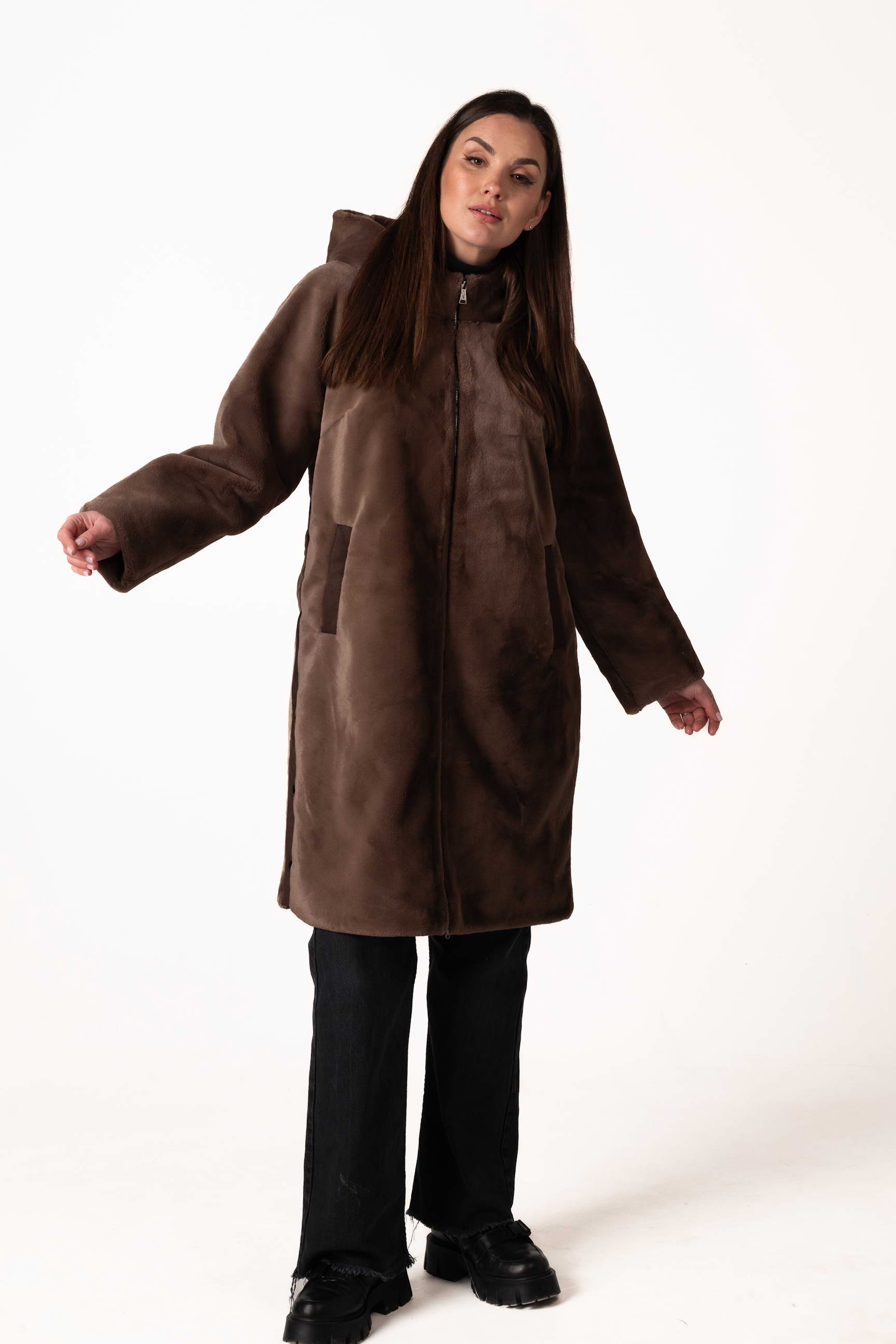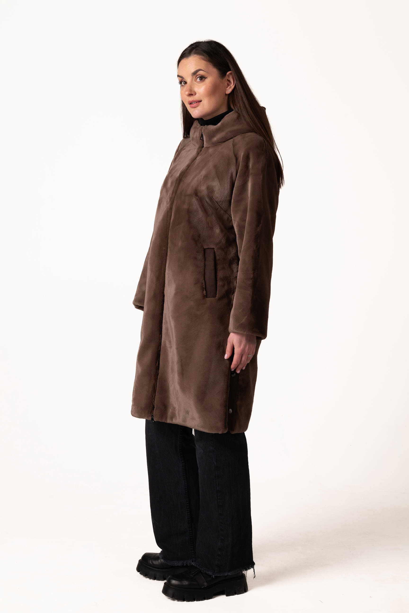 Прямой крой обеспечивает комфортную посадку, свободу движений и позволяет легко сочетать шубу с повседневным и деловым стилем. Для практичности модель оснащена боковыми карманами, где можно согреть руки или хранить мелкие вещи.
