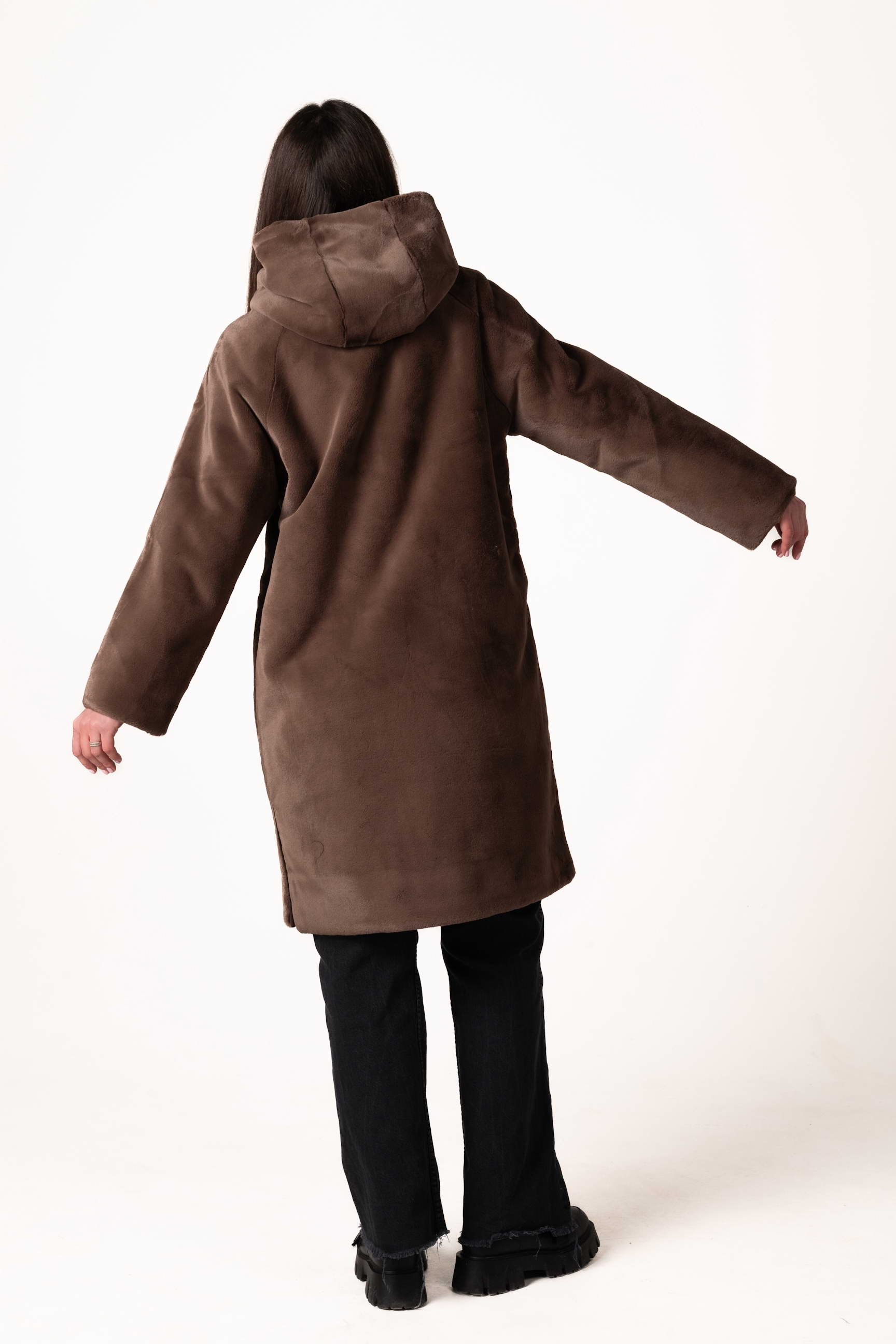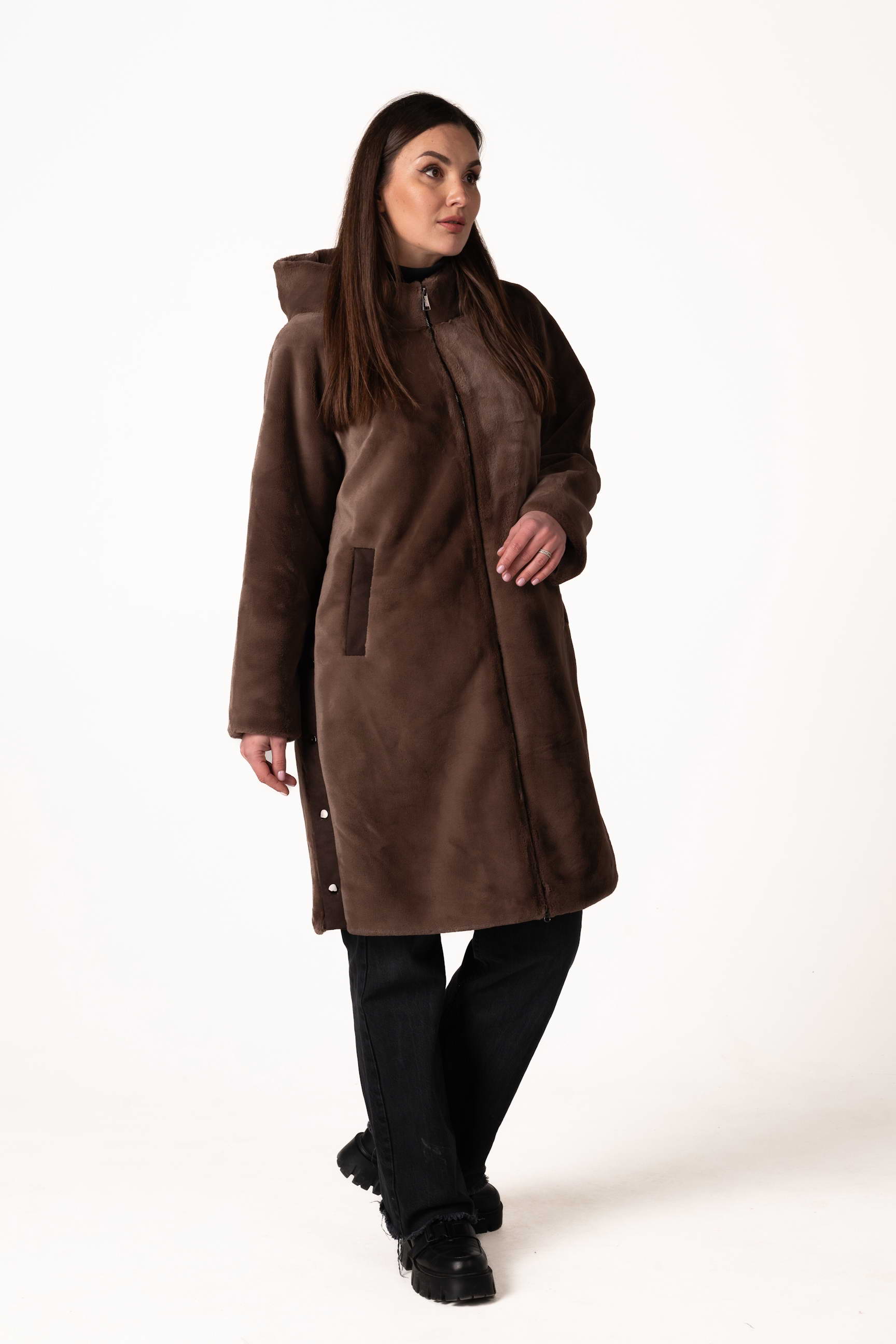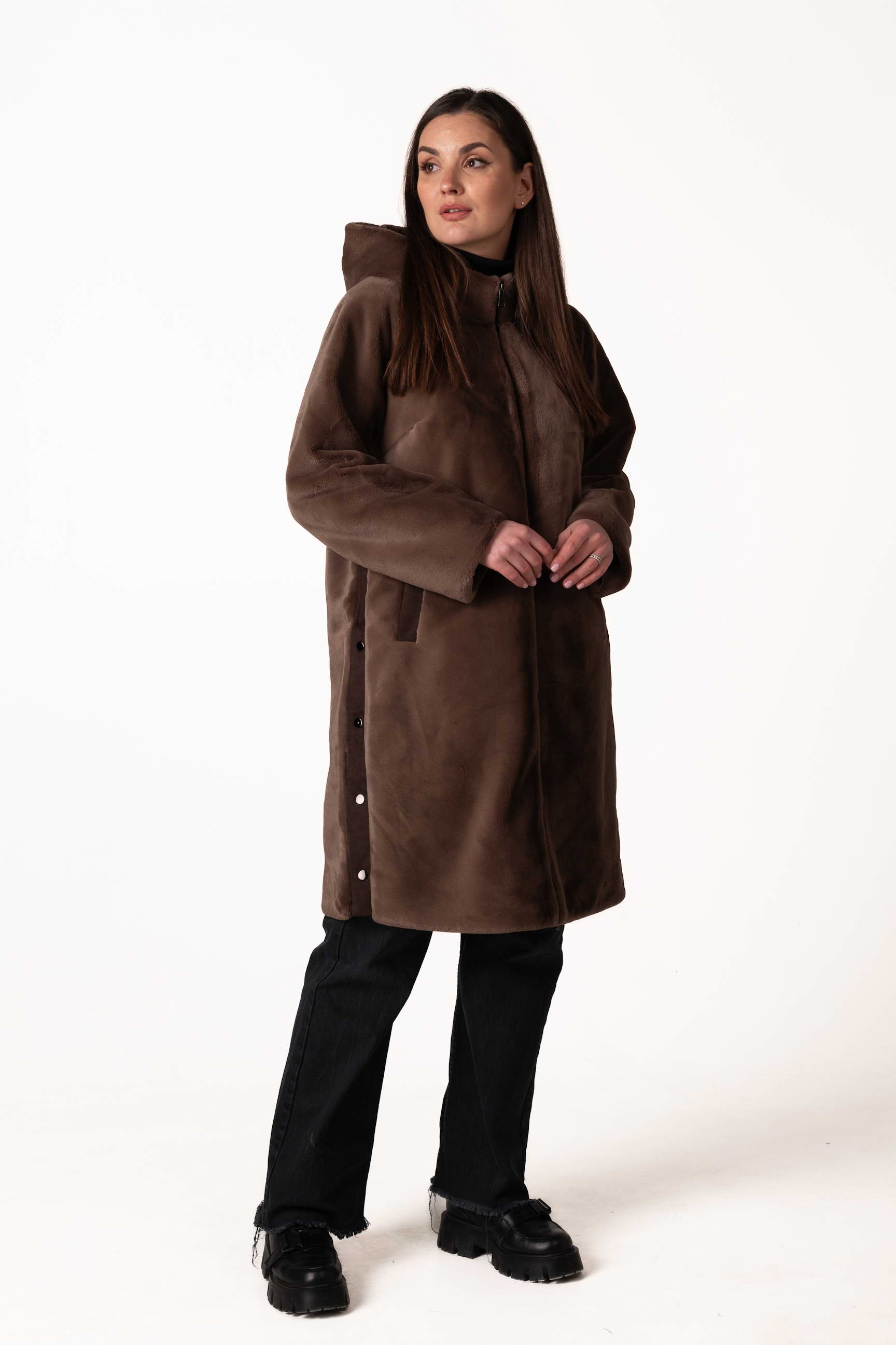 Особый акцент — боковые разрезы с декорированными кнопками, которые придают шубе современный вид, позволяют регулировать свободу движений и создают стильный силуэт. Длина 102 см делает модель тёплой, практичной и идеально подходящей для ежедневного ношения в городе и на прогулках.