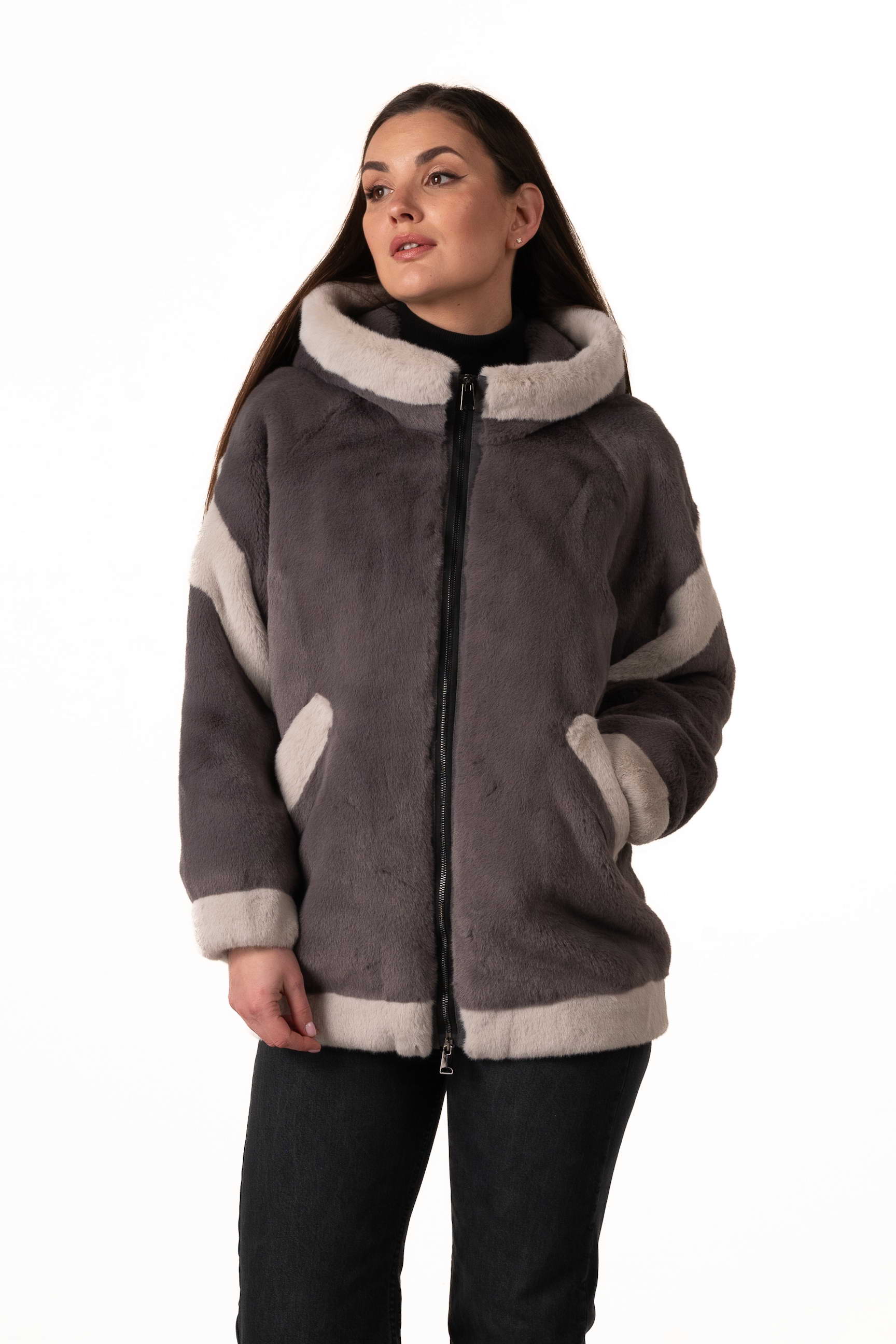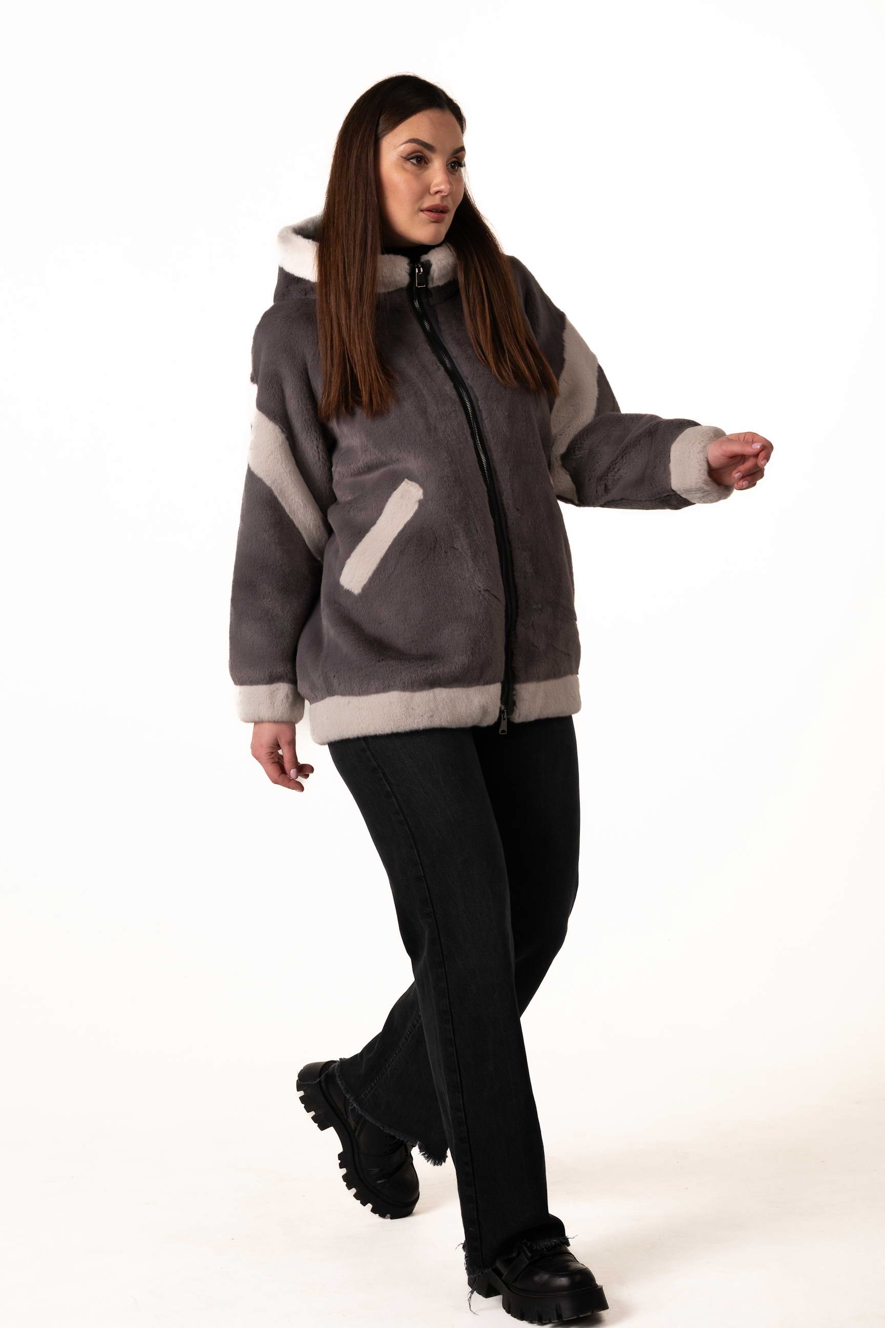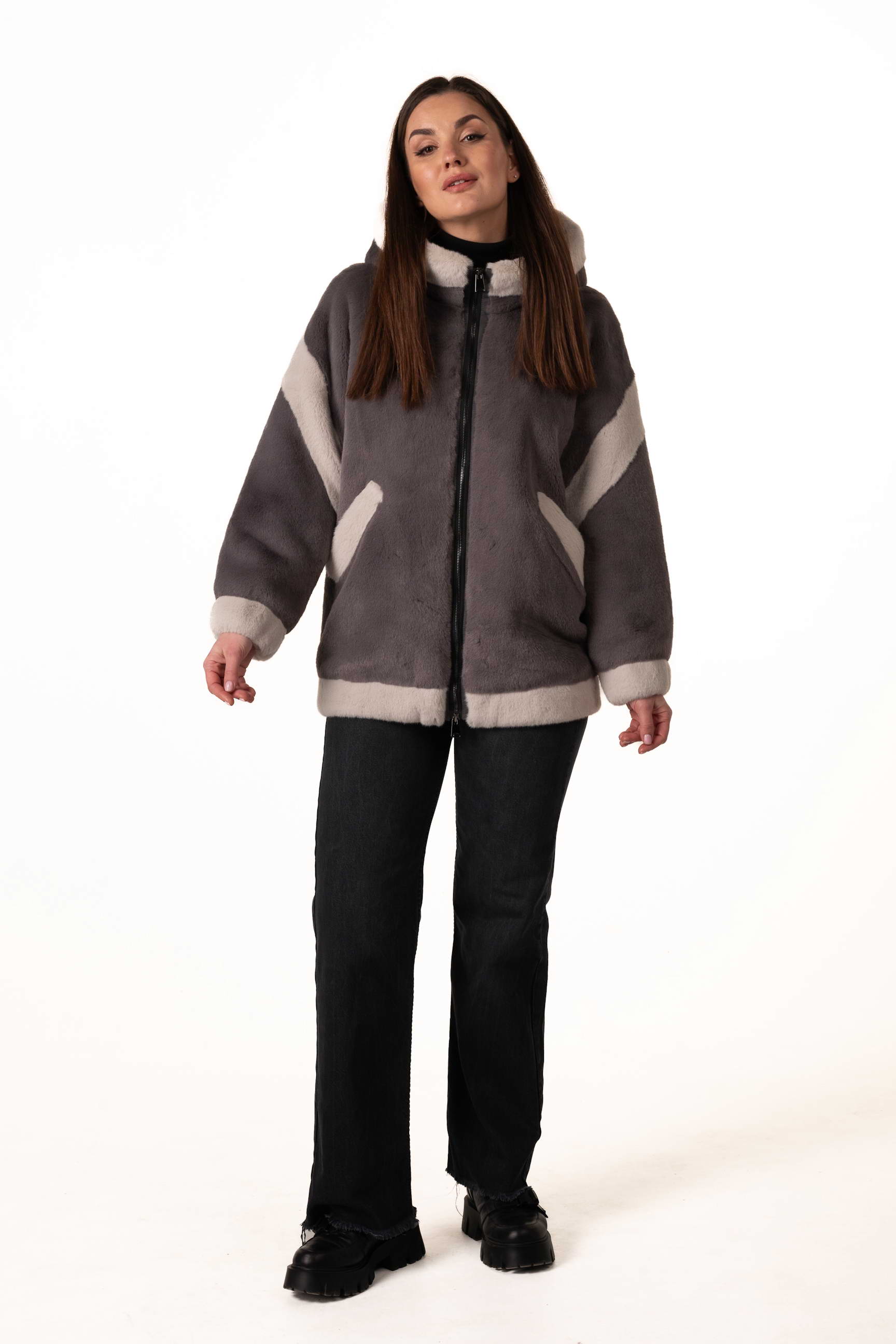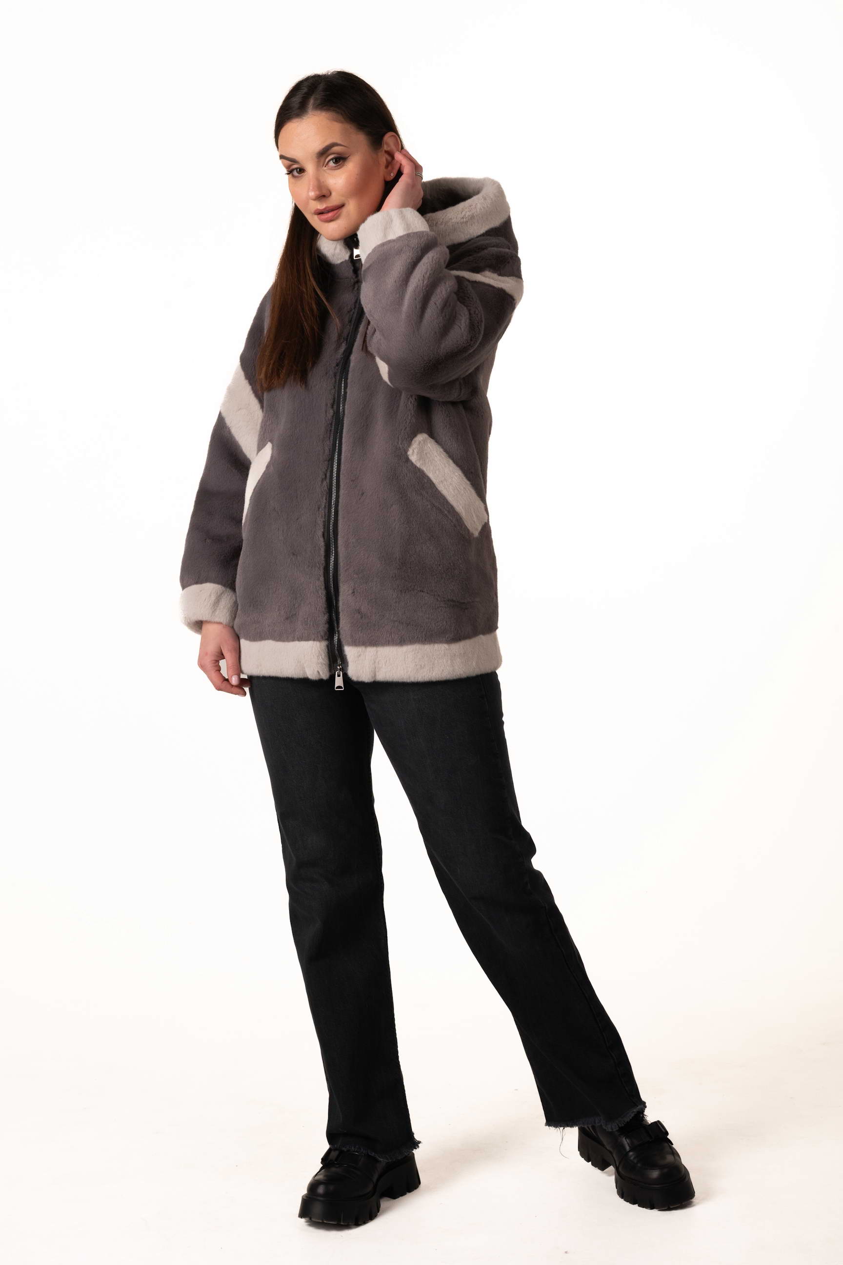 Современная женская шуба из экомеха сочетает элегантность, комфорт и практичность для зимнего гардероба. Модель выполнена из качественного искусственного меха, мягкого на ощупь, долговечного и хорошо сохраняющего тепло, при этом не требующего сложного ухода. Серый цвет придаёт изделию сдержанность и универсальность, а декоративные вставки из светлого экомеха создают стильный контраст и добавляют образу лёгкого шарма и индивидуальности.