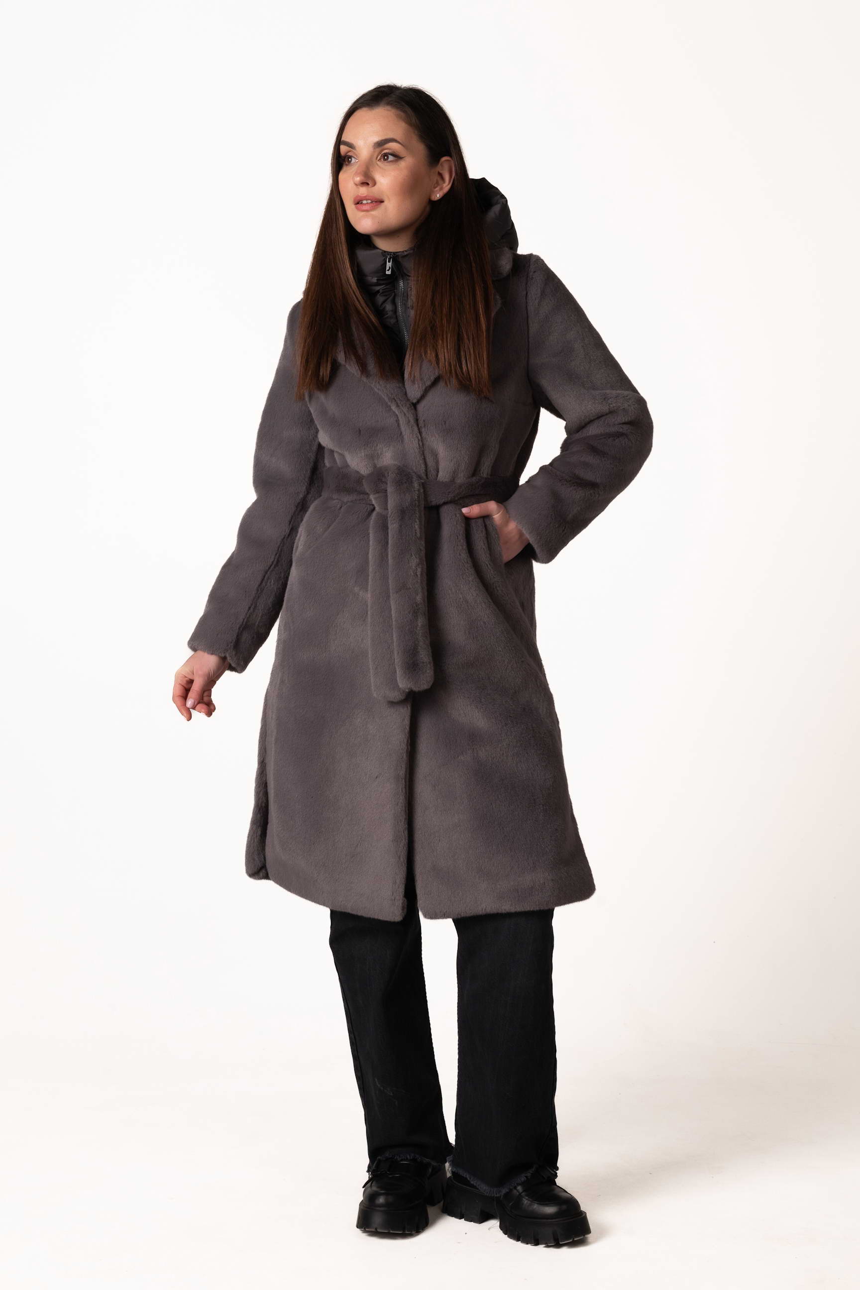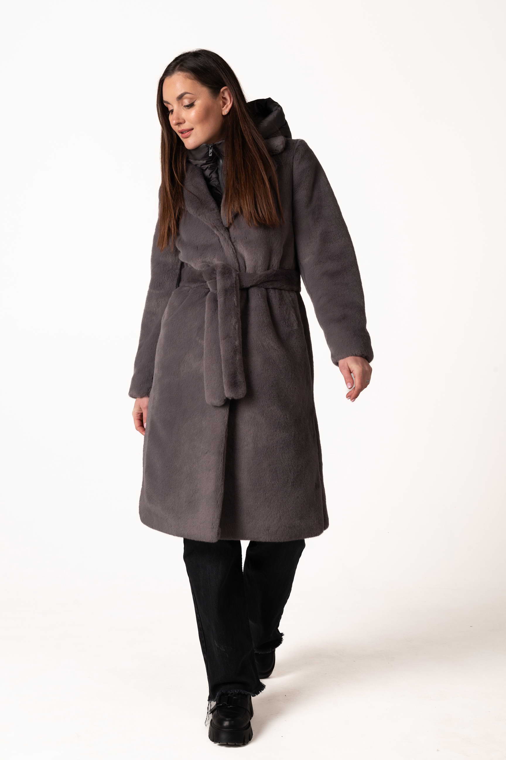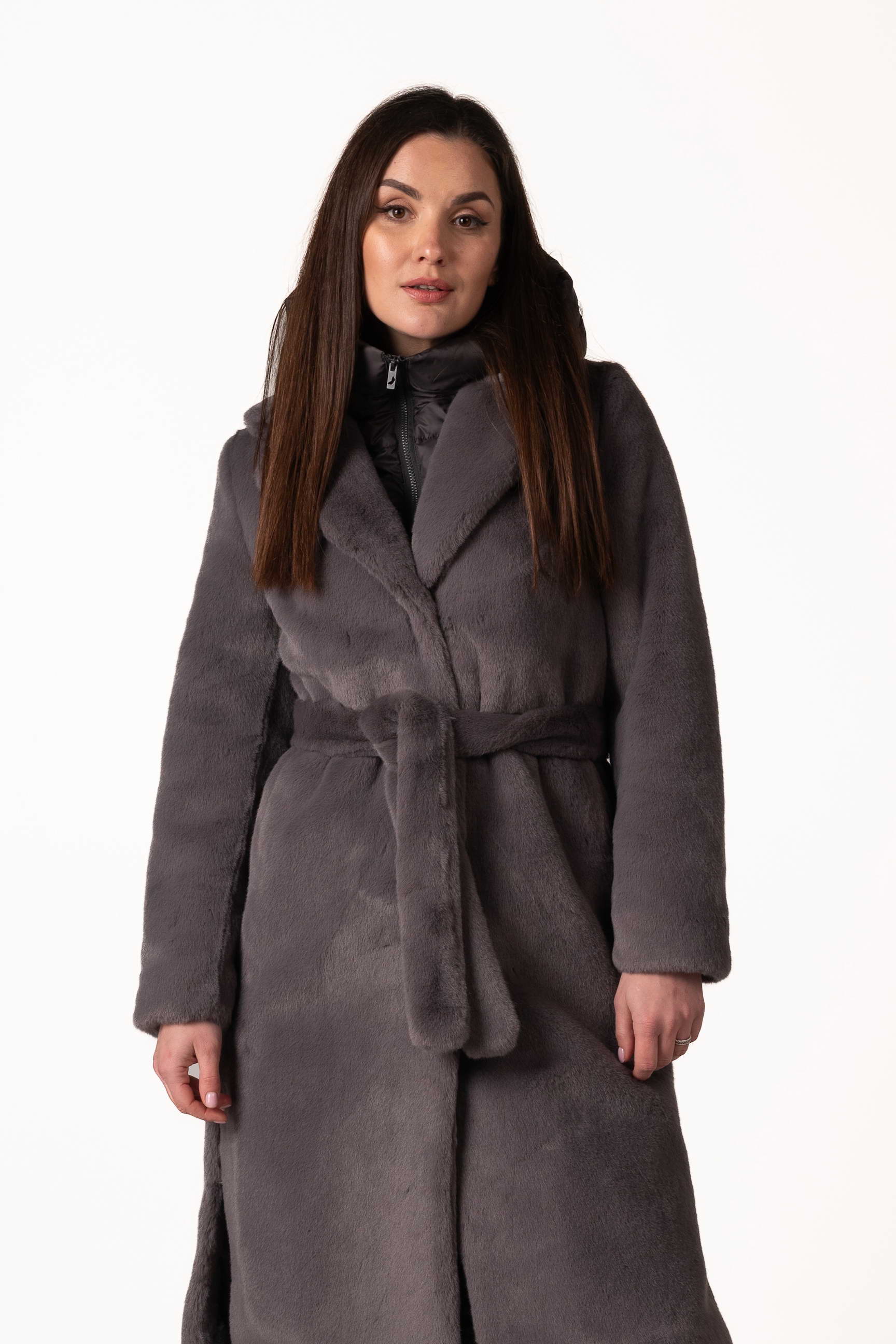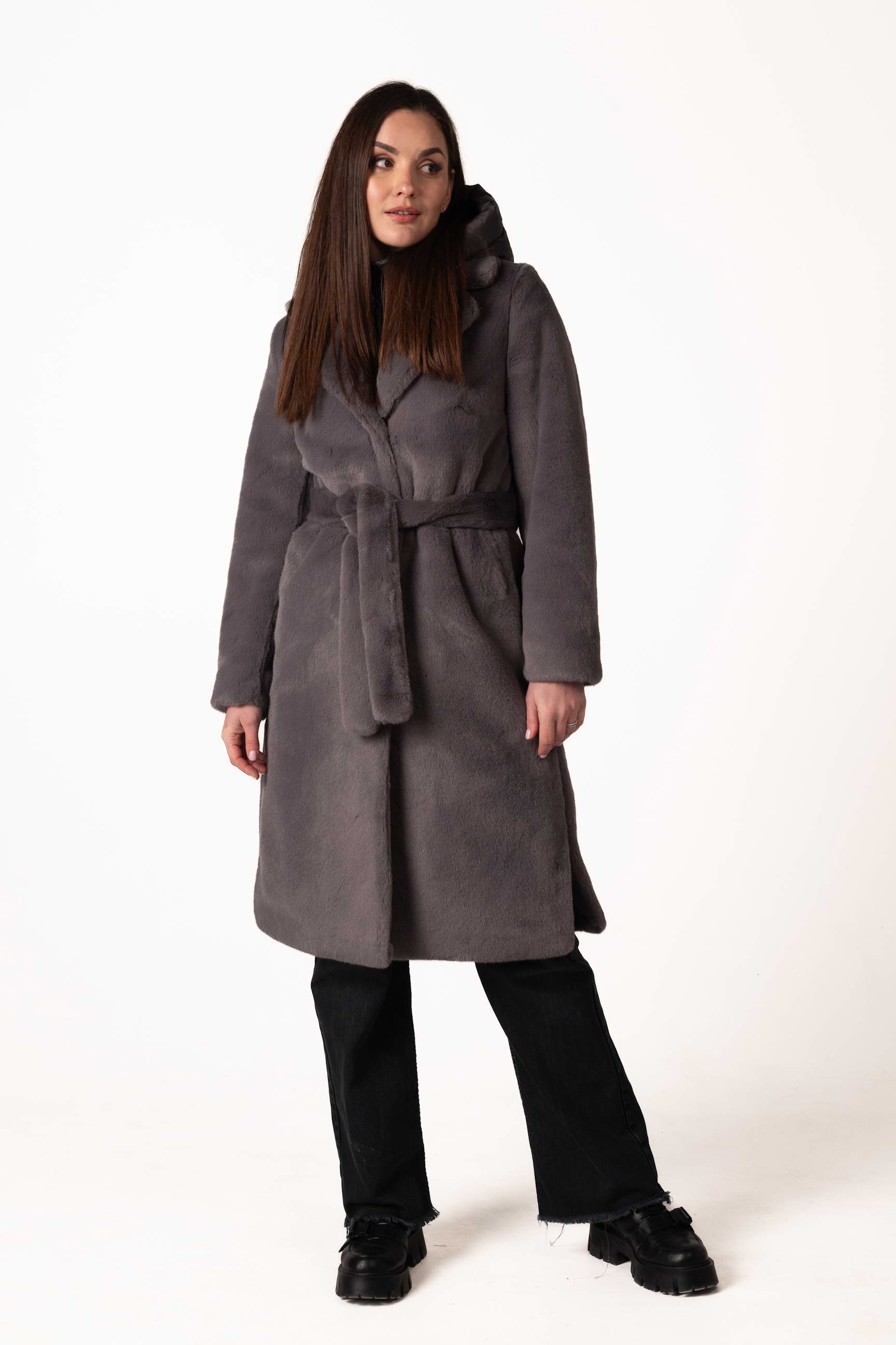 Современная женская шуба из экомеха — это сочетание комфорта, стиля и практичности для холодного сезона. Модель выполнена из качественного искусственного меха, который мягкий, приятный на ощупь и обеспечивает надежное тепло, не требуя сложного ухода. Тёмно-серый цвет придаёт изделию благородство, сдержанность и универсальность, легко сочетается с любым зимним гардеробом.