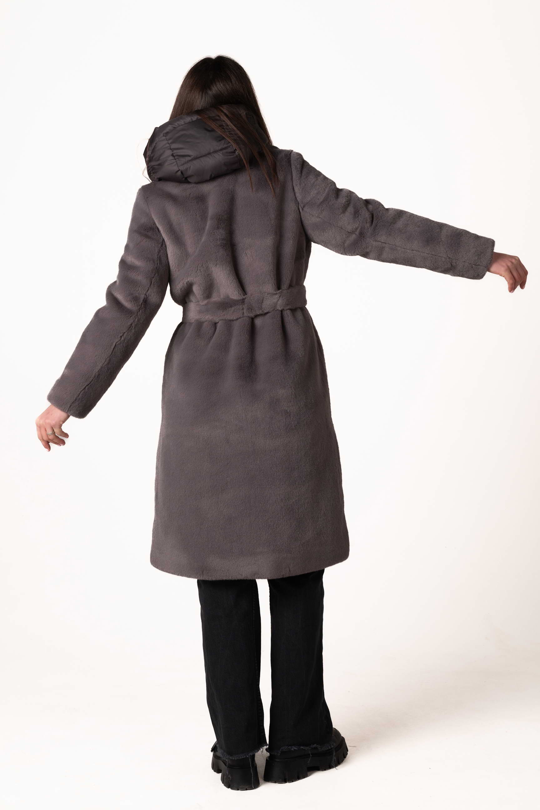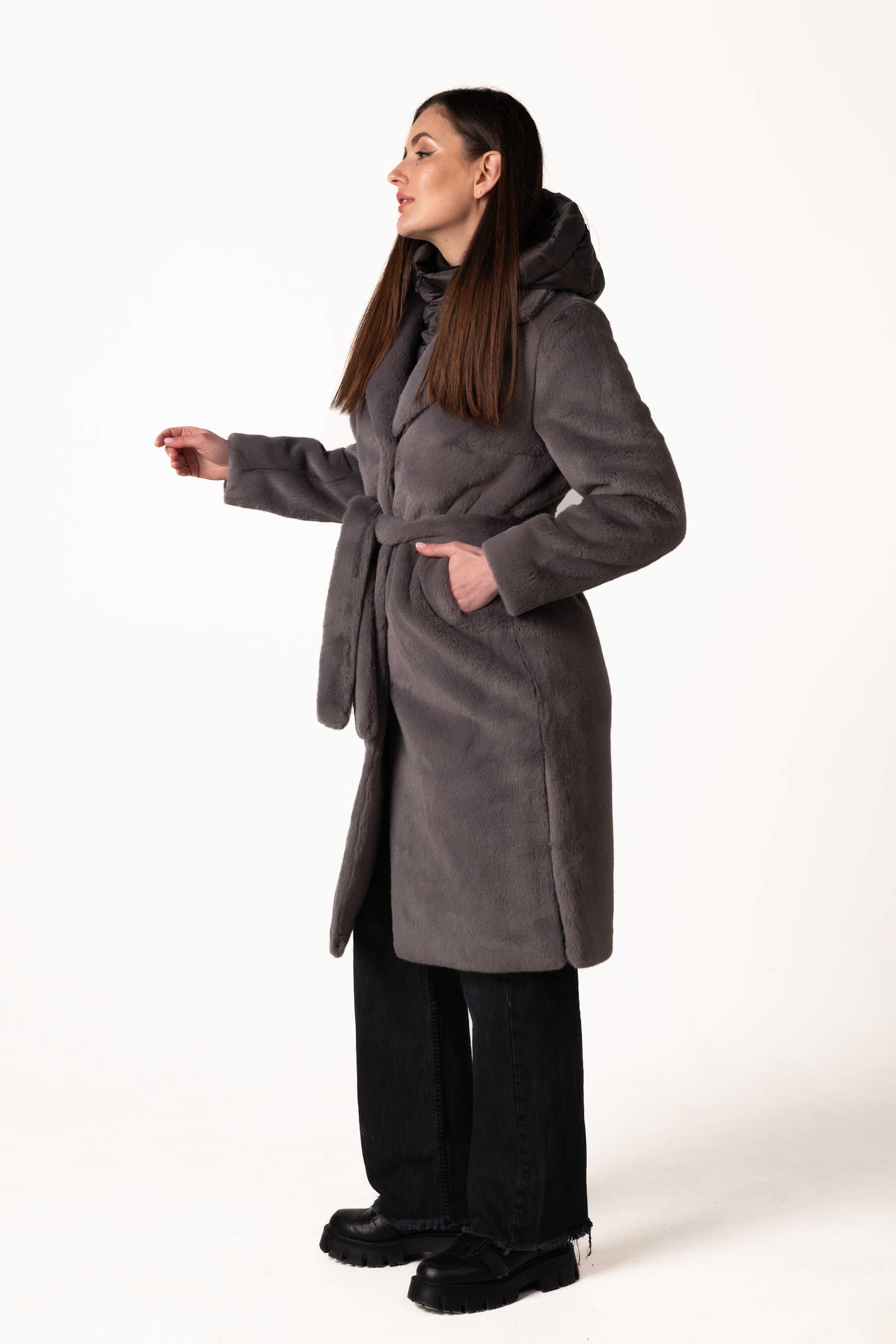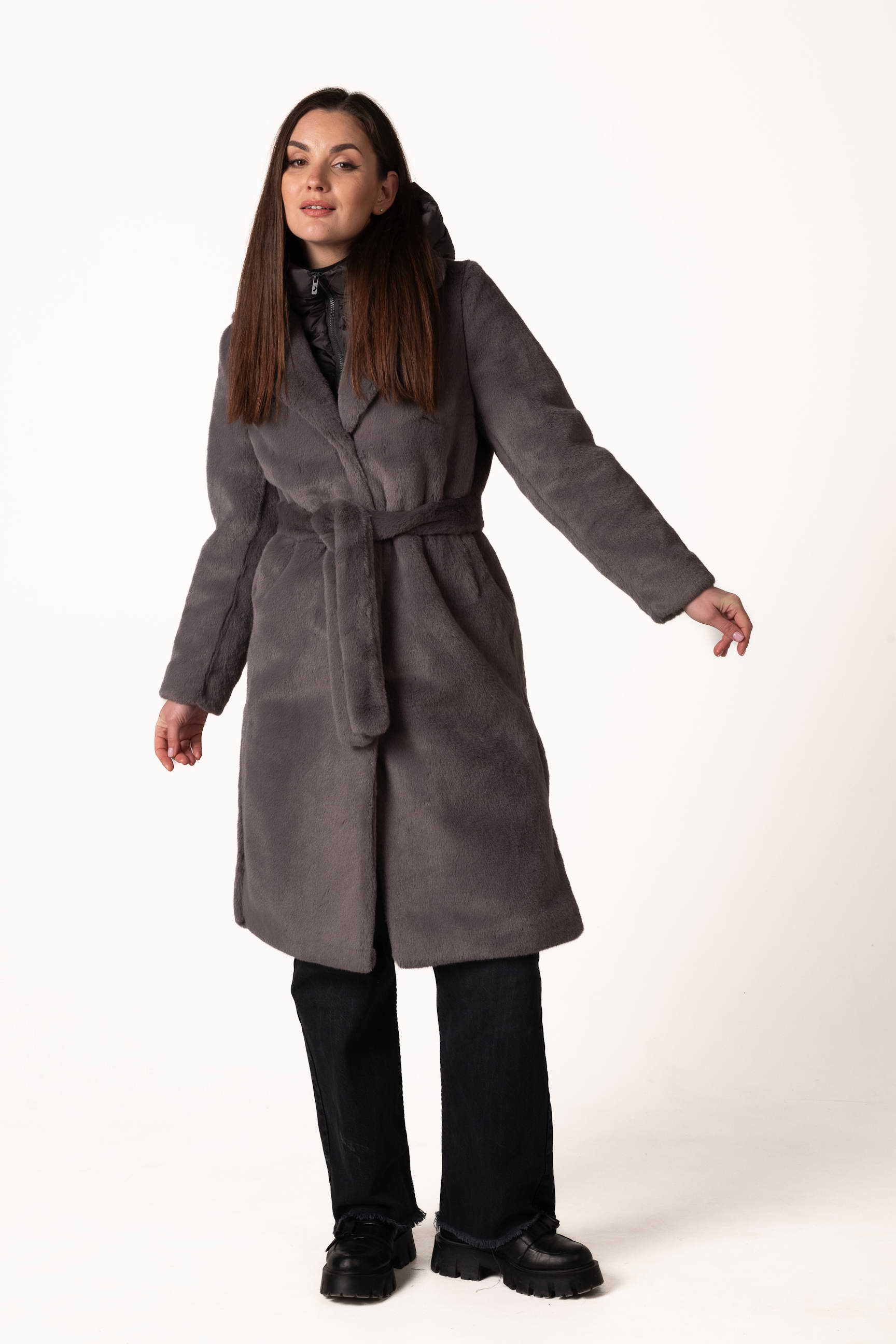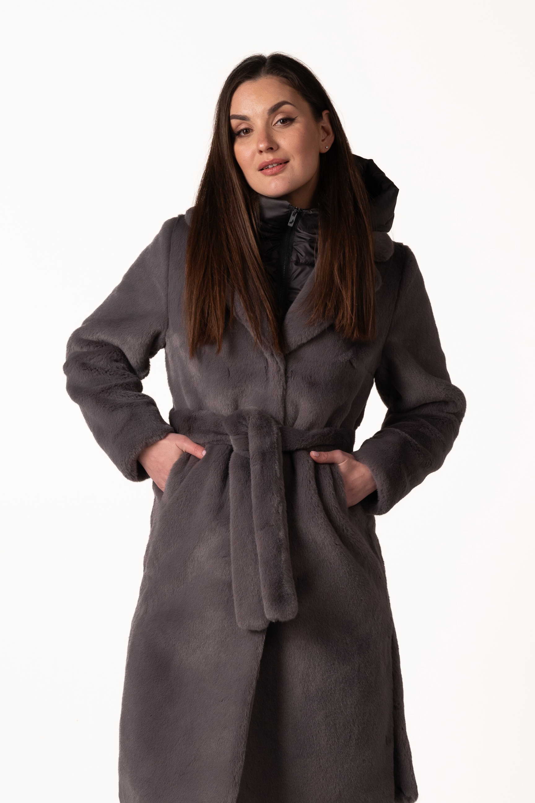 Современная женская шуба из экомеха — это сочетание комфорта, стиля и практичности для холодного сезона. Модель выполнена из качественного искусственного меха, который мягкий, приятный на ощупь и обеспечивает надежное тепло, не требуя сложного ухода. Тёмно-серый цвет придаёт изделию благородство, сдержанность и универсальность, легко сочетается с любым зимним гардеробом.