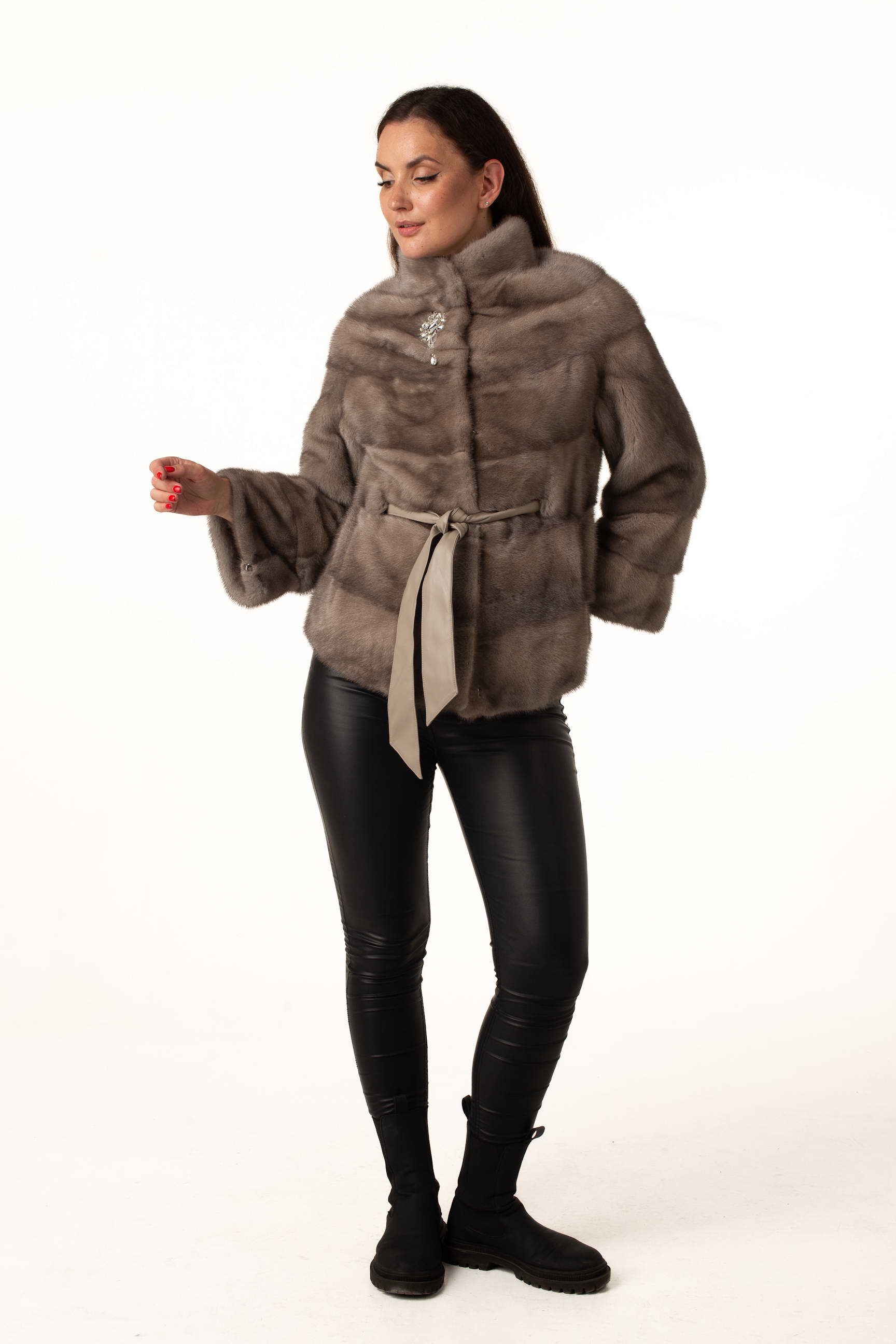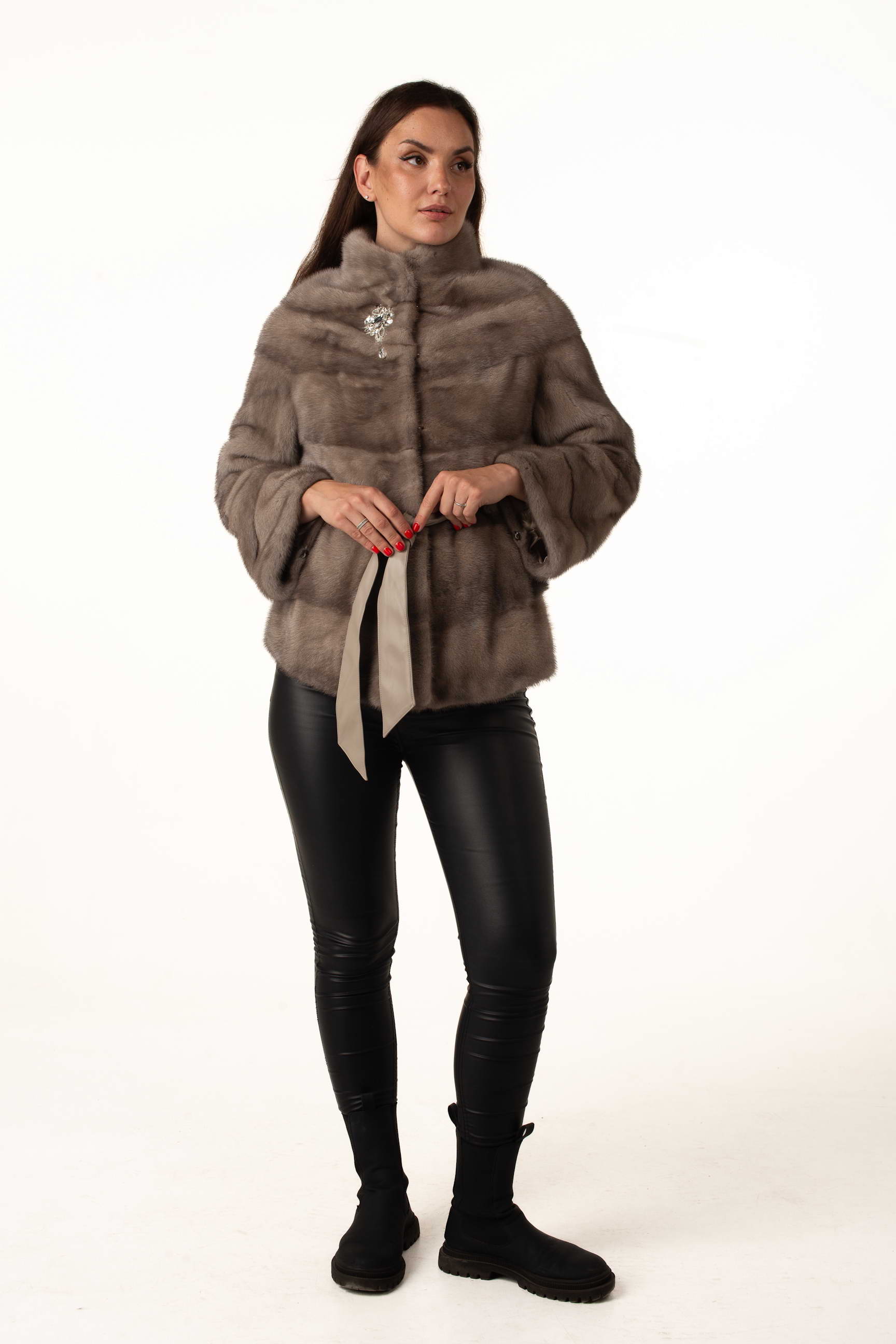 Женская шуба из натурального меха норки цвета «колотый лед» – элегантная и современная модель для зимнего сезона. Воротник-стойка и утягивающий пояс из экокожи подчеркивают силуэт, а отстегивающийся рукав до длины 7/8 обеспечивает удобство и вариативность в носке. Брошка у воротника добавляет изысканный акцент.