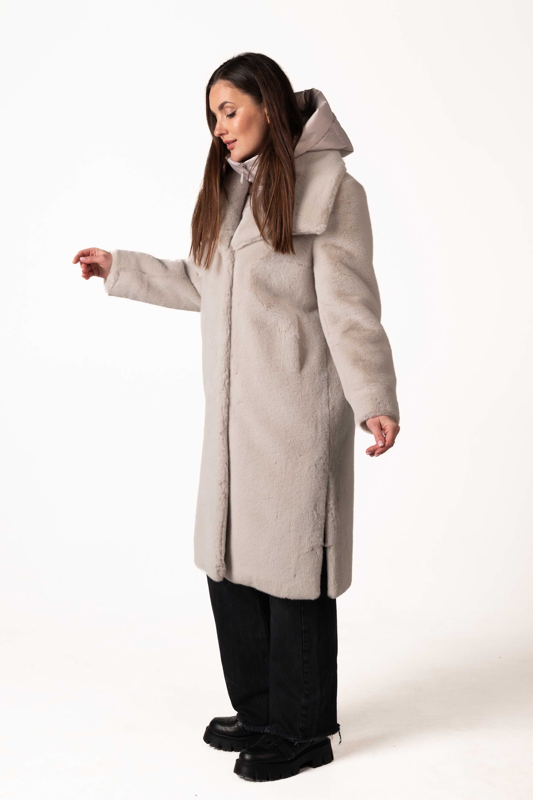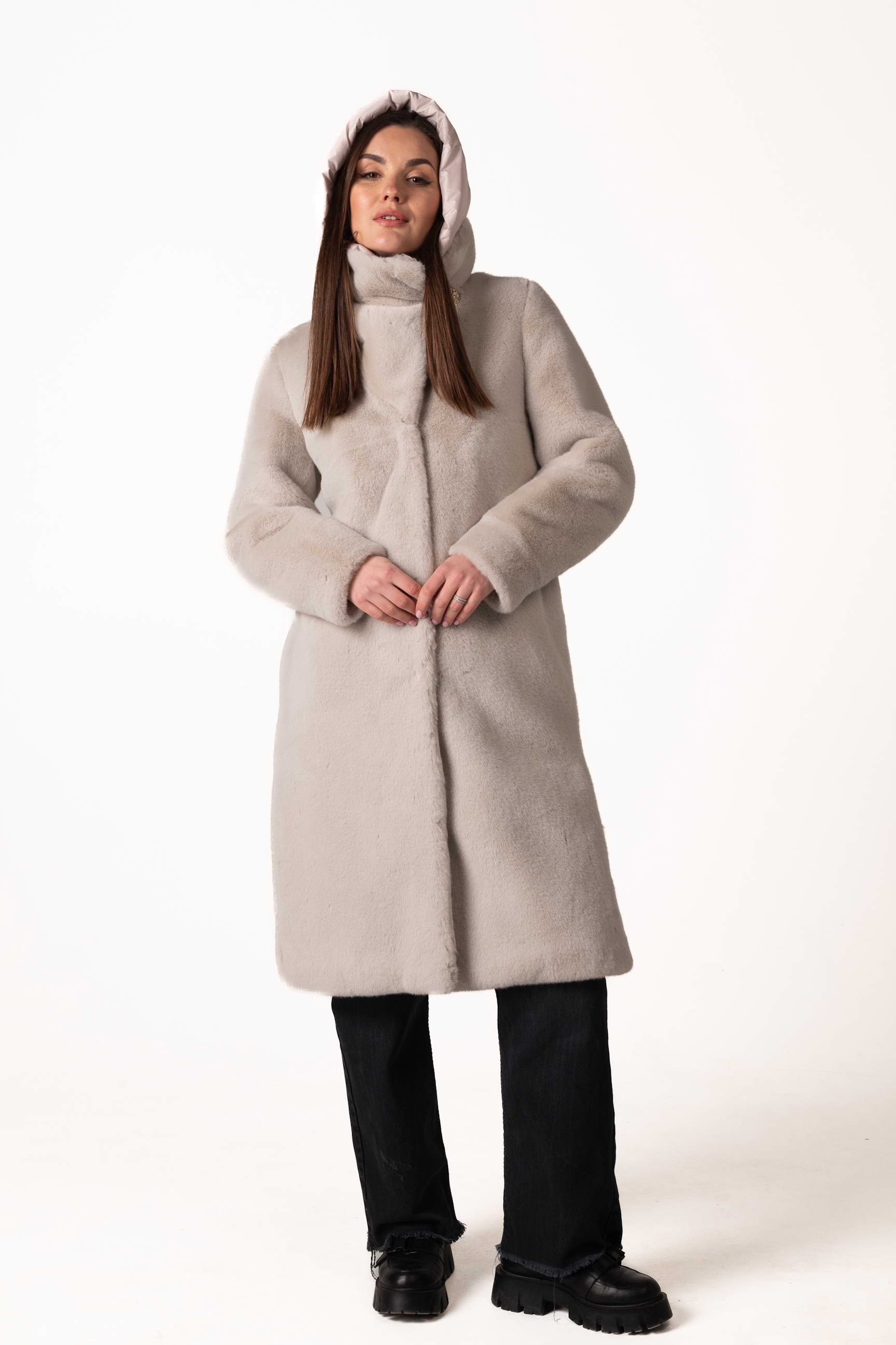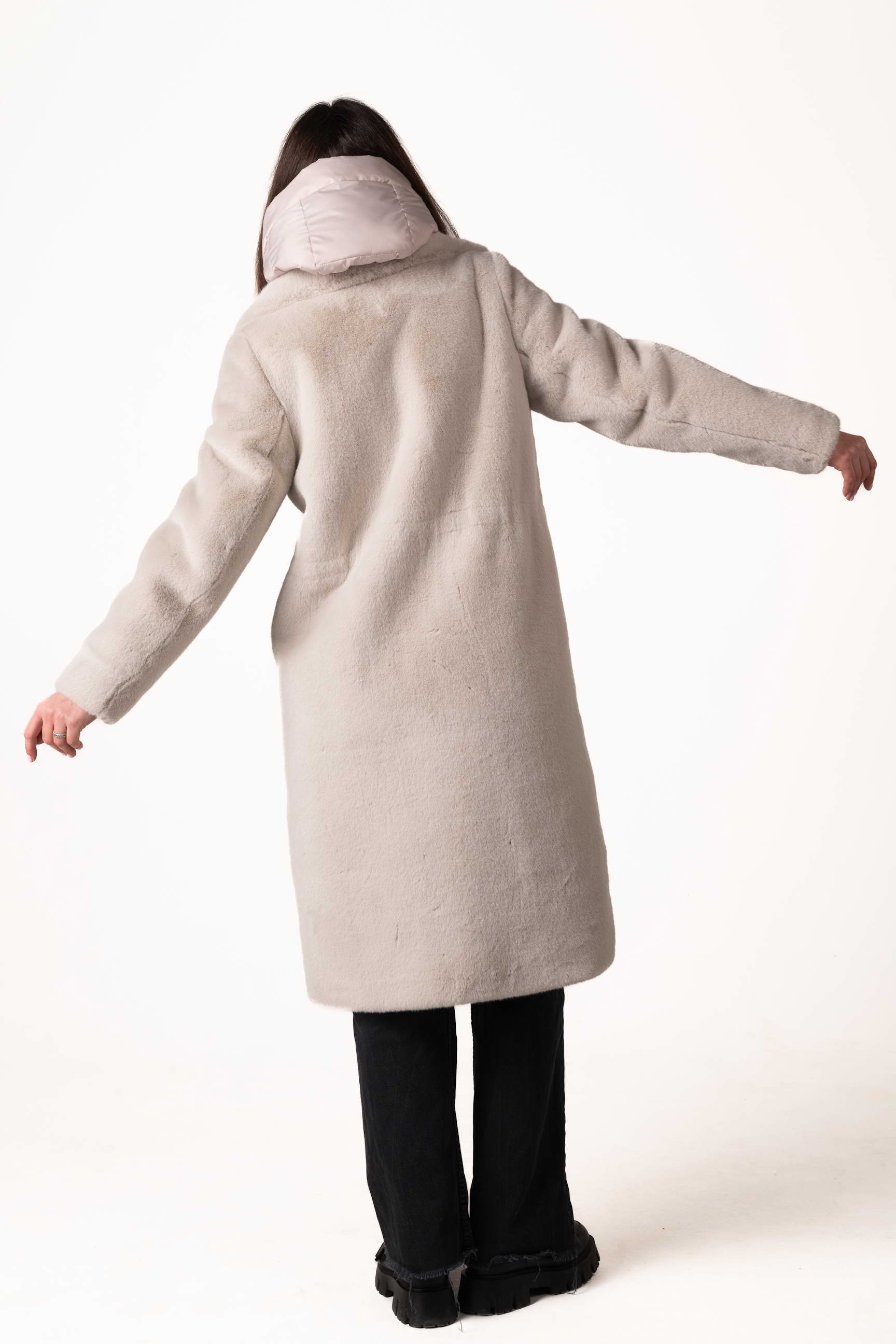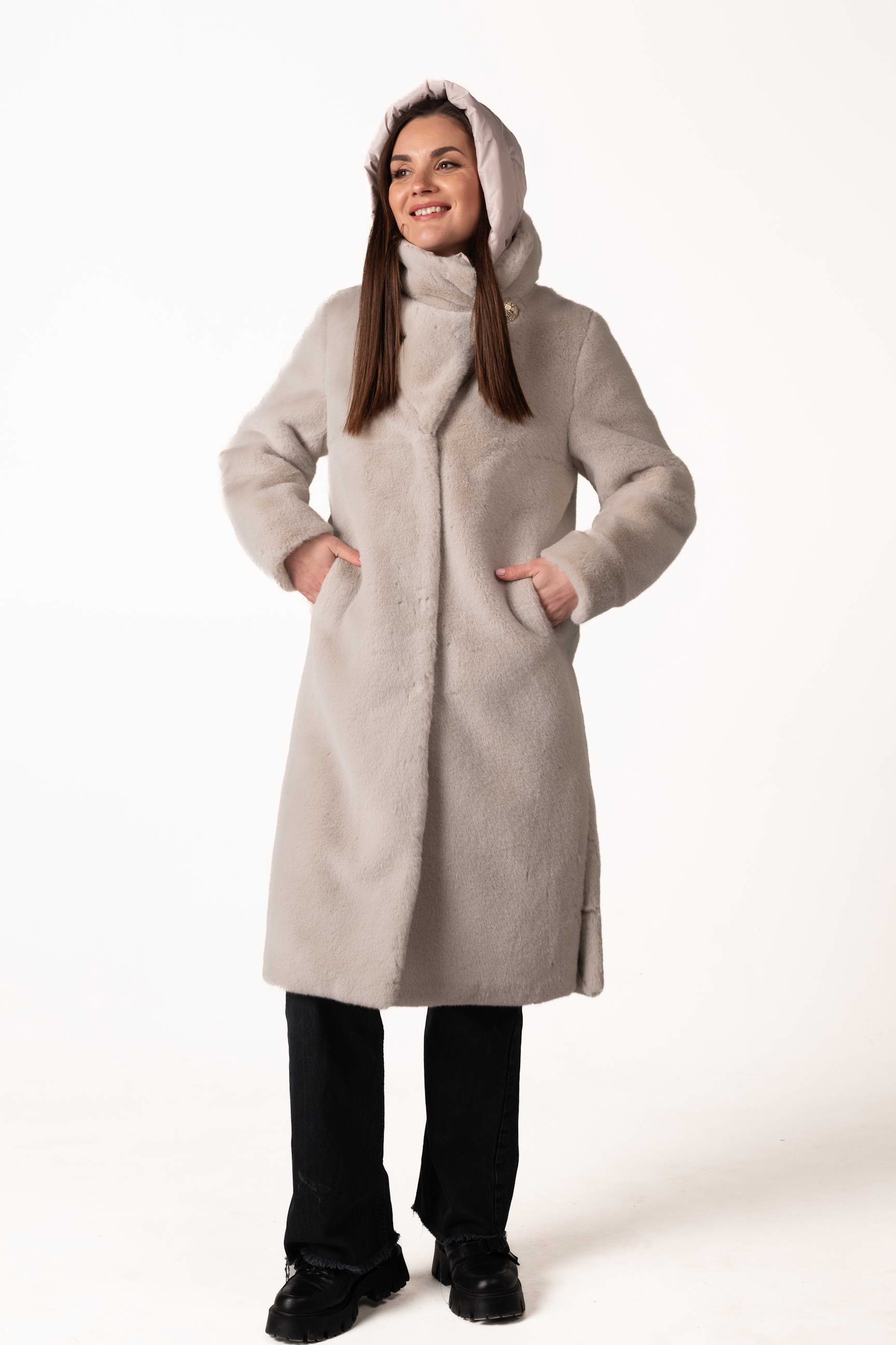 Шуба имеет прямой крой, который обеспечивает свободную посадку и комфорт в повседневной носке. Для подчёркивания силуэта предусмотрена внутренняя кулиска по талии, позволяющая регулировать объём в соответствии с фигурой. Отложной воротник придаёт классический вид, а съёмный капюшон из текстильной ткани с утеплителем обеспечивает дополнительную защиту от холода и ветра.