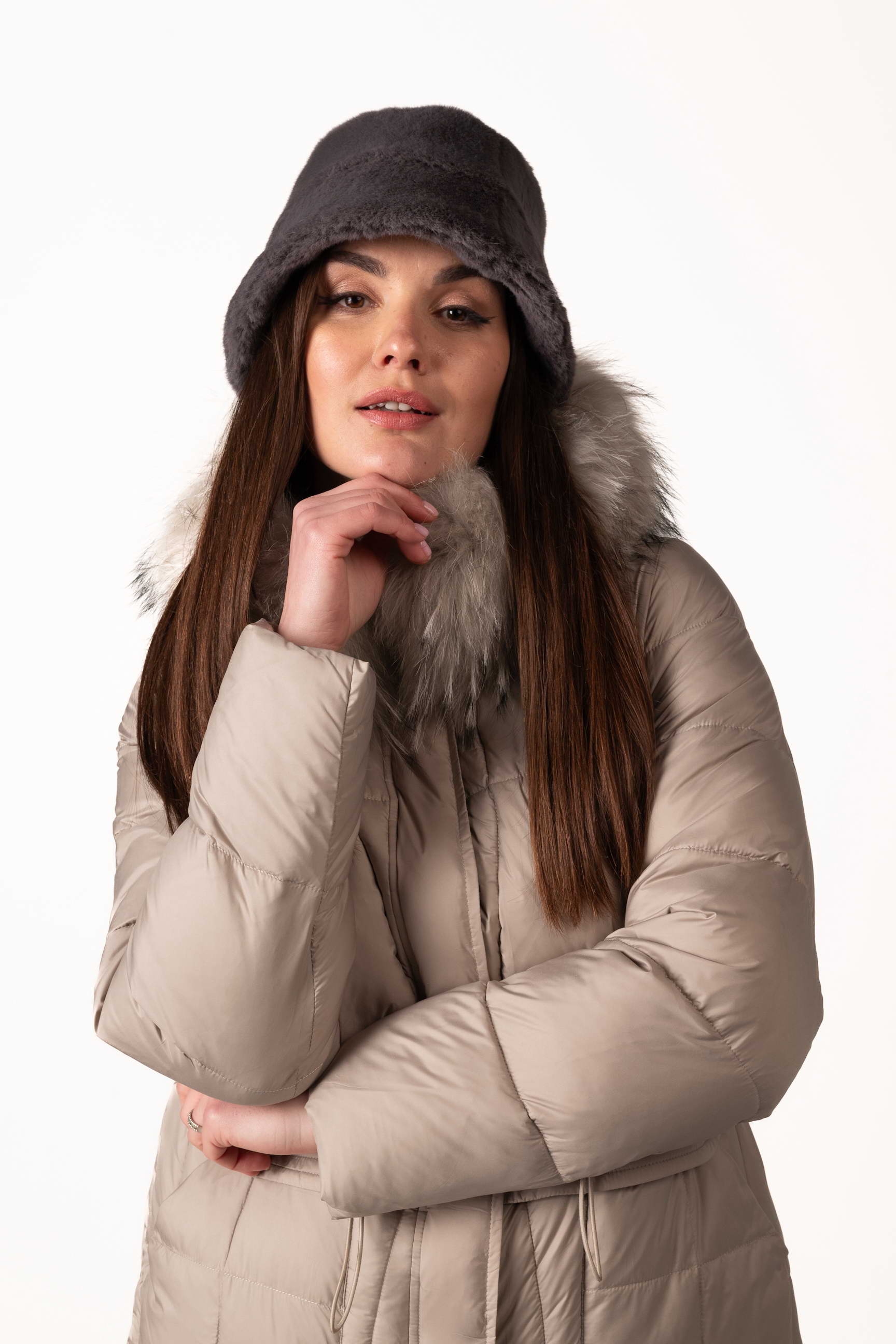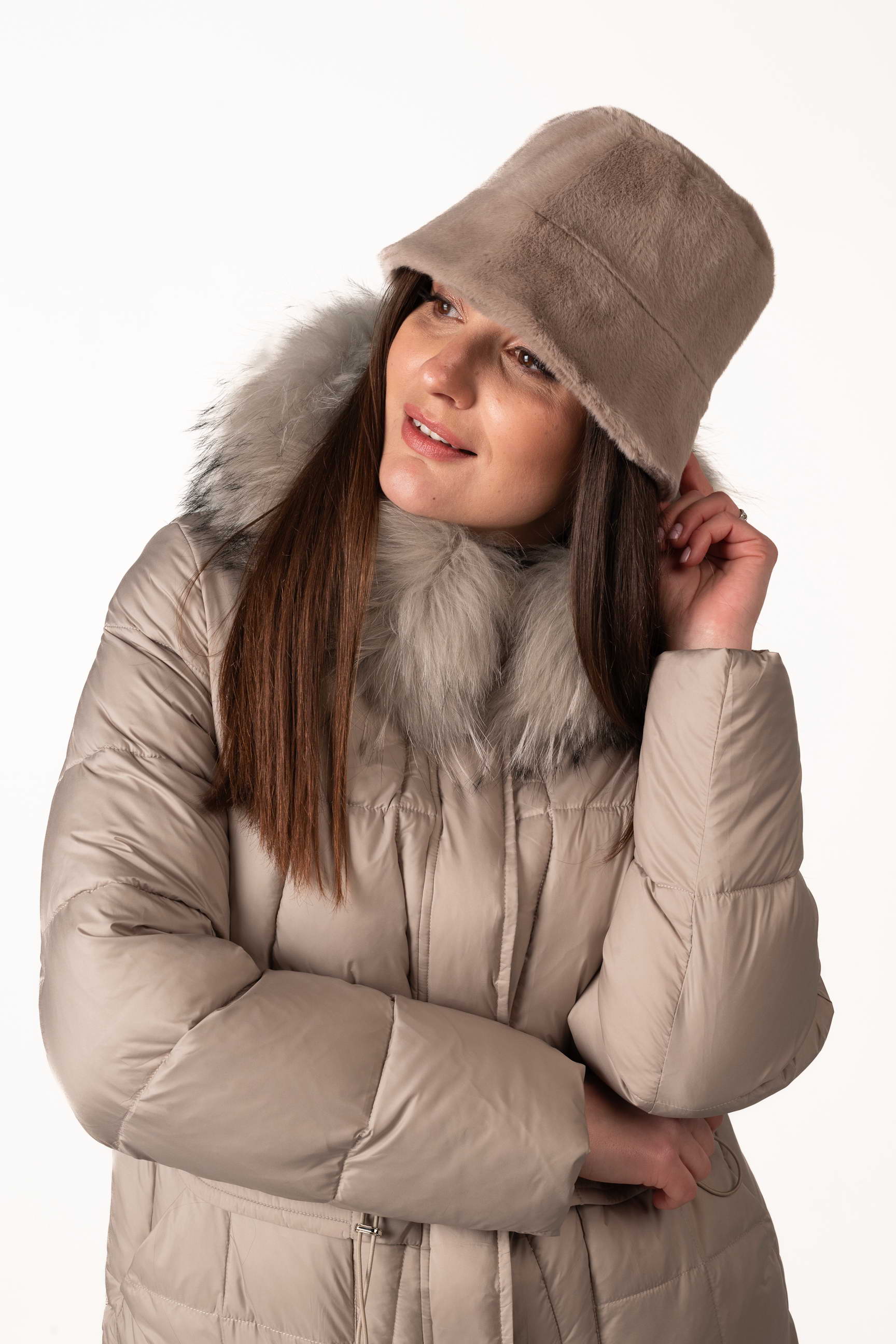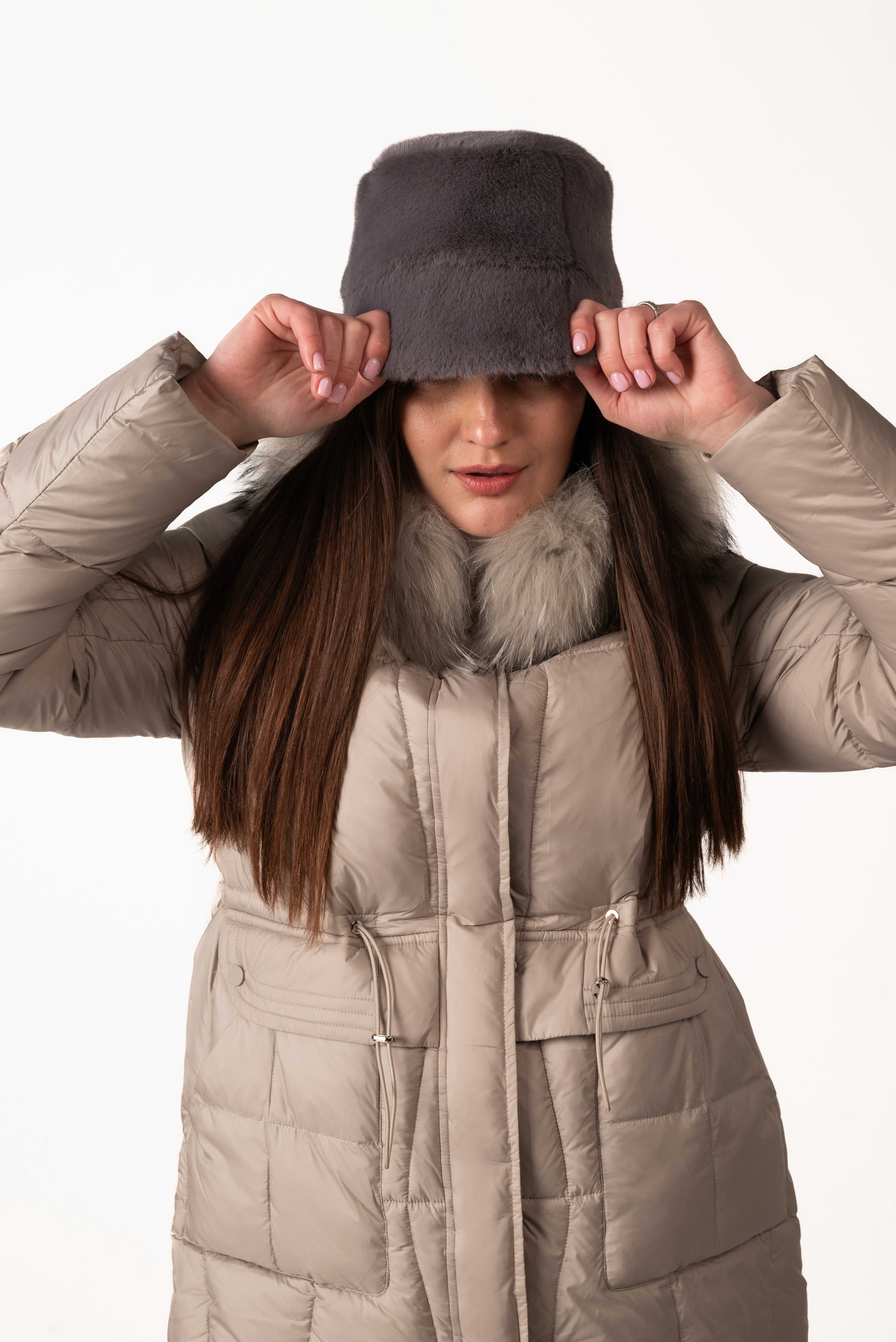 Шапка представлена в нескольких стильных цветах — серый, бежевый, коричневый, что позволяет выбрать вариант под любой зимний образ. Размеры шапки (обхват головы) — 55 см, 56 см, 57 см, чтобы каждая могла подобрать идеальную посадку.