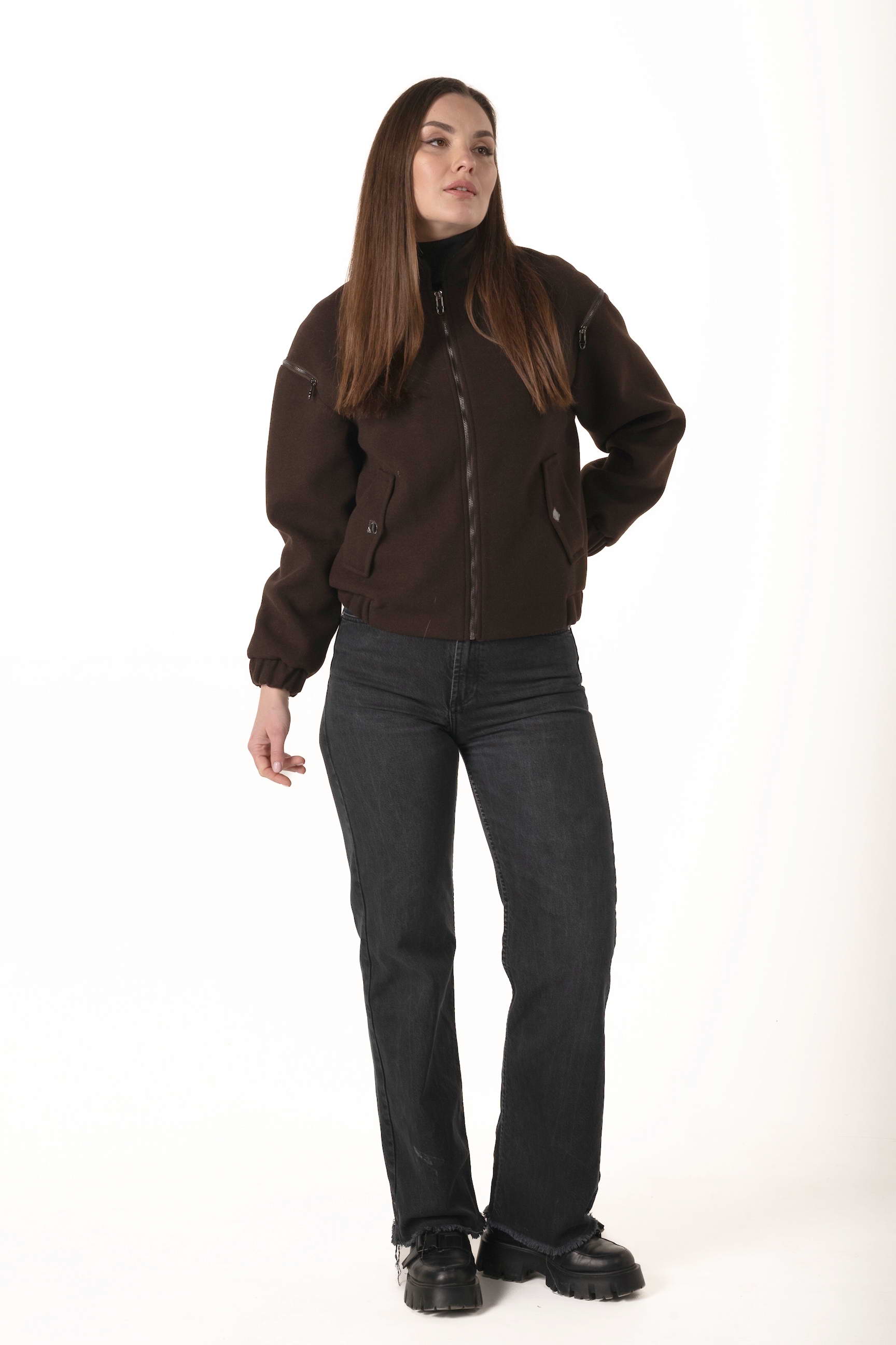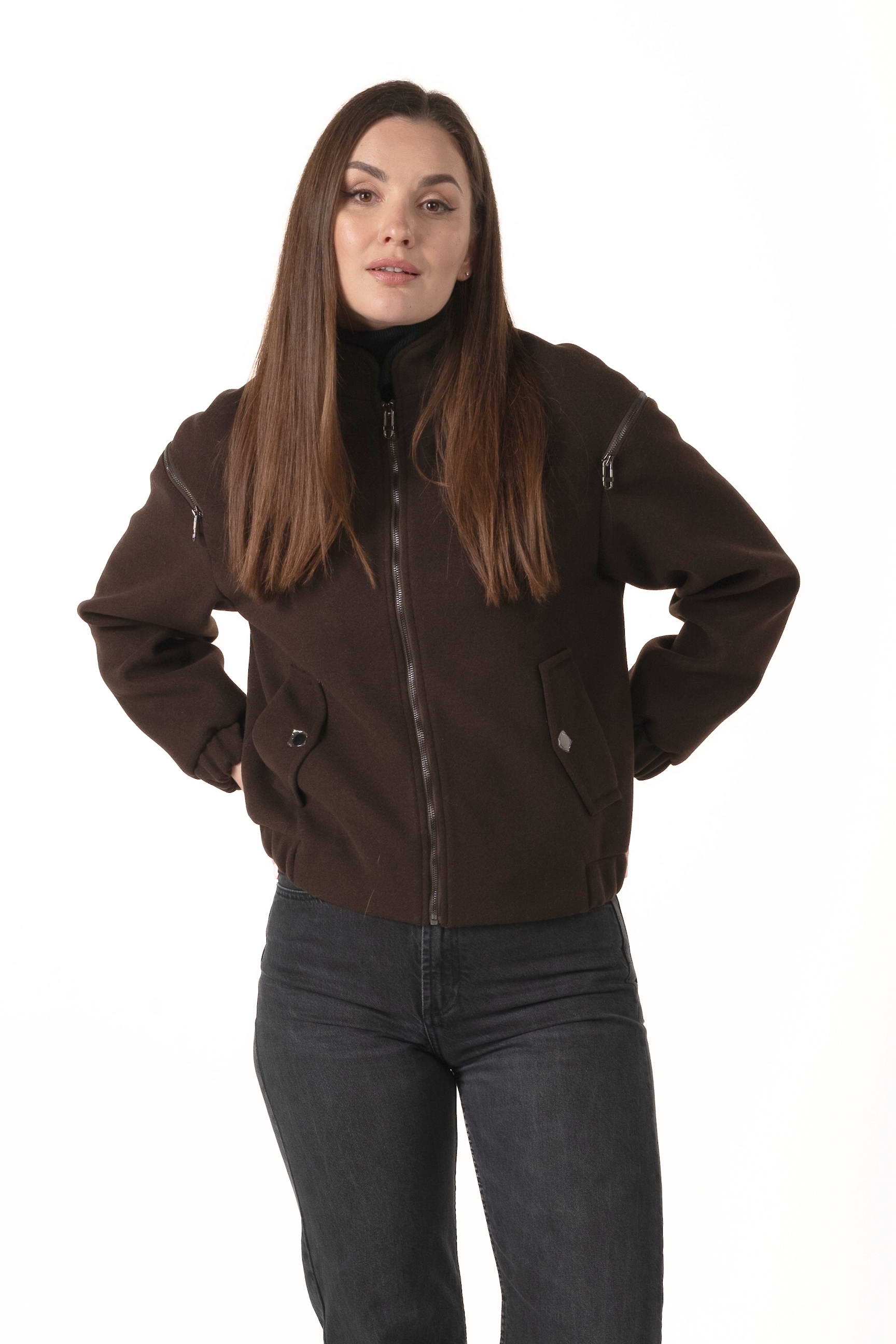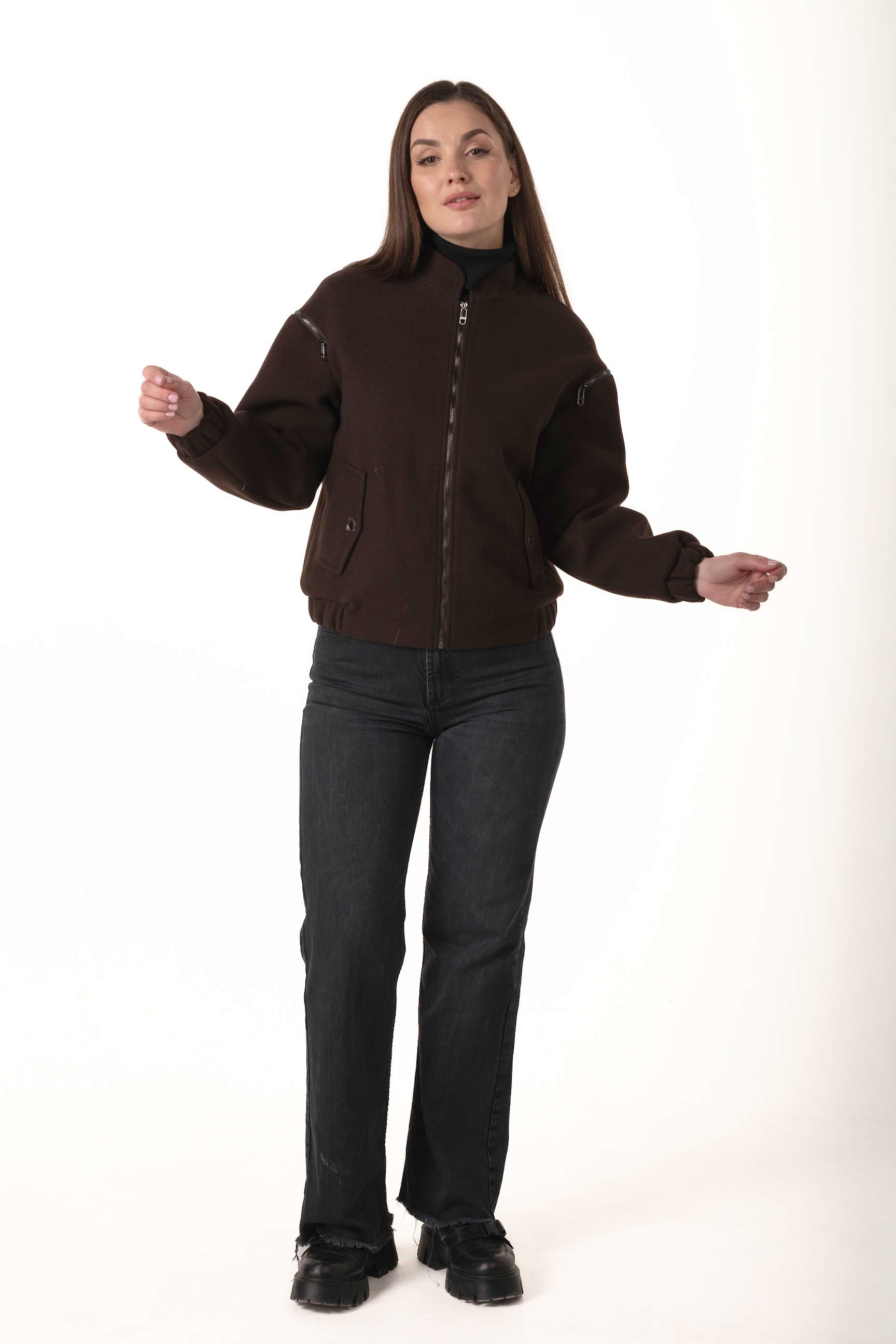 Силуэт-бомбер и длина 62 см создают современный образ, подчеркивая стиль и свободу движений. Коричневый цвет добавляет элегантности и универсальности, сочетается с любым гардеробом и подходит для повседневного ношения.
