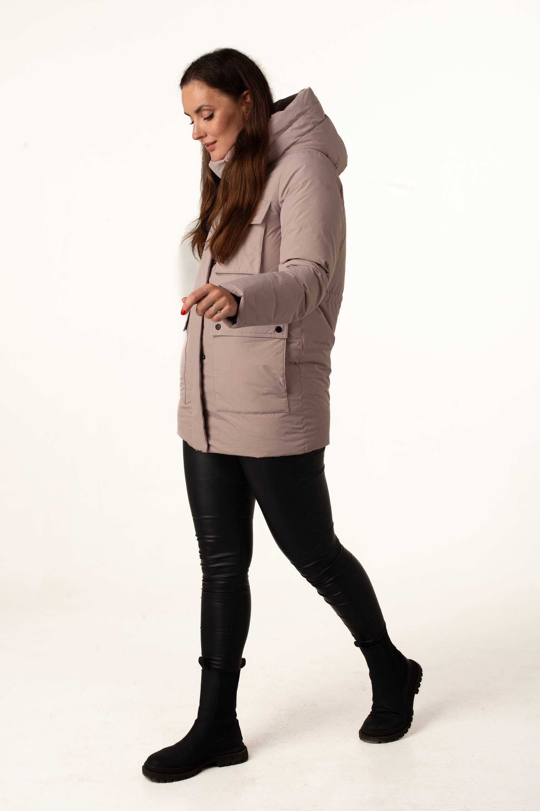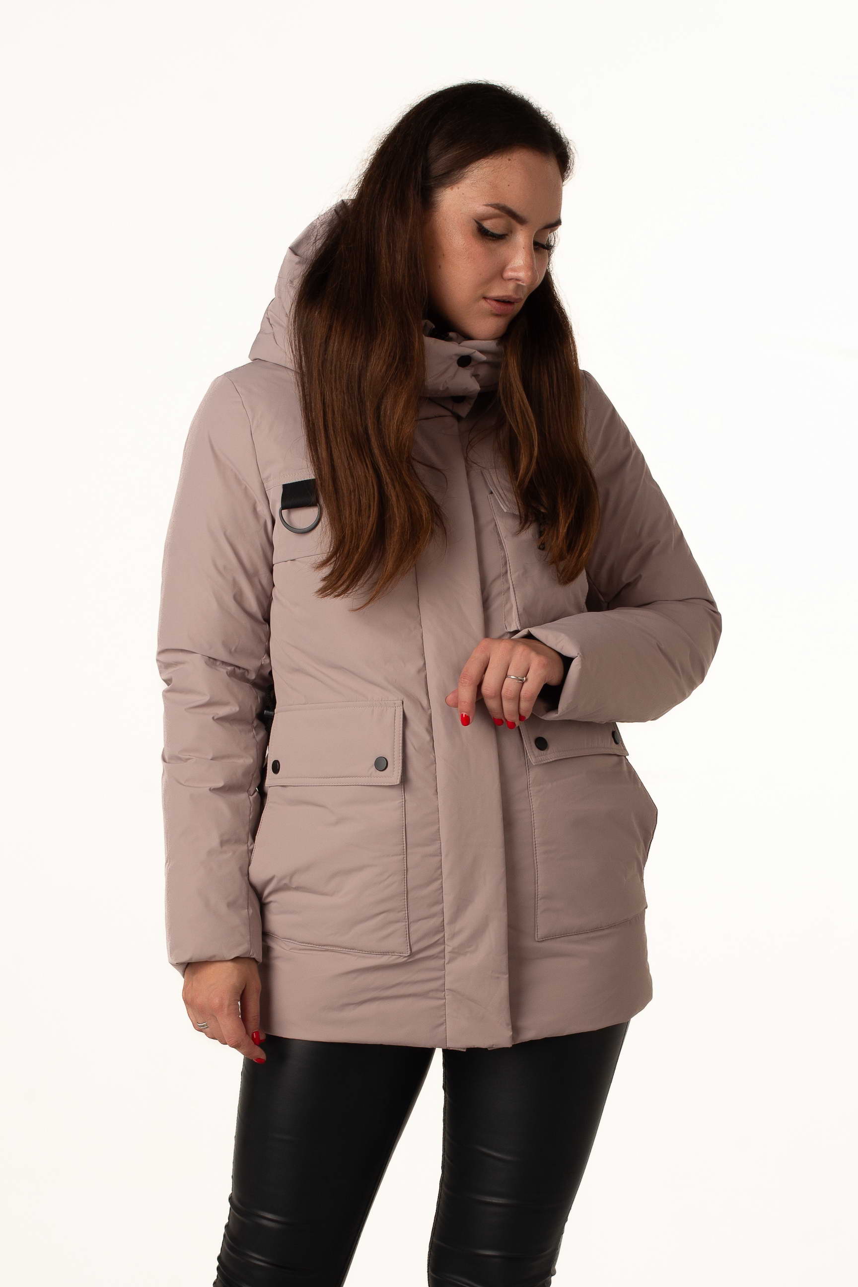 Бежевый женский биопуховик сочетает тепло, лёгкость и современный дизайн. Удлинённая модель с декоративными деталями создана для максимального комфорта в холодное время года.