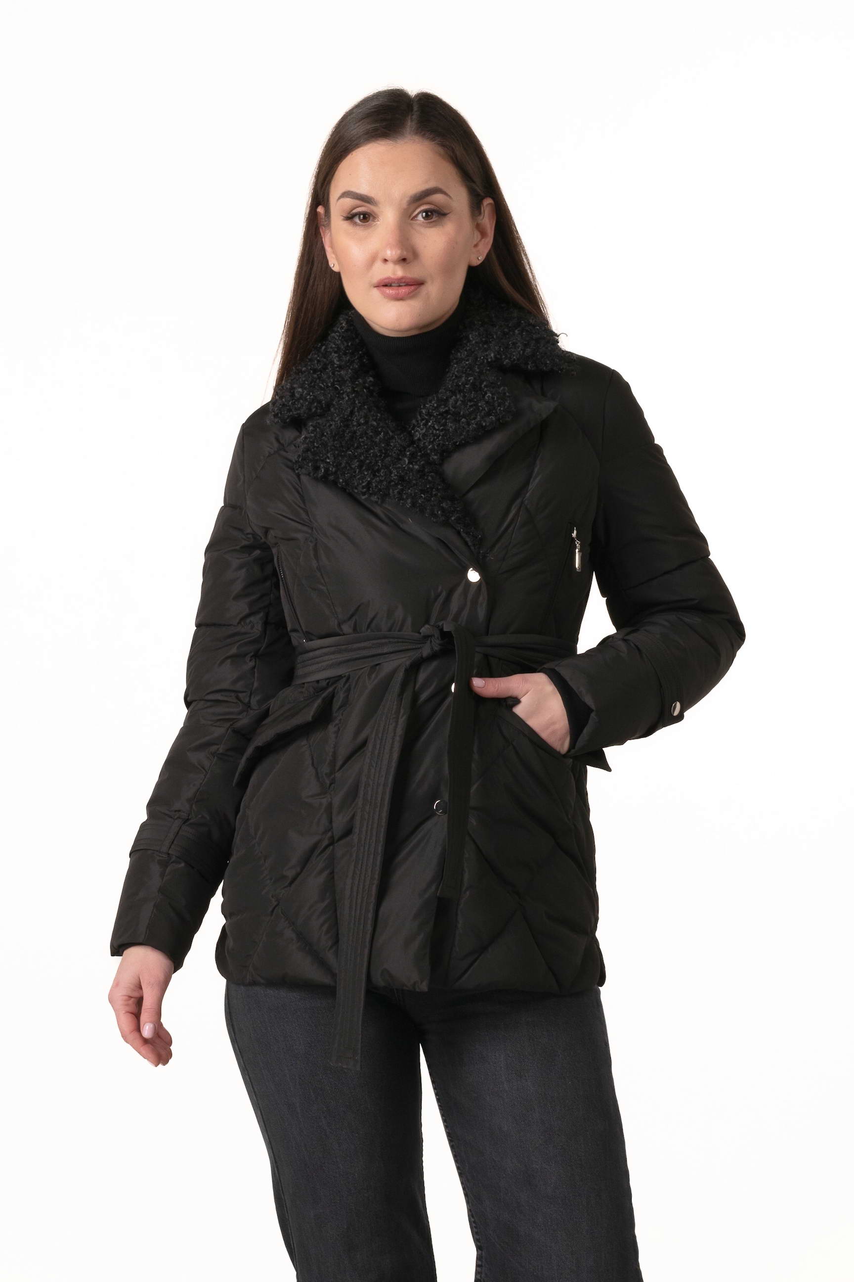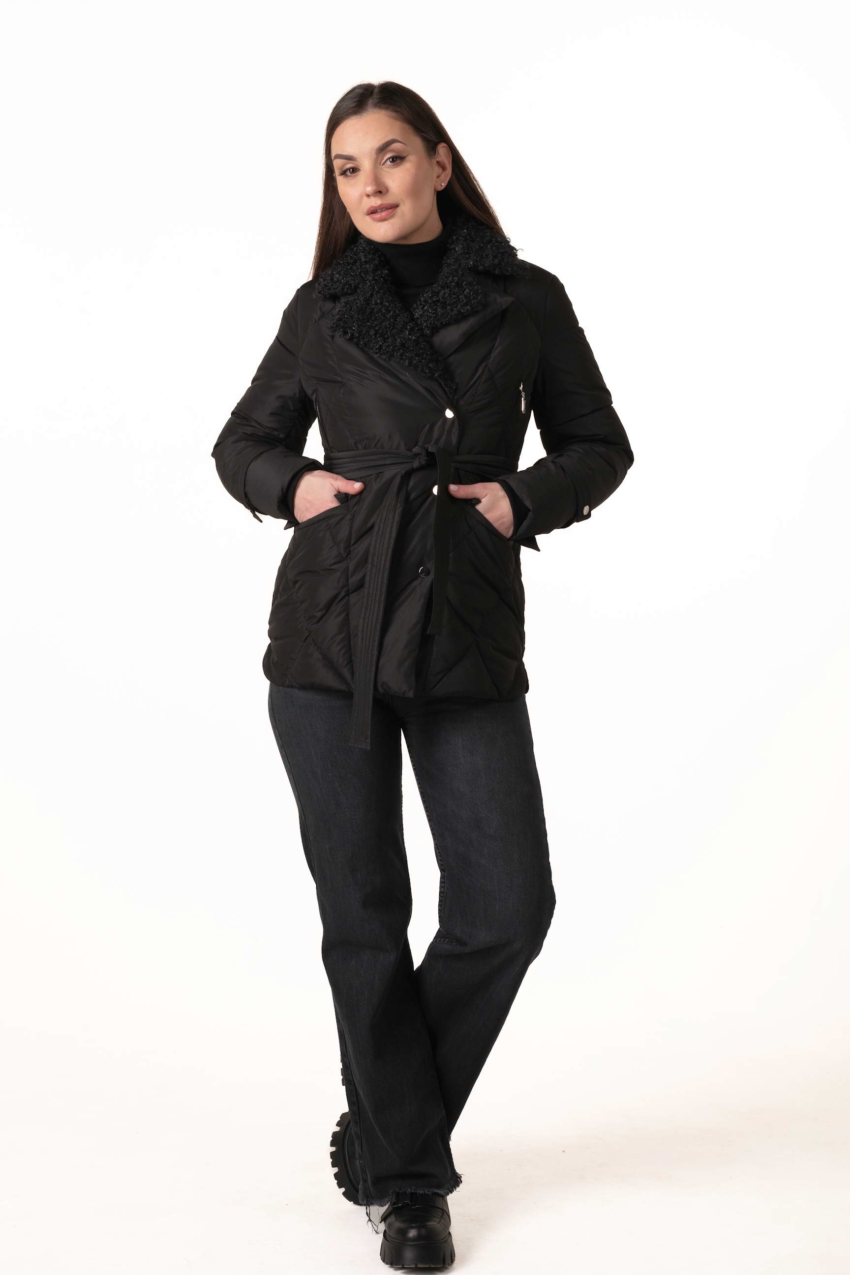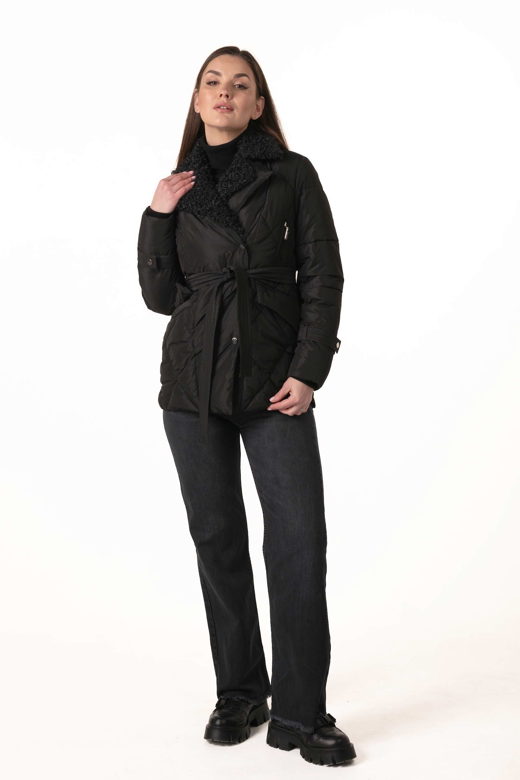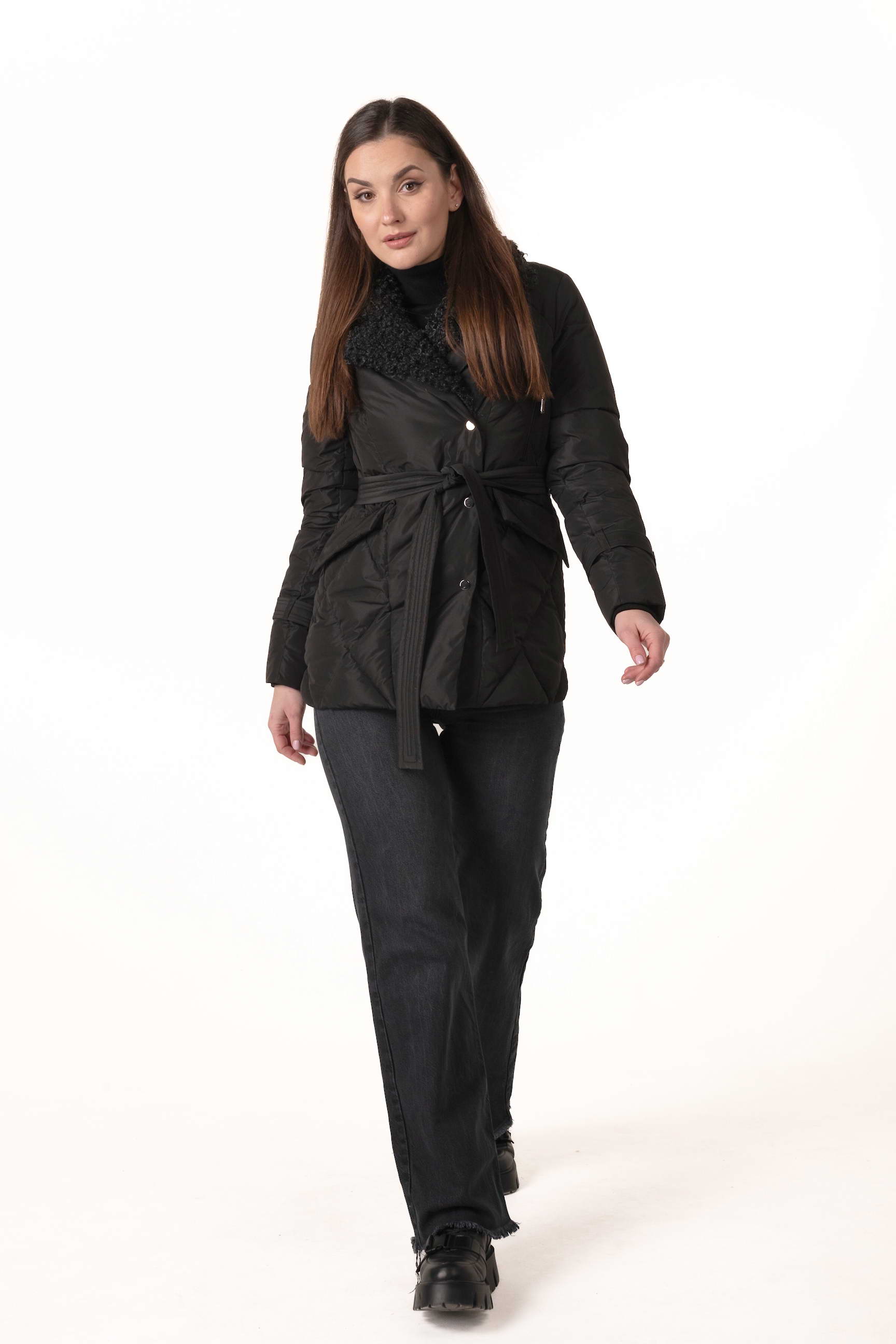 Прямой крой обеспечивает комфорт и свободу движений, а пояс на талии позволяет регулировать посадку, подчёркивая силуэт и женственность. Английский воротник, декорированный отстёгиваемым экомехом под барашка, добавляет роскоши и защищает от ветра и холода.