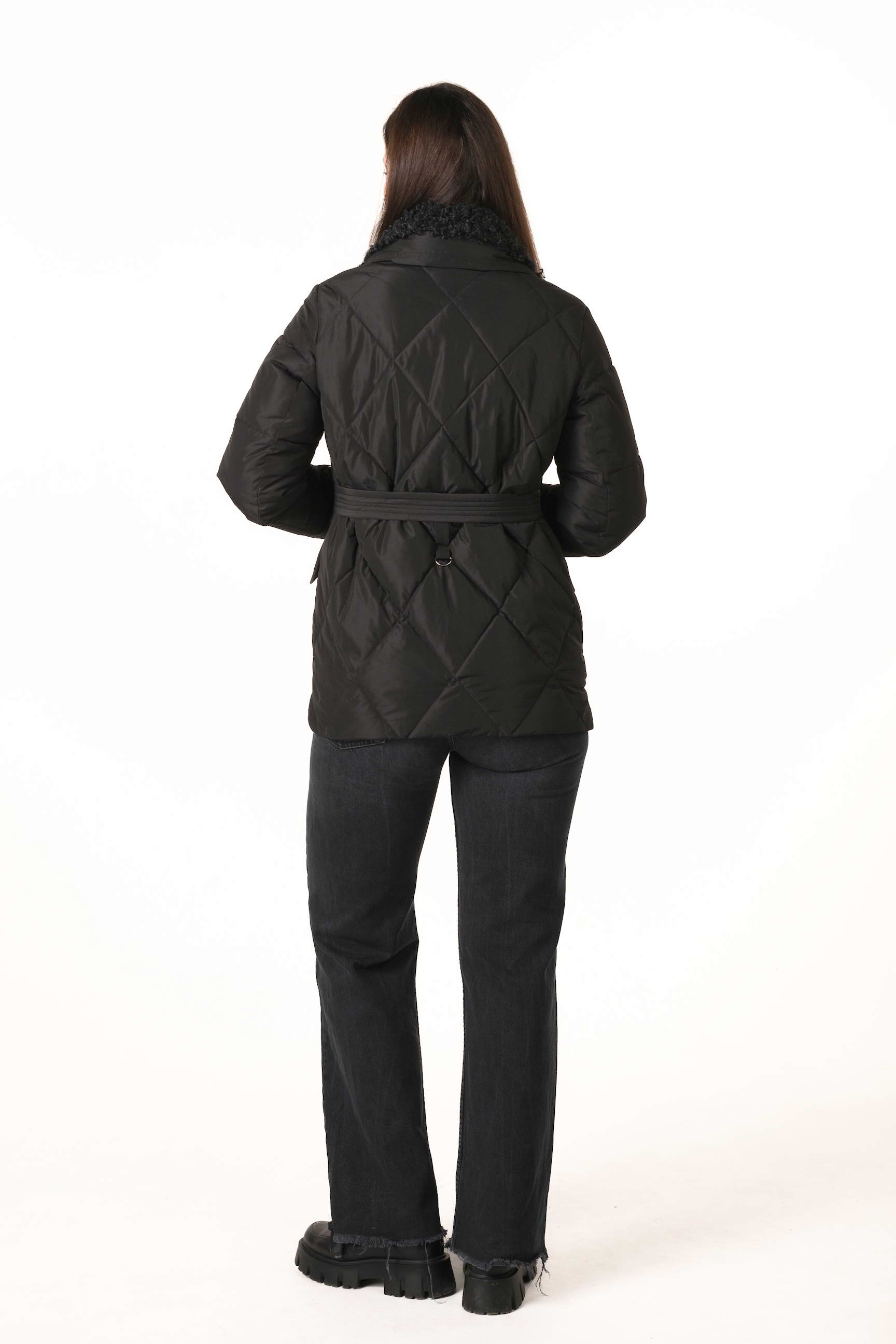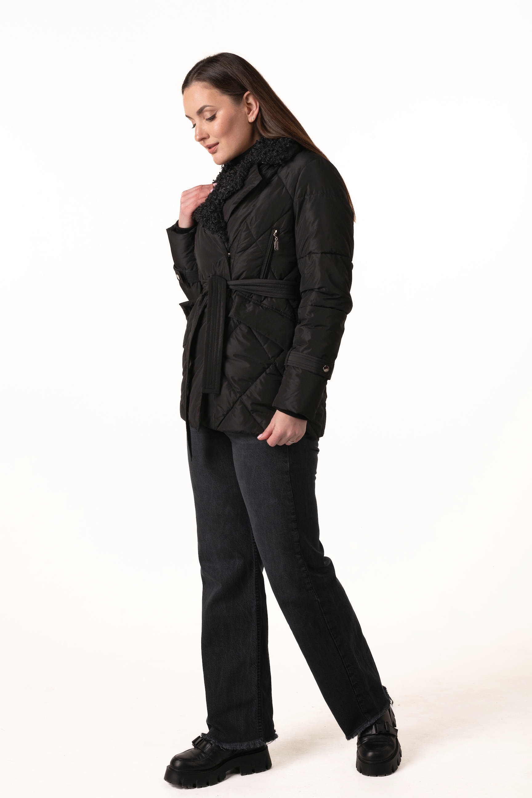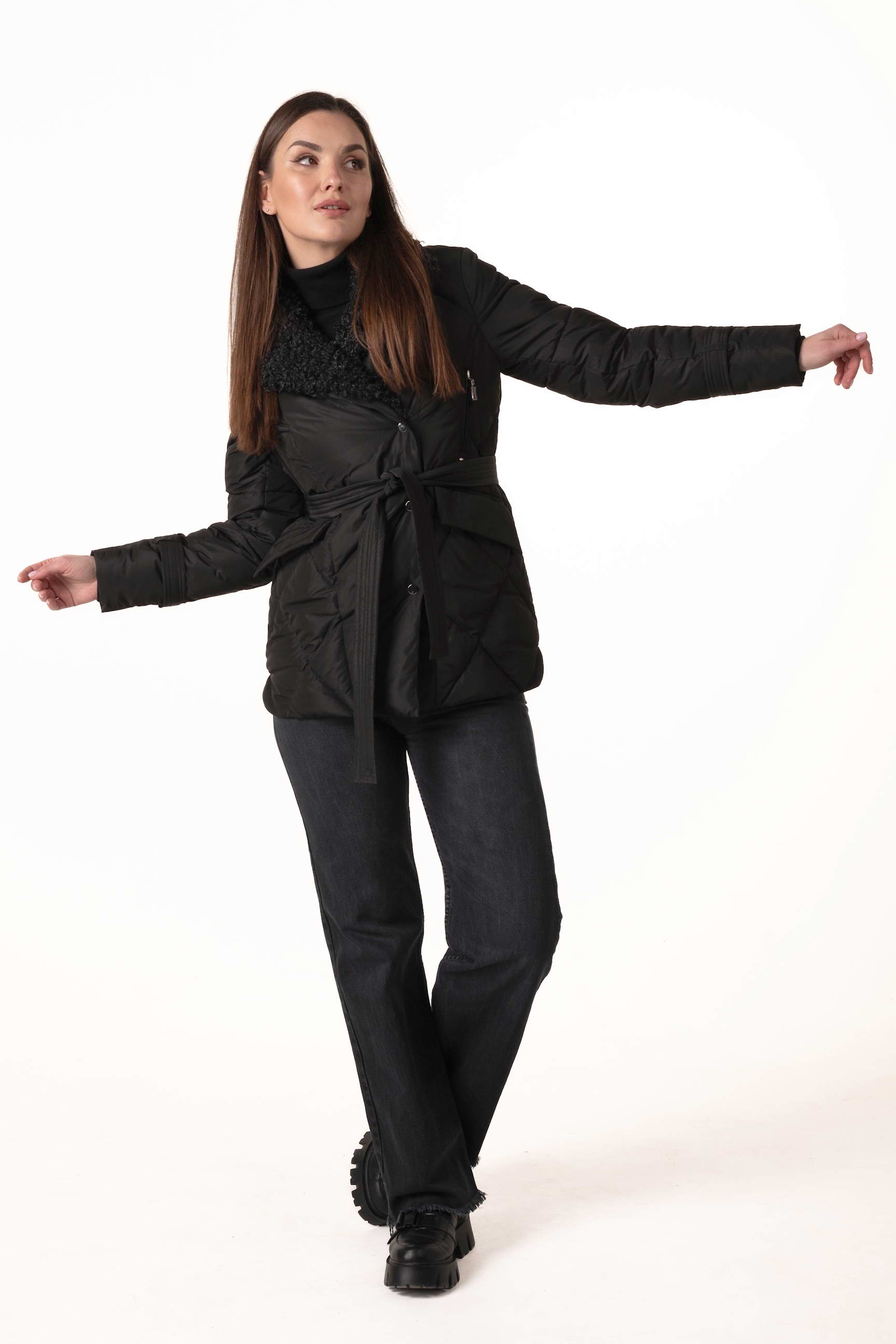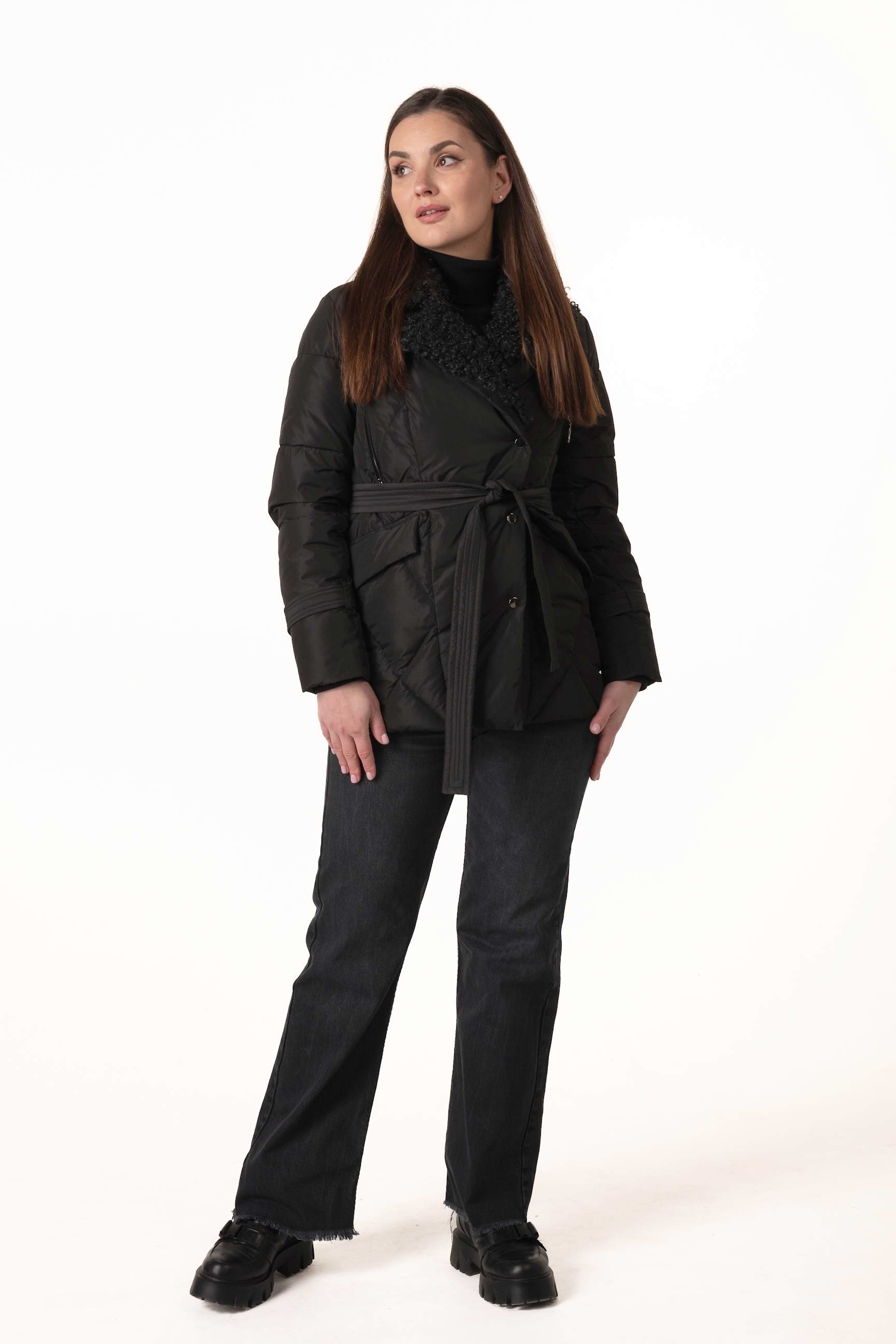Прямой крой обеспечивает комфорт и свободу движений, а пояс на талии позволяет регулировать посадку, подчёркивая силуэт и женственность. Английский воротник, декорированный отстёгиваемым экомехом под барашка, добавляет роскоши и защищает от ветра и холода.
