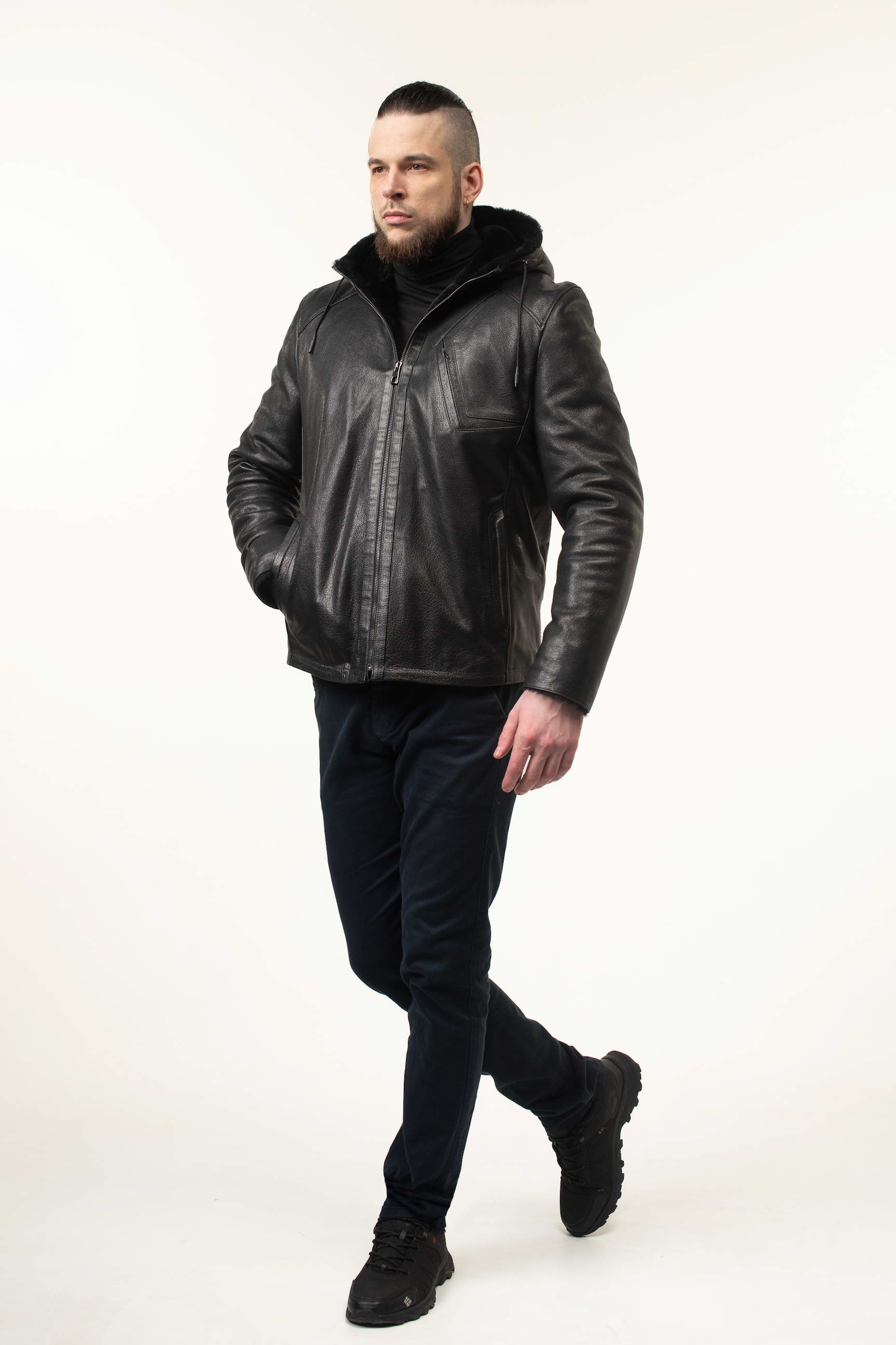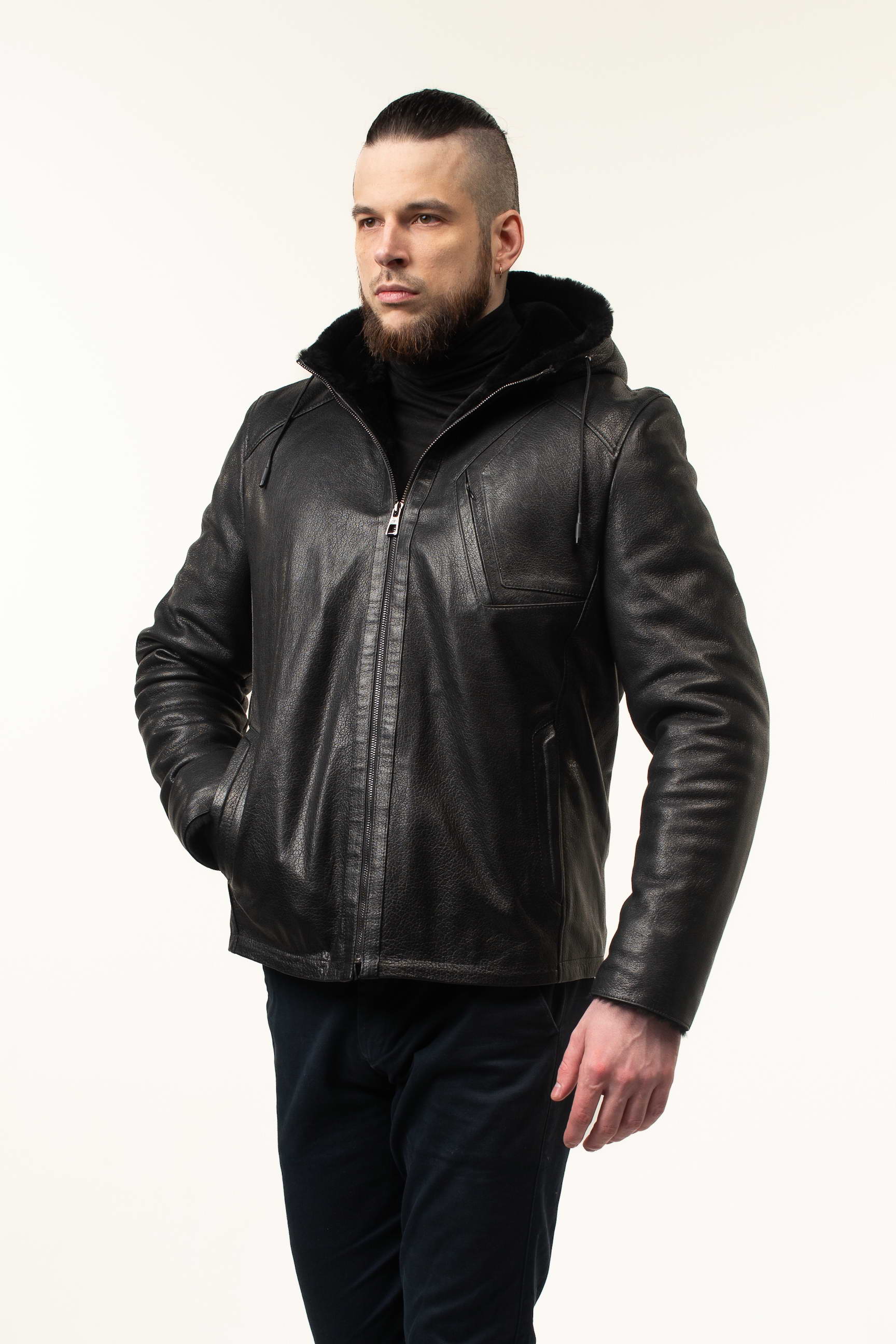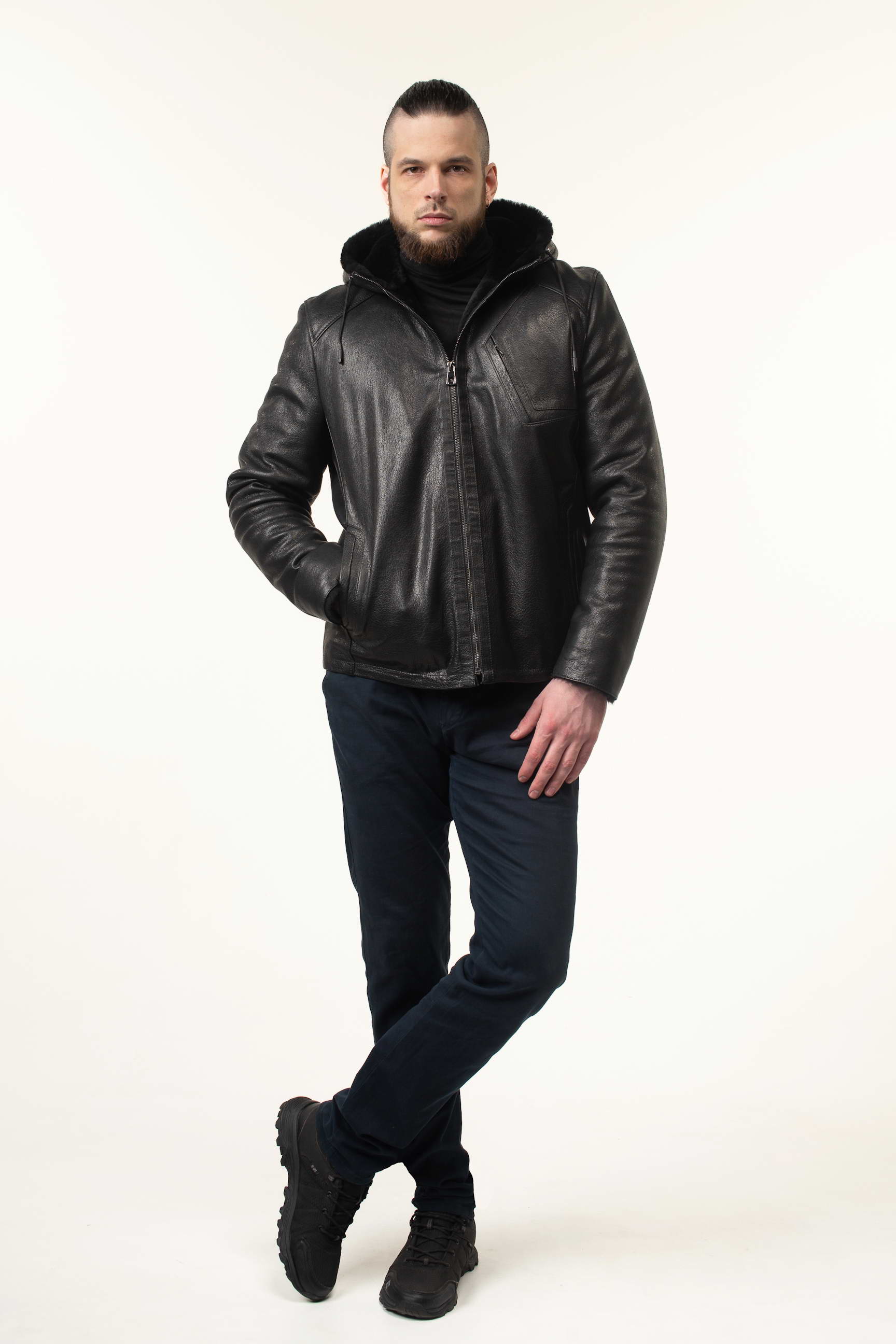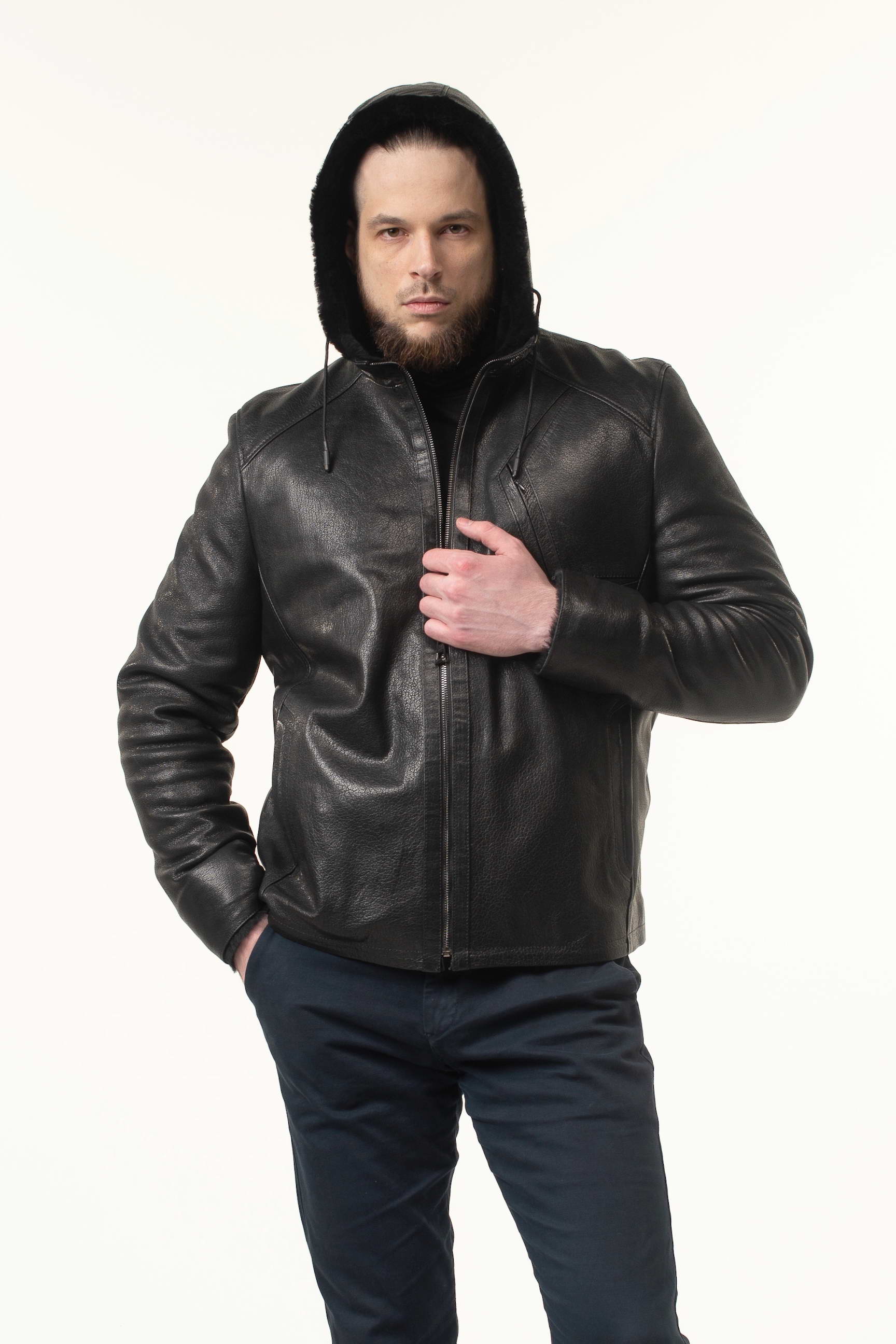 Чоловіча шкіряна дублянка-сендвіч чорного кольору з капюшоном чудово доповнить: