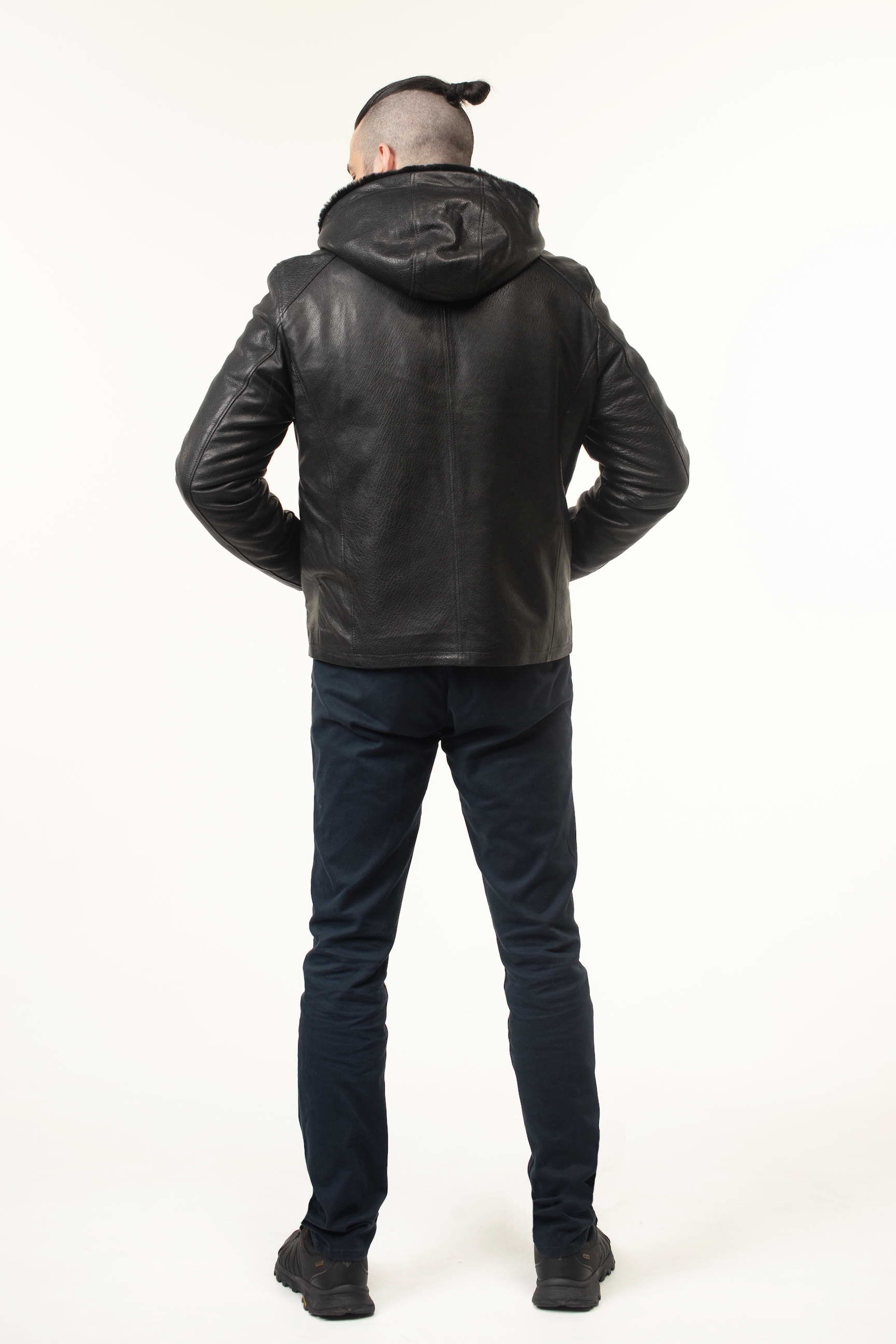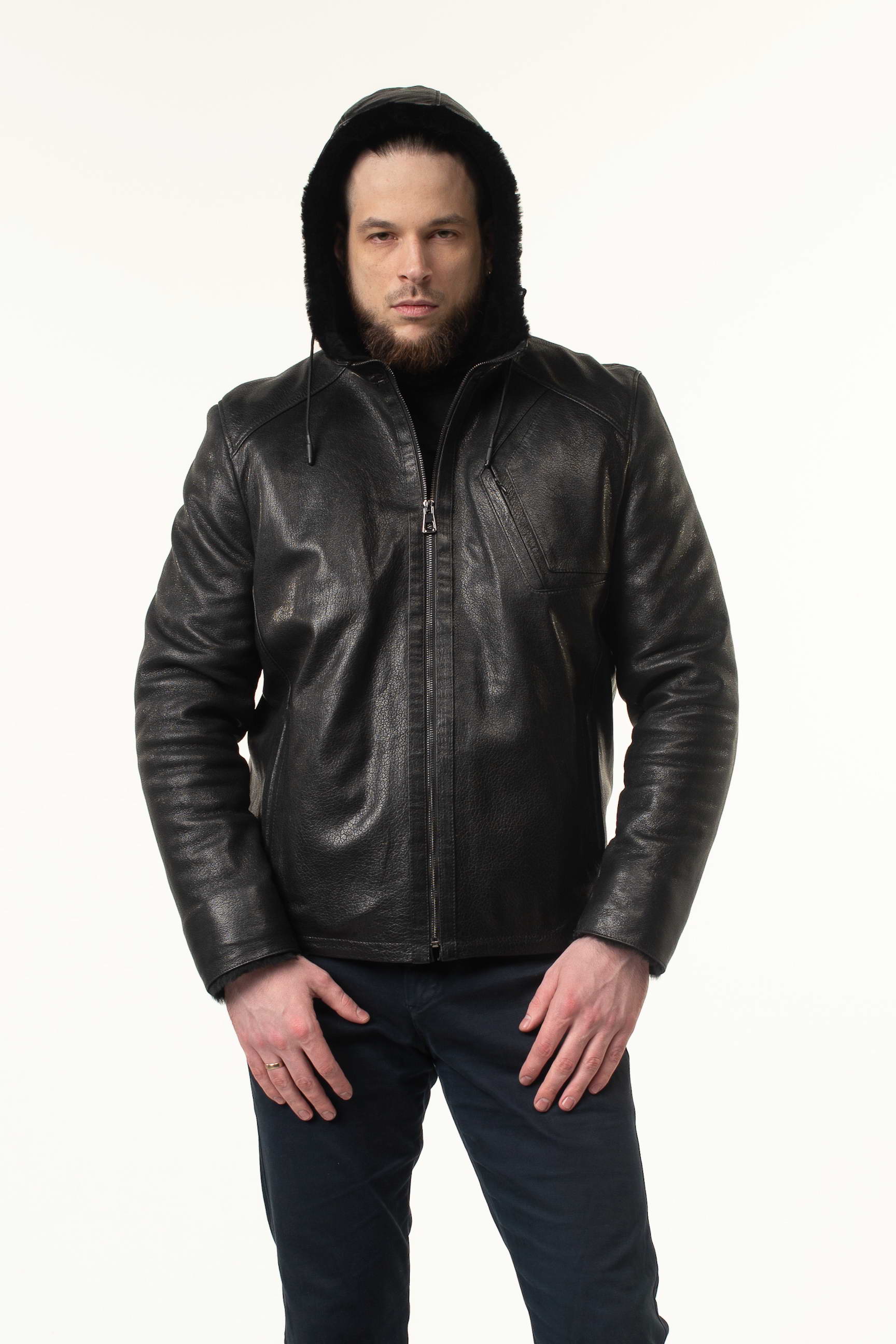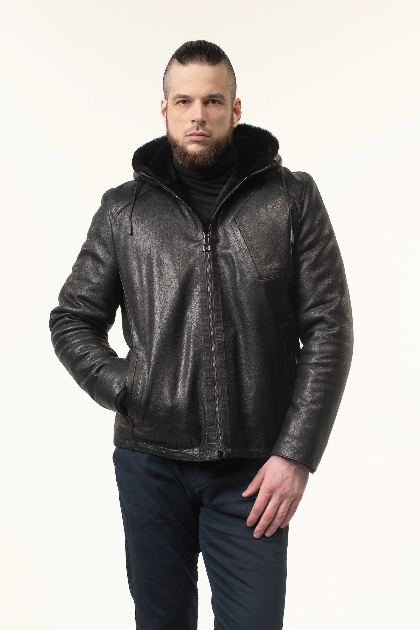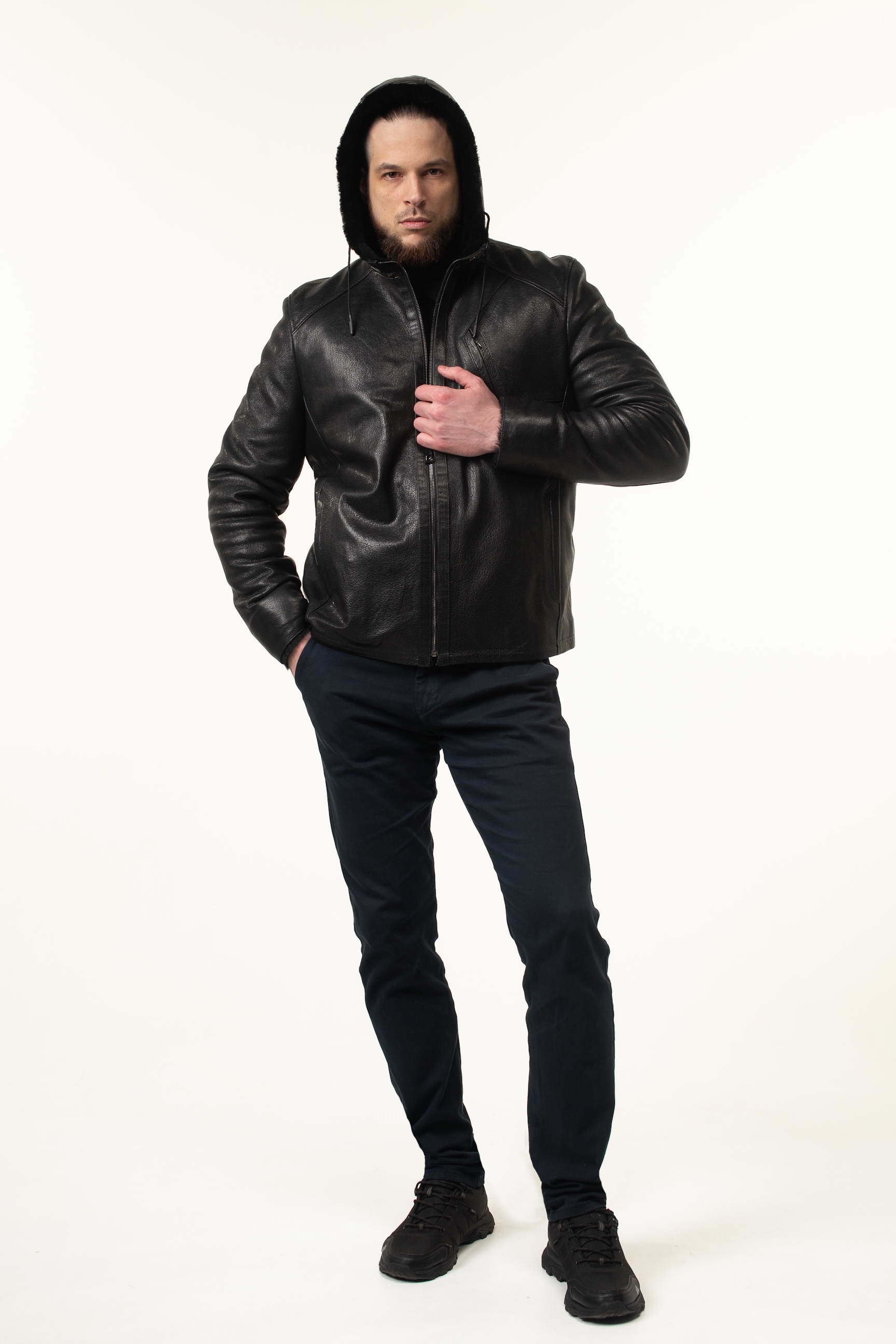 Чоловіча шкіряна дублянка-сендвіч чорного кольору з капюшоном чудово доповнить: