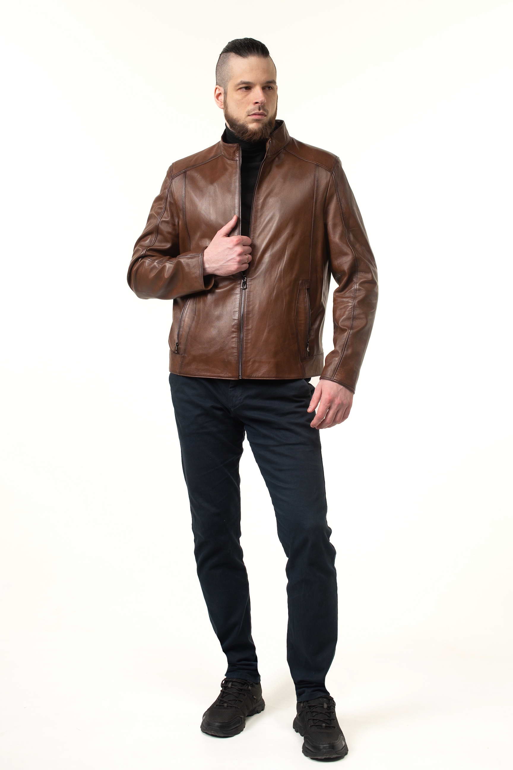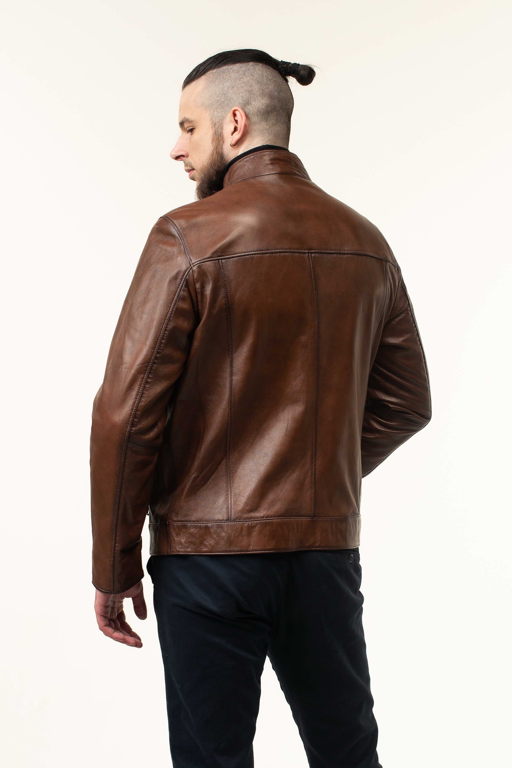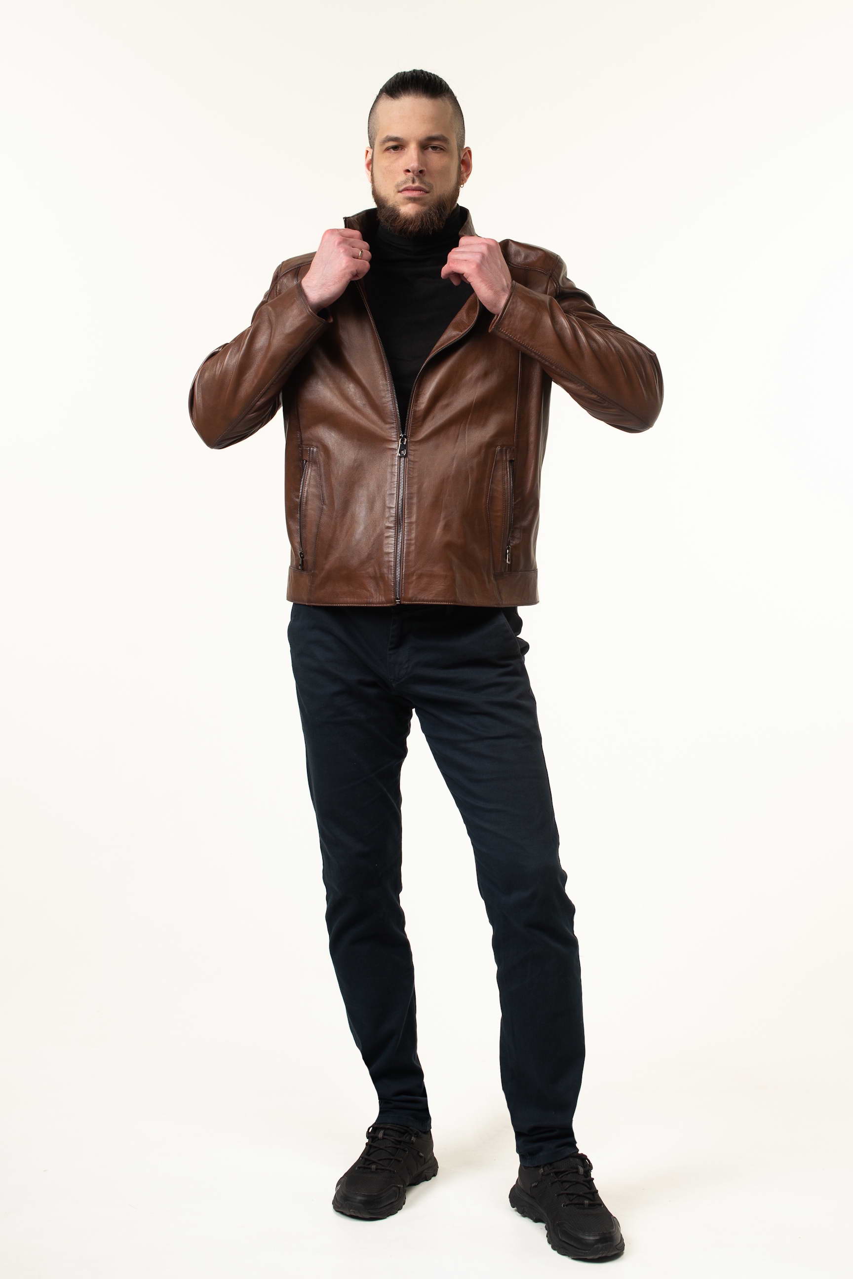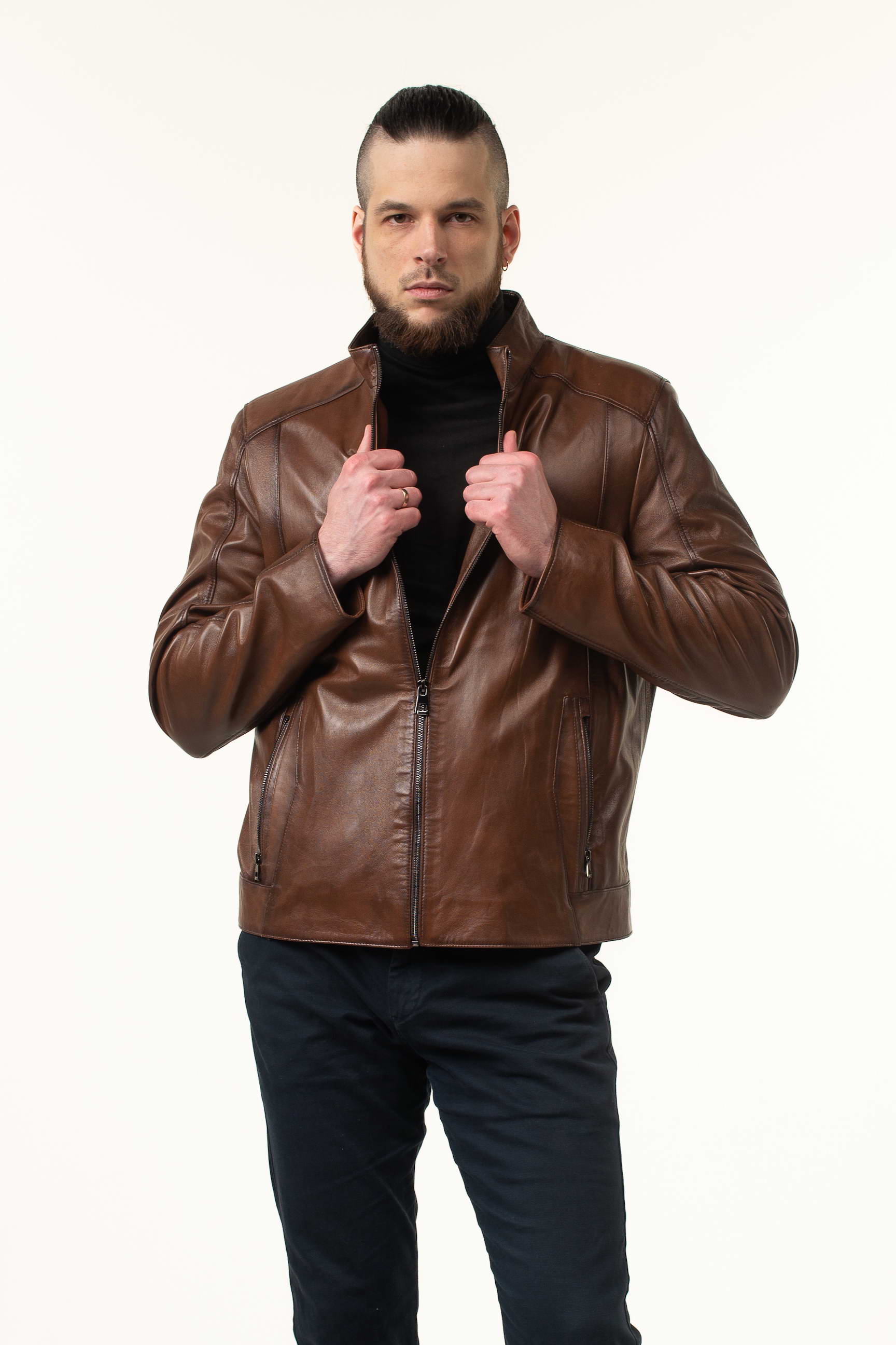 Сучасна чоловіча шкіряна куртка для сезону весна/осінь — це ідеальне поєднання елегантності, практичності та преміальної якості. Модель виконана з натуральної телячої шкіри, яка вирізняється гладкою текстурою, міцністю та довговічністю. Насичений коричневий відтінок підкреслює стиль і статус власника, а затемнені шви додають глибини та сучасного характеру.