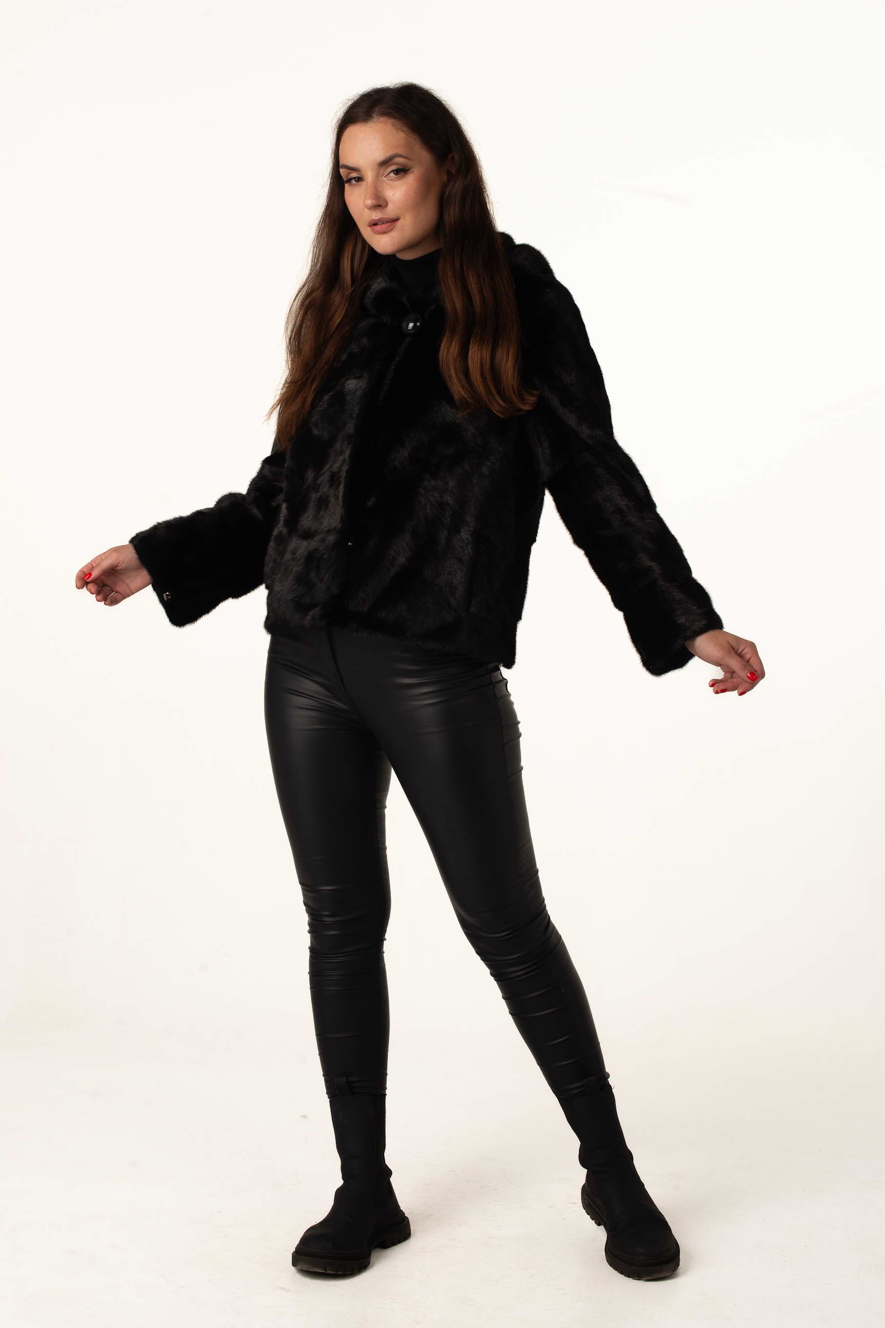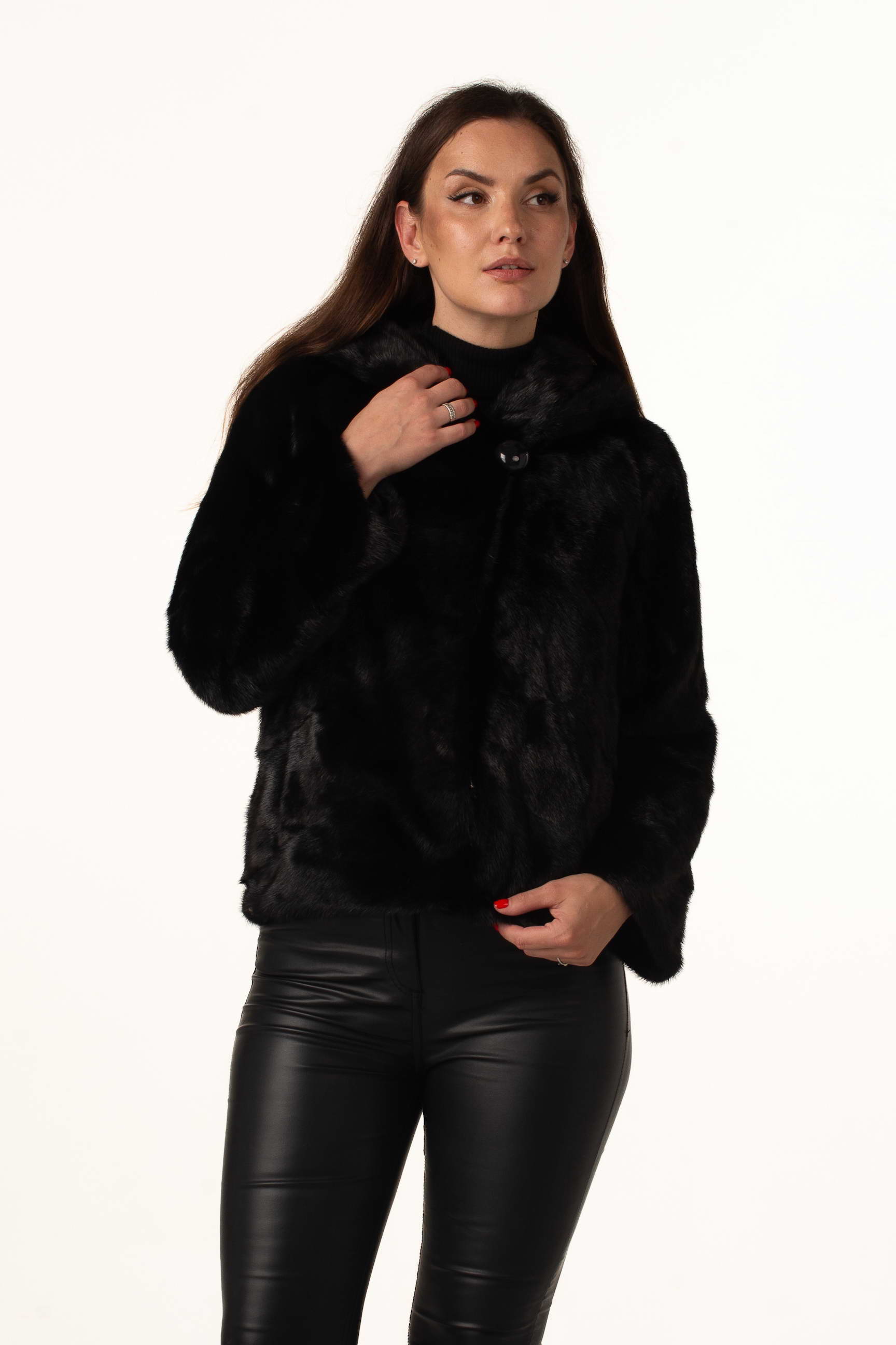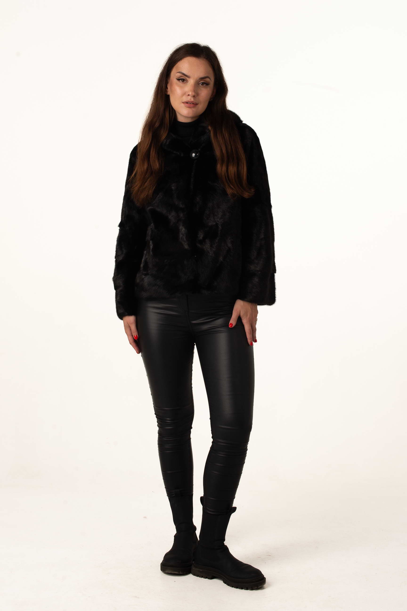 Чорна жіноча шуба з натурального хутра норки з капюшоном "кобра" – елегантна та сучасна модель для зимового сезону. Відстібний рукав до довжини 3/4 додає варіативності у носінні, а гудзик біля коміра підкреслює вишуканий дизайн.