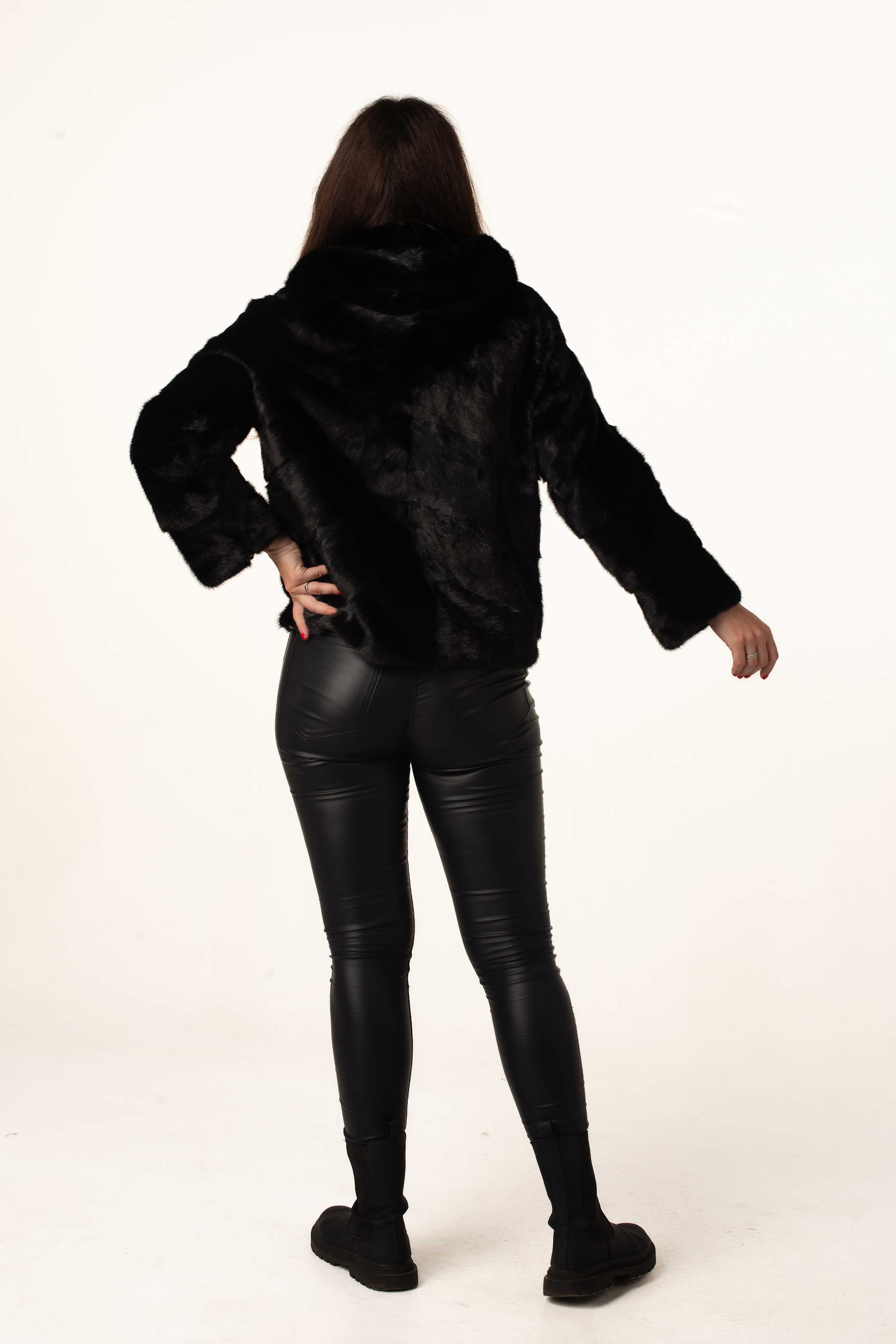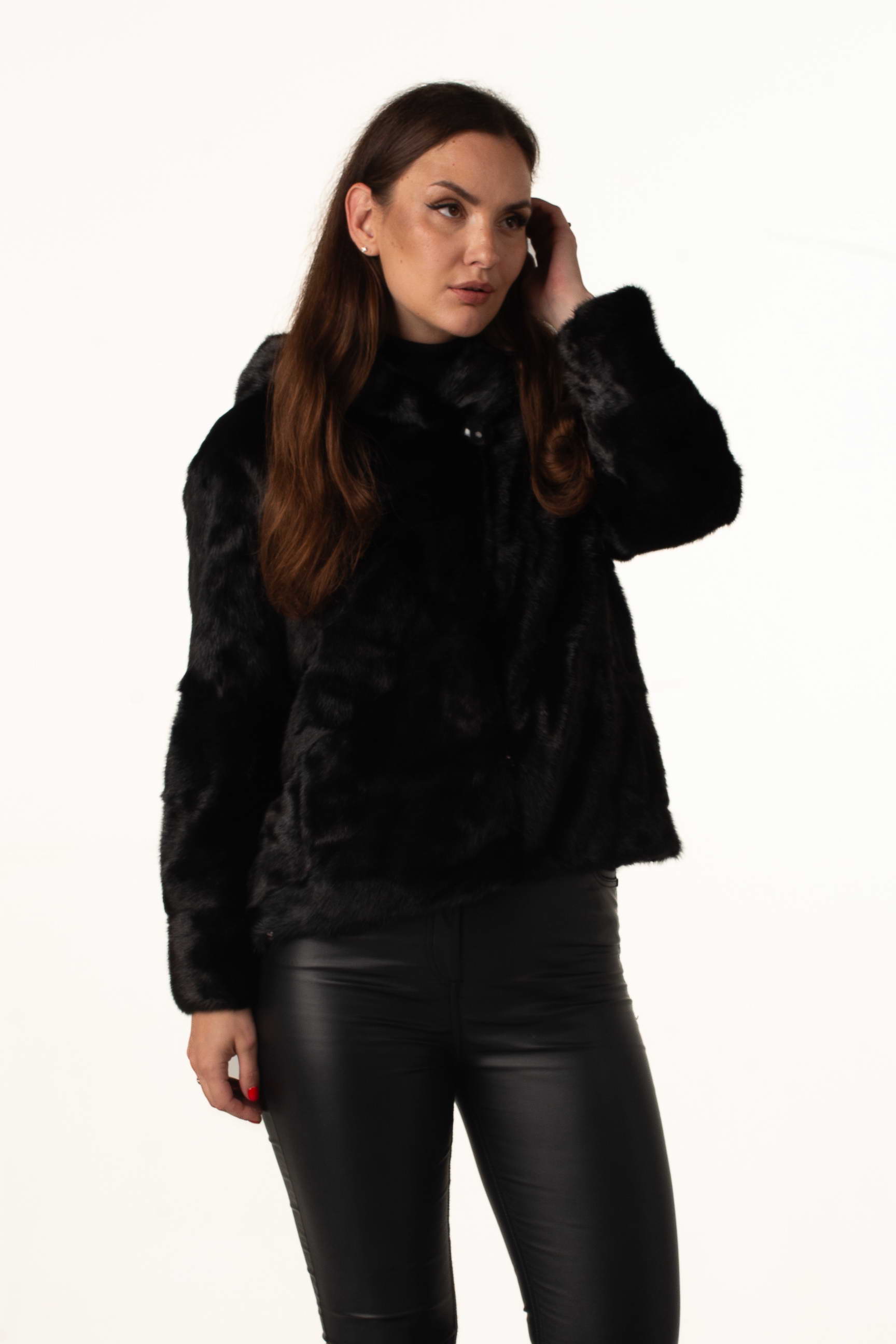 Чорна норкова шуба з капюшоном поєднує тепло, комфорт і розкішний дизайн, підходить для міських прогулянок, святкових заходів та щоденного використання у зимовий період.