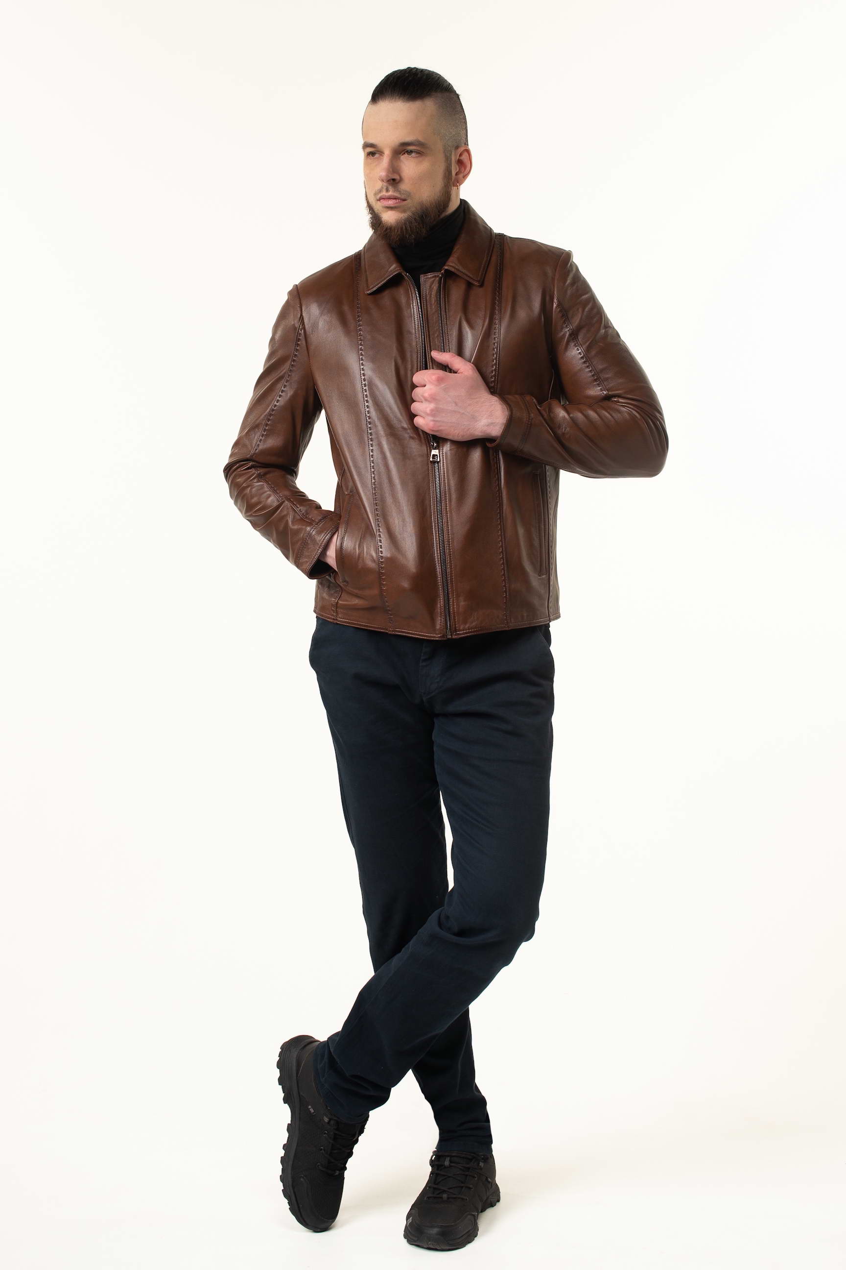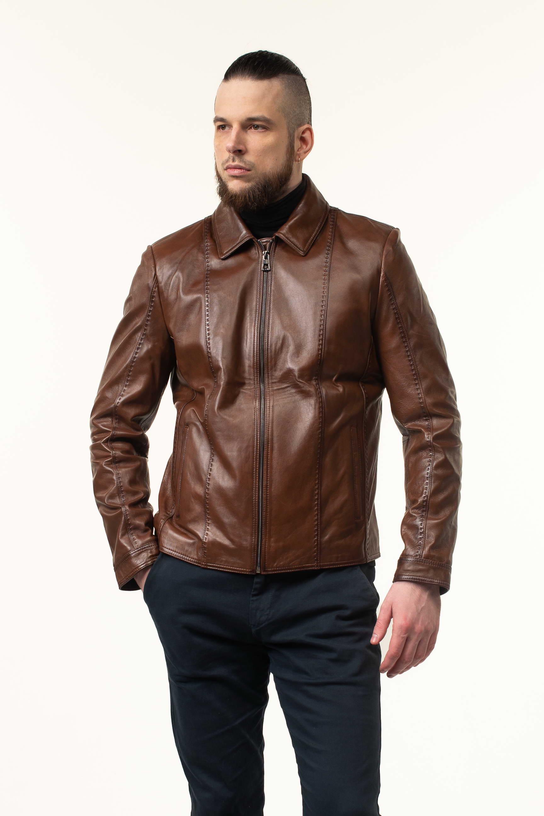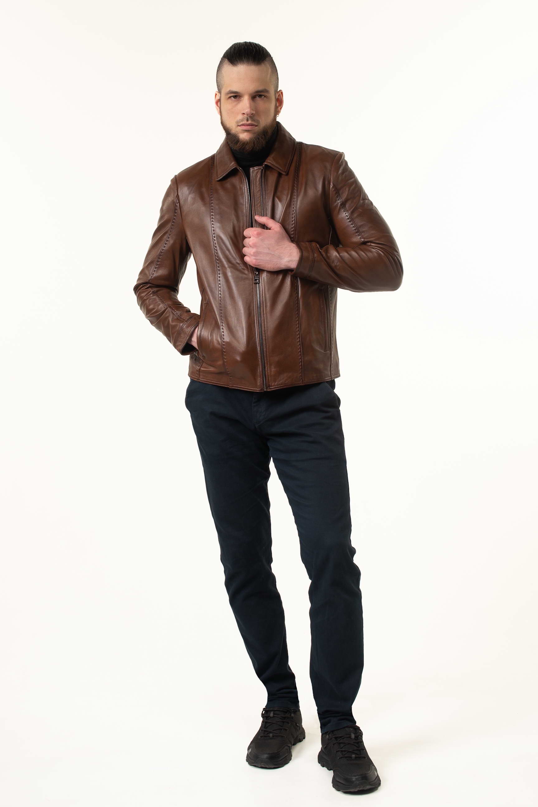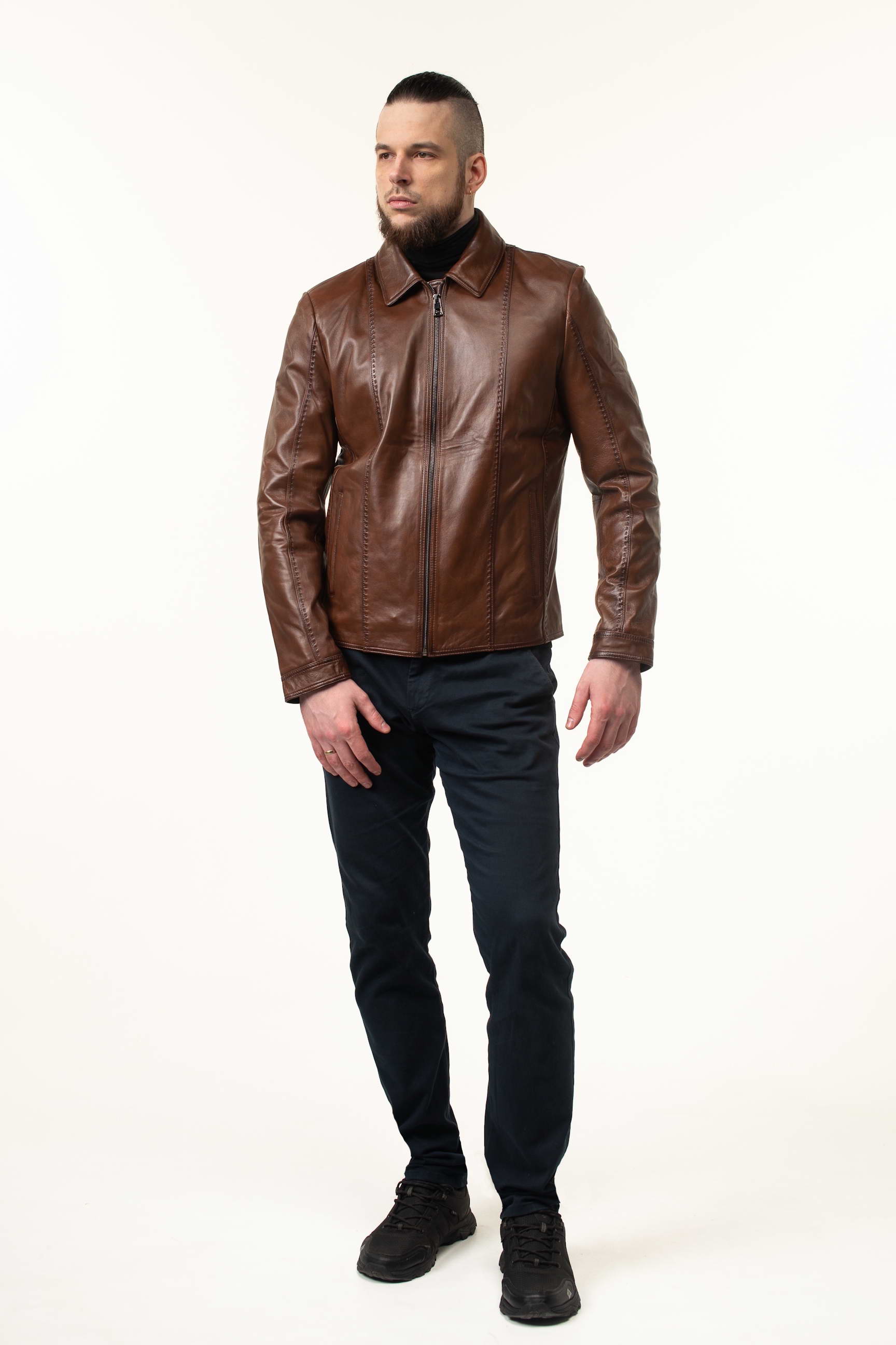 Стильна чоловіча шкіряна куртка для сезону весна/осінь — поєднання преміальної якості матеріалу, комфортного крою та сучасного дизайну. Модель виготовлена з натуральної телячої шкіри світло-коричневого відтінку, м’якої на дотик і довговічної, що з часом набуває характерної текстури та елегантності.