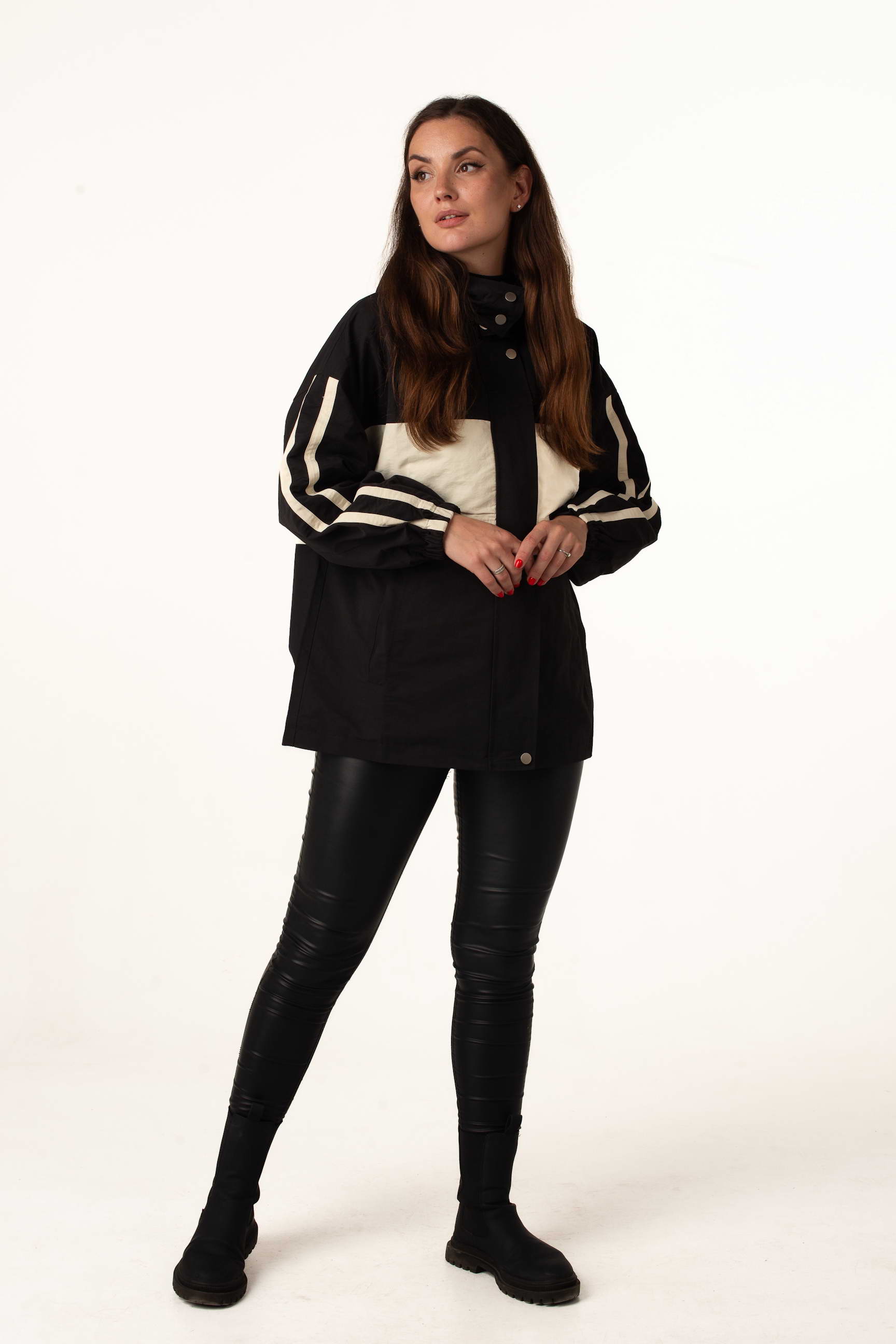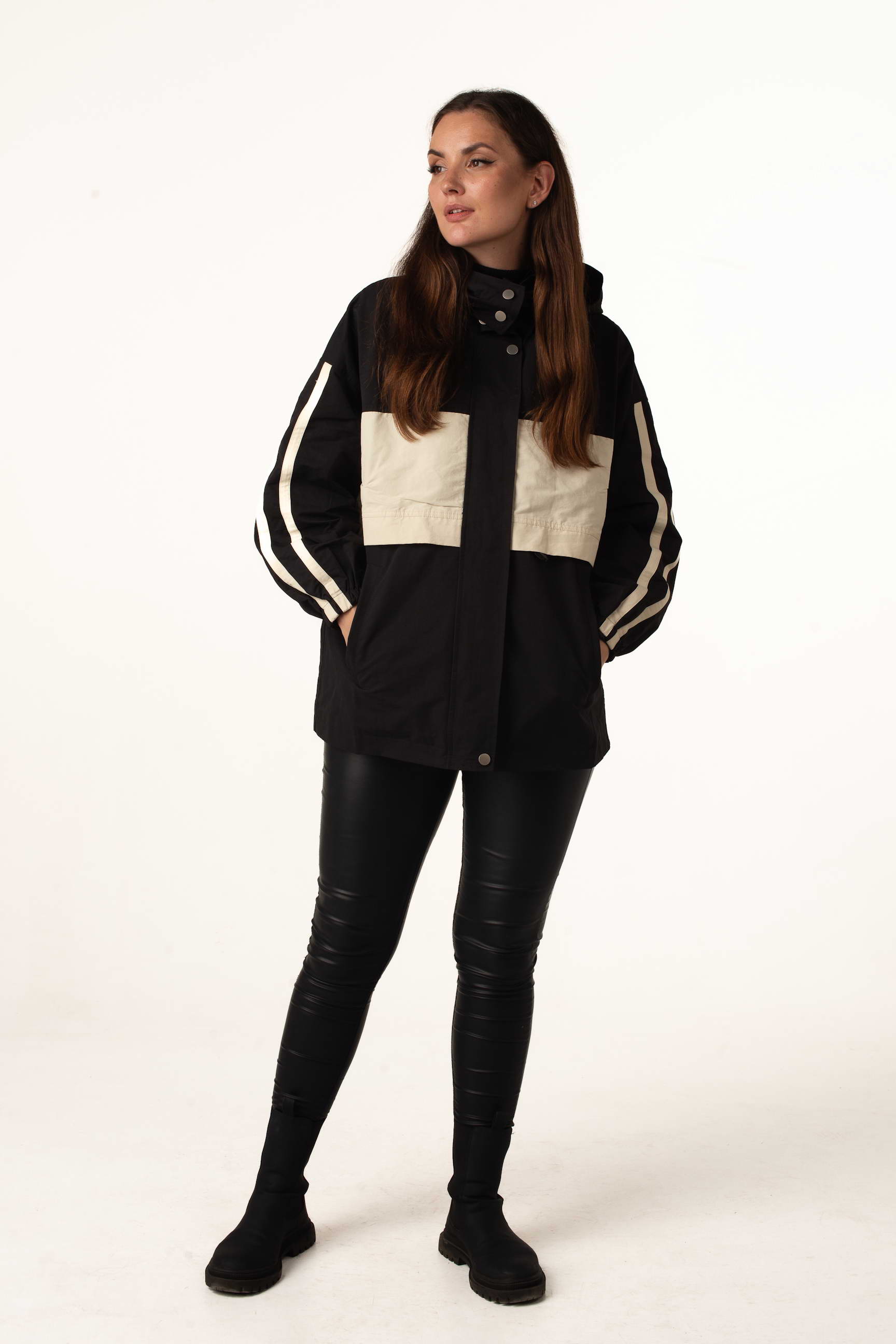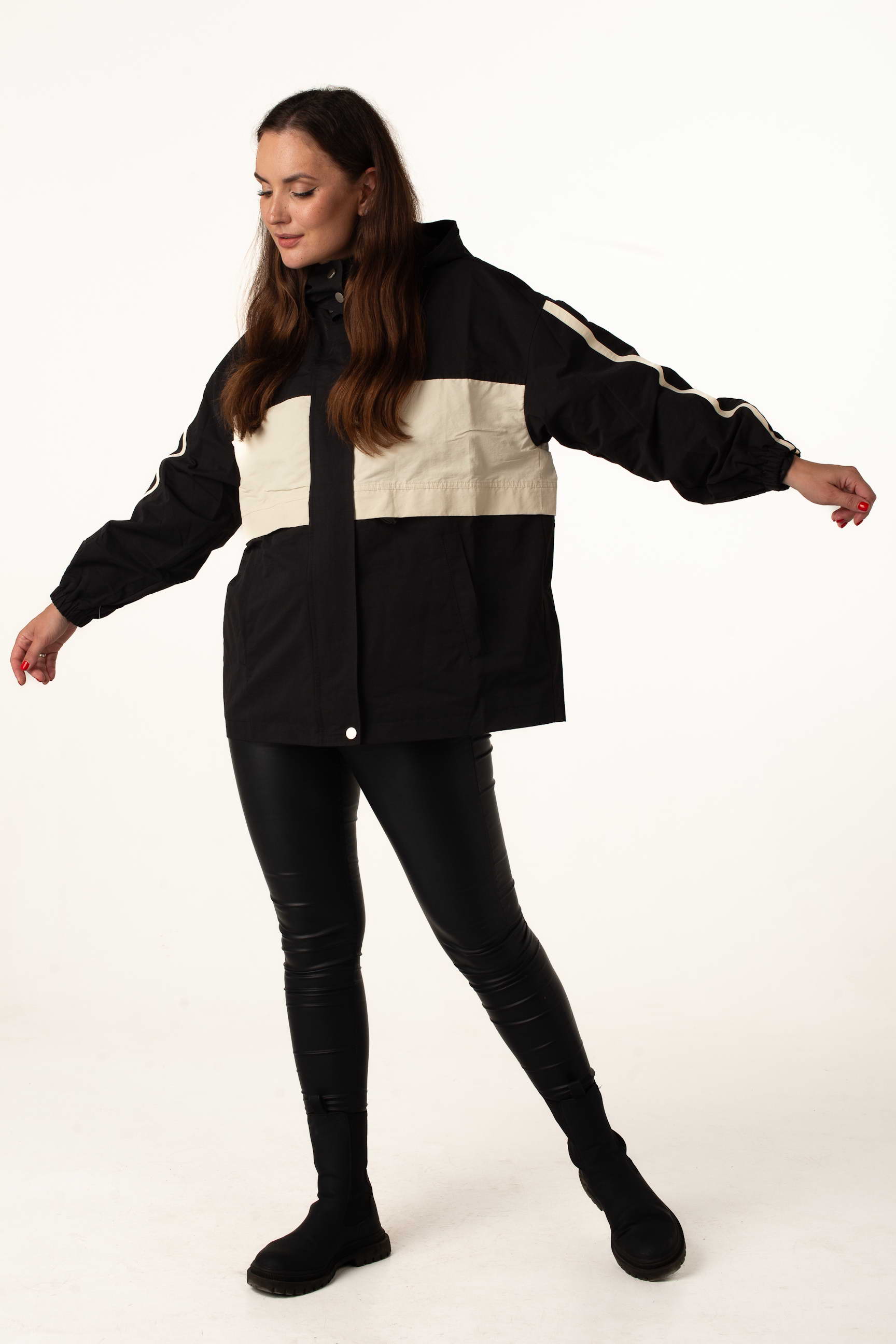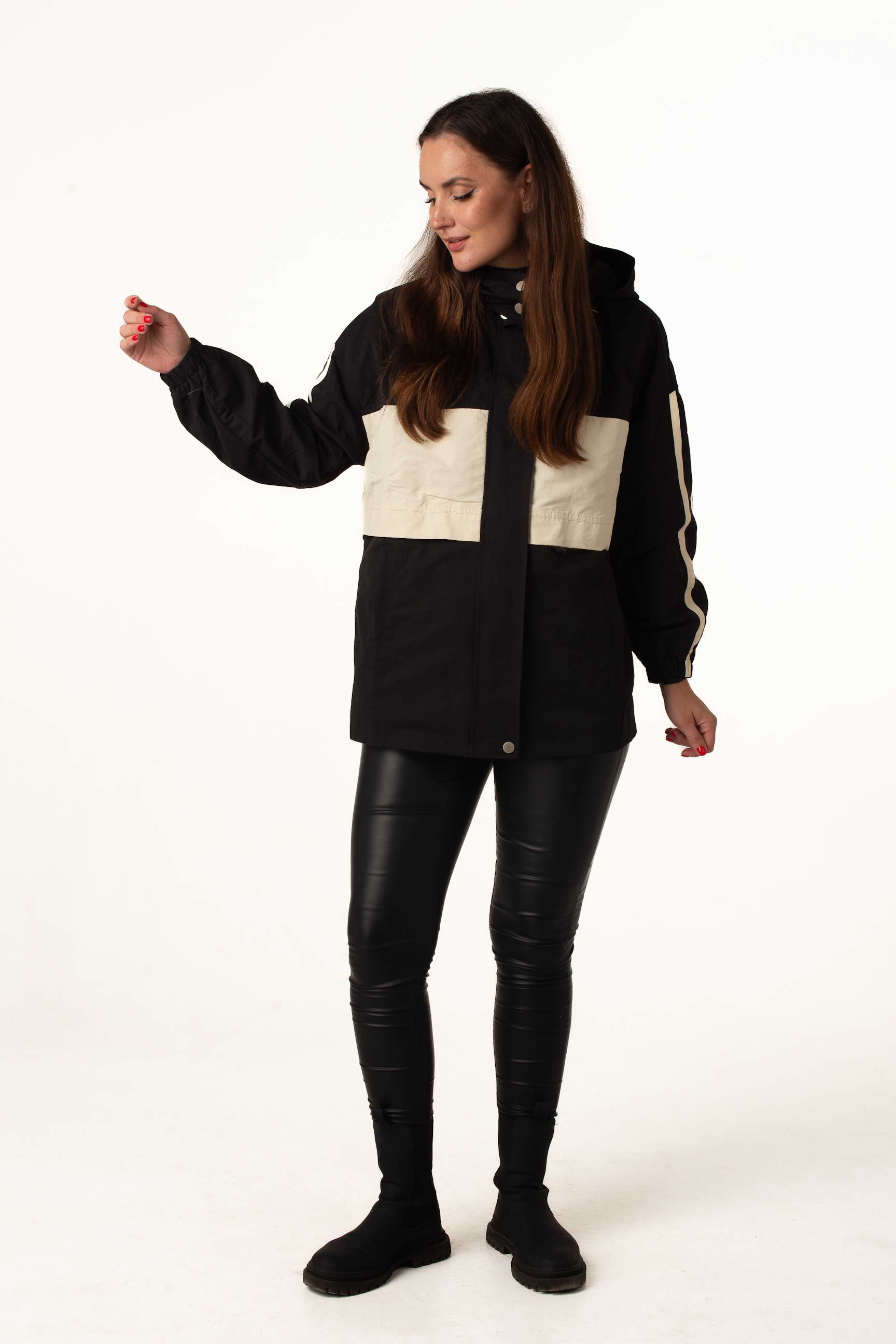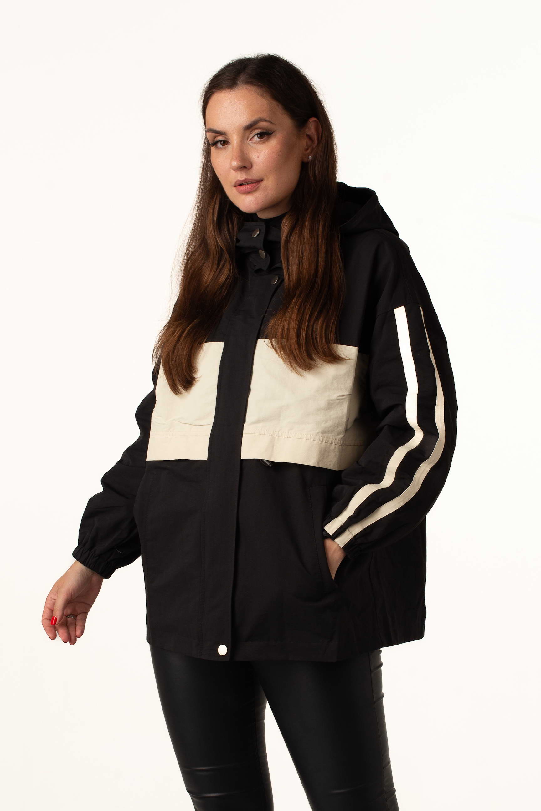 Жіноча вітровка для теплої весни та осені у трендовому чорно-білому кольорі поєднує стильний дизайн із практичністю. Комір-стійка з капюшоном захищає від вітру, а куліска по талії дозволяє регулювати посадку та створювати жіночний силует.