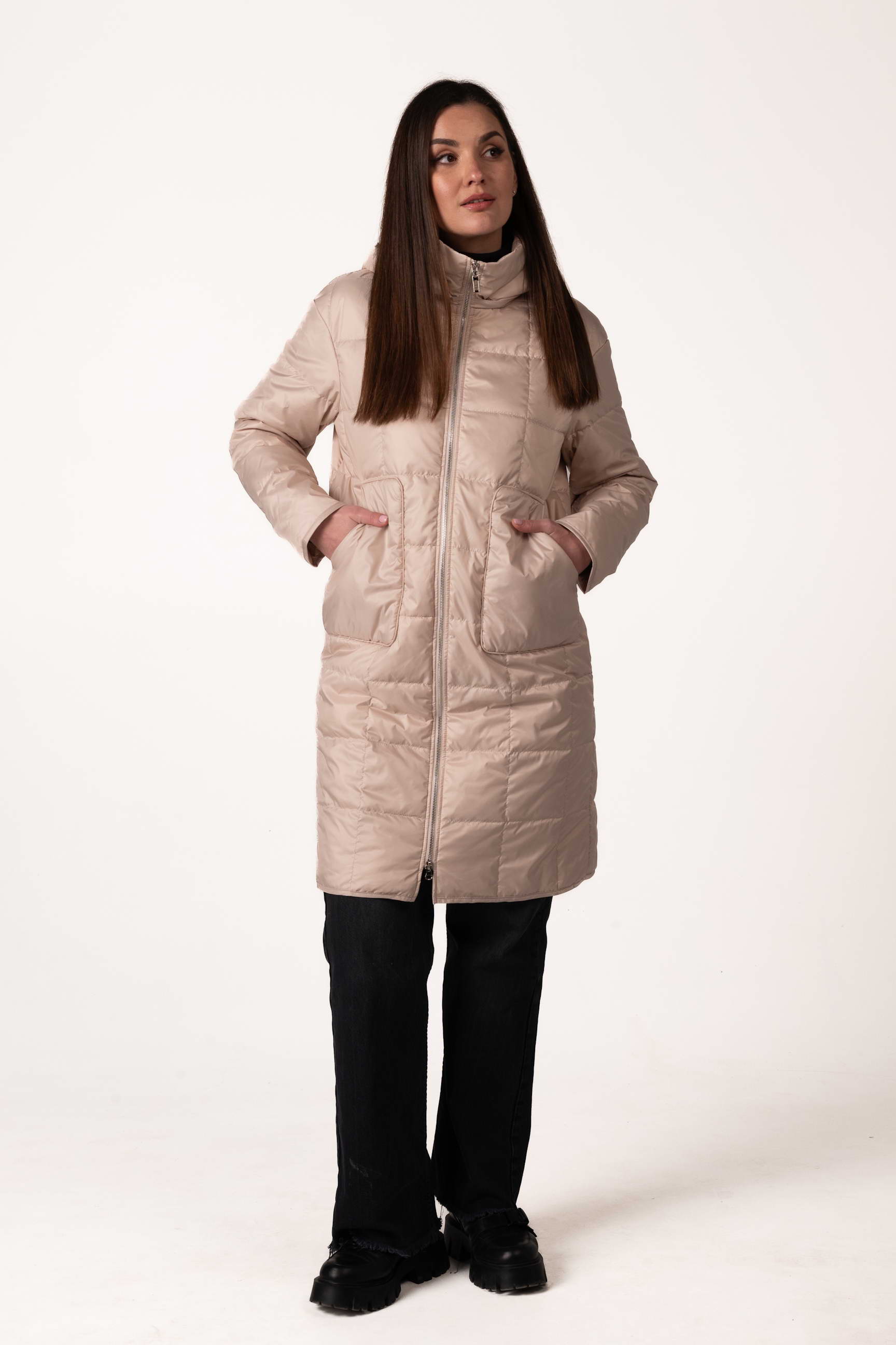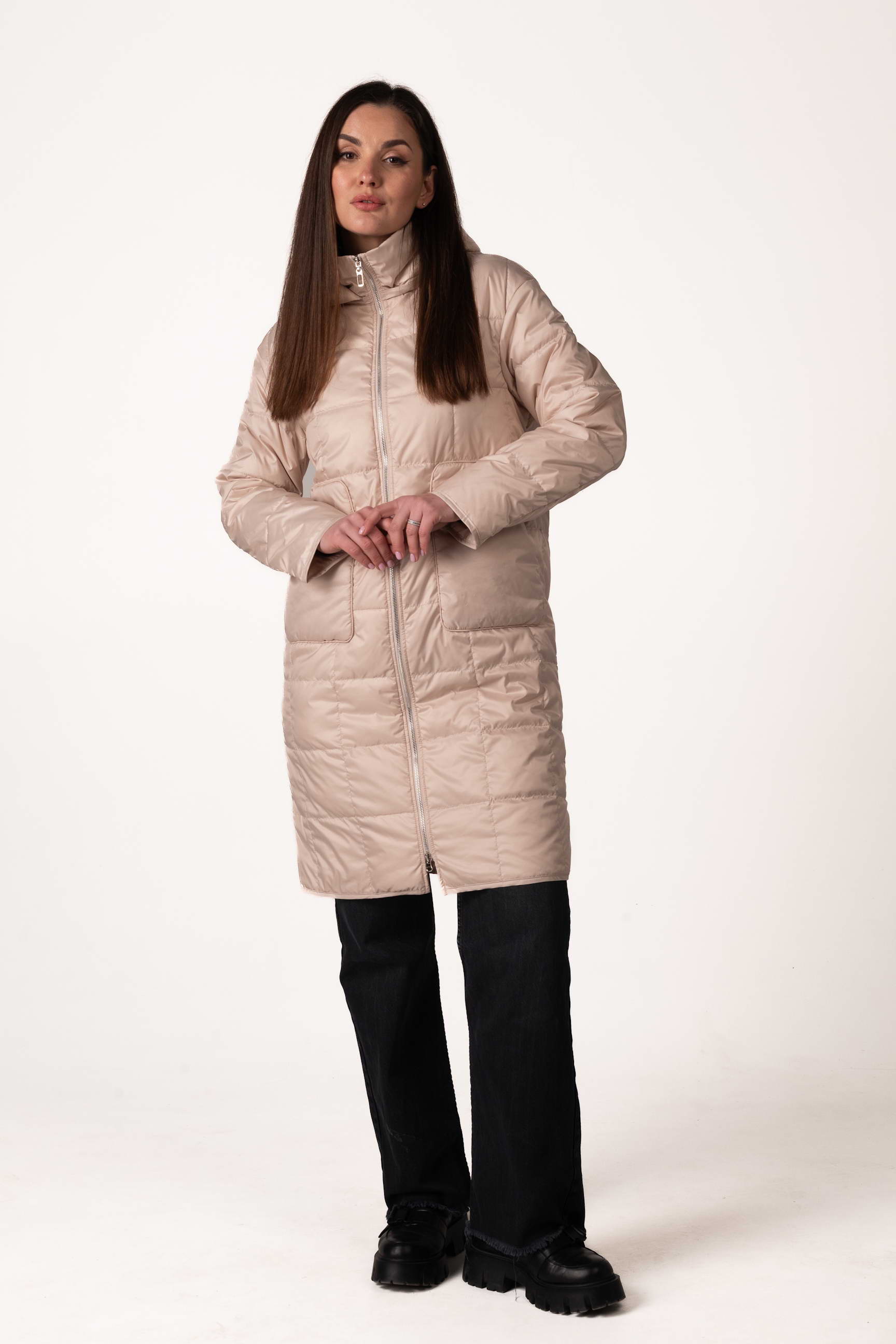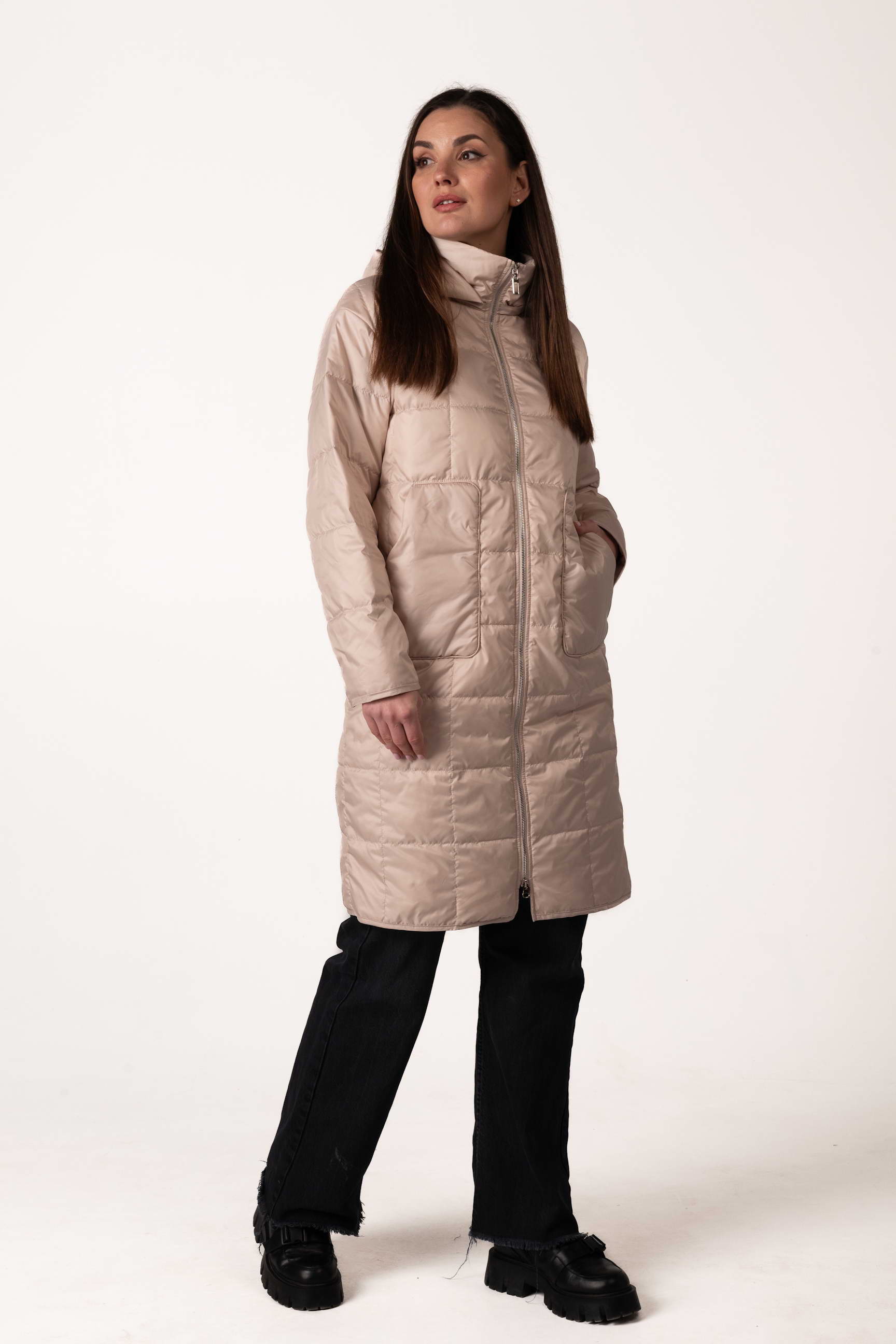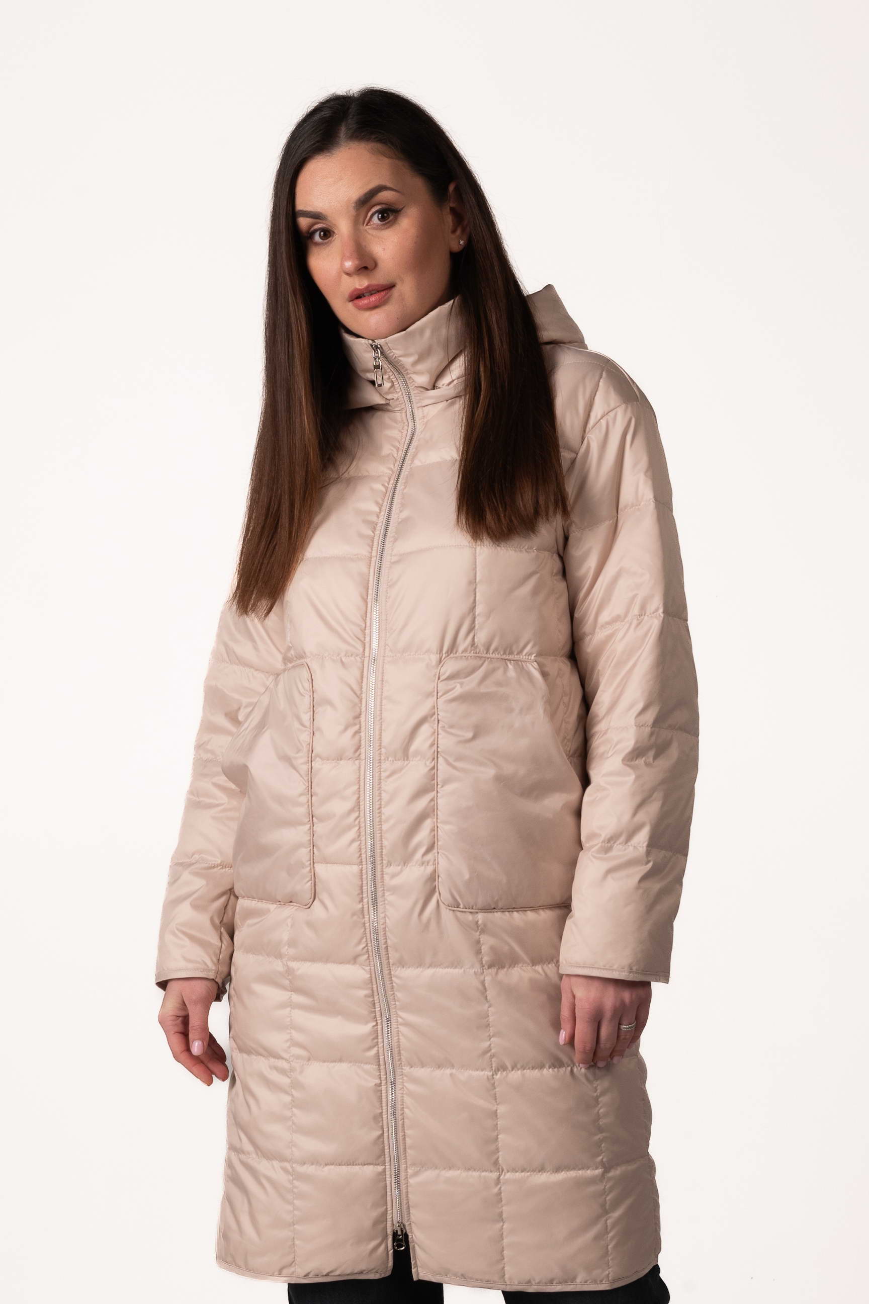 Оригінальна комбінована прострочка — горизонтальна по переду та у вигляді квадратів по спинці — створює стильний візуальний акцент і підкреслює сучасний характер моделі. Довжина 100 см робить куртку максимально комфортною для прохолодної погоди та міських прогулянок.