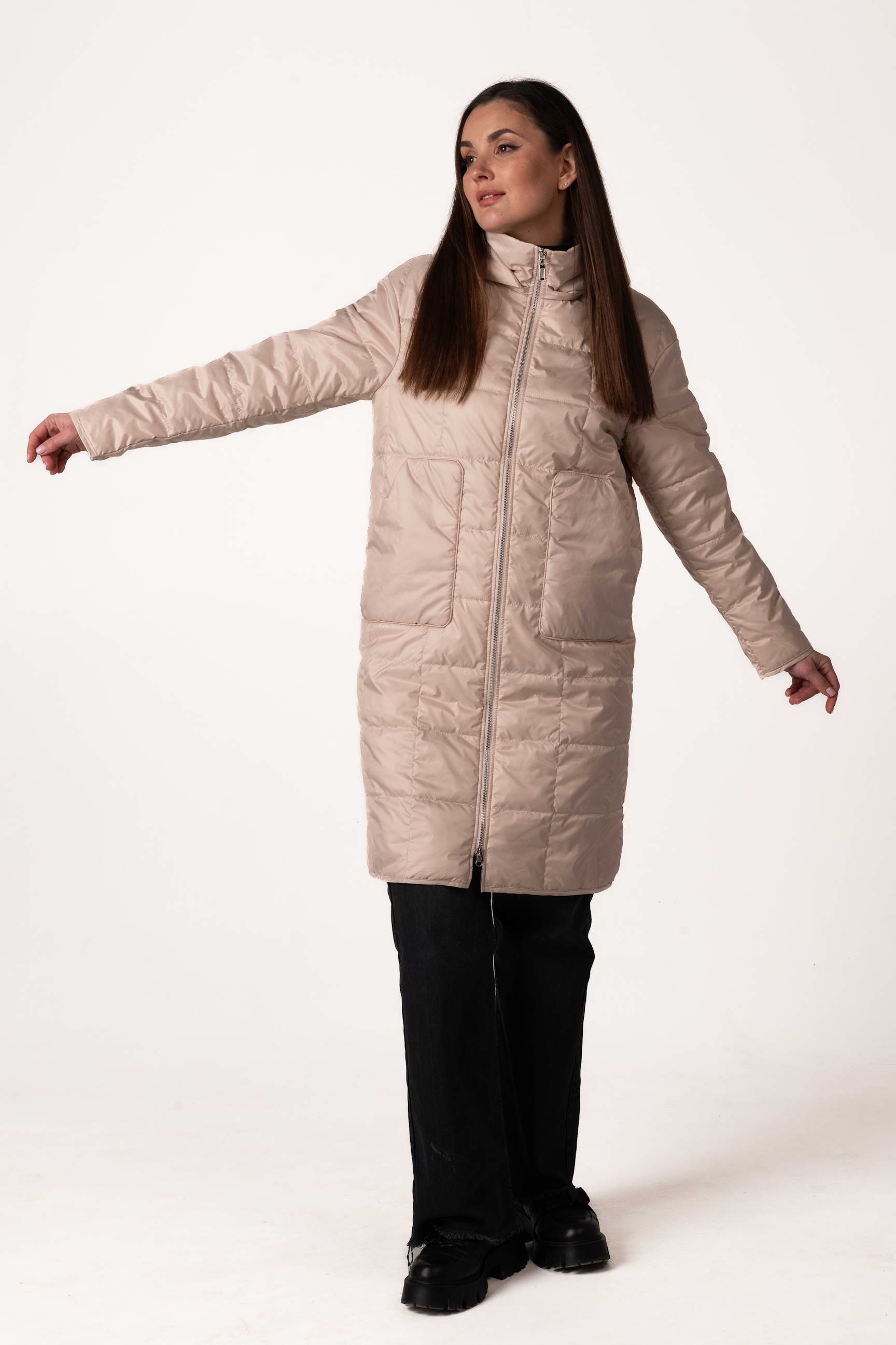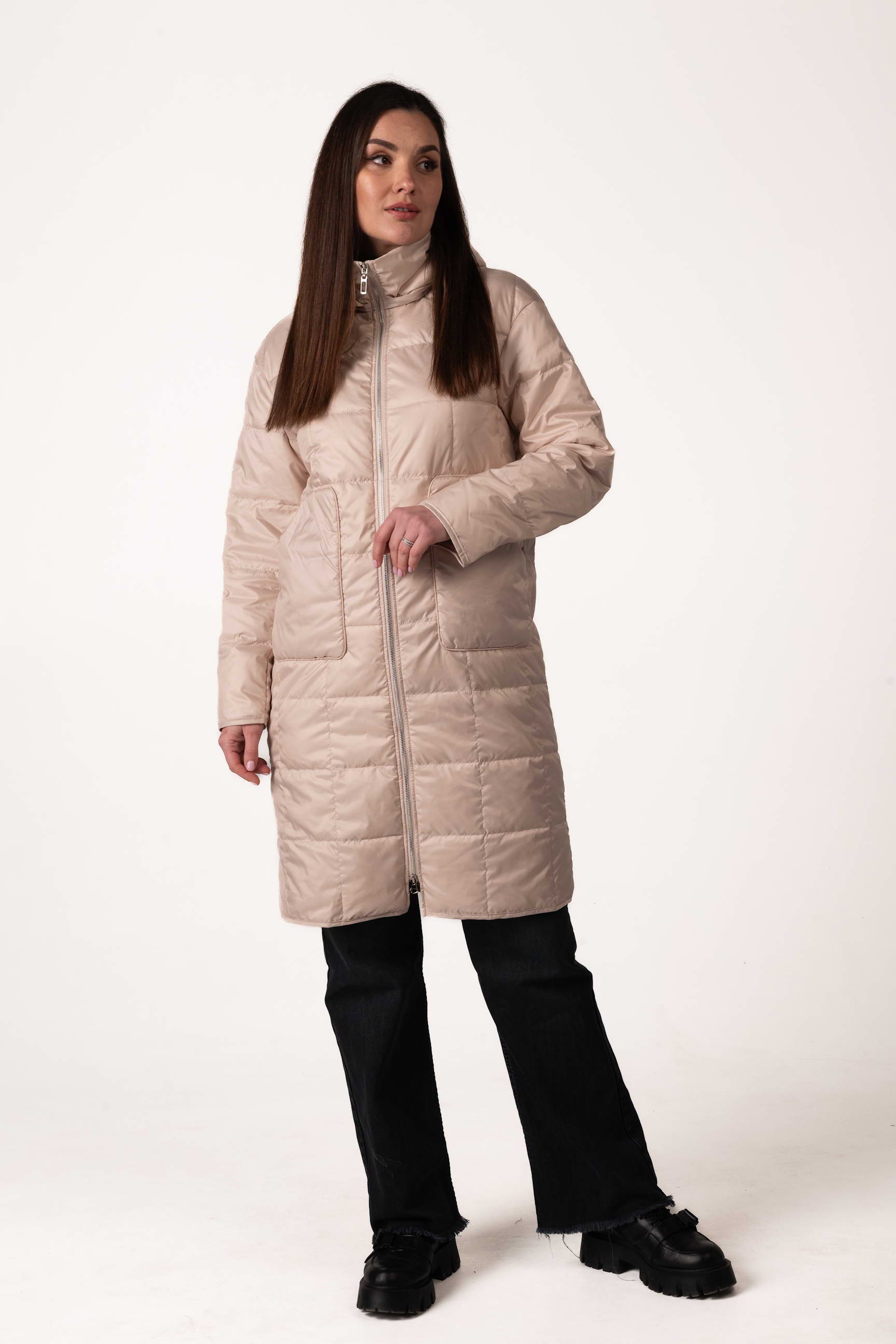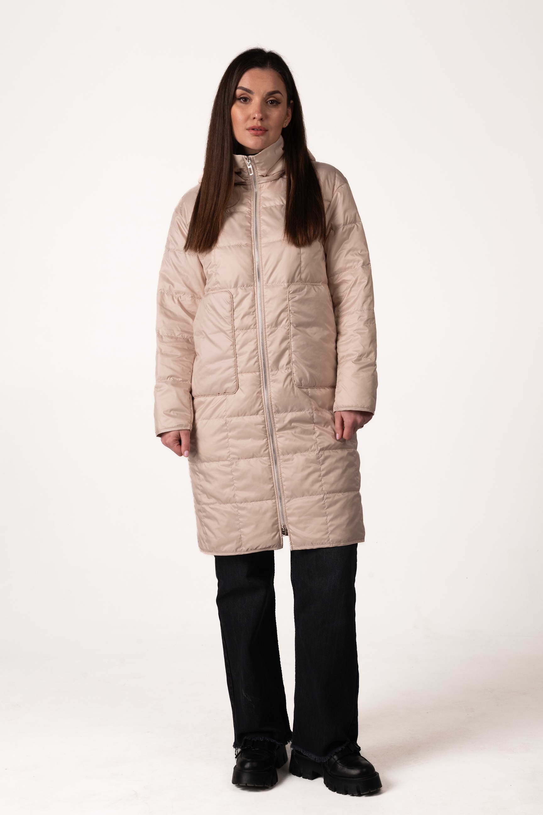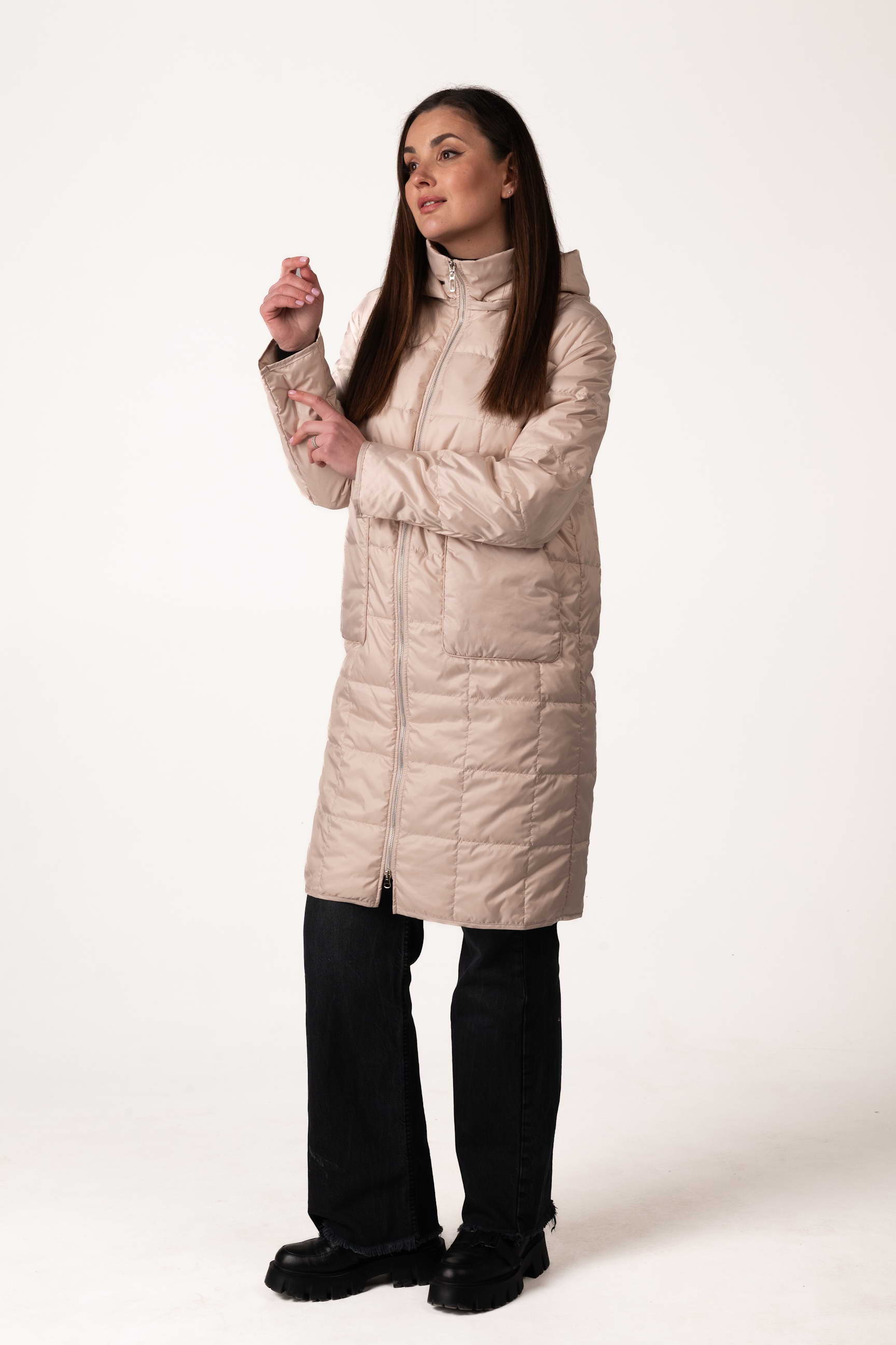 Оригінальна комбінована прострочка — горизонтальна по переду та у вигляді квадратів по спинці — створює стильний візуальний акцент і підкреслює сучасний характер моделі. Довжина 100 см робить куртку максимально комфортною для прохолодної погоди та міських прогулянок.