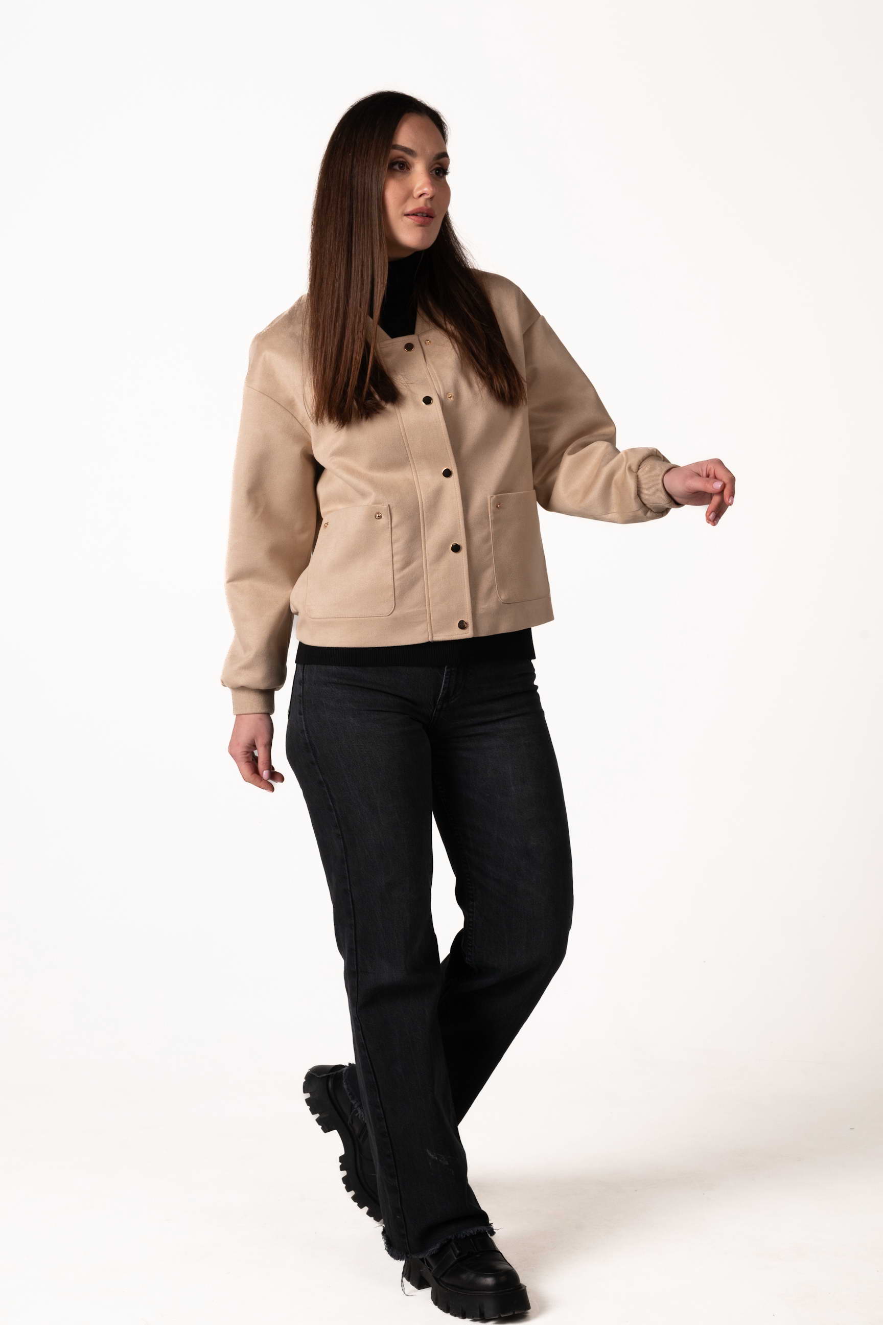 Переваги моделі: - екозамша — м’яка, приємна на дотик і зносостійка - прямий крій — універсальна та комфортна посадка - бежевий колір — стильна класика - комір-стійка та трикотажні манжети — комфорт і захист - застібка на кнопках — зручно та практично - накладні кишені — функціональність - довжина 60 см — оптимальна для теплої весни та осені