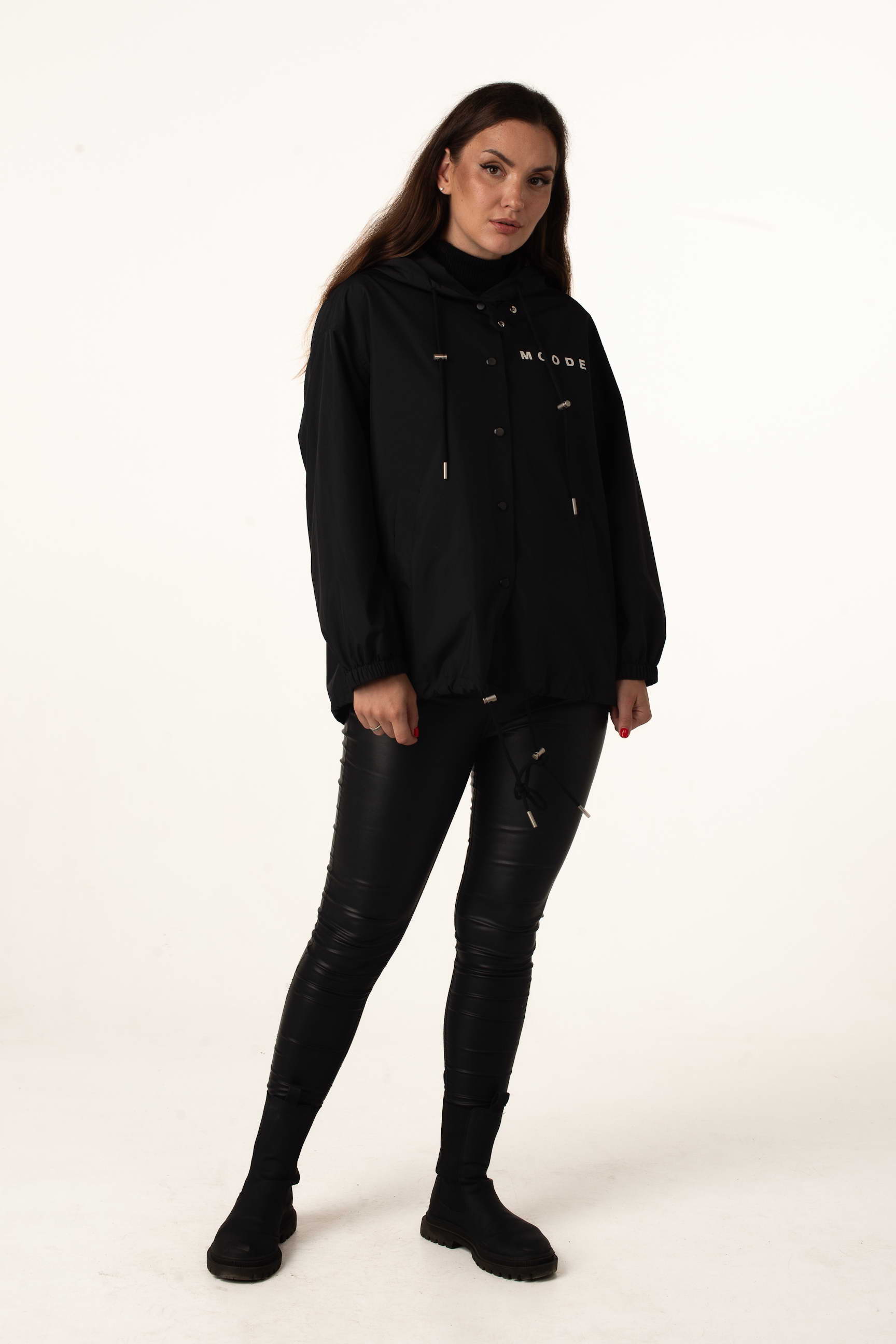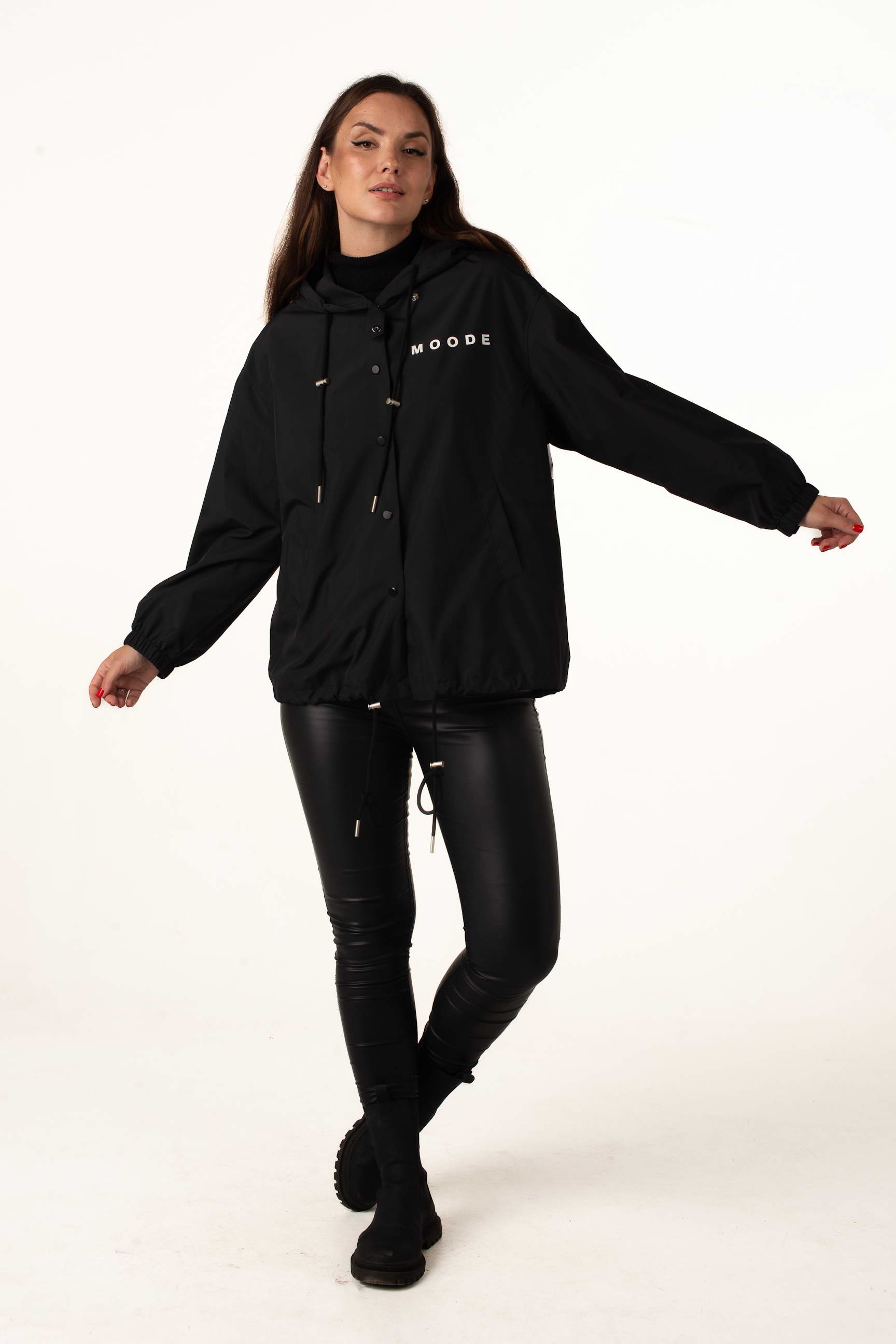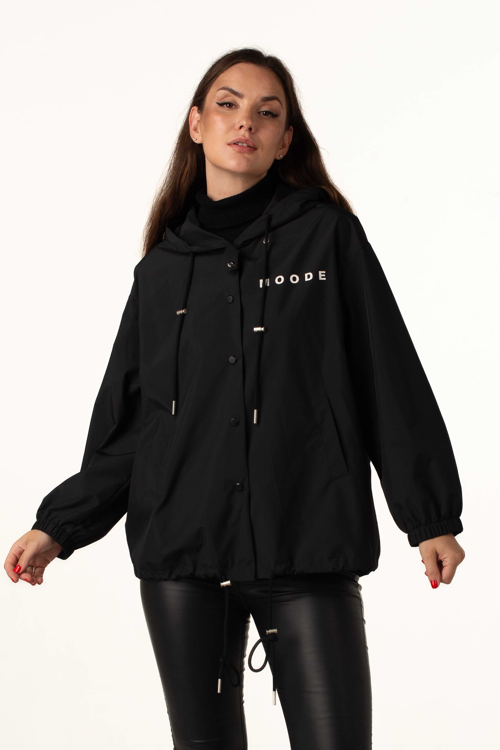 Чорна жіноча легка вітровка ідеальна для теплої весни та осені. Модель поєднує стильний дизайн, практичність і комфорт, а капюшон і куліска по низу забезпечують захист від вітру. Написи на грудях і спині додають сучасного і модного вигляду.