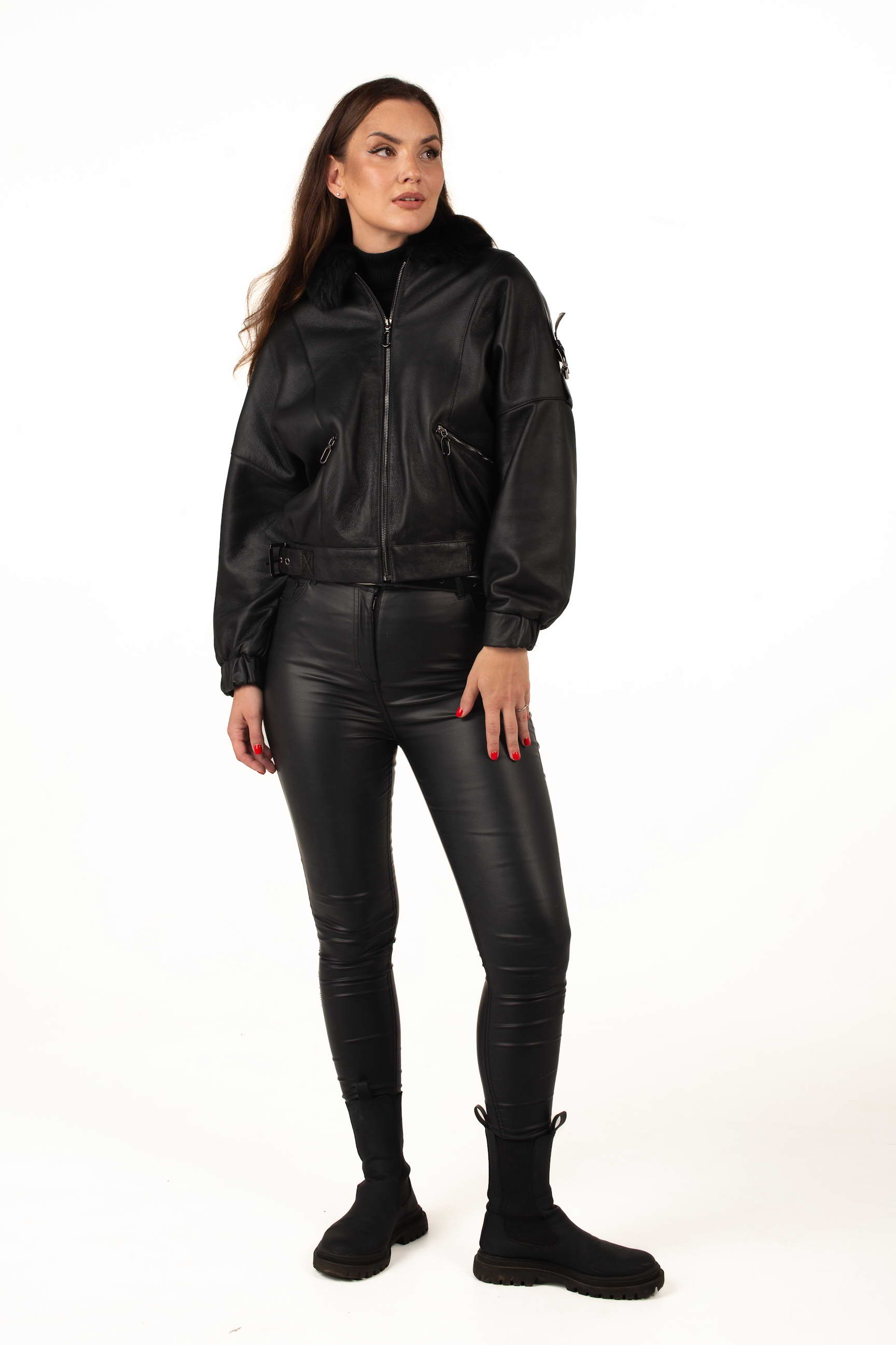 Жіночий бомбер з овчини чорного кольору поєднує стиль, тепло та функціональність, забезпечуючи комфорт і практичність у холодну пору року.