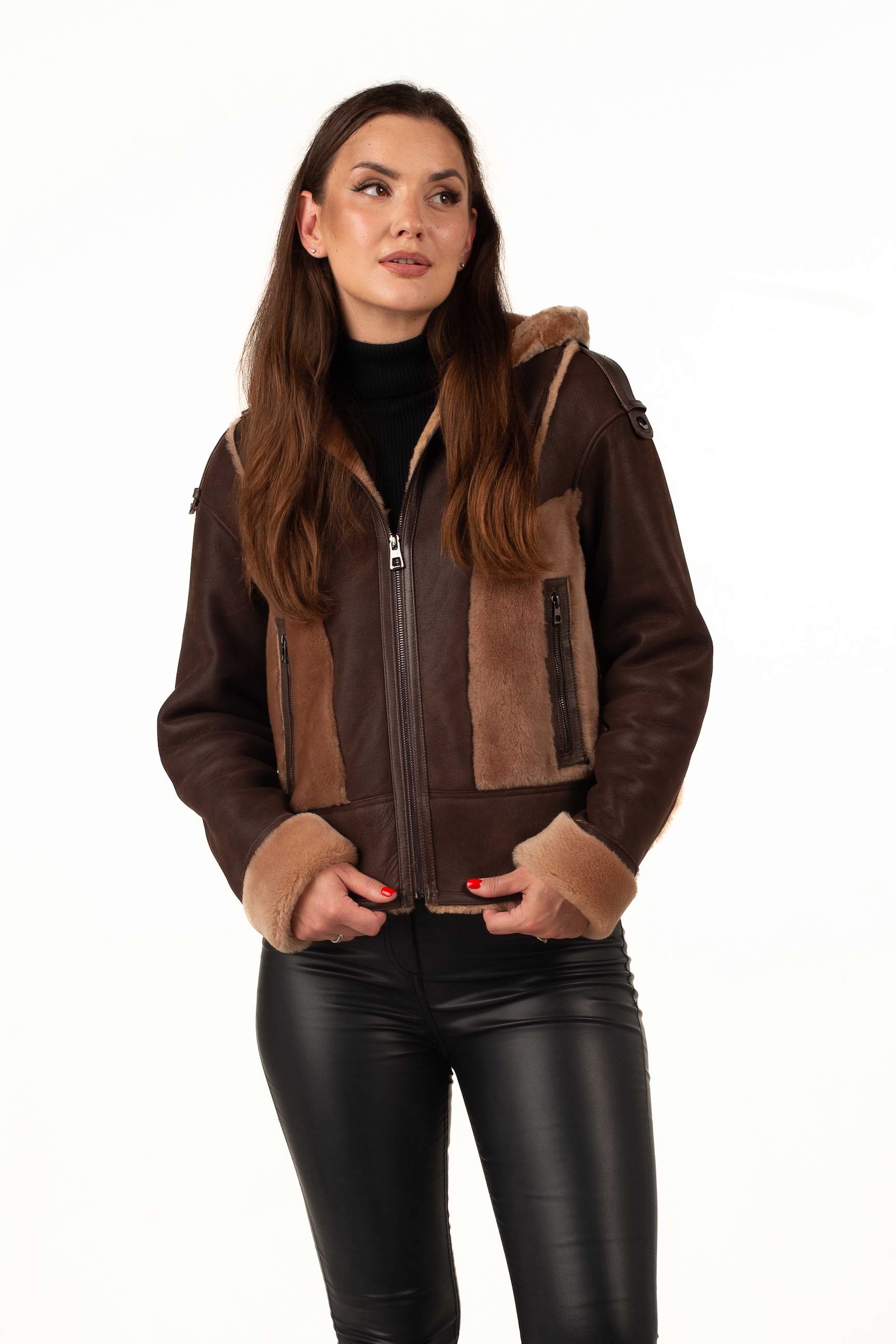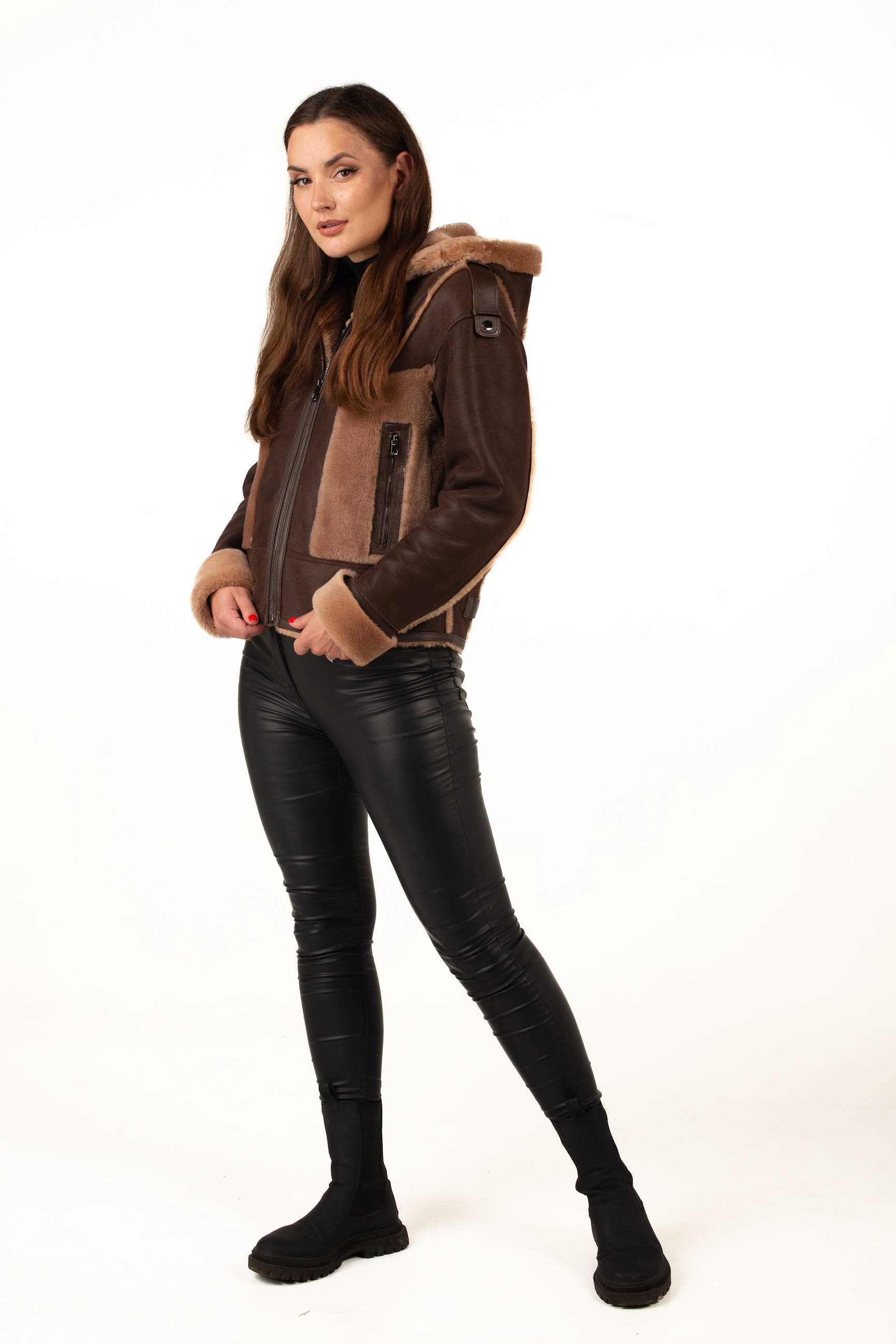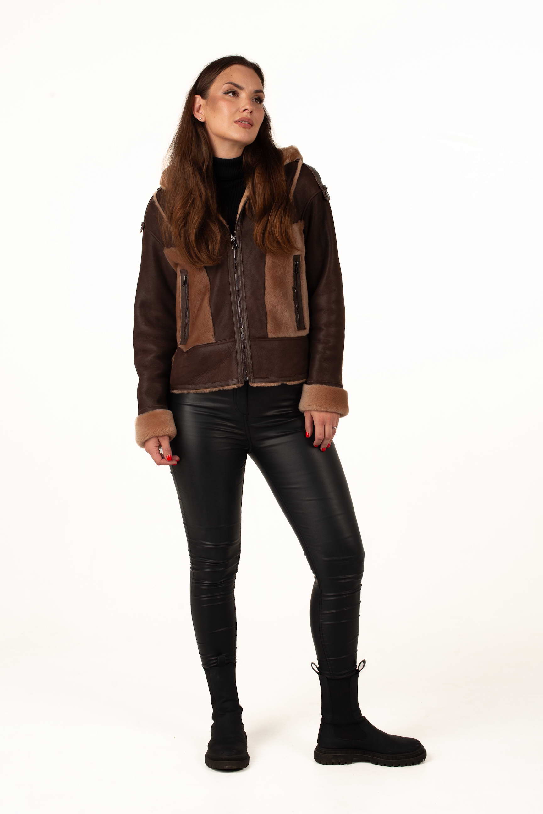 Коричнева жіноча дублянка з овчини – це поєднання тепла, комфорту та елегантного дизайну. Модель з капюшоном, хутряним декором та вставками з натуральної шкіри створена для стильних зимових образів.