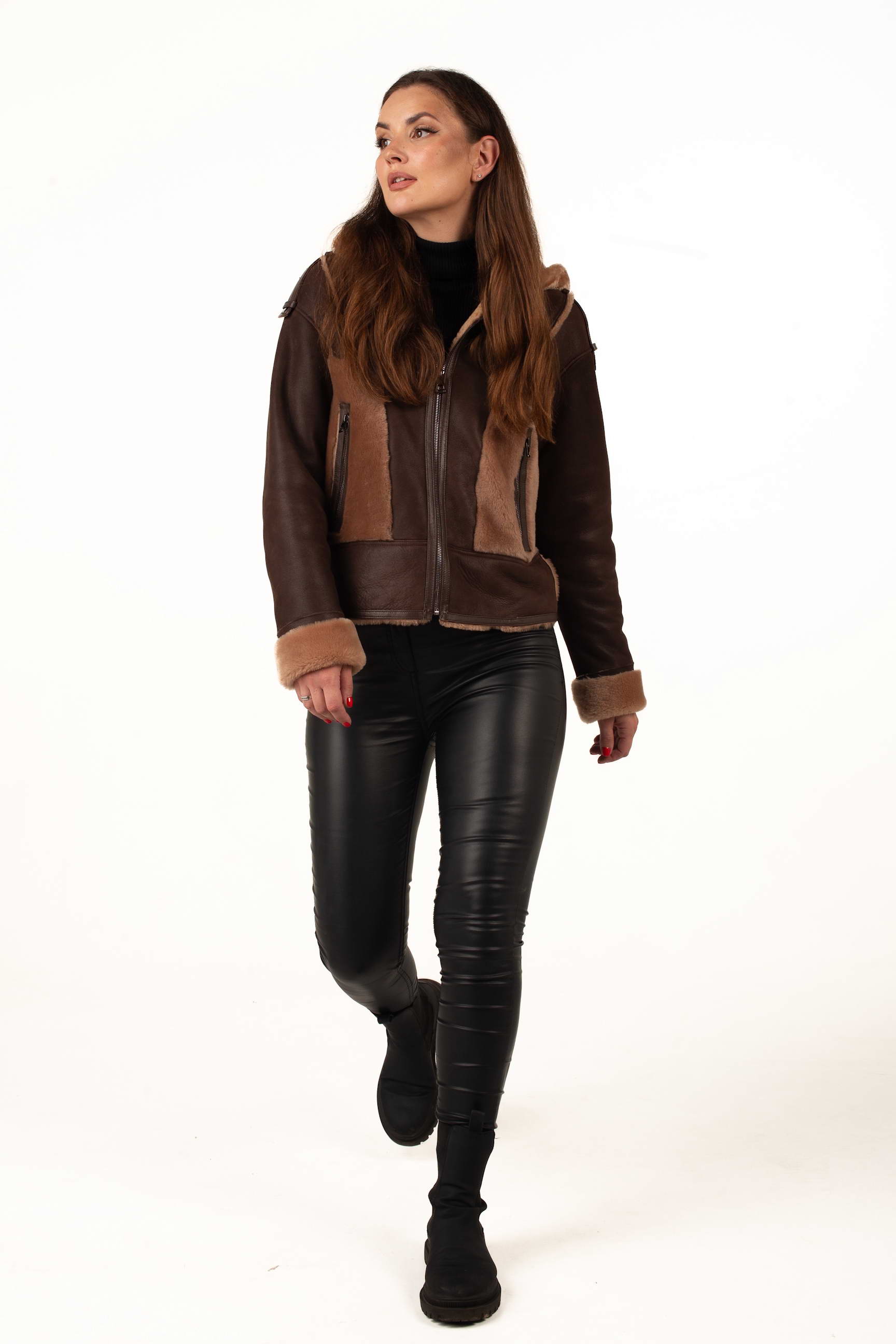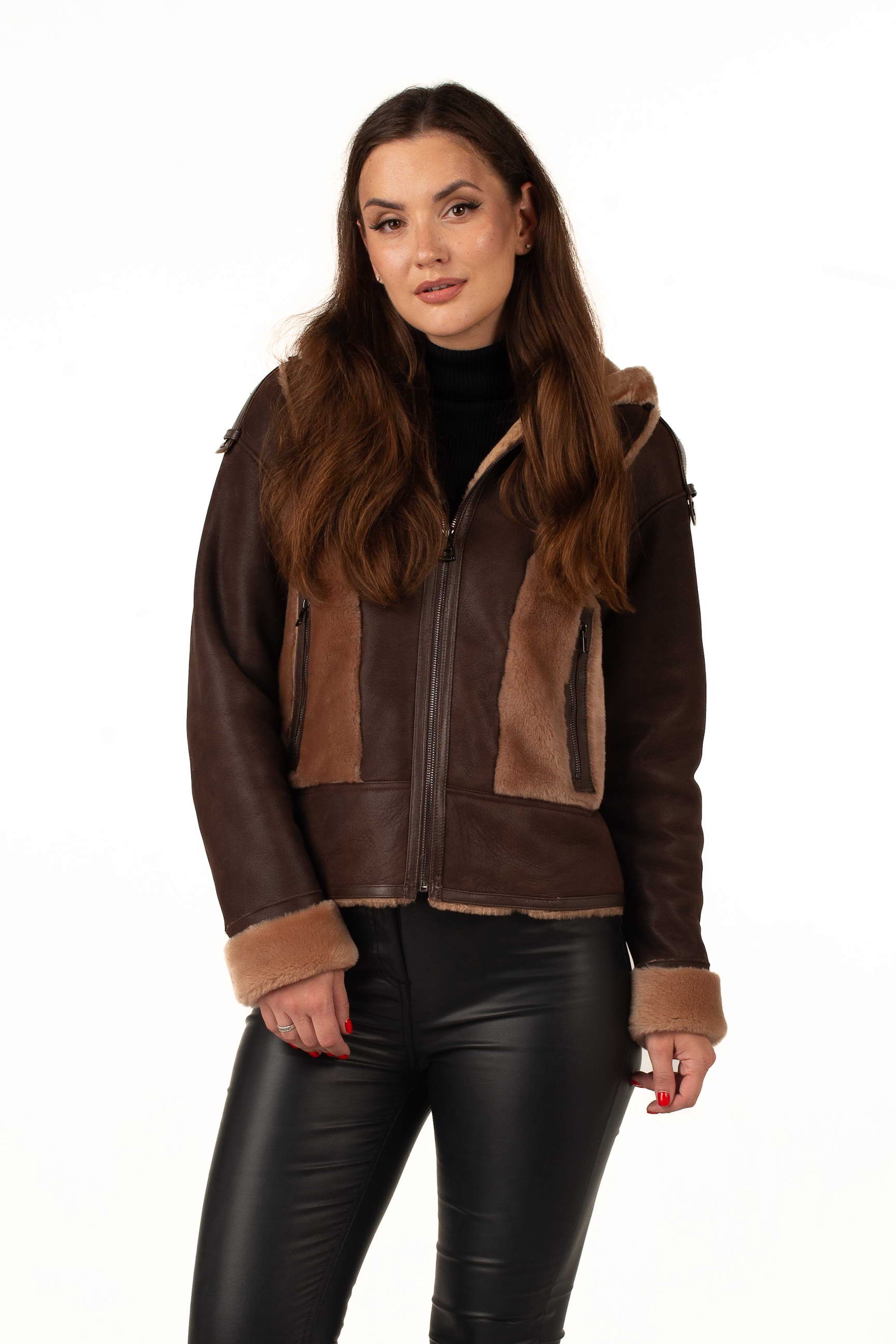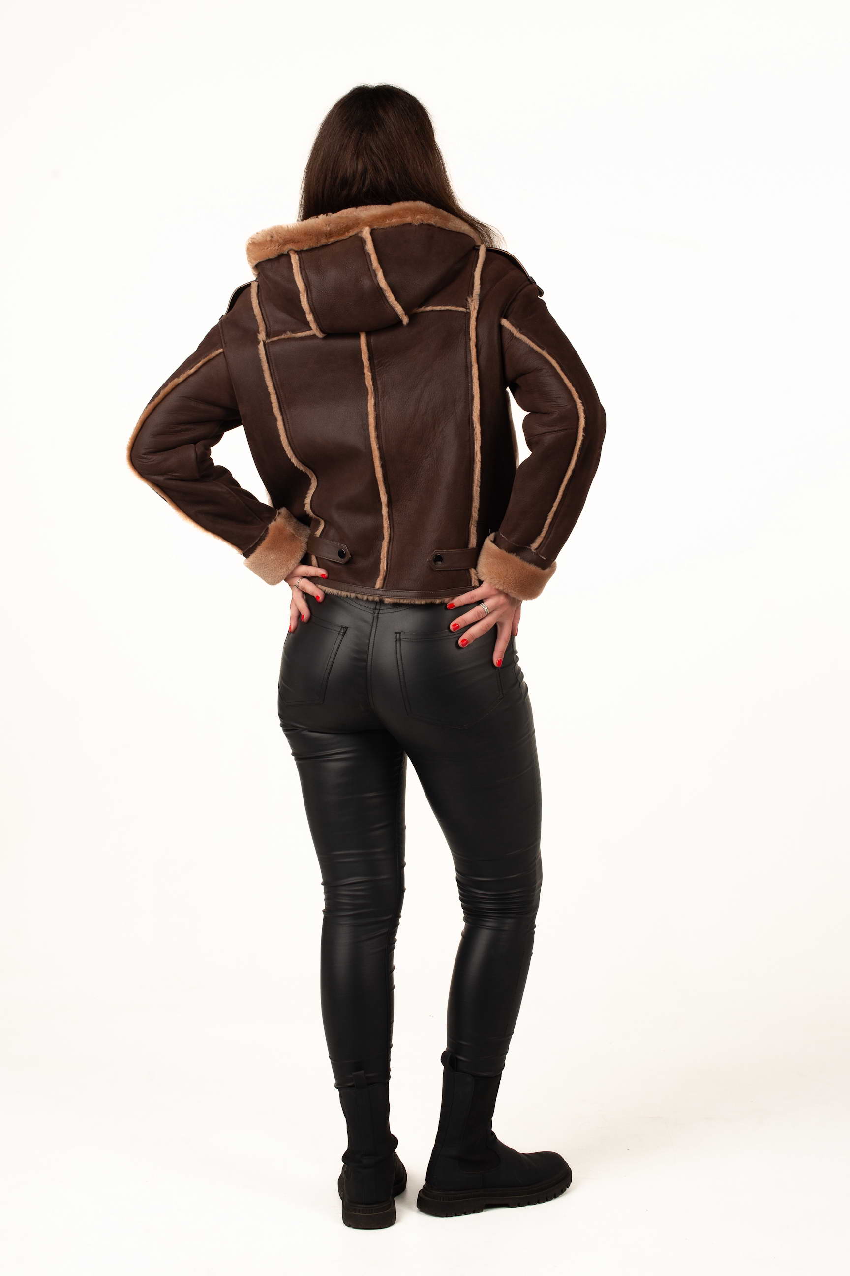 Коричнева жіноча дублянка з овчини – це поєднання тепла, комфорту та елегантного дизайну. Модель з капюшоном, хутряним декором та вставками з натуральної шкіри створена для стильних зимових образів.