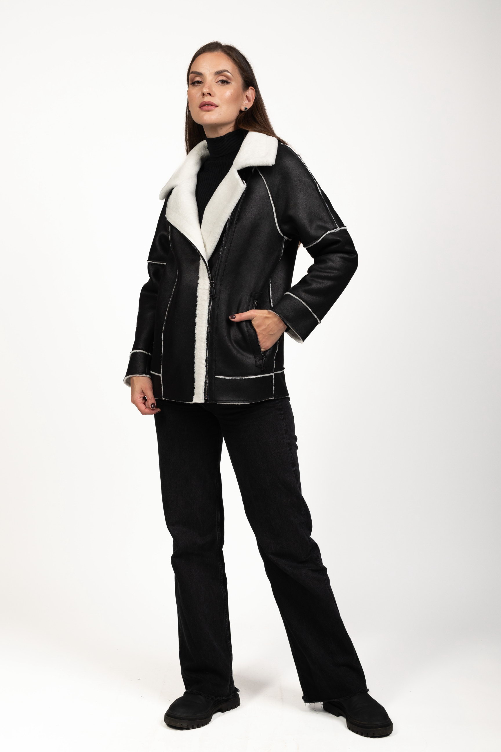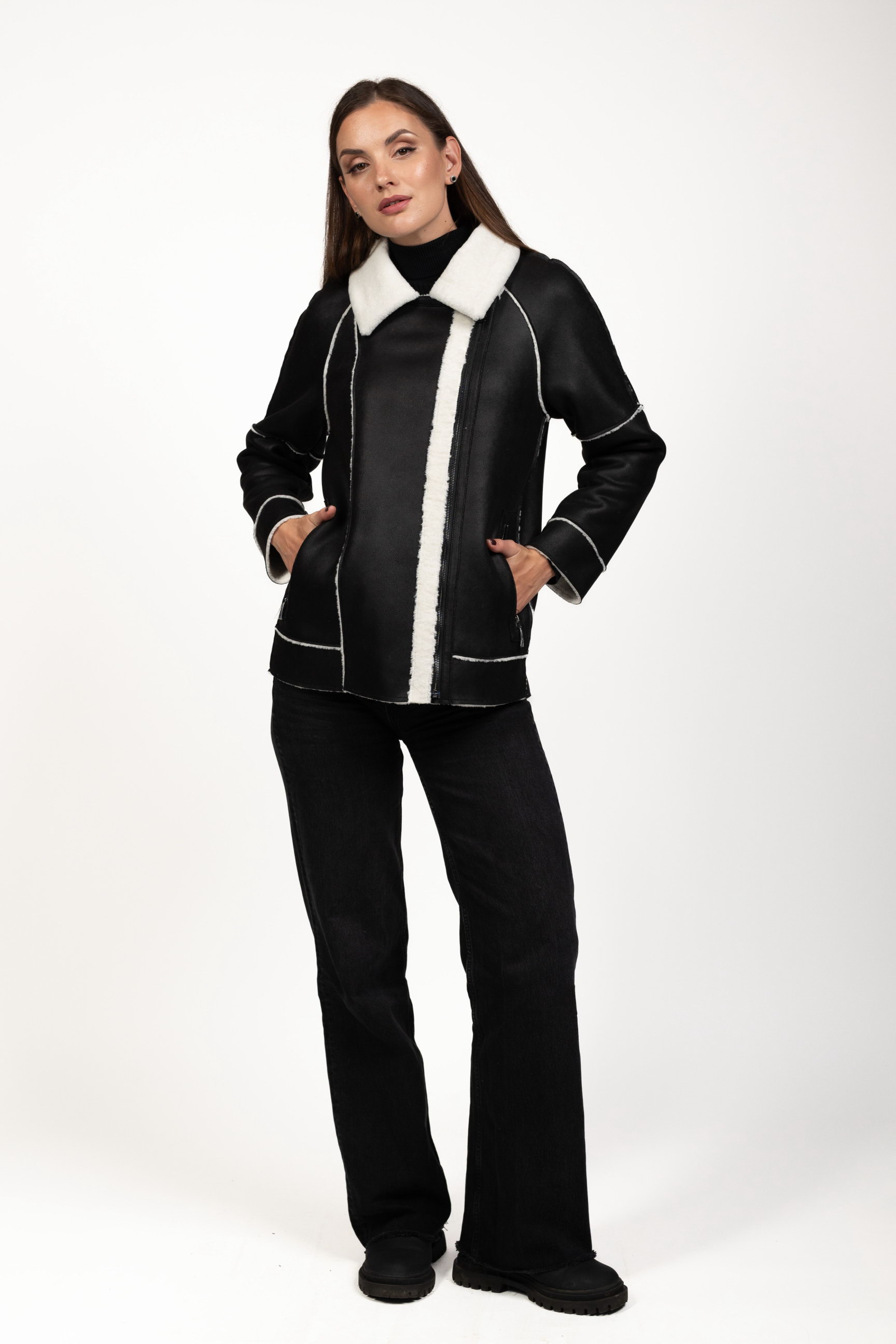 Чорно-білий — ефектне контрастне поєднання, яке привертає увагу та робить образ виразним. Така дублянка стане стильним акцентом зимового гардеробу.