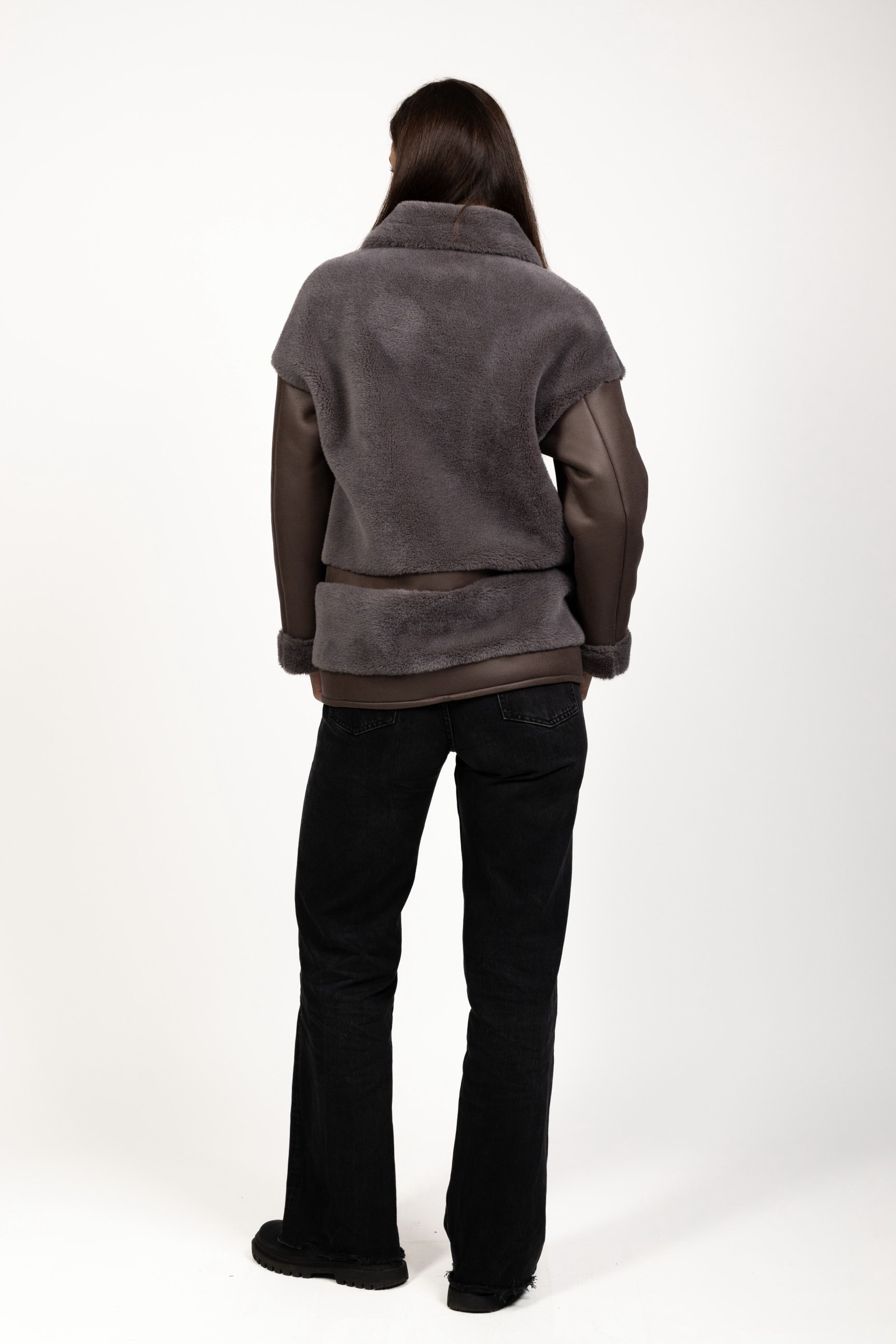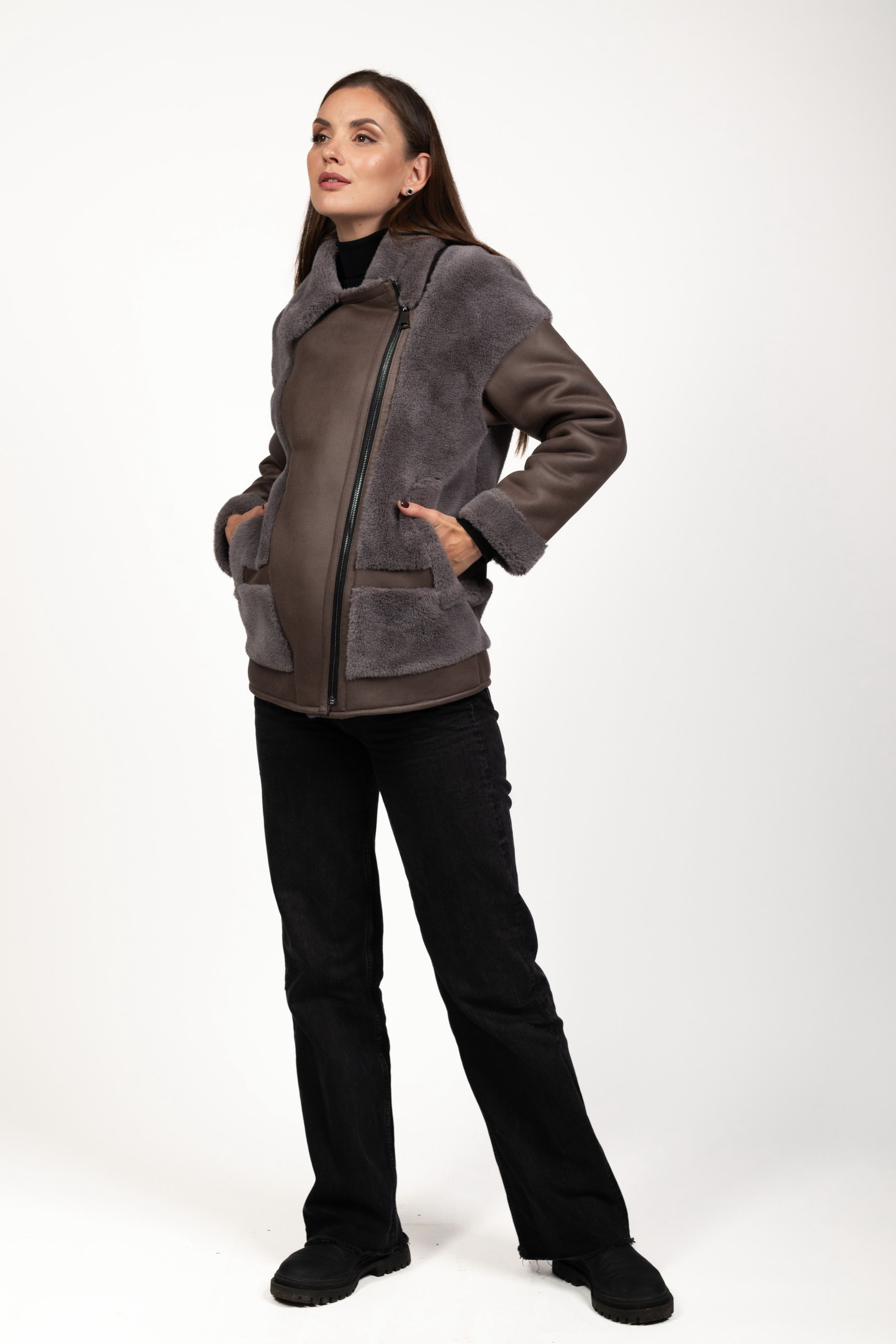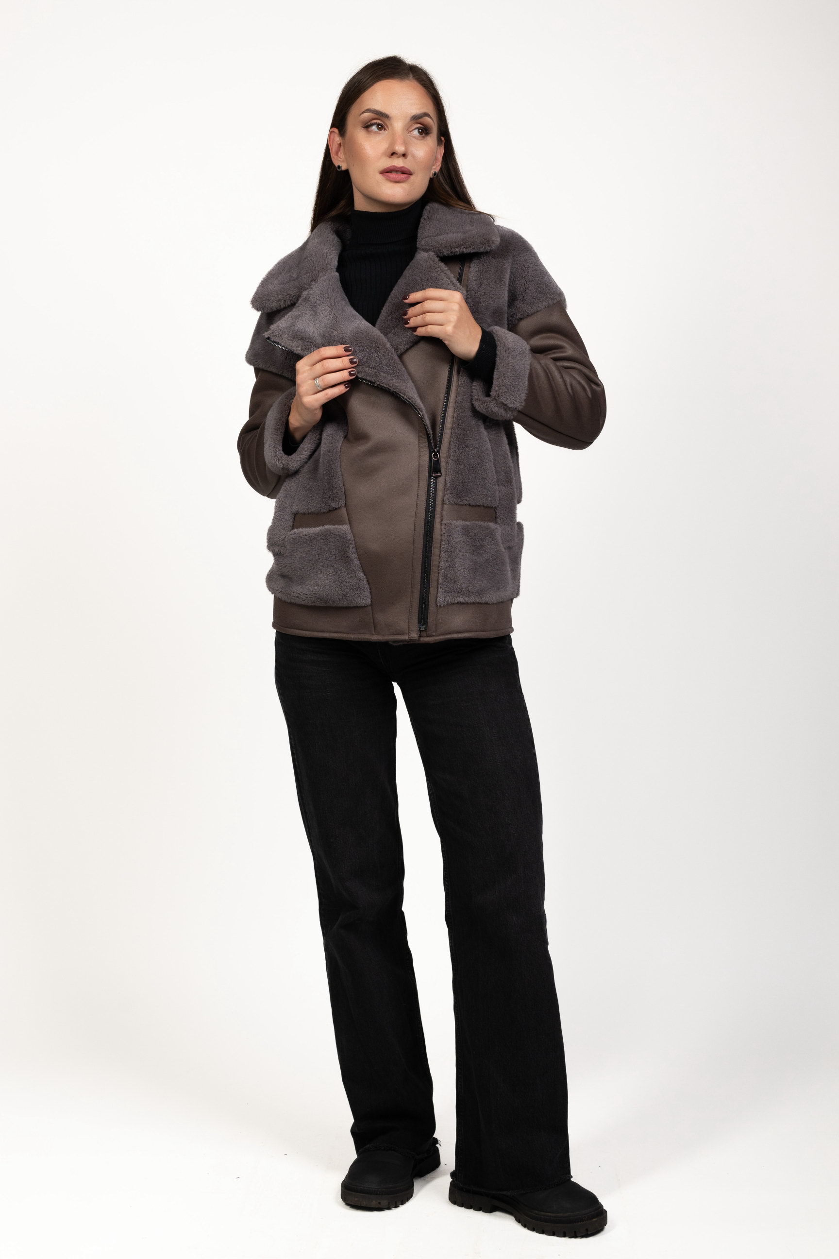Жіноча штучна дублянка темно-коричнева – стильна зимова класика з косою блискавкою
