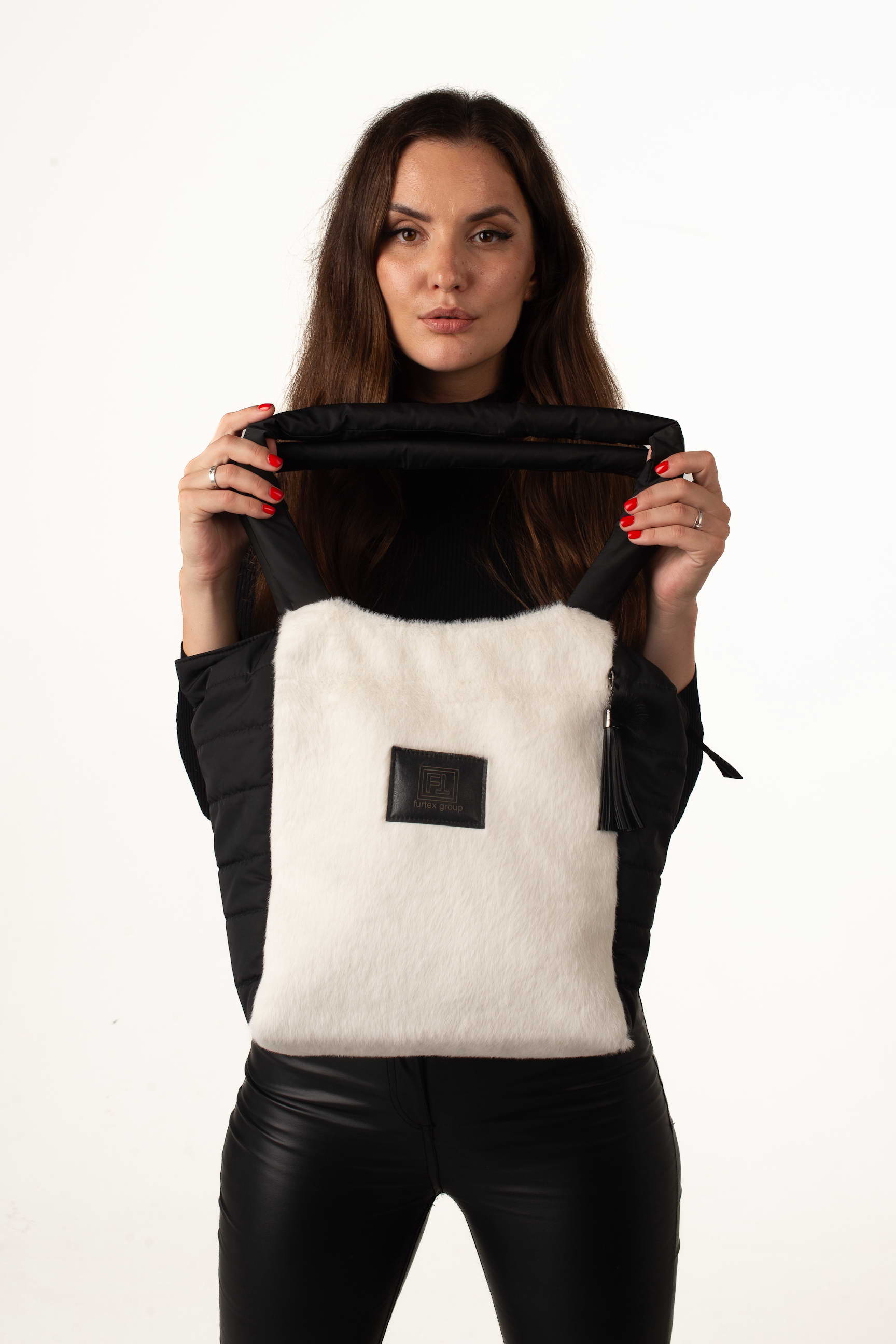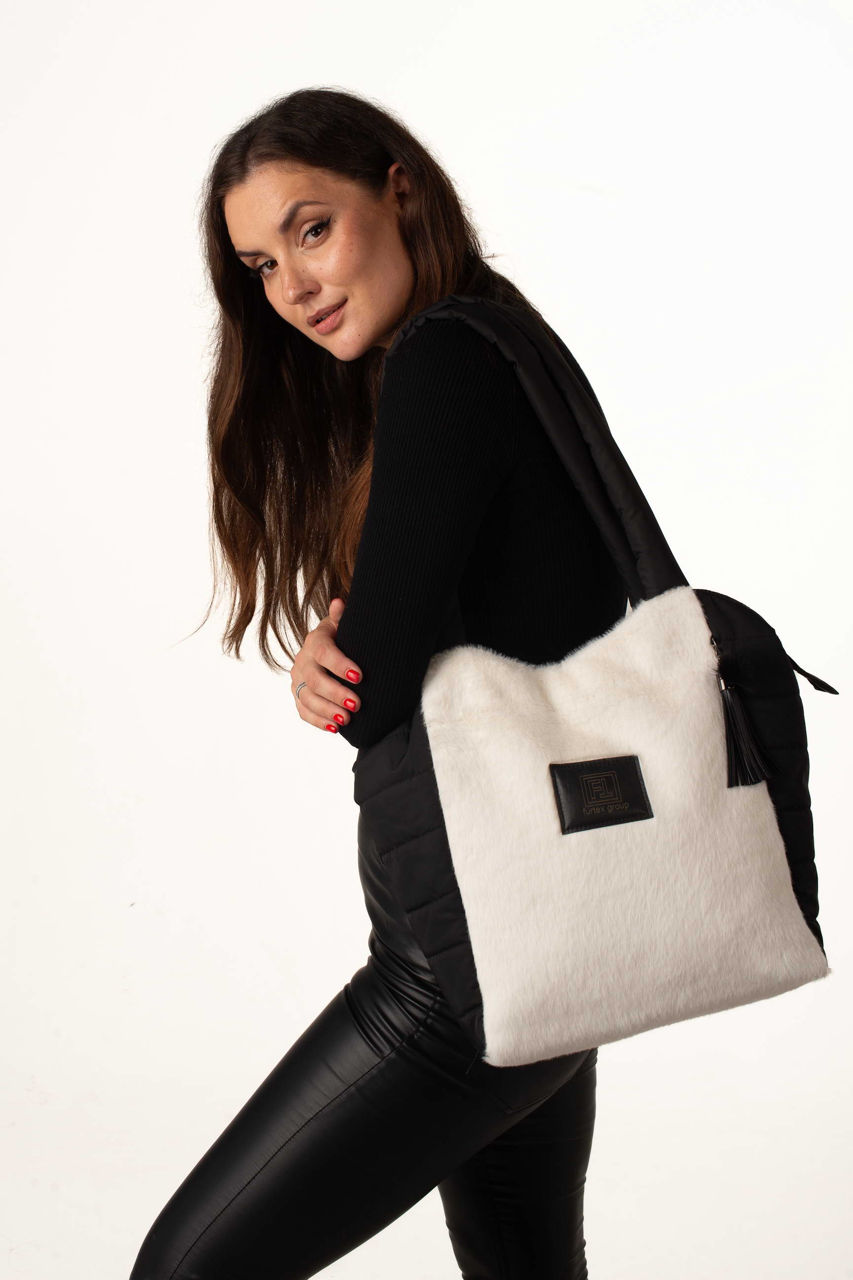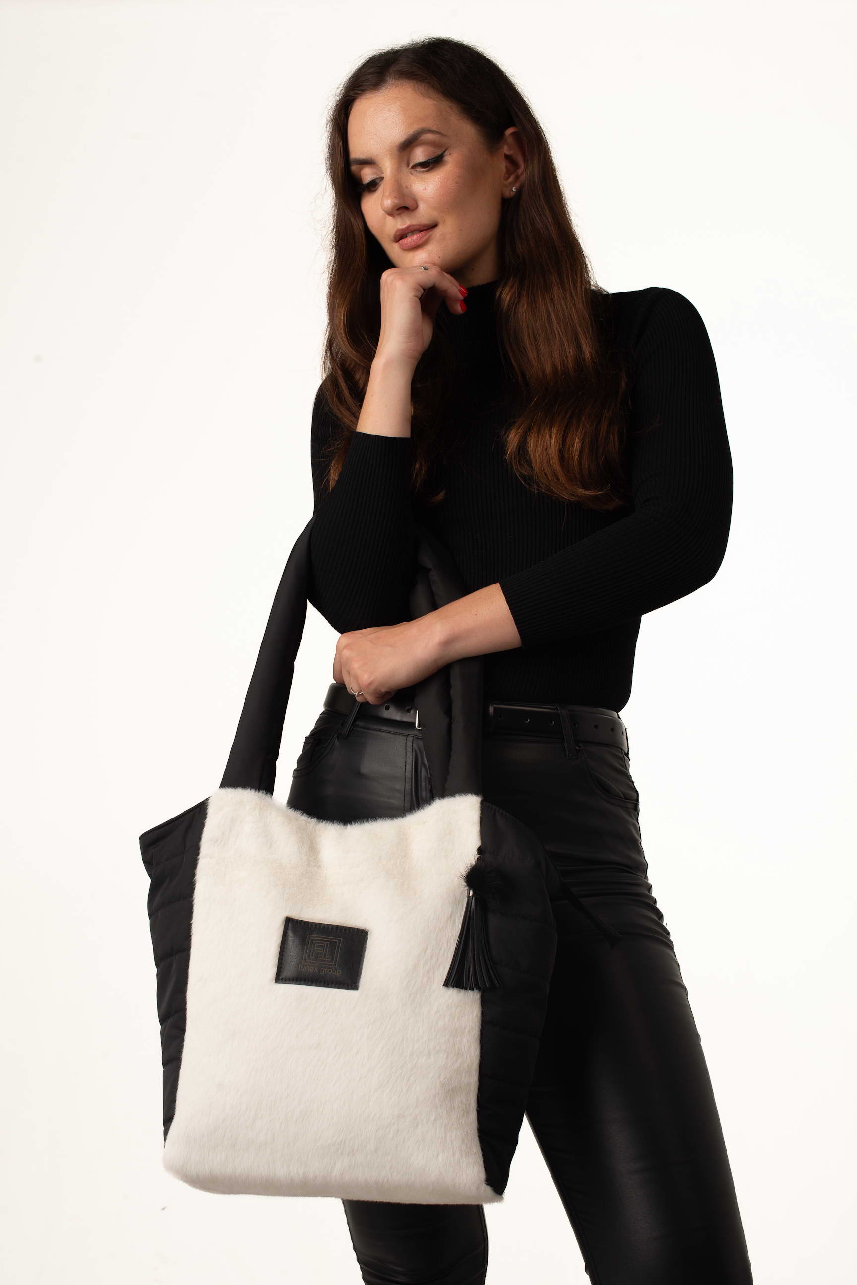 Чорно-біла жіноча сумка-шопер поєднує практичність і сучасний дизайн. Модель виготовлена з плащівки та екохутра, легка і зручна для щоденного використання. Невеликий декор у вигляді брелока додає образу стильного акценту.