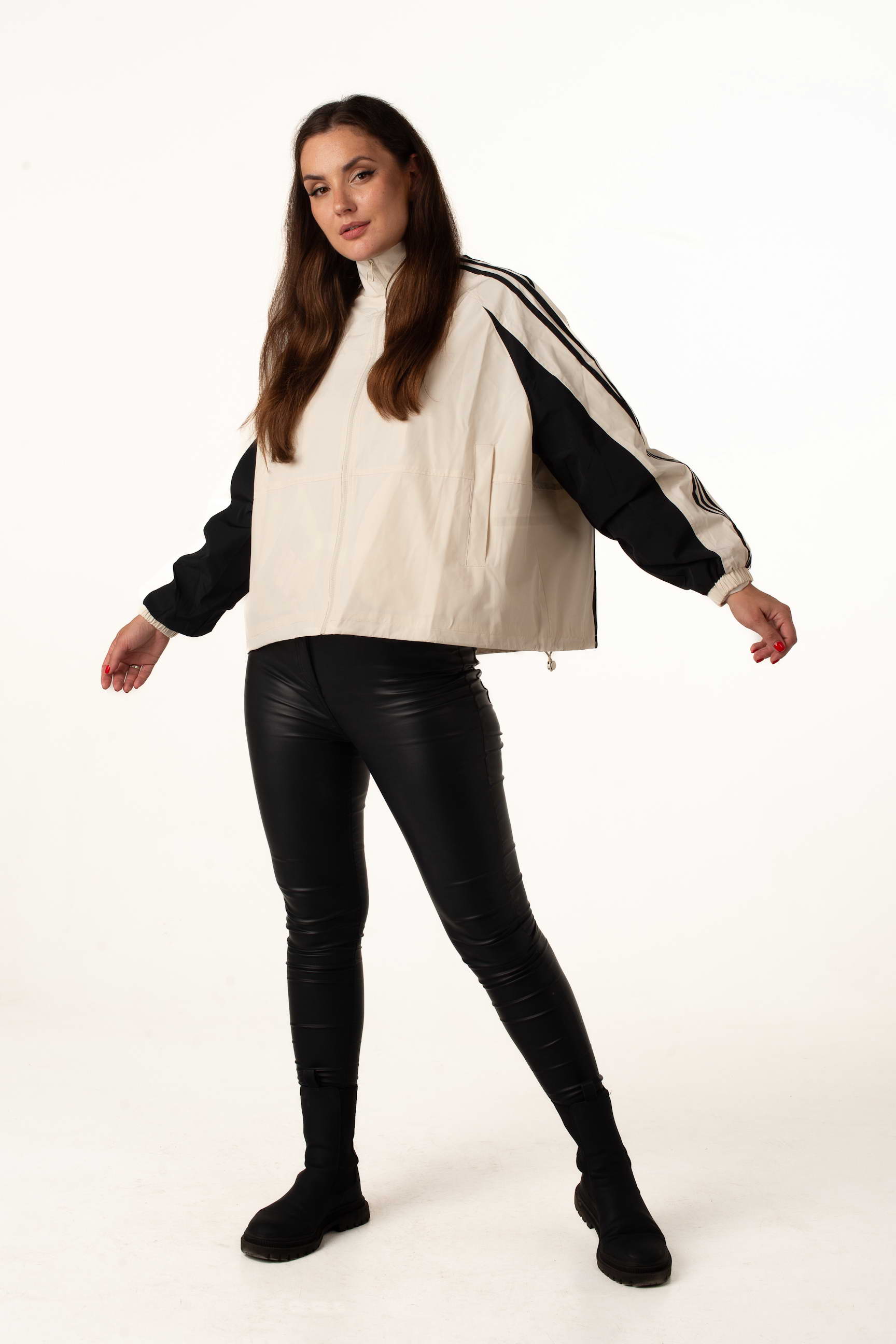Жіноча легка вітровка для весни та осені у класичному біло-чорному кольорі поєднує практичність і сучасний стиль. Комір-стійка захищає від вітру, а куліска по низу дозволяє регулювати посадку, підкреслюючи силует.