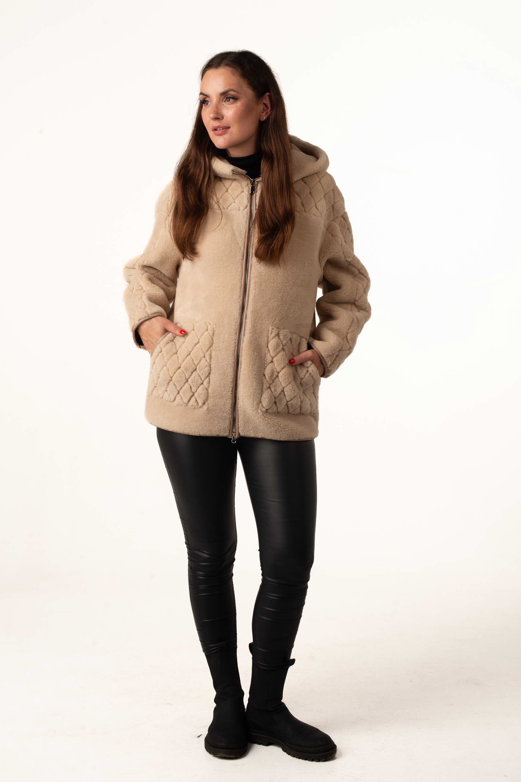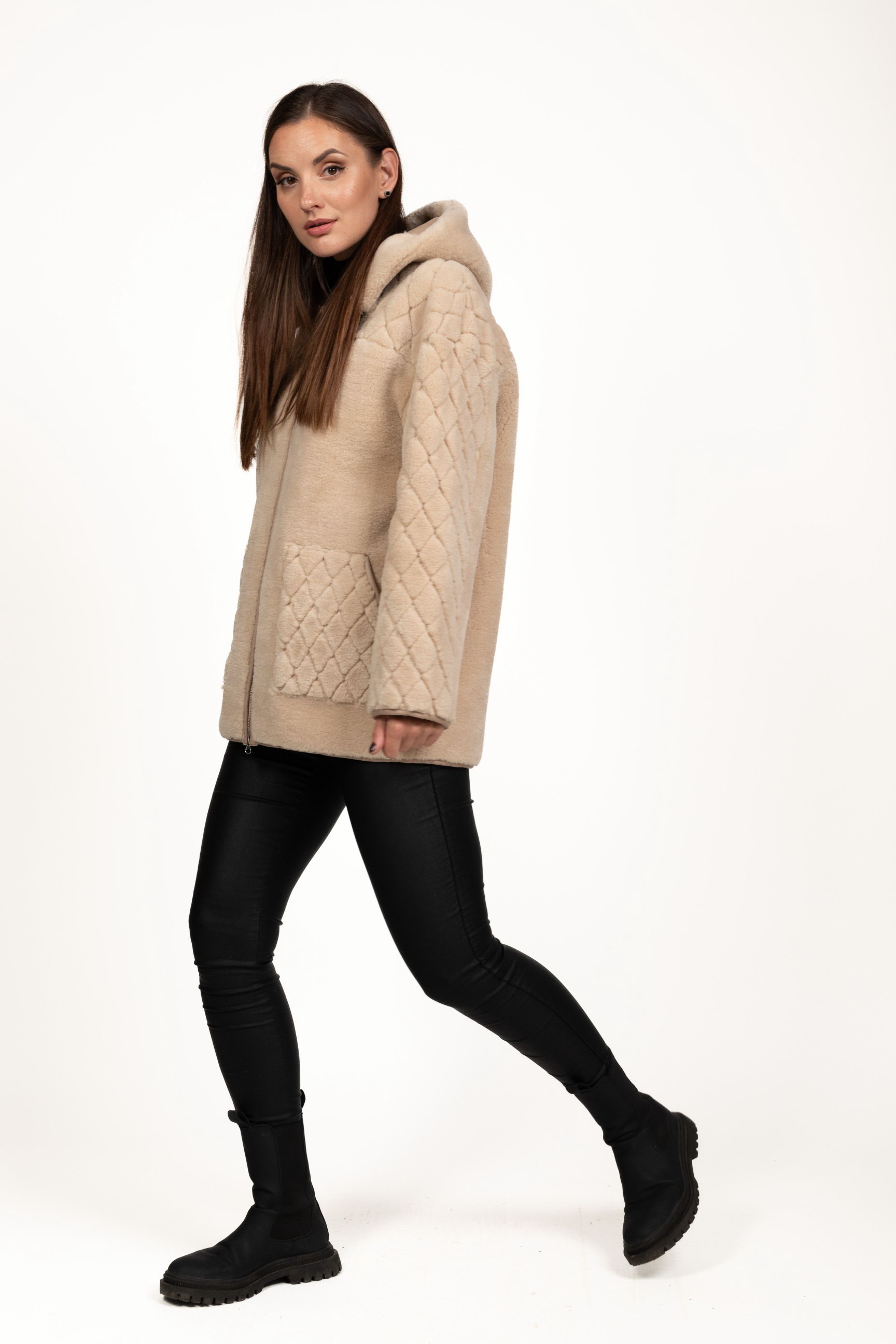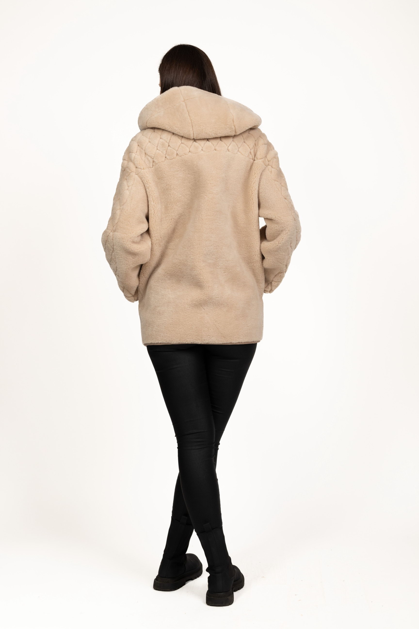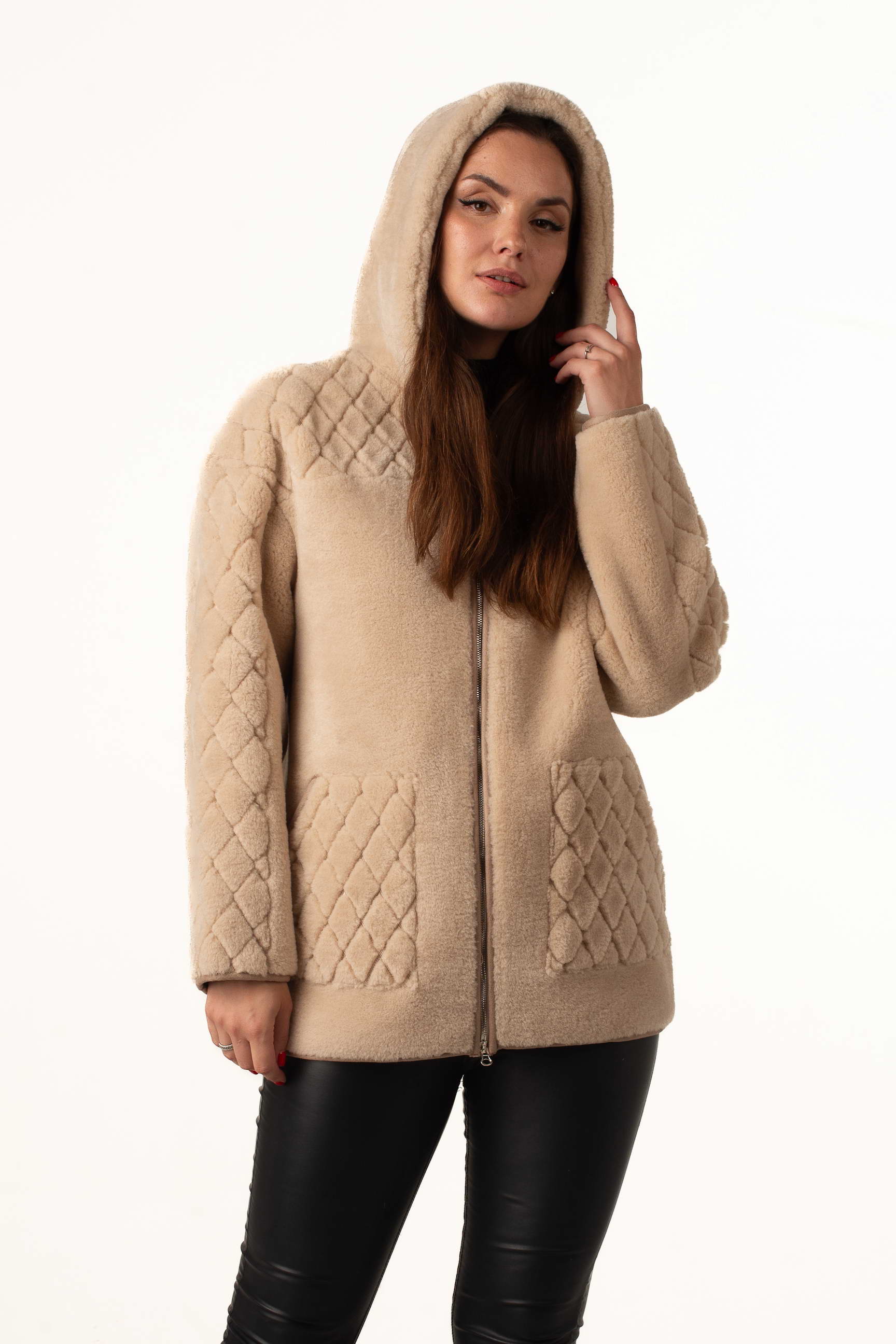 Жіноча шуба зі штучного хутра у ніжному бежевому відтінку поєднує комфорт, тепло та сучасний стиль. Модель оснащена коміром-стійкою з капюшоном, що захищає від вітру та холоду, а бокові кишені додають практичності для повсякденного носіння.