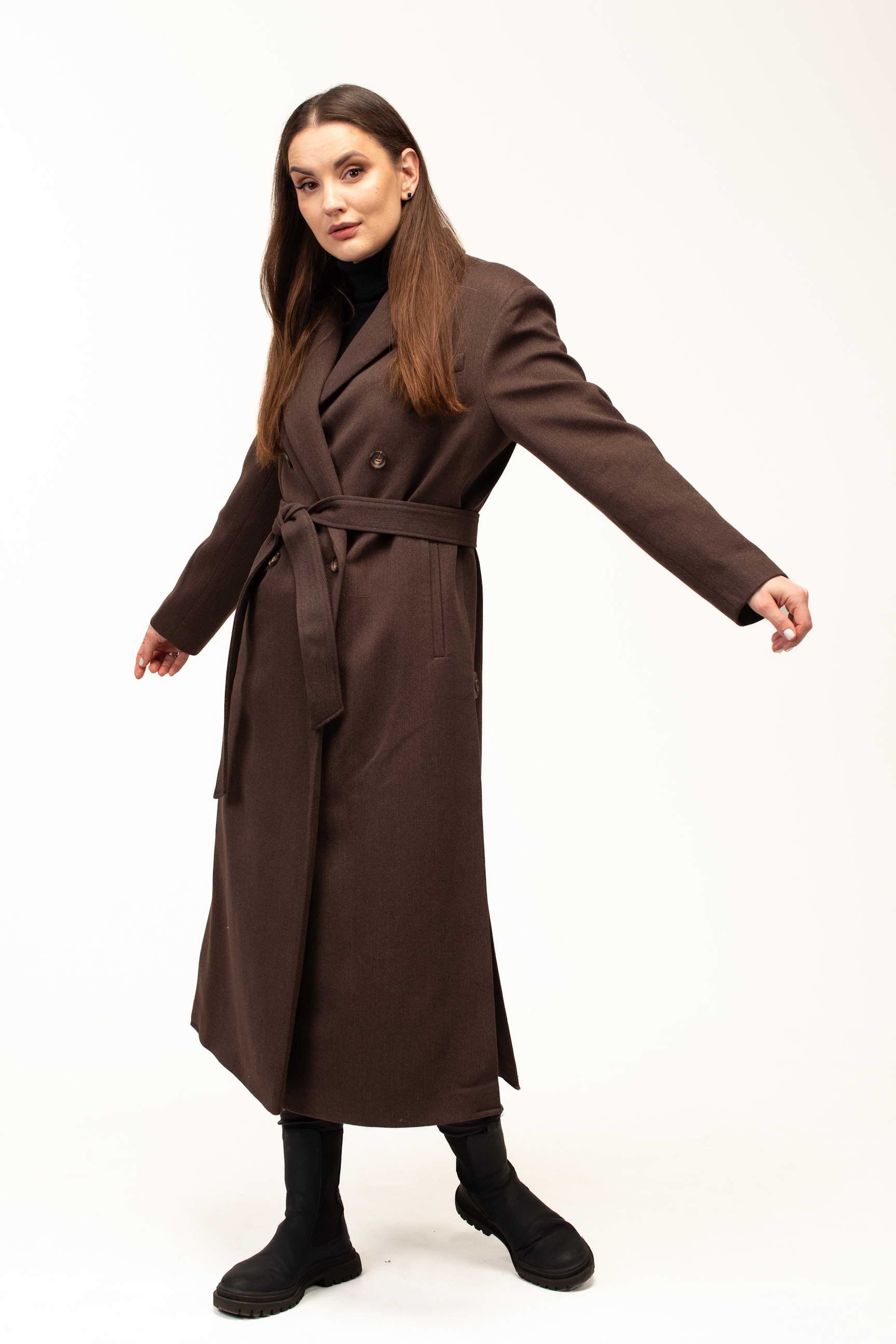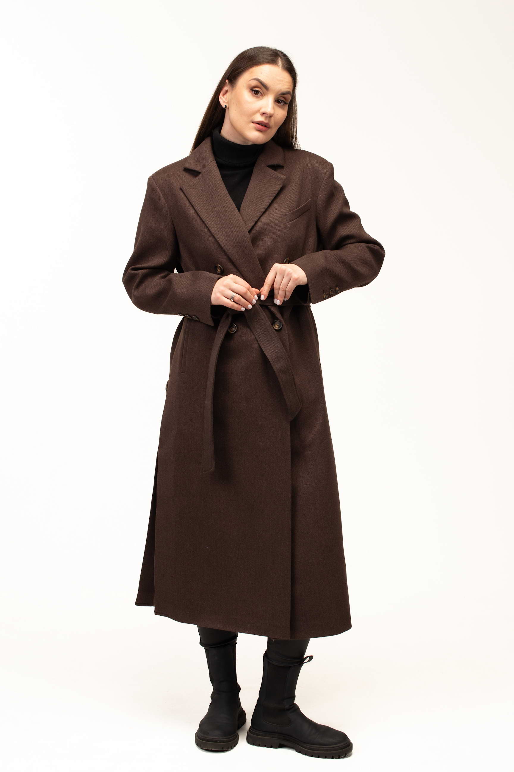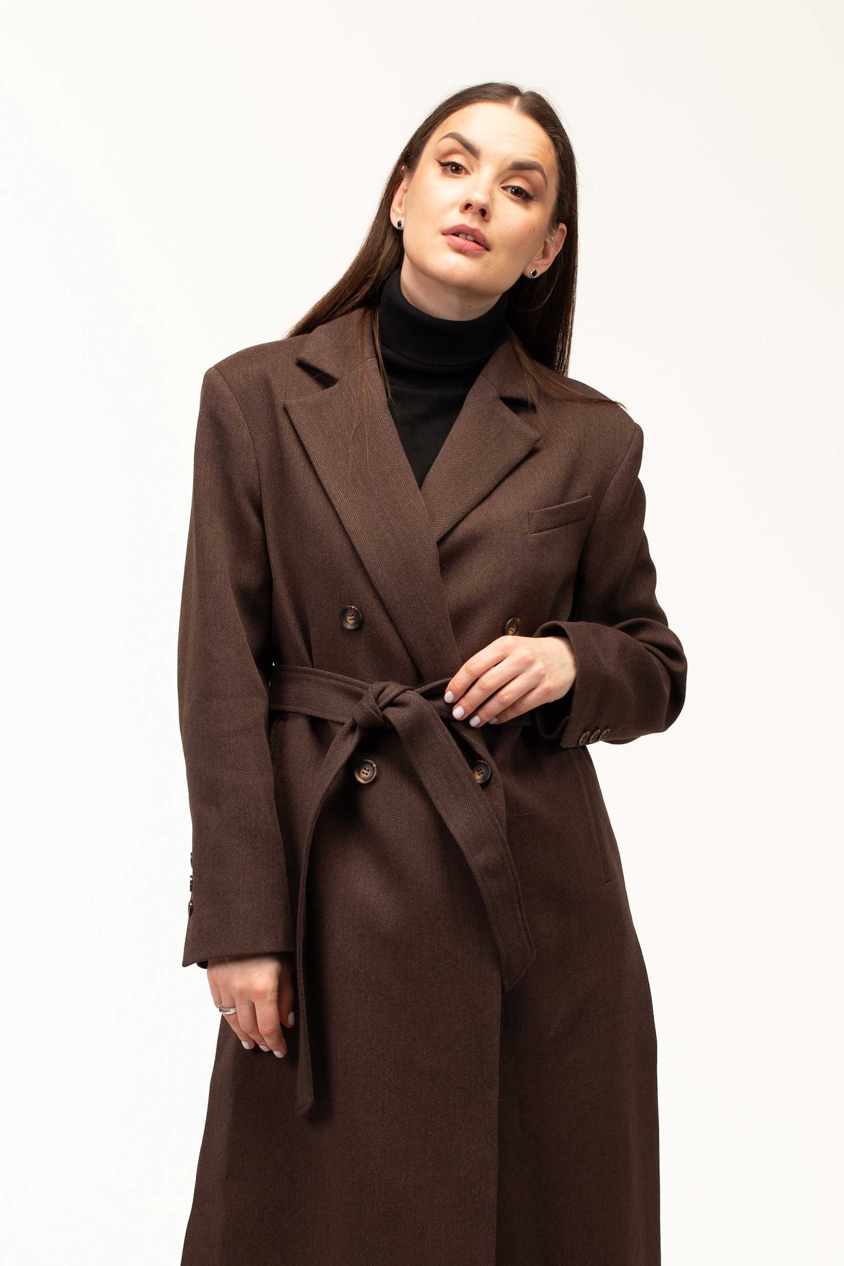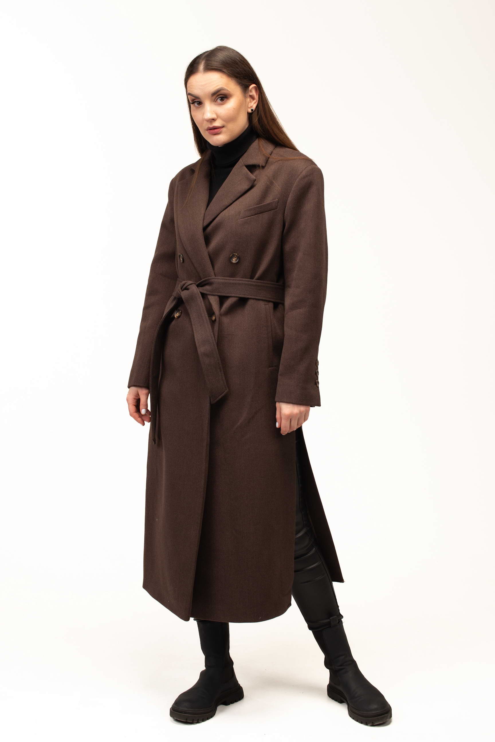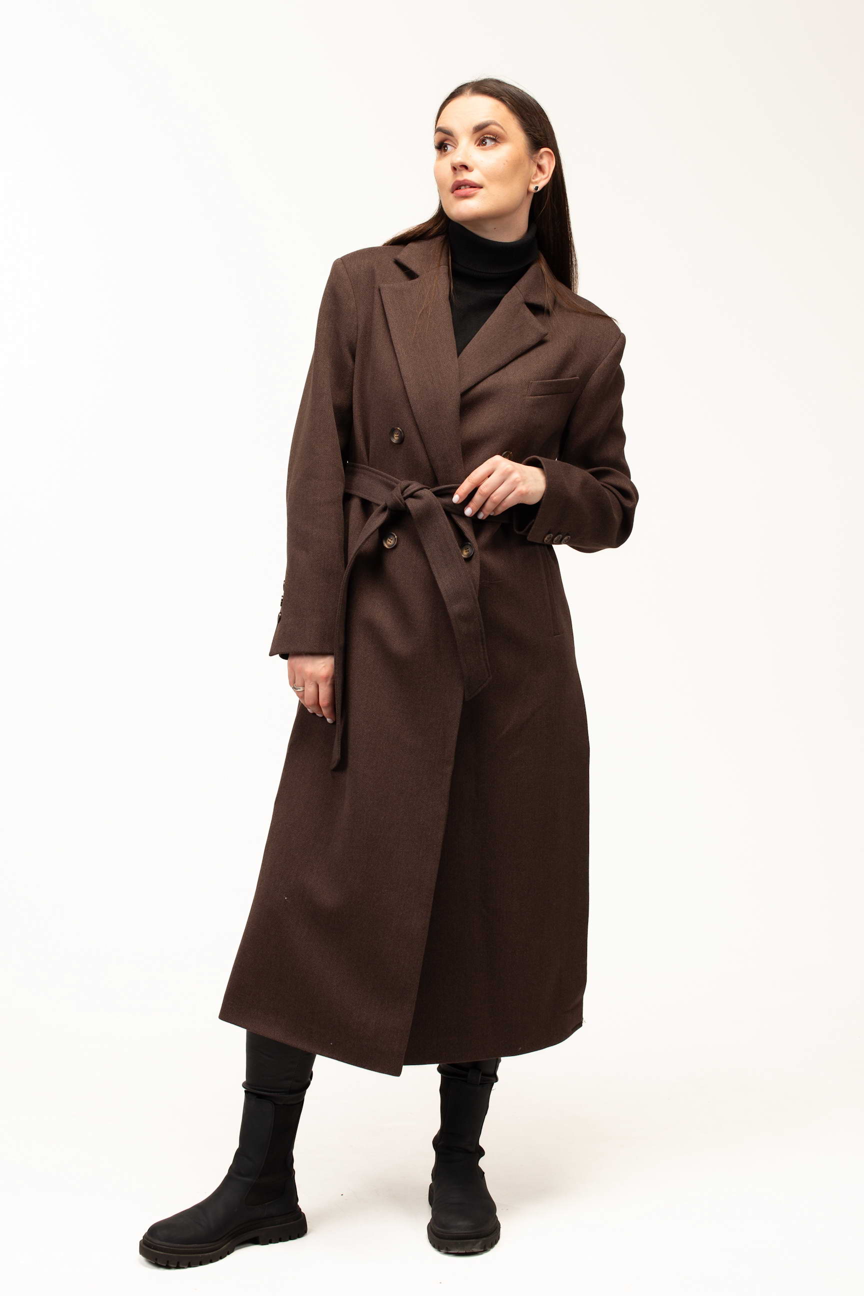 Глибокий коричневий колір додає виробу тепла та благородності, роблячи його універсальним вибором для створення стильних образів. Такий відтінок гармонійно поєднується з базовими та насиченими кольорами гардеробу, підкреслюючи елегантність і витонченість стилю.