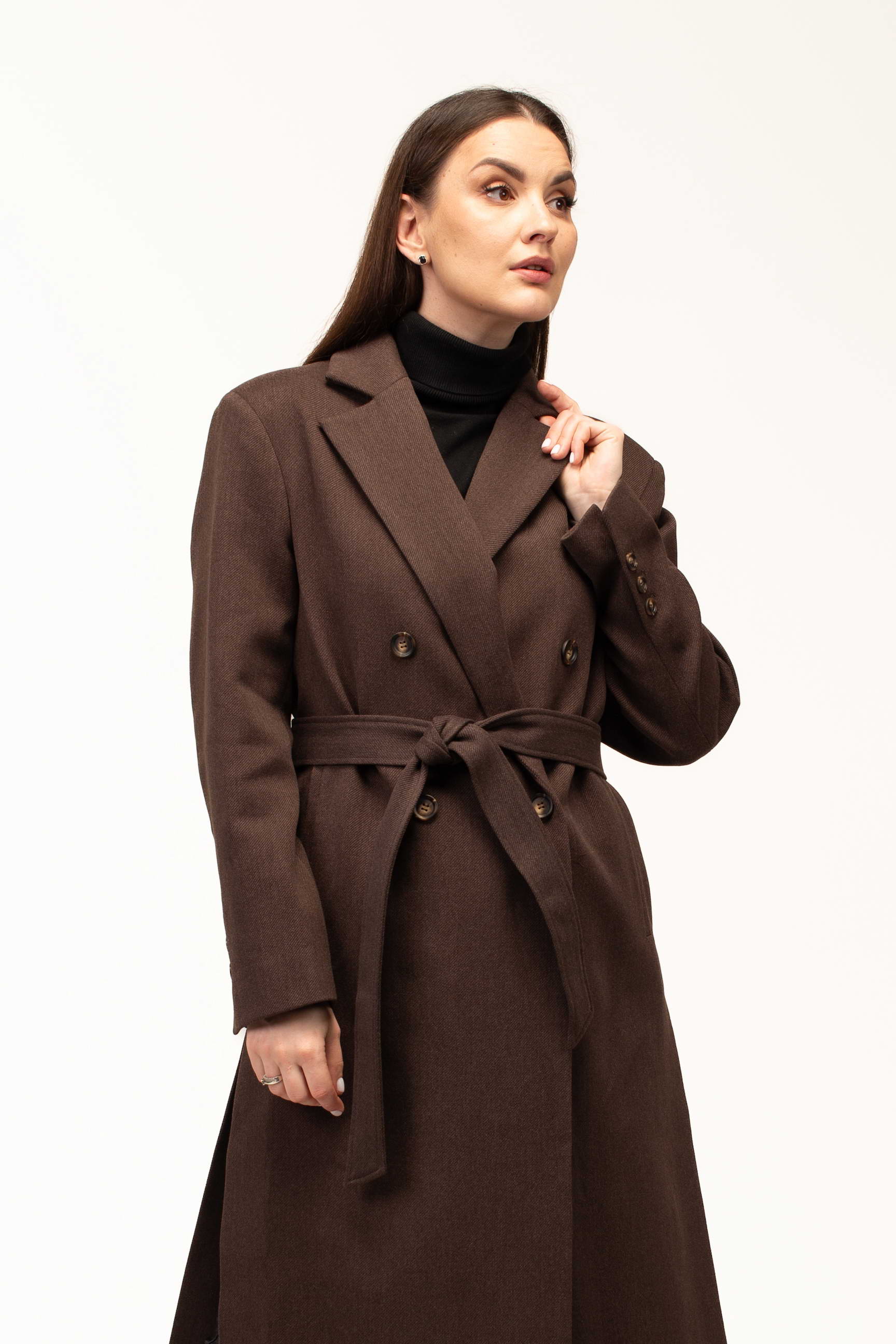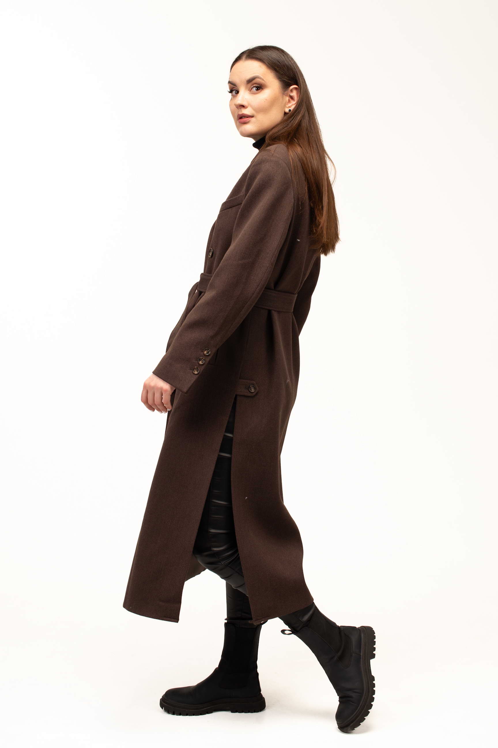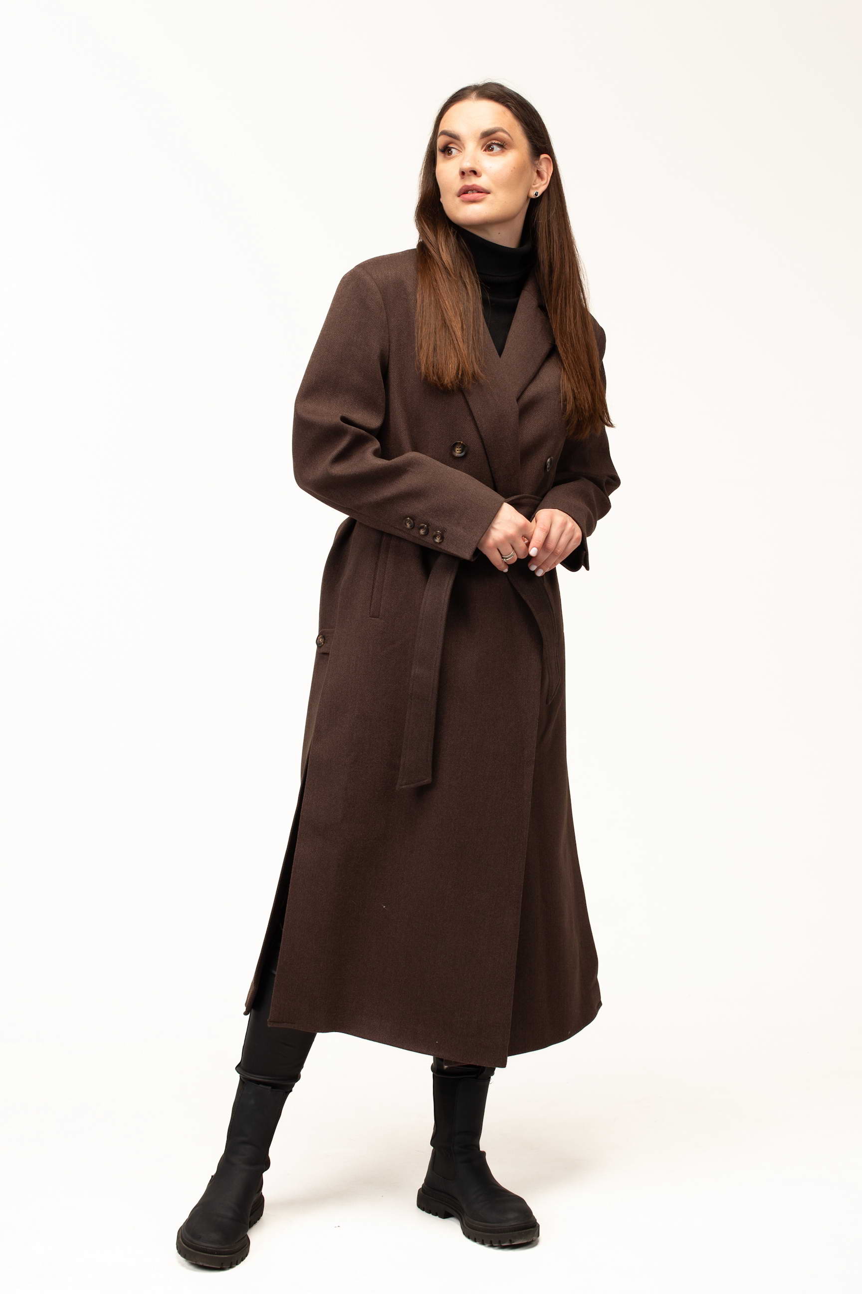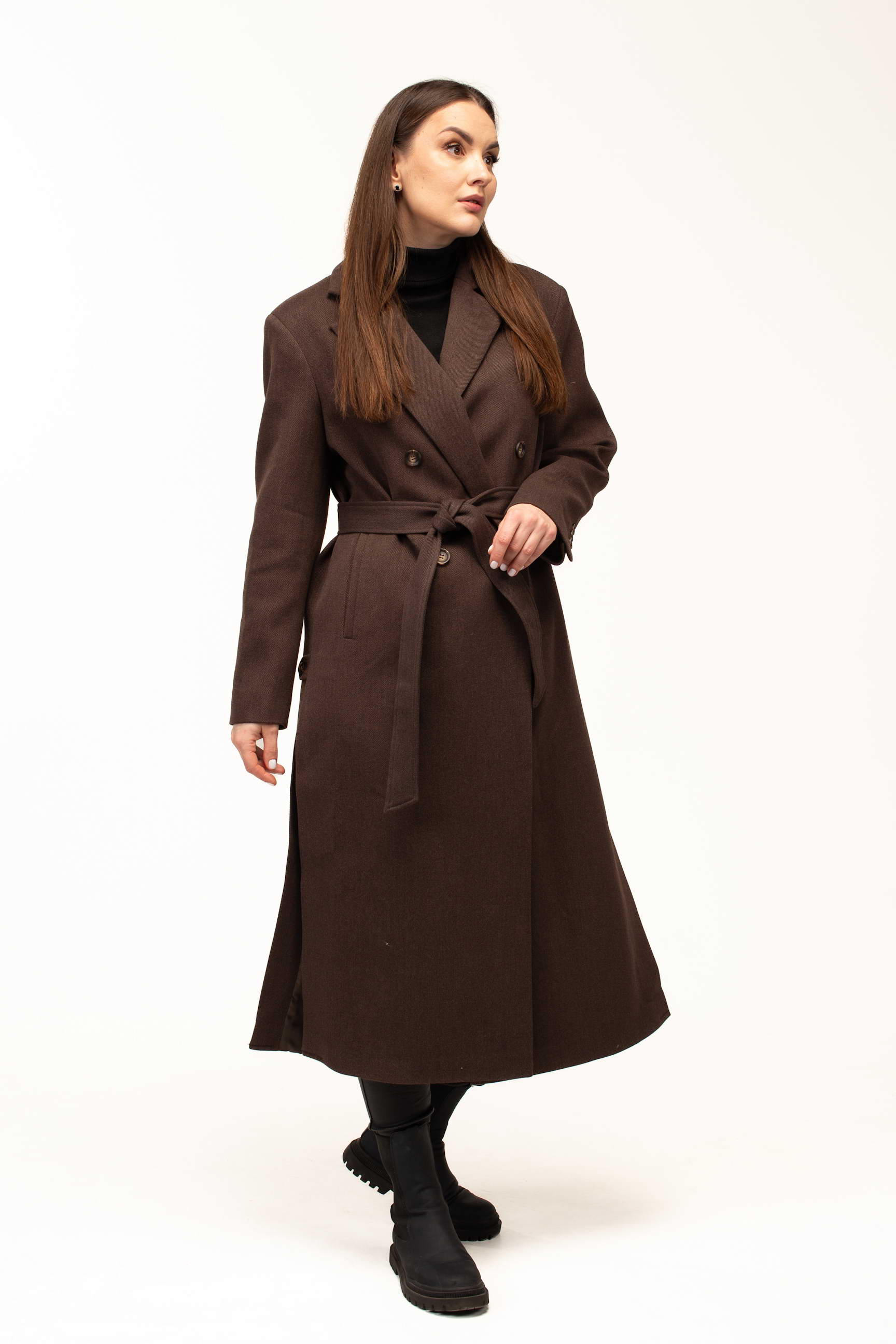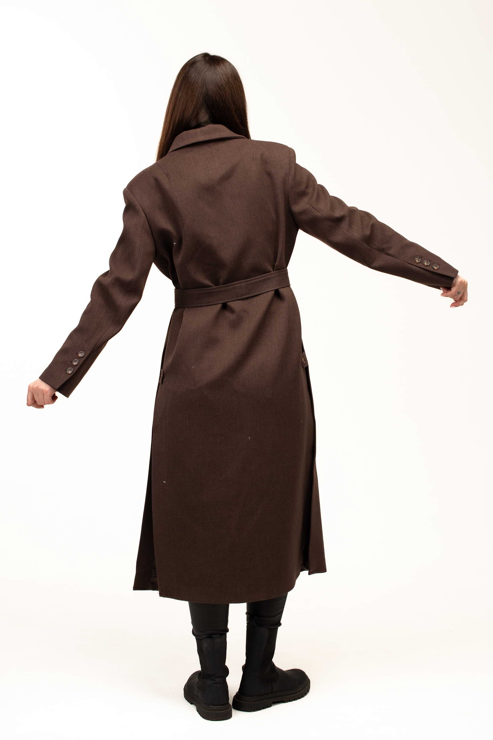 Глибокий коричневий колір додає виробу тепла та благородності, роблячи його універсальним вибором для створення стильних образів. Такий відтінок гармонійно поєднується з базовими та насиченими кольорами гардеробу, підкреслюючи елегантність і витонченість стилю.