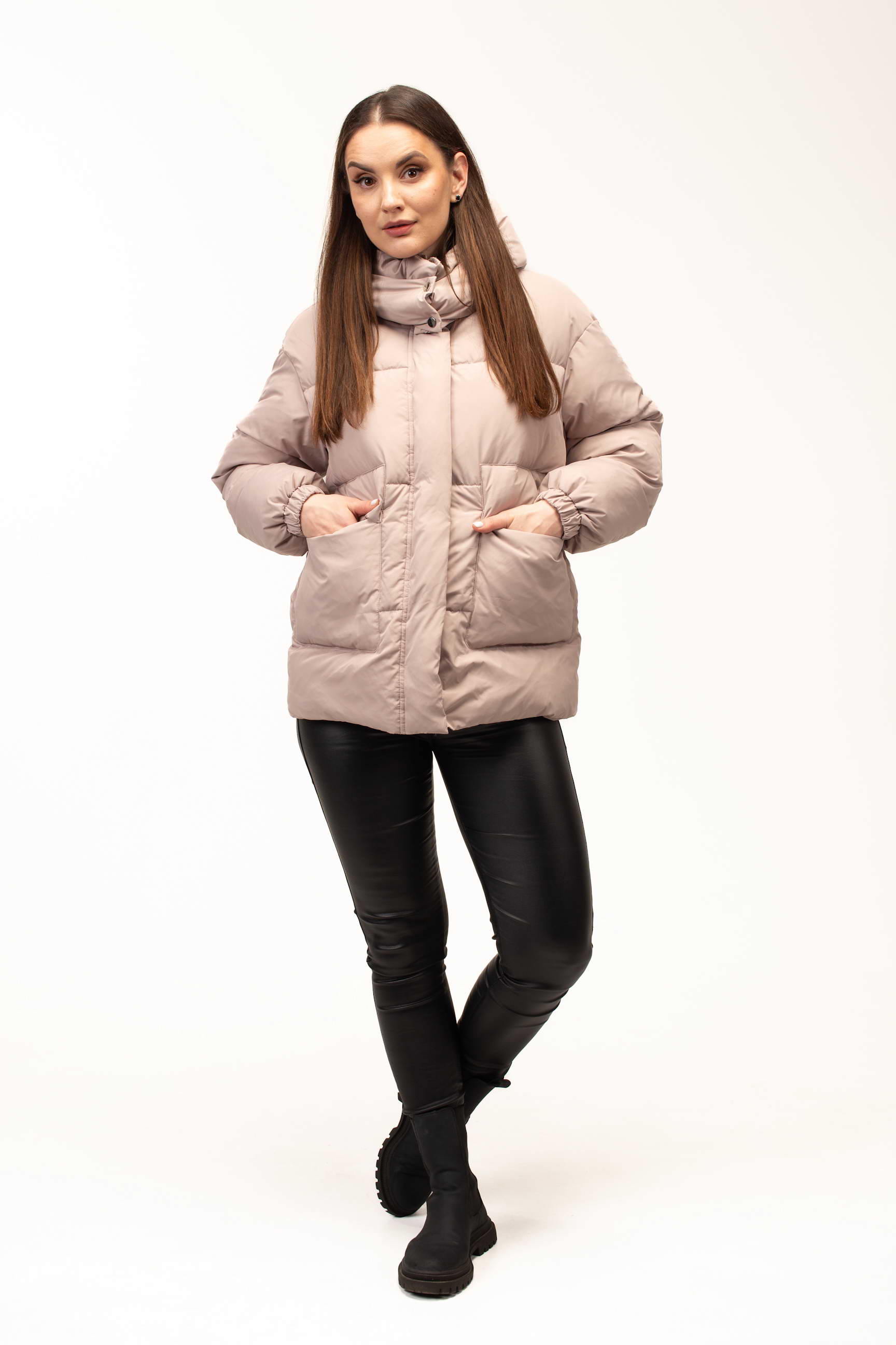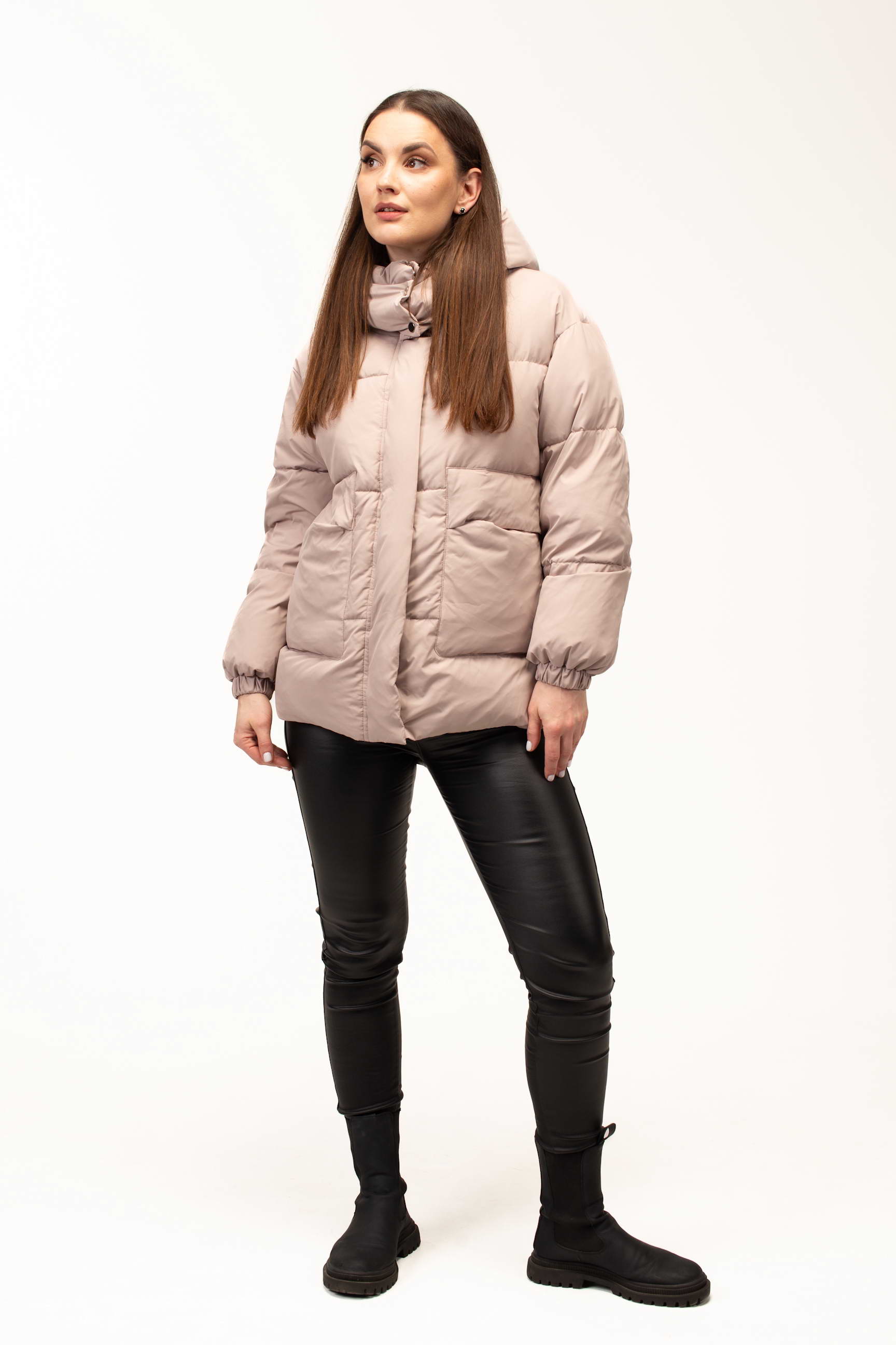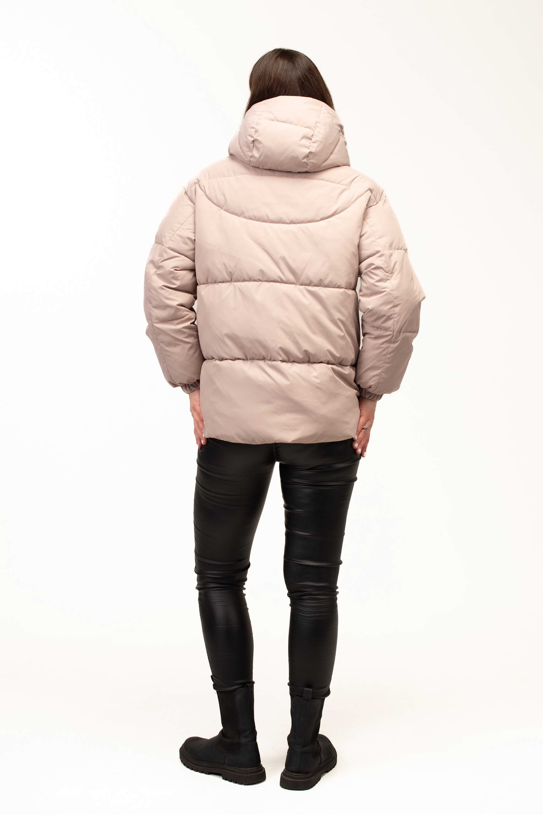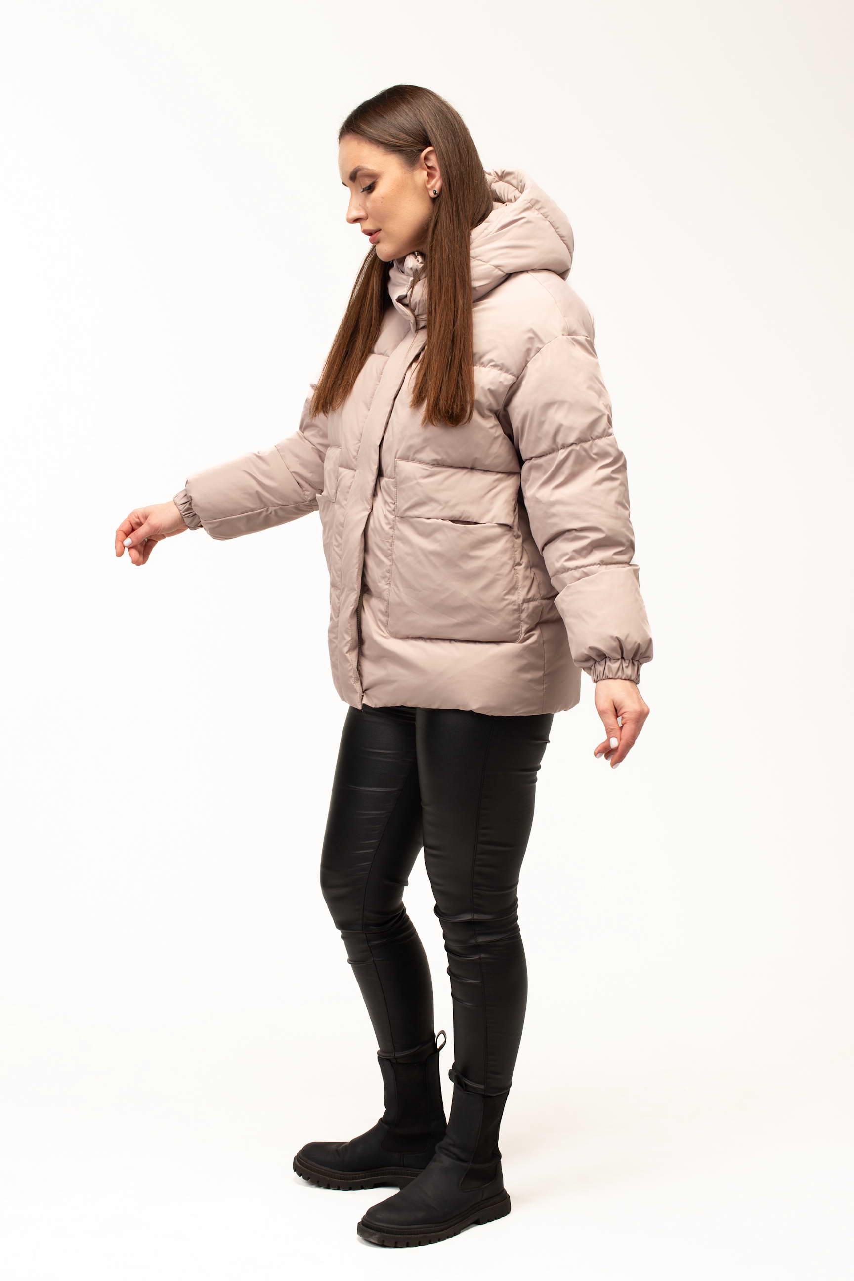 Ніжний бежевий відтінок додає образу елегантності та універсальності, дозволяючи легко комбінувати куртку з різними елементами гардеробу. Довжина 78 см робить модель більш компактною та зручною для активного міського ритму, забезпечуючи при цьому достатній рівень захисту від холоду.