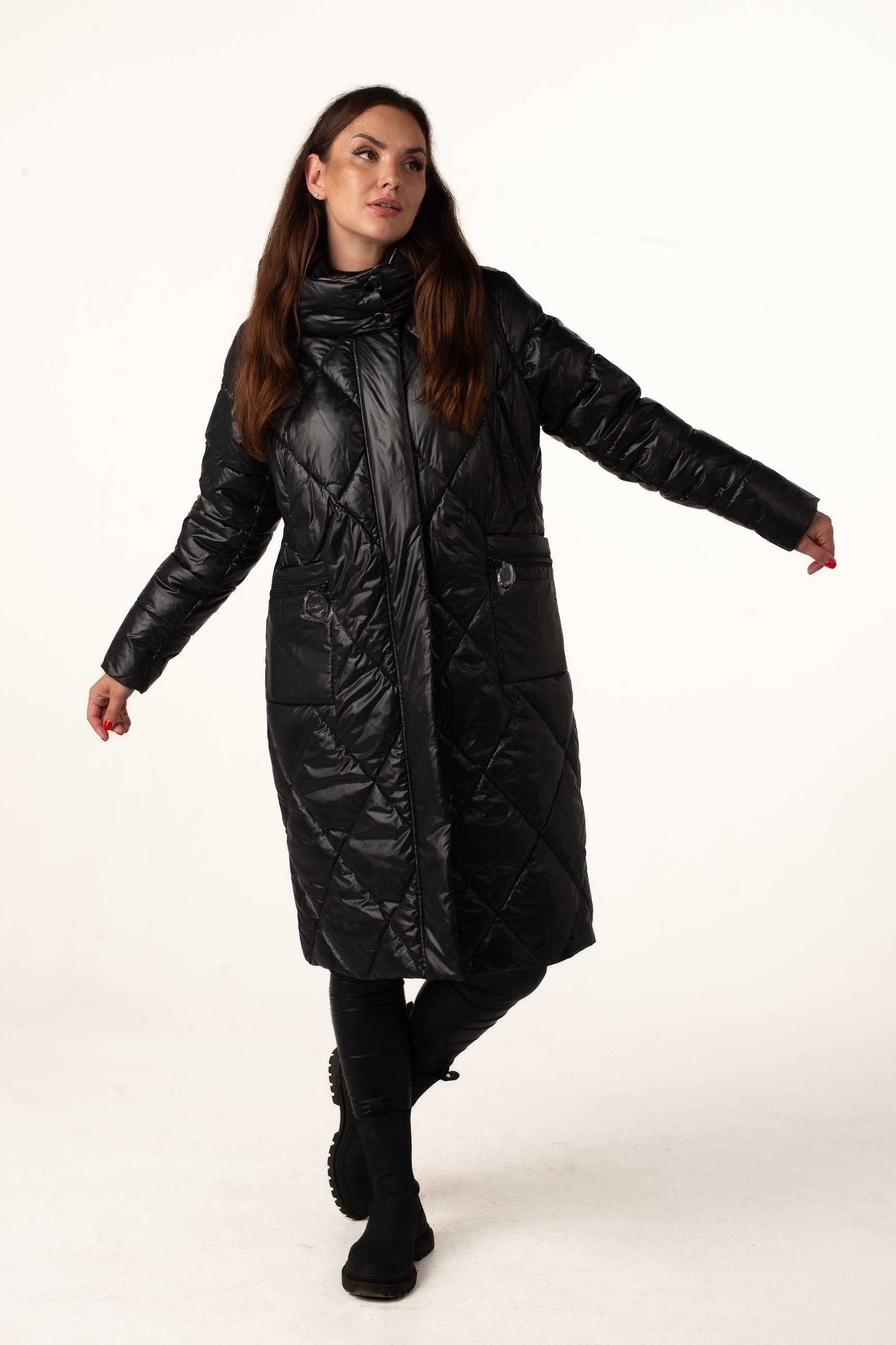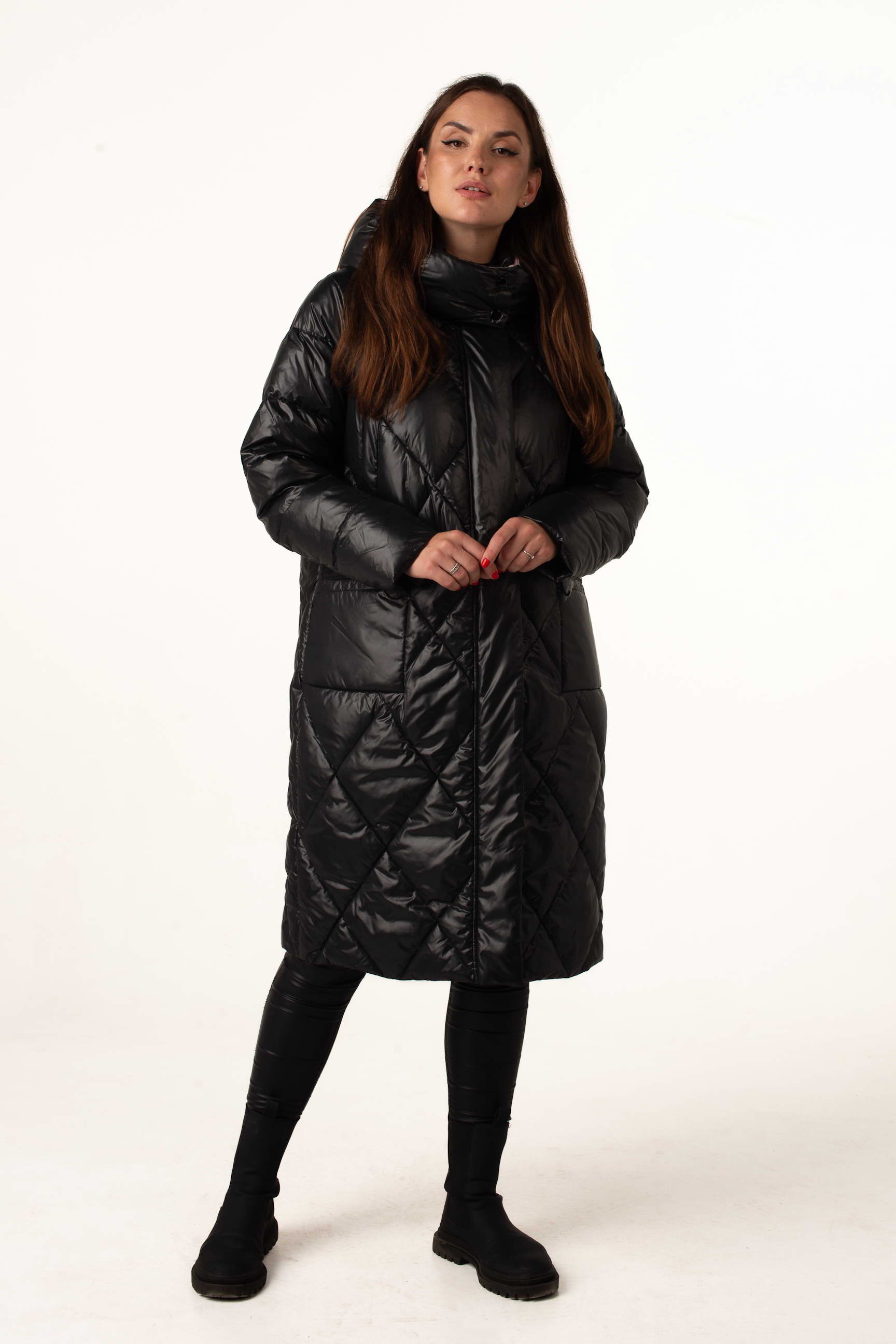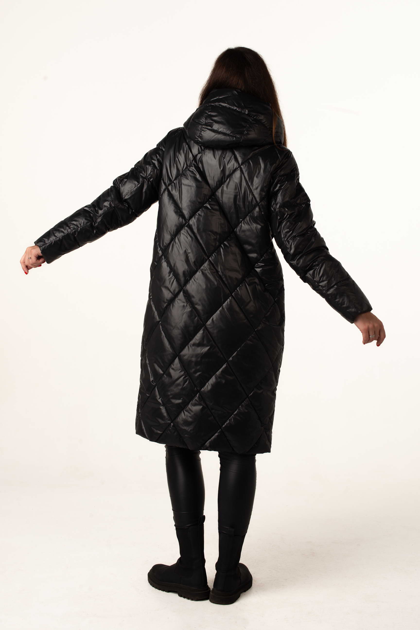 Чорний жіночий біопуховик з ромбовою стьожкою та знімним капюшоном – поєднання тепла, комфорту та сучасного стилю. Подовжений фасон забезпечує додатковий захист від холоду і вітру.